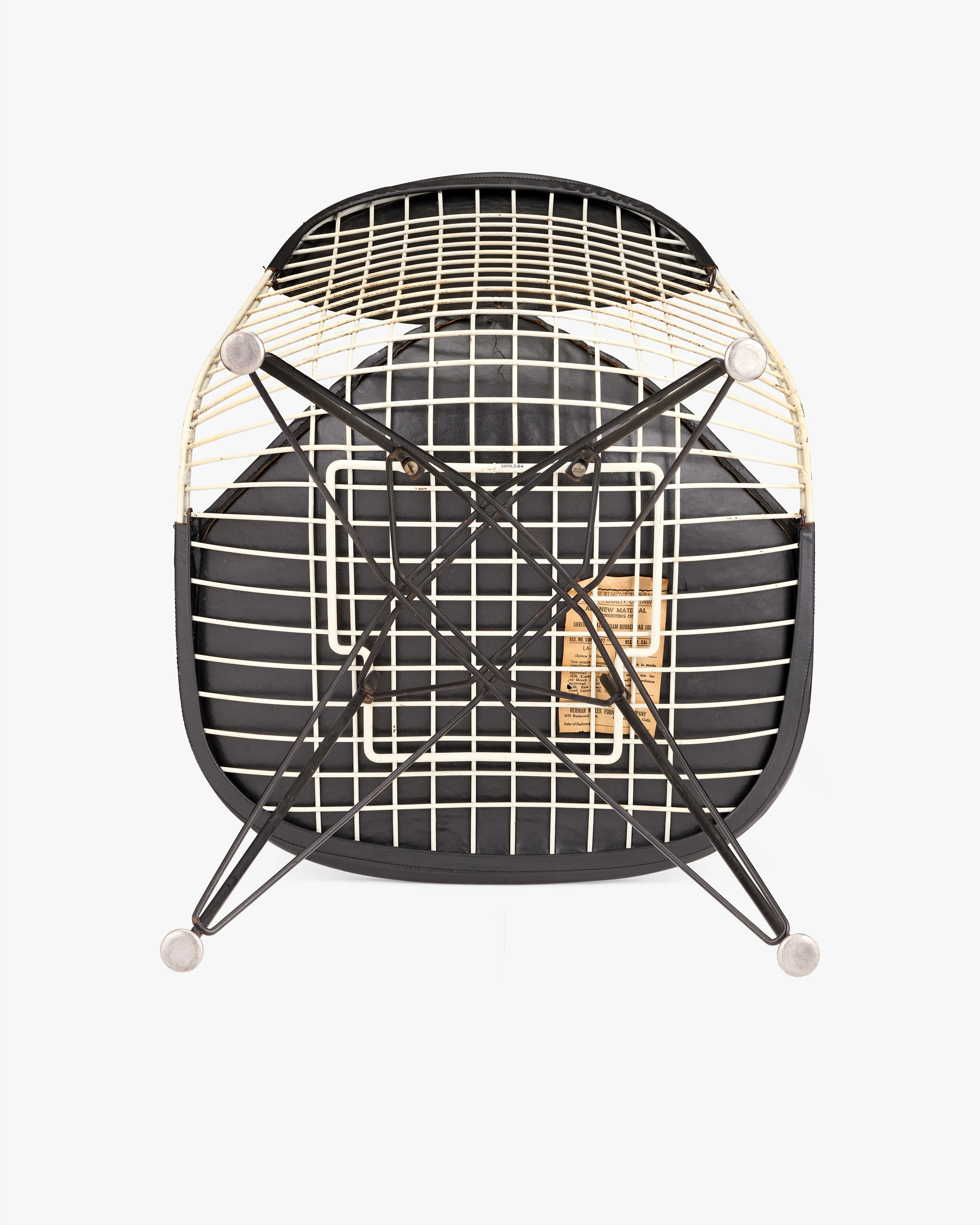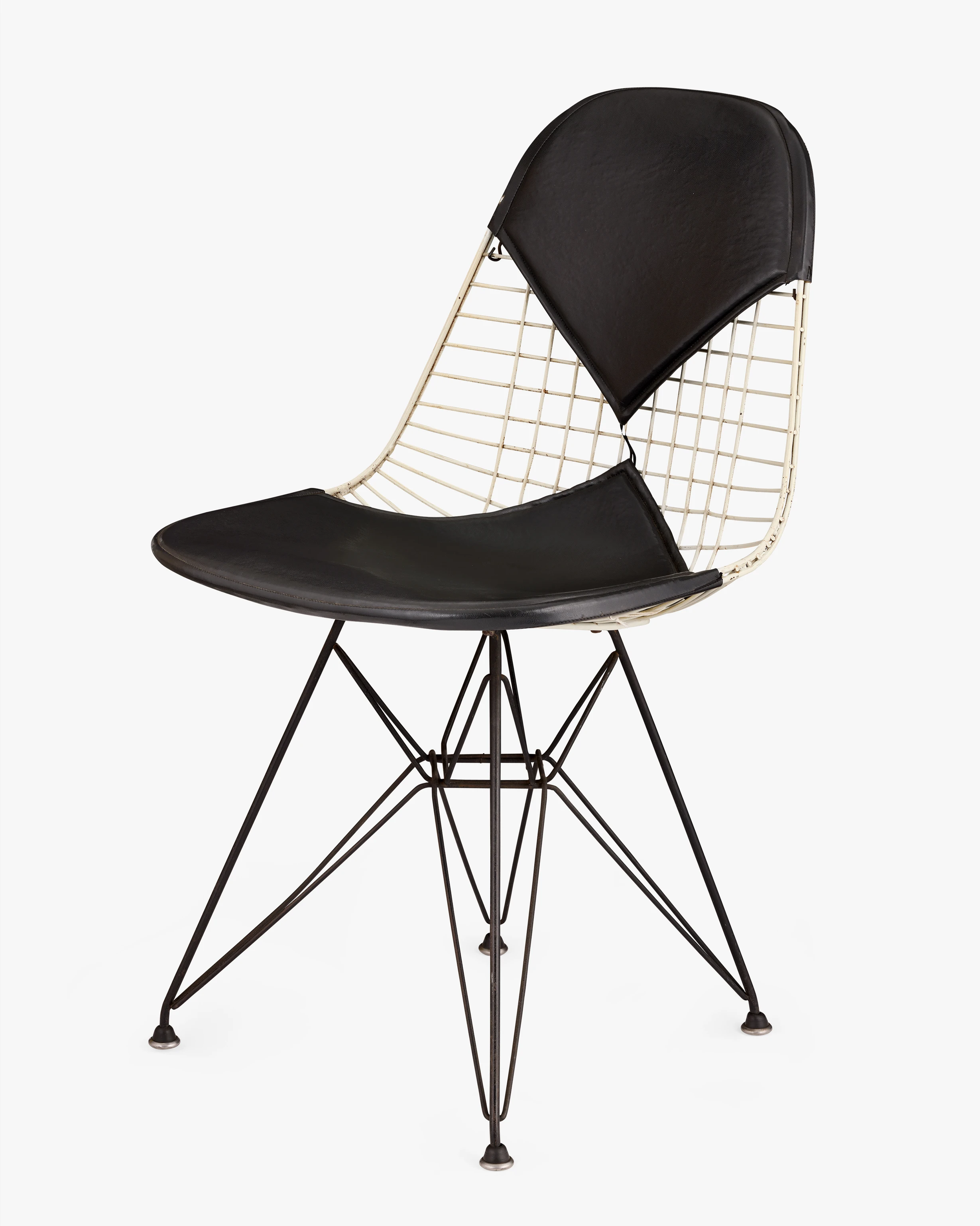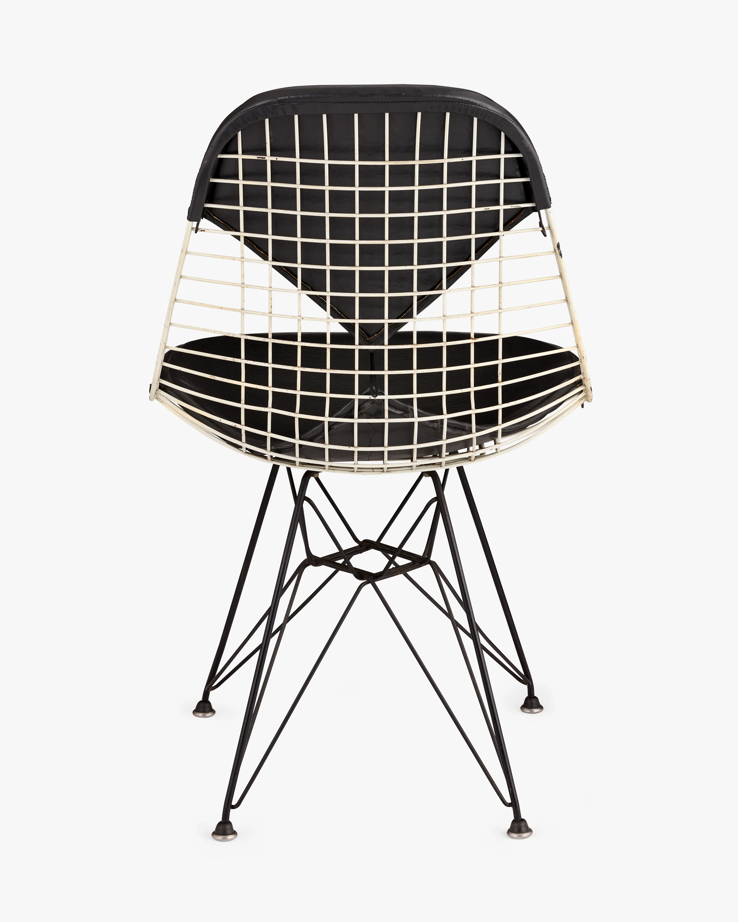 This is an Upholstered Eames Wire Chair with the two-piece pad that has come to be known as the “Bikini Pad” and a steel rod base, which enthusiasts now refer to as the “Eiffel Tower Base.” Ray and Charles were not imitating the Eiffel Tower in designing this base. Rather, they discovered that they could make a four-legged chair base with the best strength-weight ratio by bending and welding the steel rods. This base is lighter by two pounds than the DKX four-legged base. DKR-2 stands for Dining (height) K-wire (chair) Rod (base) 2 (2-piece upholstered pad).