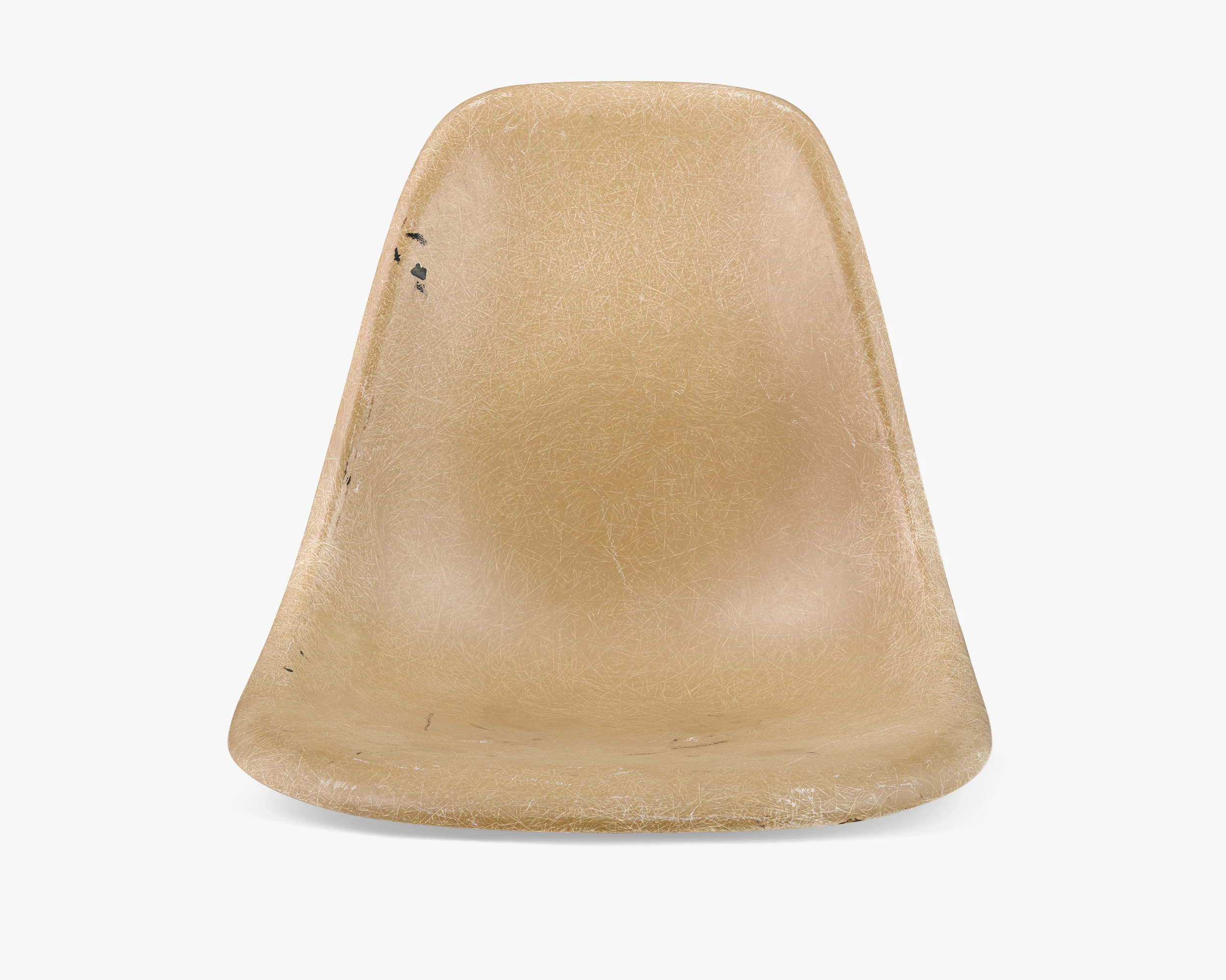 This Khaki shell has its original shockmounts and was once mounted on a DSX base. When Ray and Charles were designing the shells, they were thinking about seating systems, and it led them to create a single shell that could be mounted to a variety of different types of bases for different needs. The DSX base is an abbreviation for dining (D) side chair (S) on a four-legged base (X).