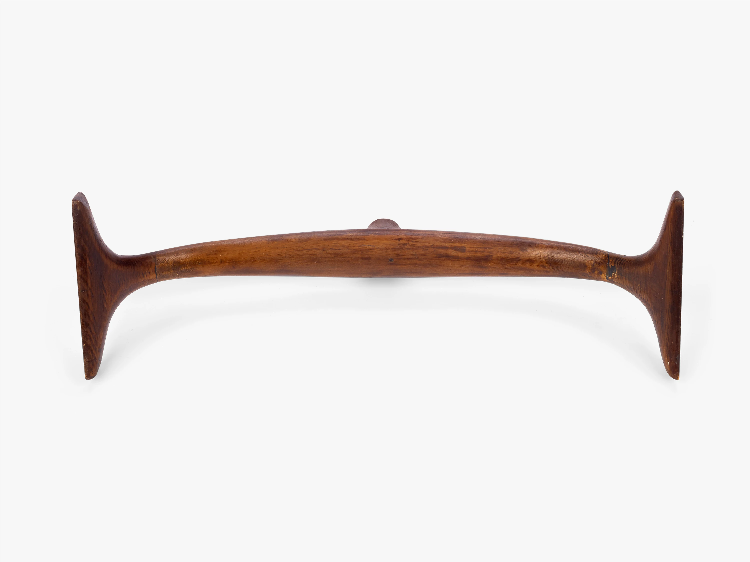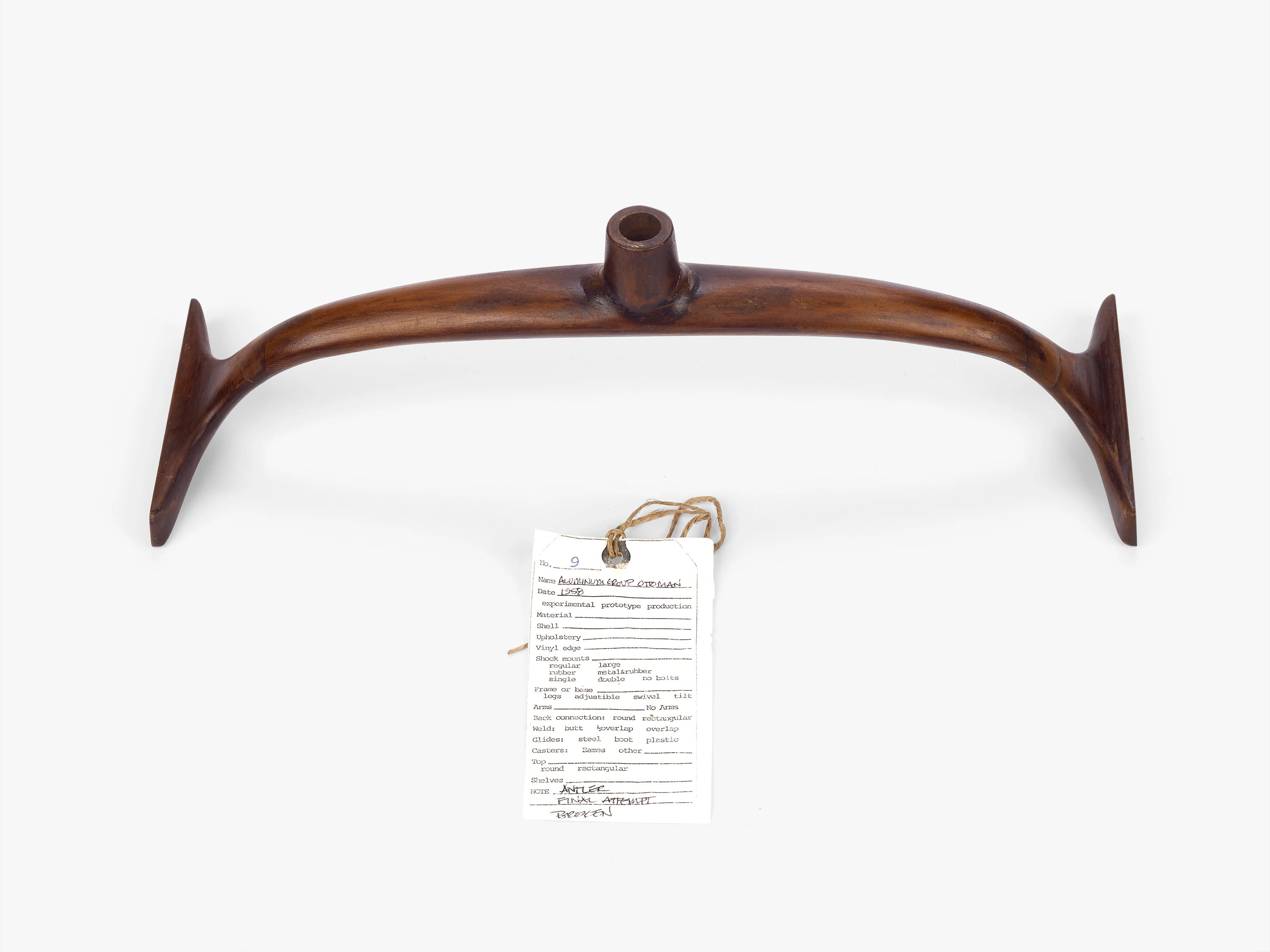 A key conceptual feature of the Eames Aluminum Group is the pair of aluminum spreaders that hold the upholstery taut between two aluminum side members. These spreaders create the necessary tension for transforming fabric into a supportive seat and backrest. Dubbed “antlers” by the Eames Office staff thanks to their distinctive shape, one spreader is located midway up the chair’s back and doubles as a handle. The other is located underneath the seat and serves both to stretch the textile and to attach the body of the chair to its base. The spreaders are not merely supplementary support for the aluminum side members, but actually create the tension essential to the design concept. This becomes evident from the assembly procedure: in order for the spreaders to be attached to the frame, the seating pads had to be forcefully stretched lengthwise. Eames Aluminum Group manufacturer Herman Miller accomplished most of this stretching with an automotive jack, but even so the insertion process was finished by using a hard wooden dowel to wedge the antler into place. This part of the assembly process conveys just how much tensile force the fabric of an Eames Aluminum Group chair is under. It also indicates the degree to which the spreaders themselves needed to be able to withstand significant force.