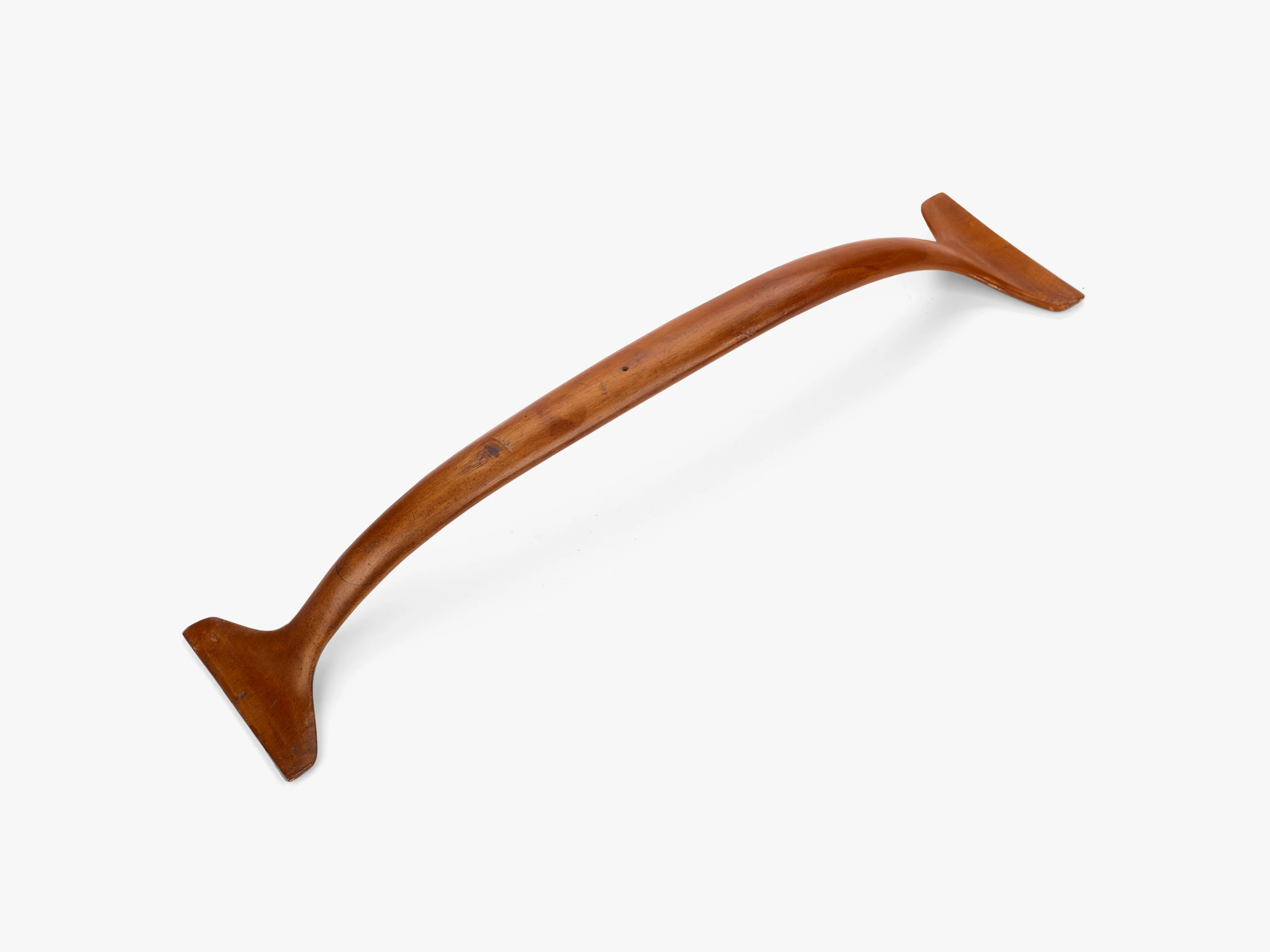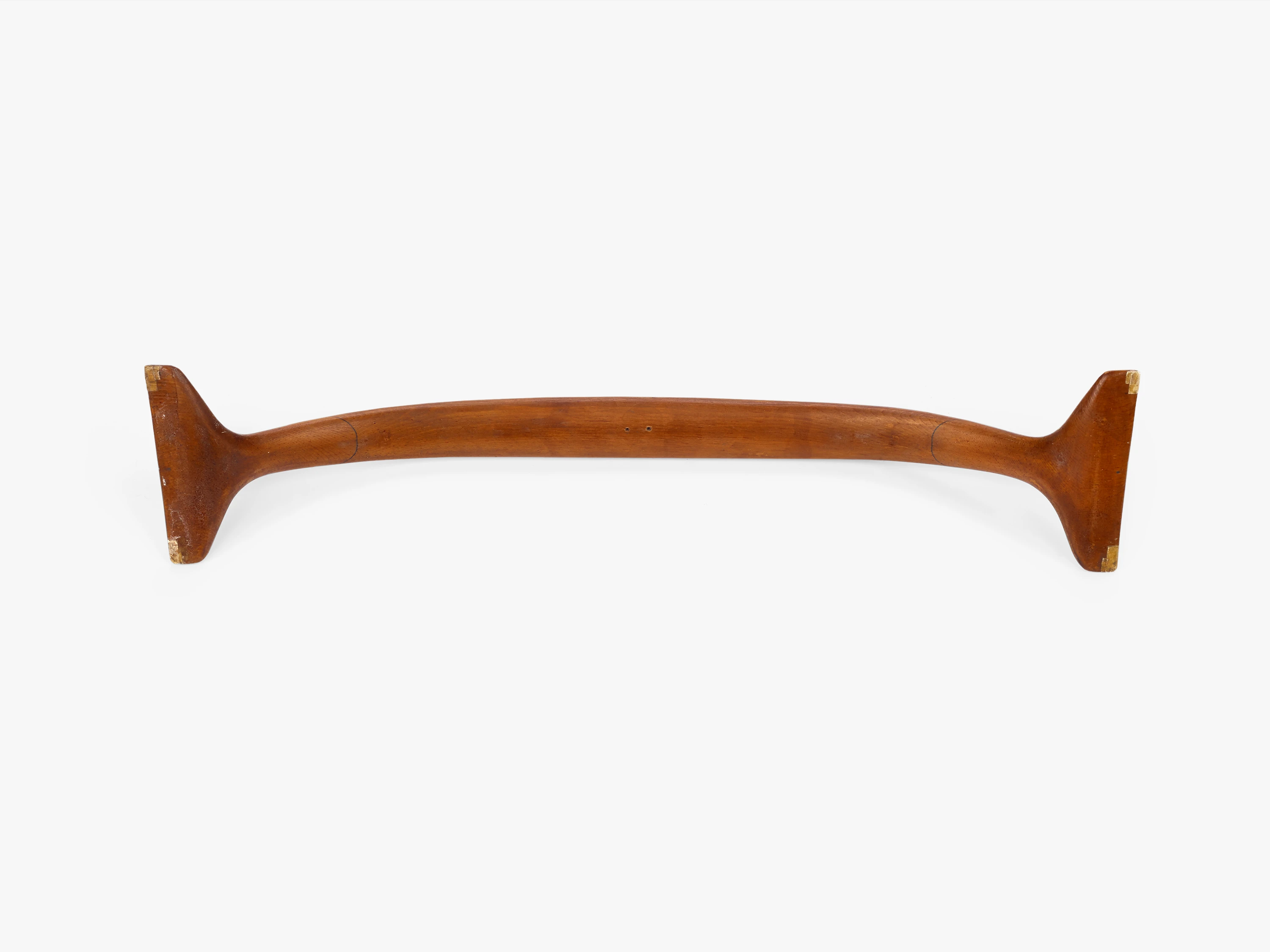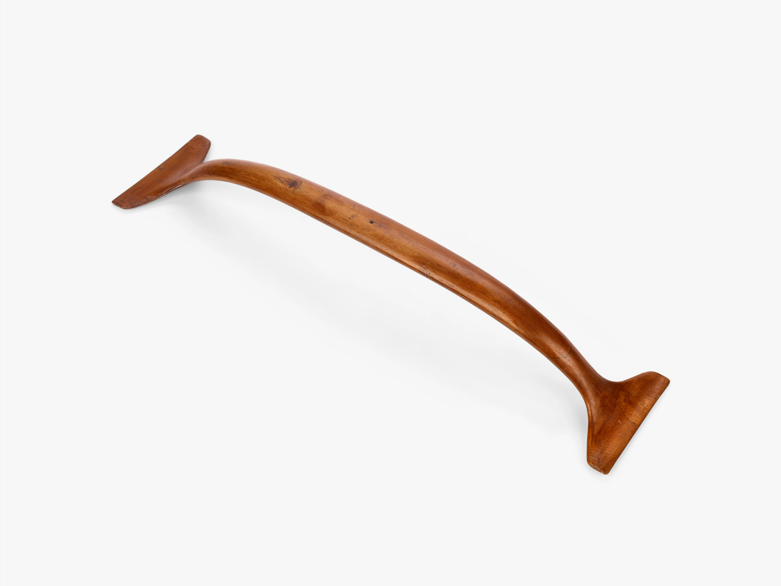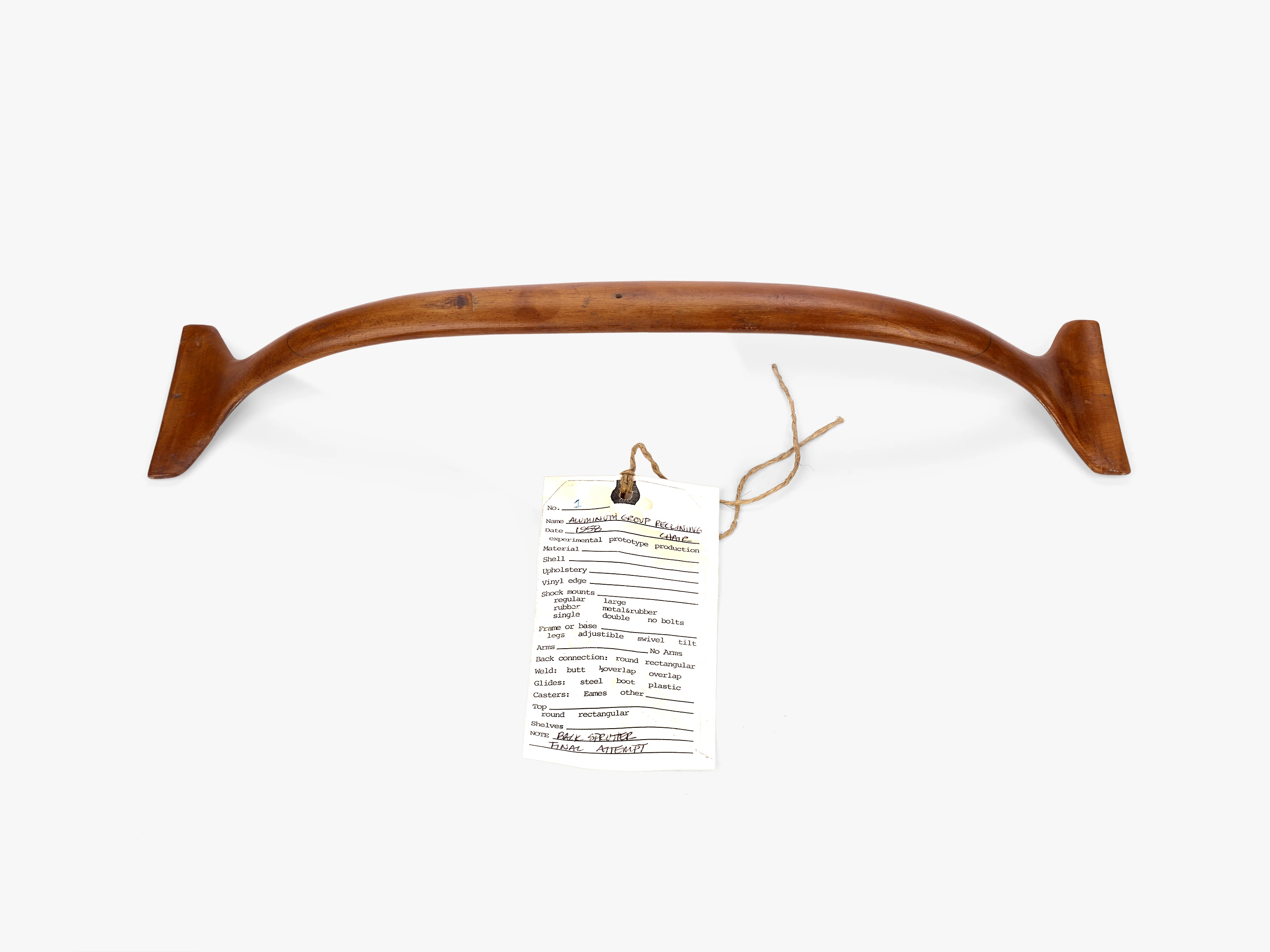 A key conceptual feature of the Eames Aluminum Group is the pair of aluminum spreaders that hold the upholstery taut between two aluminum side members. These spreaders create the necessary tension for transforming fabric into a supportive seat and backrest. Dubbed “antlers” by the Eames Office staff thanks to their distinctive shape, one spreader is located midway up the chair’s back and doubles as a handle. The other is located underneath the seat and serves both to stretch the textile and to attach the body of the chair to its base. In the process of developing the chairs, Eames Office staff member Robert Staples carved eight variations on the antler form in wood before the final shape was determined. When creating these wooden prototypes, the Eameses had to be mindful of the changes that the shape would inevitably undergo when cast in aluminum. Specifically, the aluminum versions of the chairs’ structural elements are somewhat smaller and their curves slightly smoother than their wooden predecessors. In order to successfully anticipate how a wooden prototype will translate to a final cast form, a designer needs a keen understanding of material properties and production processes. This kind of attunement to industrial parameters was central to the Eameses’ belief that designers should take into account the specific industrial processes through which their designs would be made.