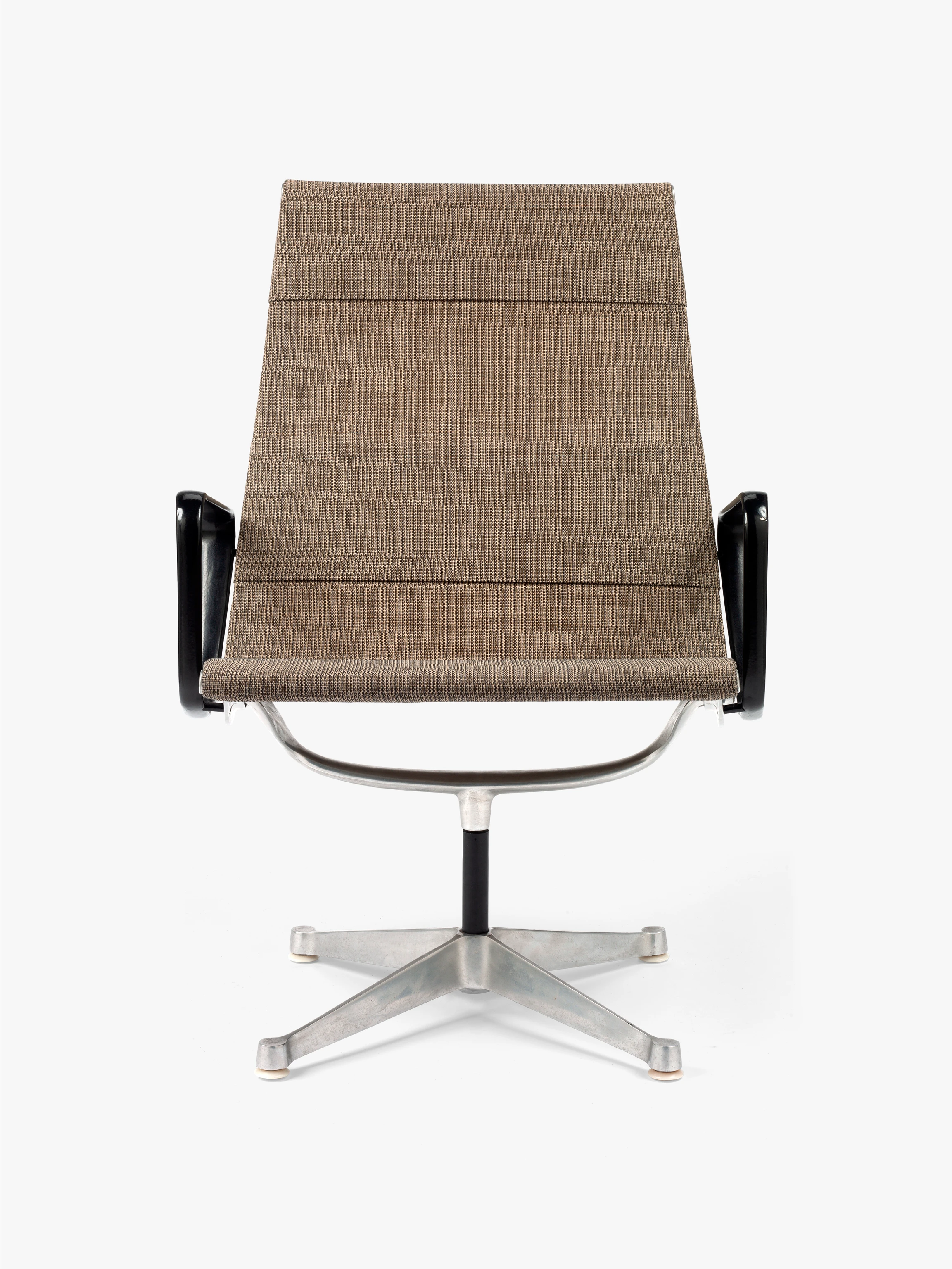 The semi-sheer Saran textile used in this example of the Eames Aluminum Group lounge chair was a short-lived upholstery option for the model. The Saran options for the chairs initially included beige, blue, and gray colorways. Ray and Charles chose Saran because it had proven itself to be durable, stain-resistant, and easy to clean when used as automobile upholstery. It seems that despite initial assumptions, in the end Saran was not able to sustain the kind of tension applied by the design of the Eames Aluminum Group. Notably, the Eameses had worked with Saran just a few years prior to developing the Eames Aluminum Group, when they used it as a covering for the Quadraflex loudspeakers they designed for audio equipment company Stephens Trusonic Inc. in 1956.
