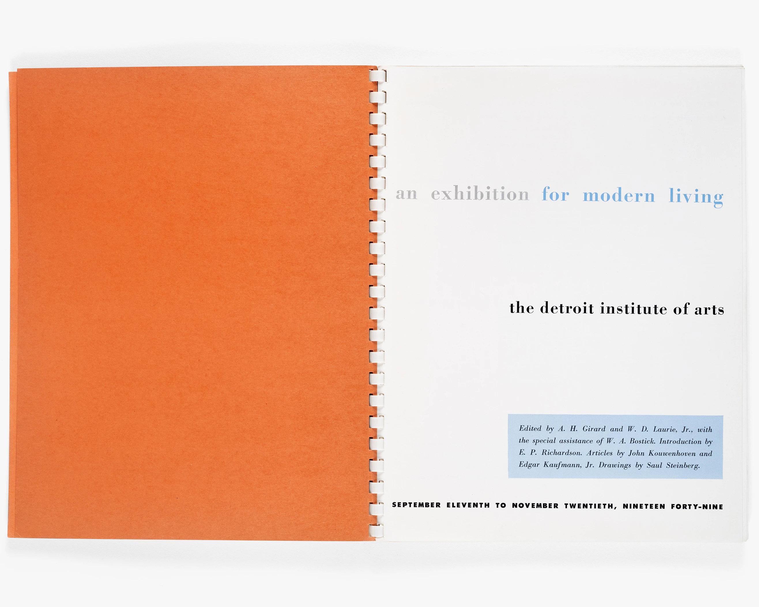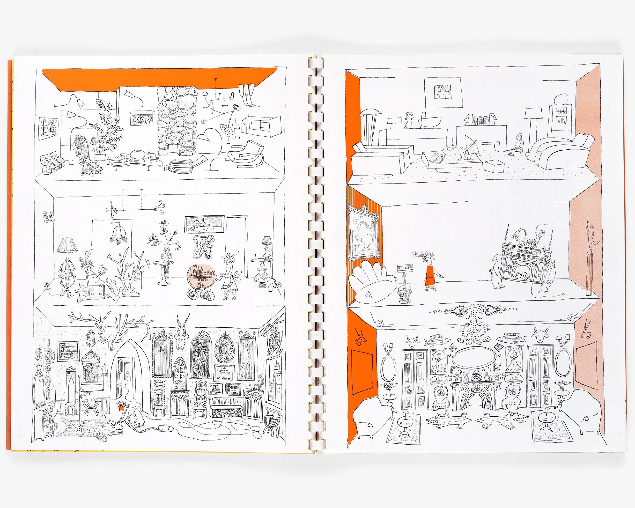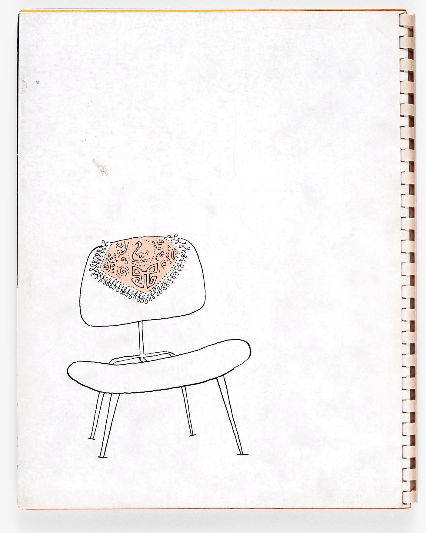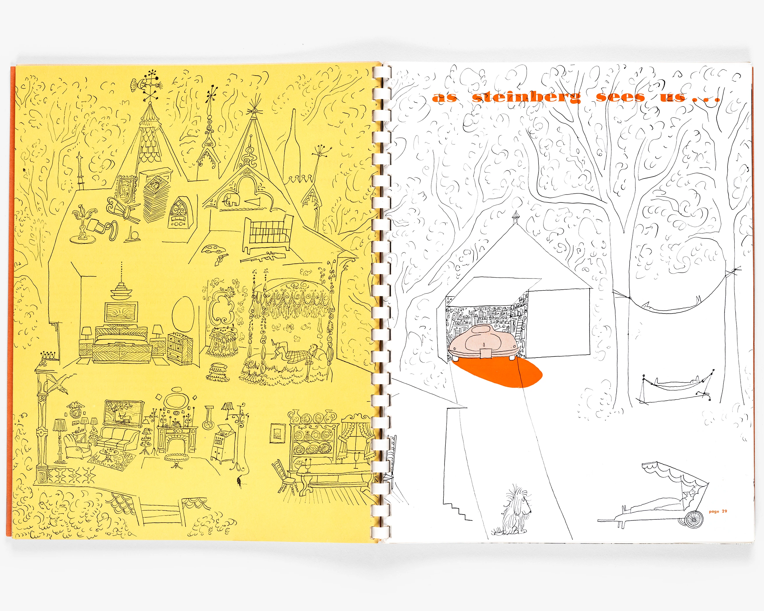 Saul Steinberg likely first crossed paths with the Eameses when they participated in An Exhibition for Modern Living at the Detroit Institute of Arts, a showcase of modern design that was organized by the Eameses’ close friend Alexander Girard in 1949. The exhibition included a “Hall of Objects” displaying various housewares as well as seven rooms by leading designers, including George Nelson, Eero Saarinen, and the Eameses. The Eames room featured their molded plywood chairs arranged around a folding table, a prototype of the La Chaise lounge chair, and multiple Eames Storage Units—all enlivened by bouquets of flowers, paper kites, and a light fixture dubbed the Galaxy Light that resembled both a model of an atom and a starburst. Steinberg’s distinct contribution to the show was a series of drawings photographically enlarged into a mural that depicted the panoply of design in modern life through his unique artistic lens. The exhibition was extensively documented in this catalog, which includes numerous examples of Eames furniture and drawings by Steinberg, many of which speak to the evolving tension between traditional and modern styles. The drawing that appears on the catalog’s cover illustrates this relationship by depicting a man engrossed in a newspaper. He sits on a simple modern side chair while the ornate armchair before him is reduced to a footrest, making a clear statement of preference for modern styles over traditional ones.