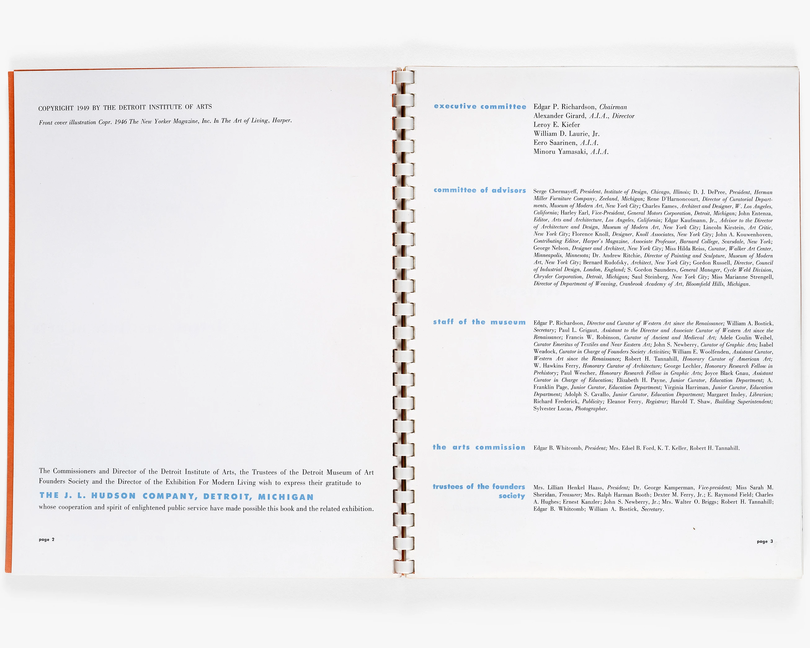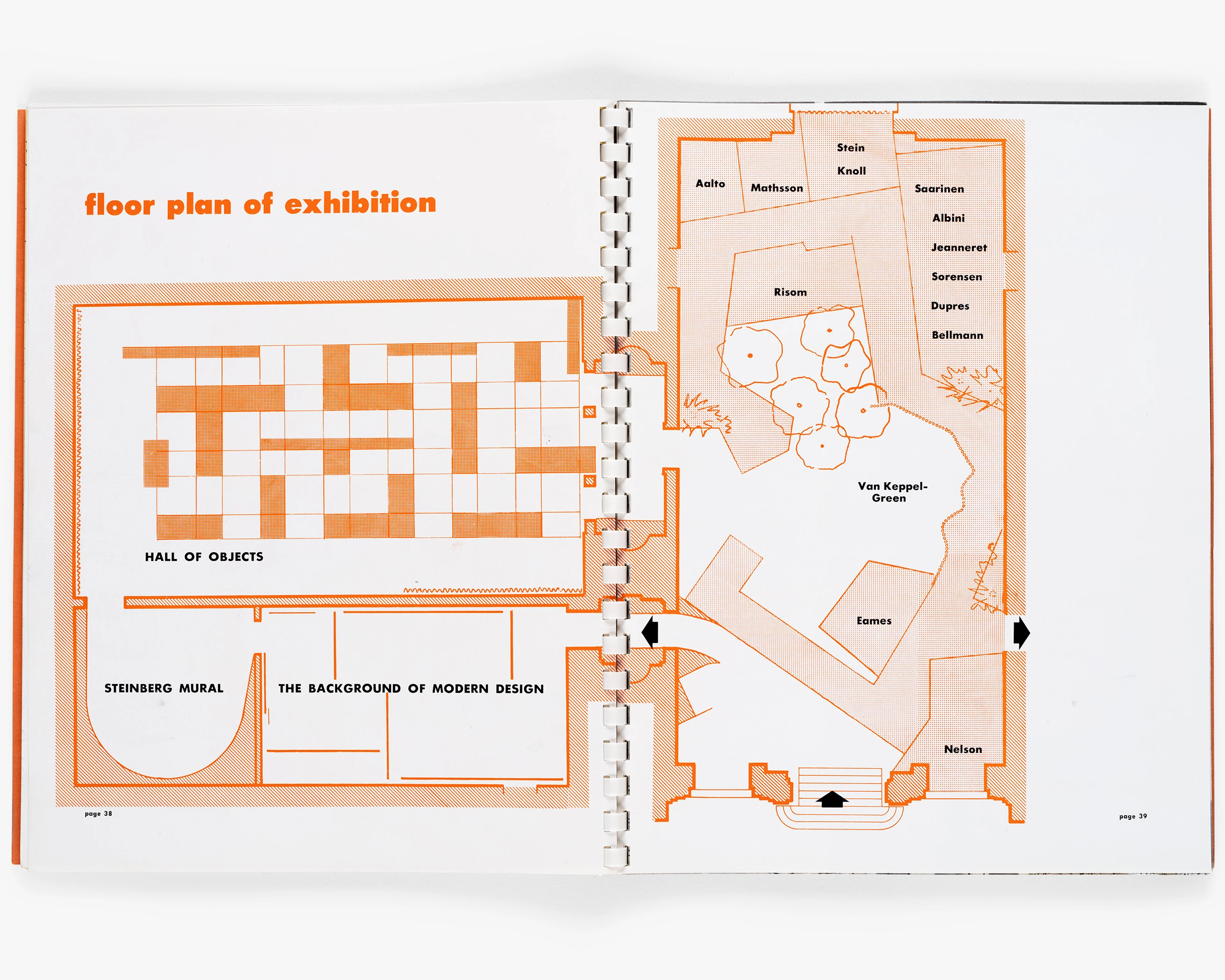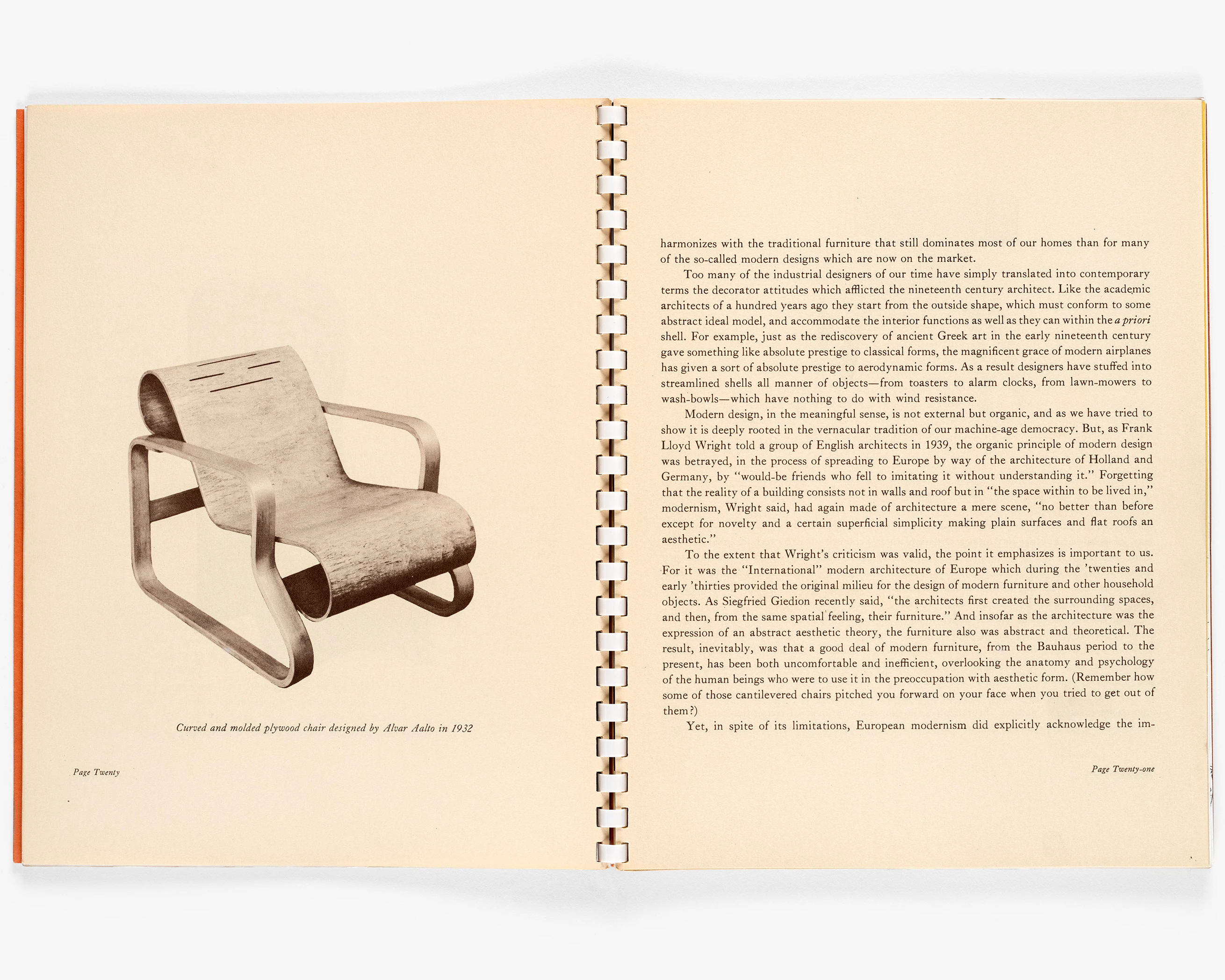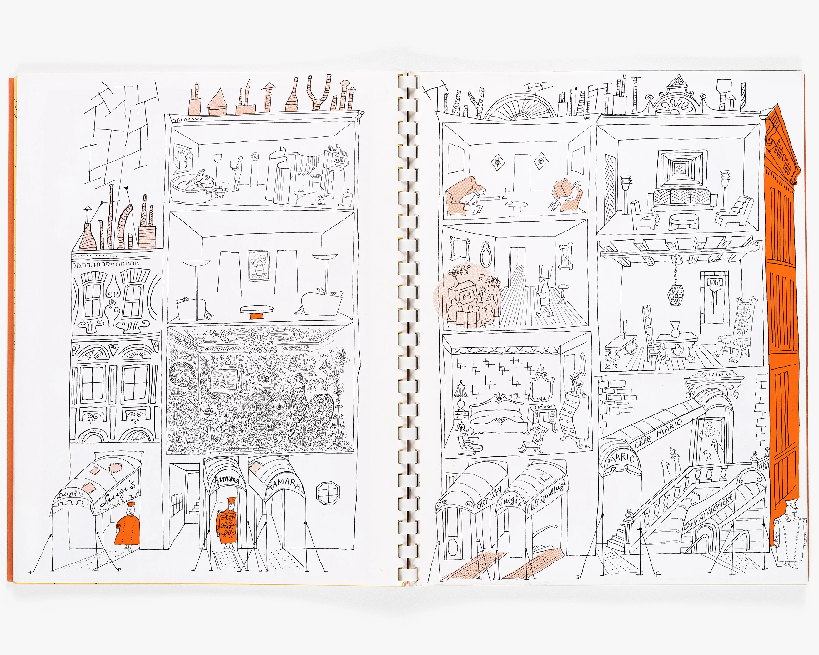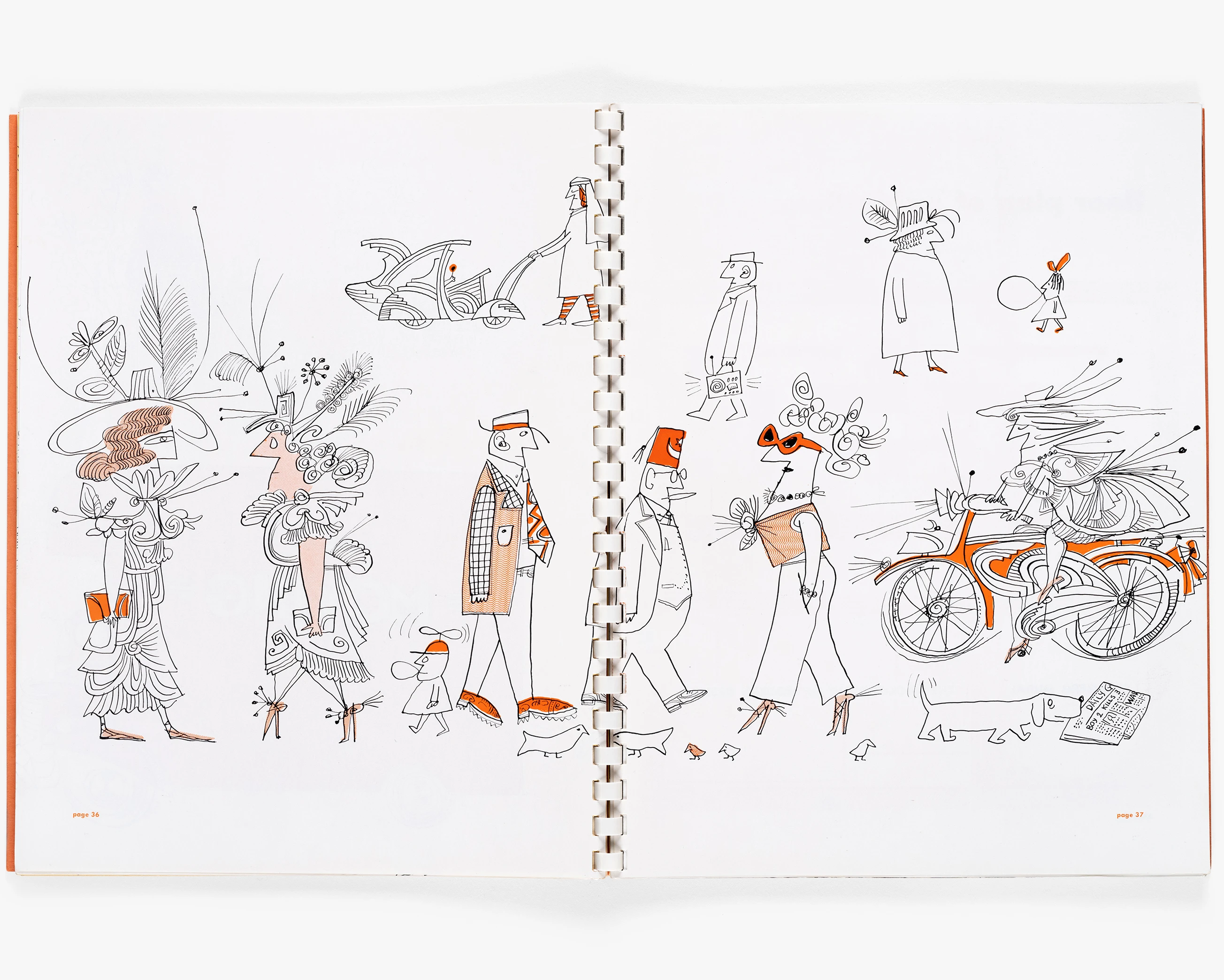 Saul Steinberg likely first crossed paths with the Eameses when they participated in An Exhibition for Modern Living at the Detroit Institute of Arts, a showcase of modern design that was organized by the Eameses’ close friend Alexander Girard in 1949. The exhibition included a “Hall of Objects” displaying various housewares as well as seven rooms by leading designers, including George Nelson, Eero Saarinen, and the Eameses. The Eames room featured their molded plywood chairs arranged around a folding table, a prototype of the La Chaise lounge chair, and multiple Eames Storage Units—all enlivened by bouquets of flowers, paper kites, and a light fixture dubbed the Galaxy Light that resembled both a model of an atom and a starburst. Steinberg’s distinct contribution to the show was a series of drawings photographically enlarged into a mural that depicted the panoply of design in modern life through his unique artistic lens. The exhibition was extensively documented in this catalog, which includes numerous examples of Eames furniture and drawings by Steinberg, many of which speak to the evolving tension between traditional and modern styles. The drawing that appears on the catalog’s cover illustrates this relationship by depicting a man engrossed in a newspaper. He sits on a simple modern side chair while the ornate armchair before him is reduced to a footrest, making a clear statement of preference for modern styles over traditional ones.