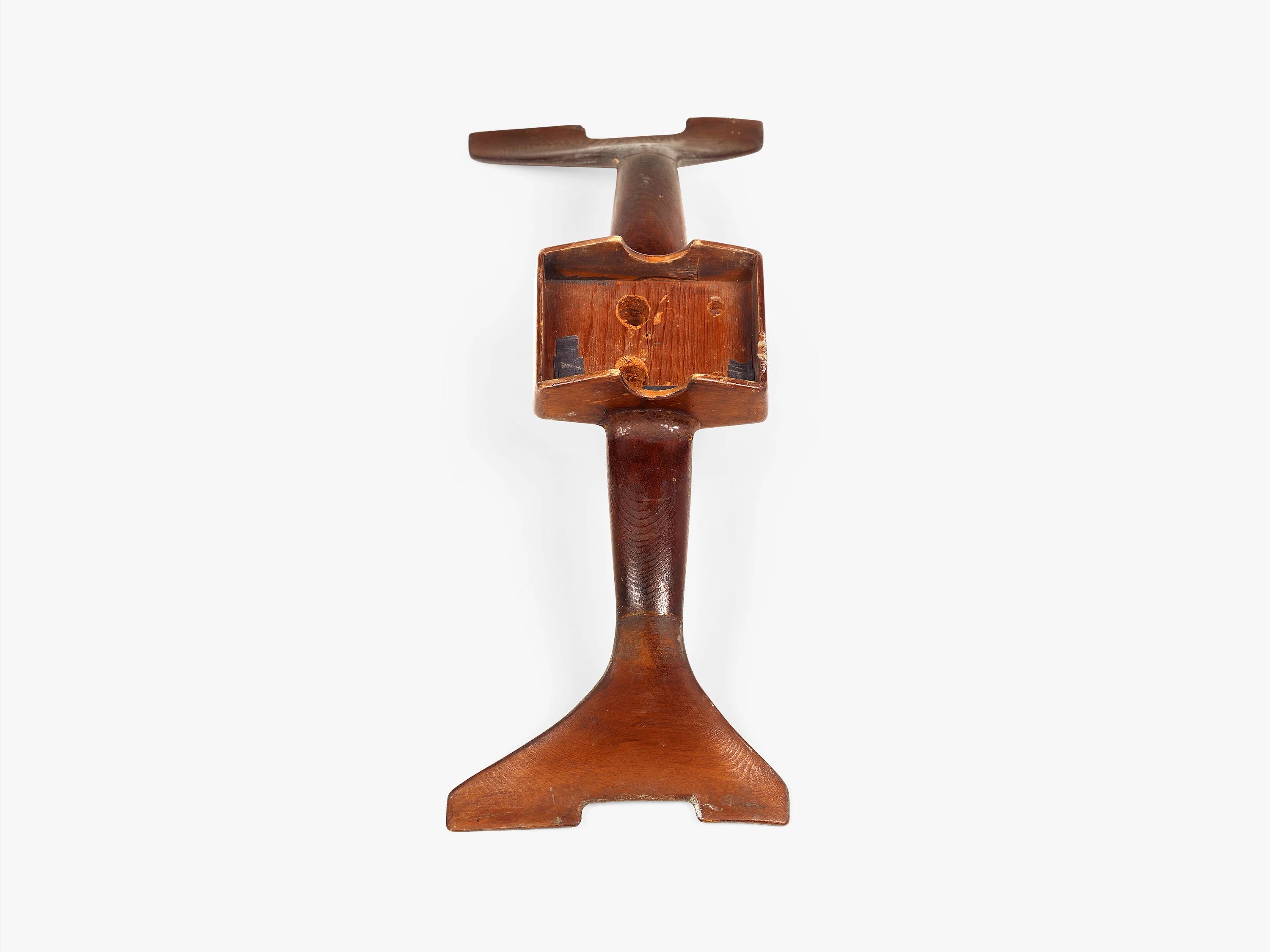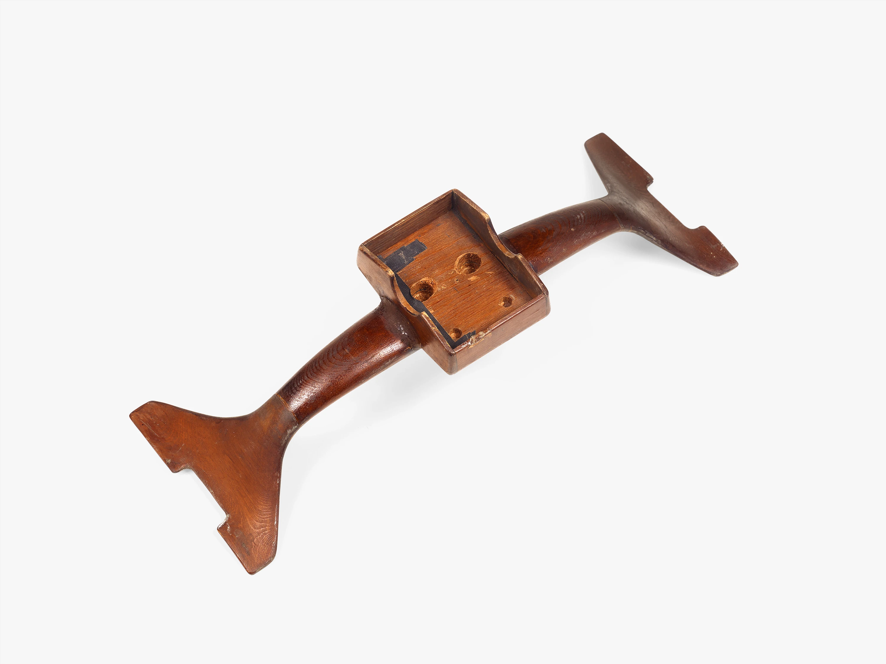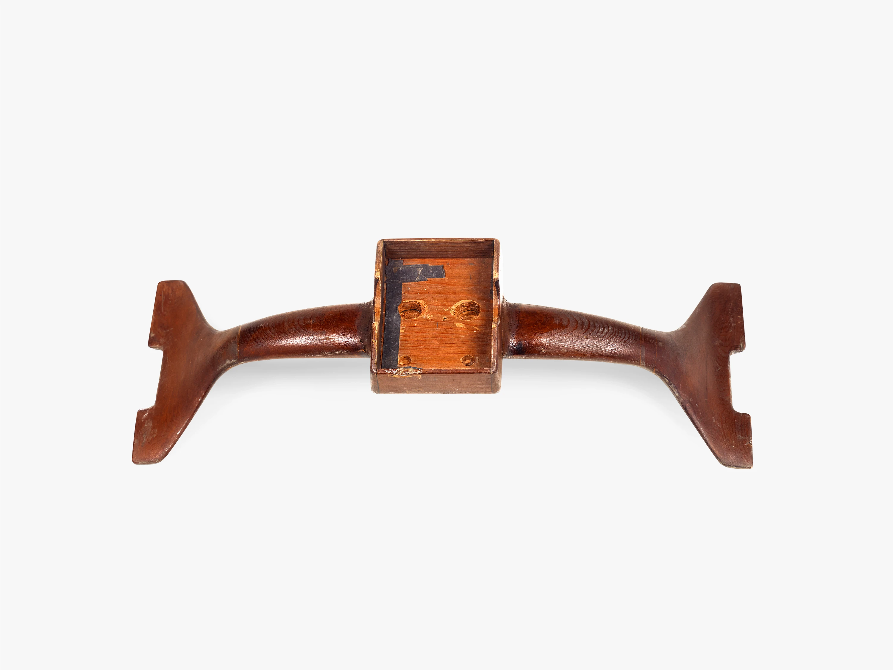 A key conceptual feature of the Eames Aluminum Group is the pair of aluminum spreaders that hold the upholstery taut between two aluminum side members. These spreaders create the necessary tension for transforming fabric into a supportive seat and backrest. Dubbed “antlers” by the Eames Office staff thanks to their distinctive shape, one spreader is located midway up the chair’s back and doubles as a handle. The other is located underneath the seat and serves both to stretch the textile and to attach the body of the chair to its base. In this instance, the spreader also features a rectangular box affixed at its center. Open on one side, the box was designed to fit over the tilt mechanism used for the reclining chair, which allowed a sitter to adjust the chair’s angle by manipulating a protruding handle. The two rounded notches on either side of the box allowed the entire body of the chair to pivot forwards and backwards over the mechanism. This device gave the reclining chair a somewhat clunkier profile than the others in the collection, but also enhanced its functionality and comfort.
