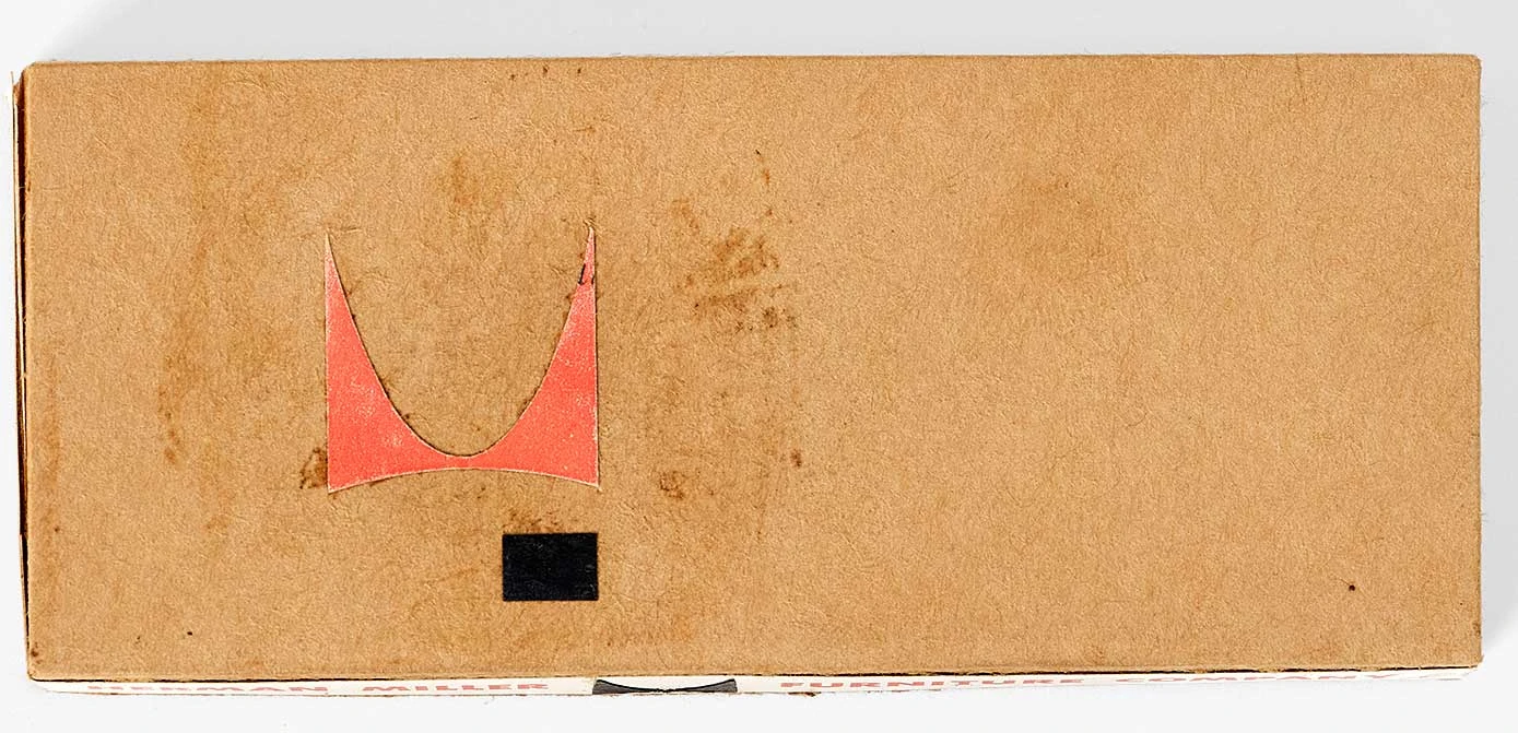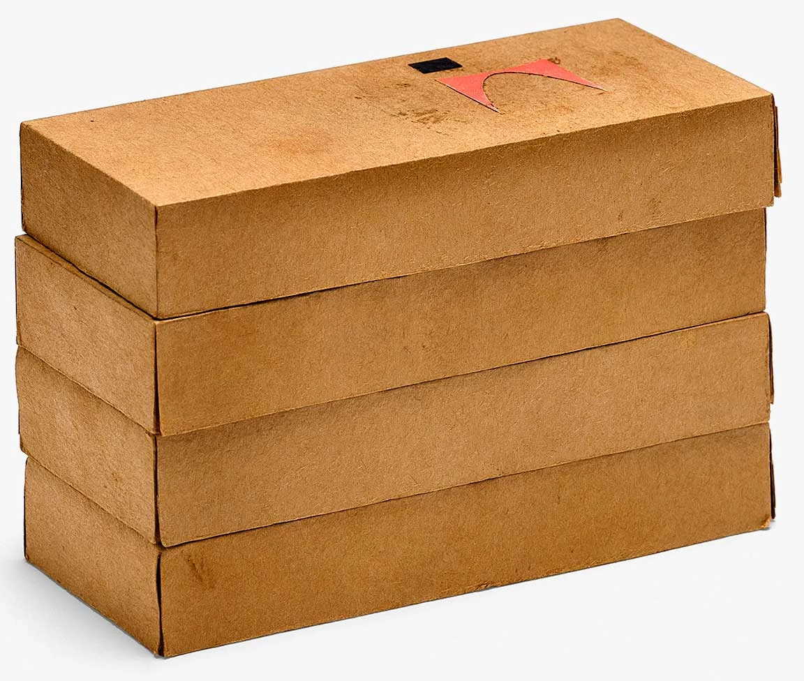This diminutive model of the box for their 1954 Sofa Compact (later known as the Compact Sofa) bears a relatively simple design, with manufacturer Herman Miller’s brand name and logo serving as the primary graphic elements. Though simple, the design of the box is highly thought out, as the packaging for the Sofa Compact was an integral aspect of the design concept itself. Specifically, with this sofa the Eameses sought to achieve affordability by reducing shipping costs—without sacrificing the dimensions of the sofa, which was full-length and high-backed. Typically, such items were shipped in large crates, but because shipping costs were largely determined by volume (rather than weight), the Sofa Compact was designed to be shipped in pieces that fit into a slender box. This minimized its packed dimensions but required the customer to assemble its steel frame and foam rubber cushions upon delivery, making it an early example of flat-packed furniture. This now-common approach is often associated with Swedish furniture manufacturer IKEA, though the Eames Office designed the Sofa Compact three years before IKEA introduced flat-packing to Sweden. The long, thin box itself is a manifestation of the flat-packing concept: three flat-packed, boxed sofas could be shipped in the same amount of space as one fully assembled sofa.