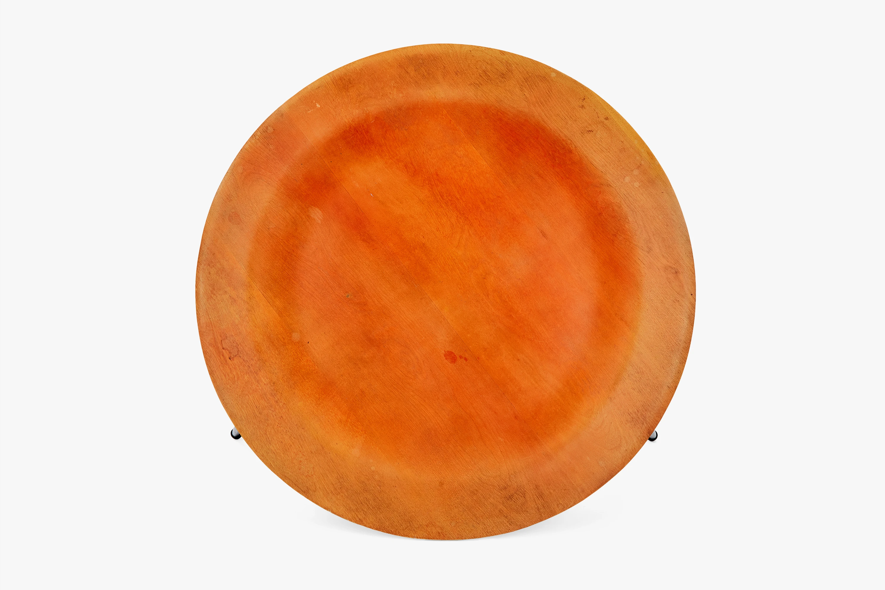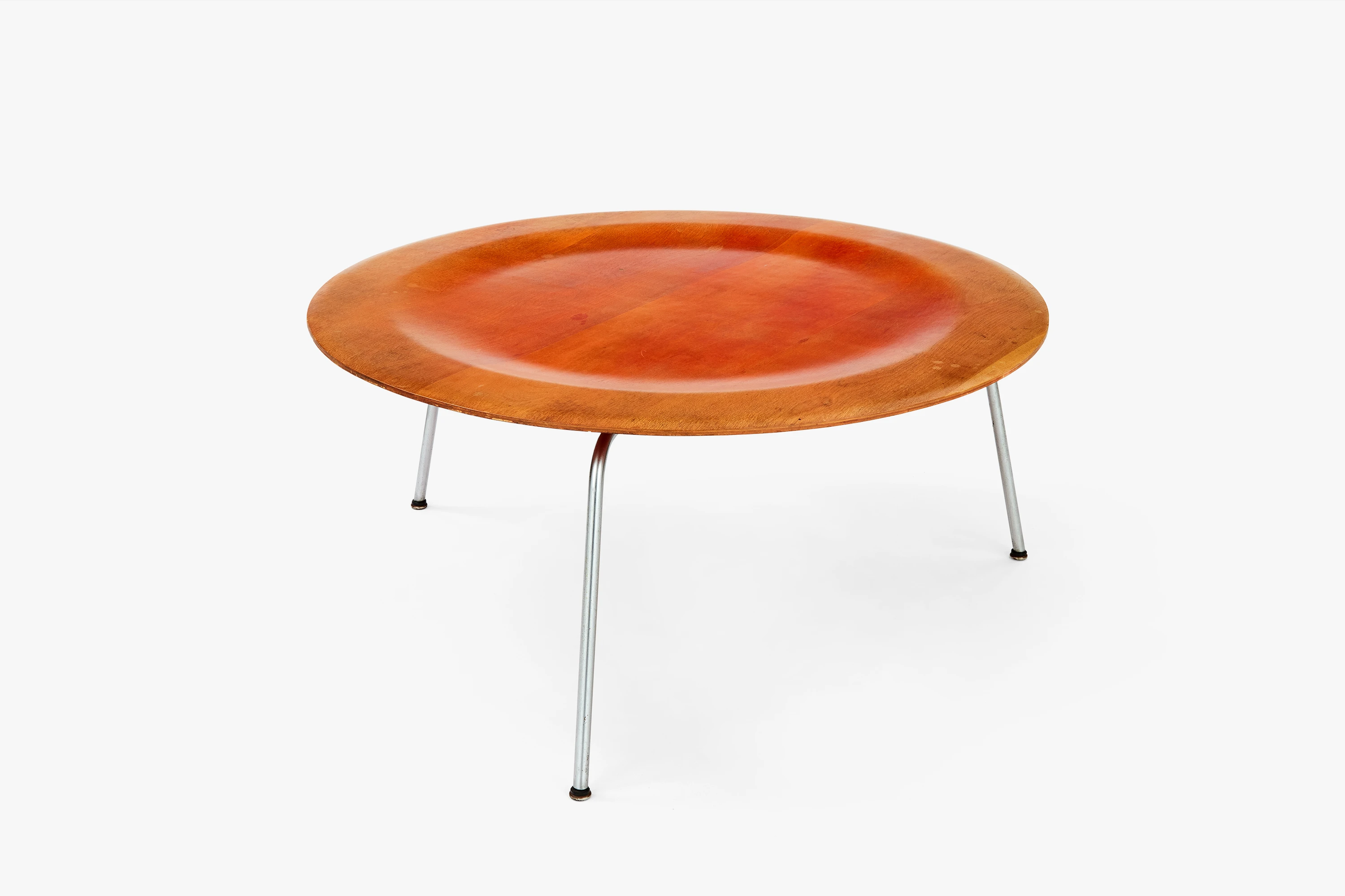 The design for the top of this rare, three-legged coffee table originates from the Eameses’ first group of plywood furniture that debuted in late 1945, and was commercialized by the Evans Products Company’s Molded Plywood Division in 1946. As the label on the underside of the table states, these designs were distributed and sold by the Herman Miller Furniture Company in a contractual relationship that would last until 1949, when Herman Miller took over all production of Eames furniture. In the case of this model, the five ply-layered top is set atop three slender legs that are made of steel. The decision to include only three legs stems in part from the Eameses’ concern for minimizing their designs’ materials, and hence their cost. This also relates to their interest in creating furniture that would not draw attention to itself, lest it distract from the so-called “business of living.” To compensate for the reduction in structural integrity afforded by the three-legged design, rubber shock absorbers were attached to a steel ring at the center of the tabletop’s underside, where the legs were also connected. While this increased the table’s stability, ultimately a fourth leg was added in later productions.