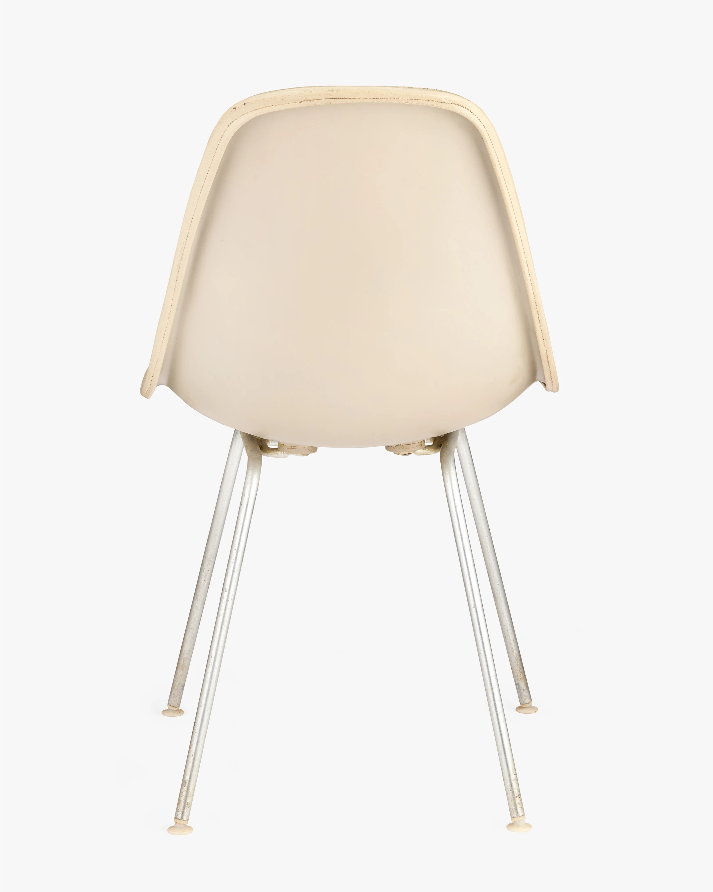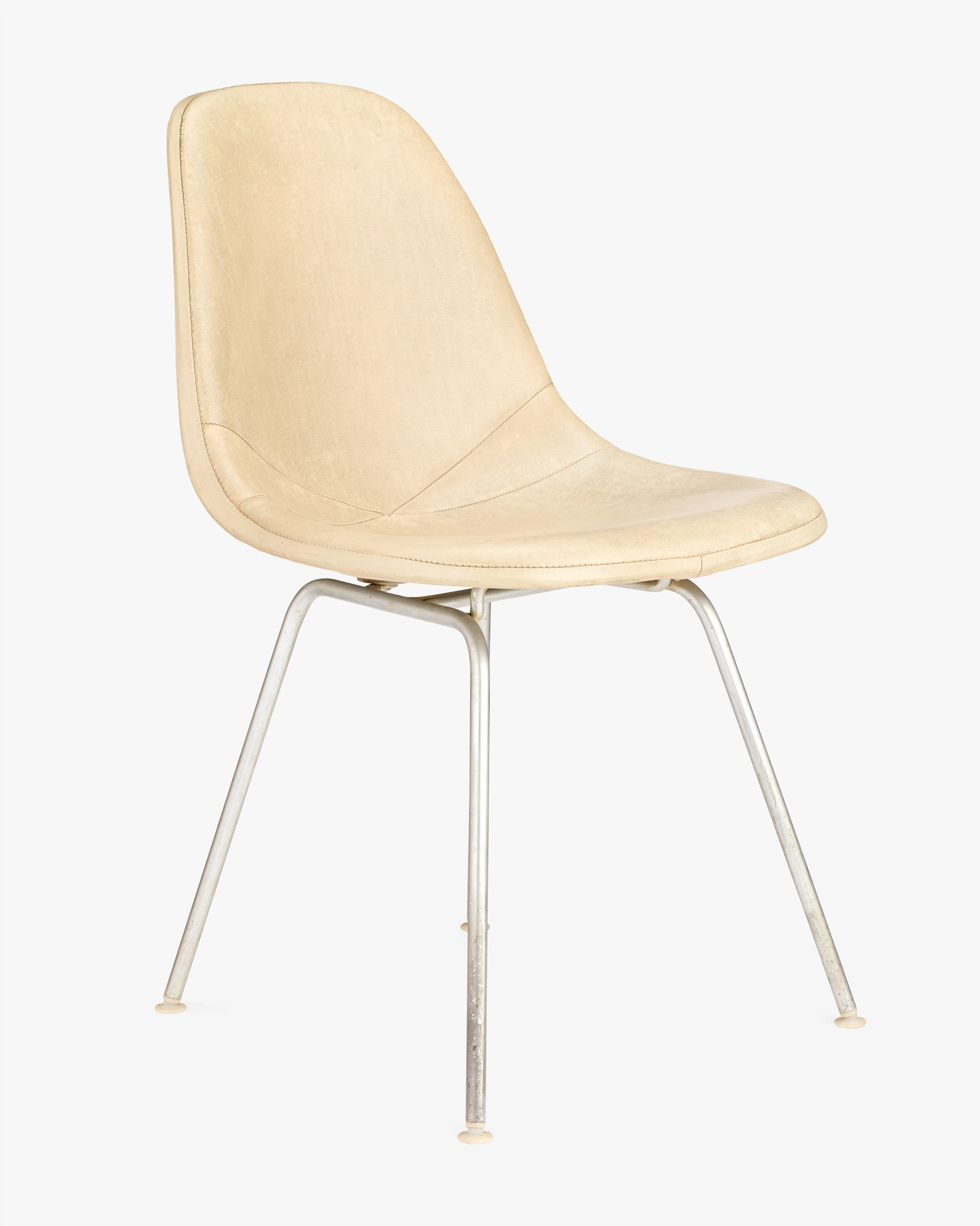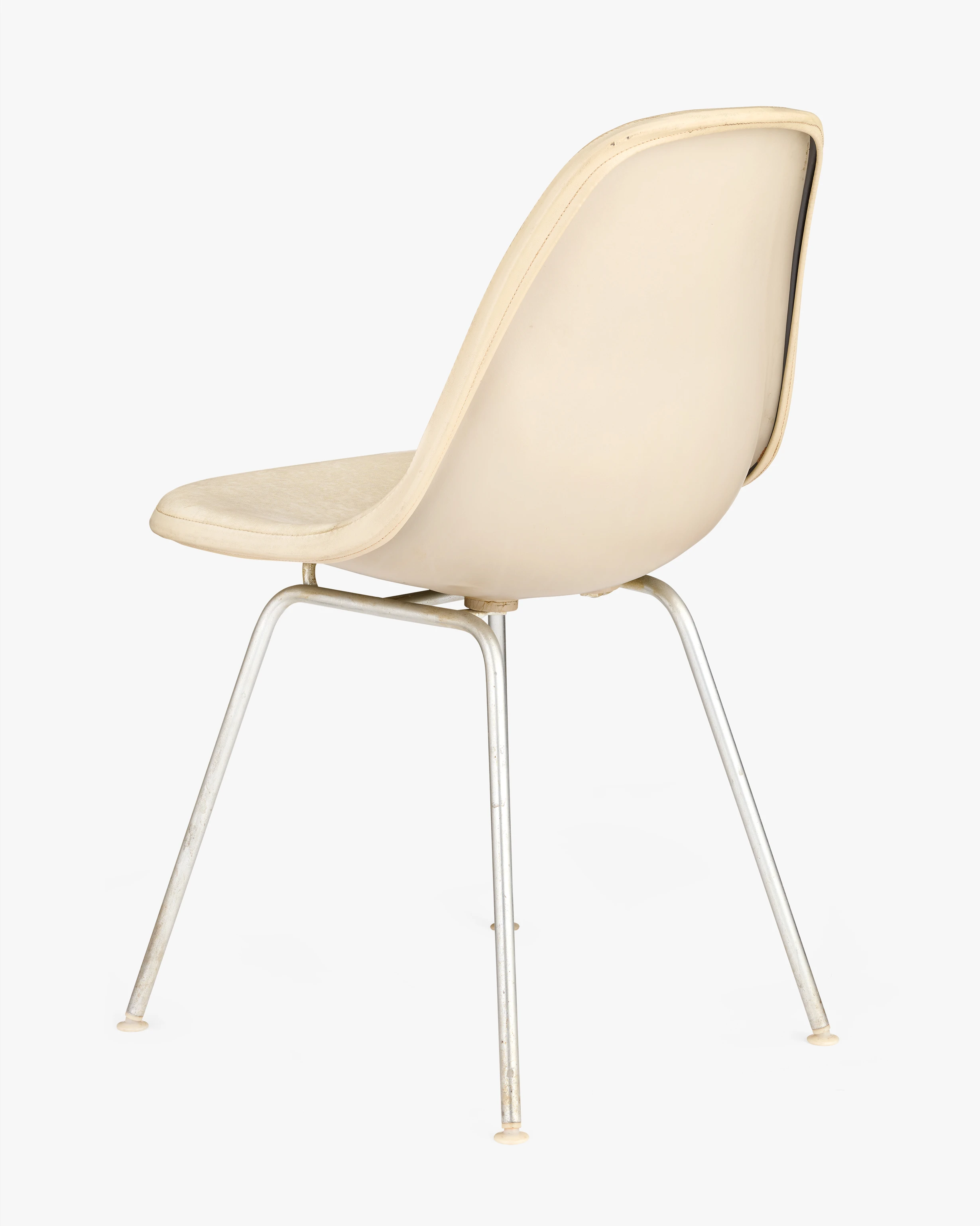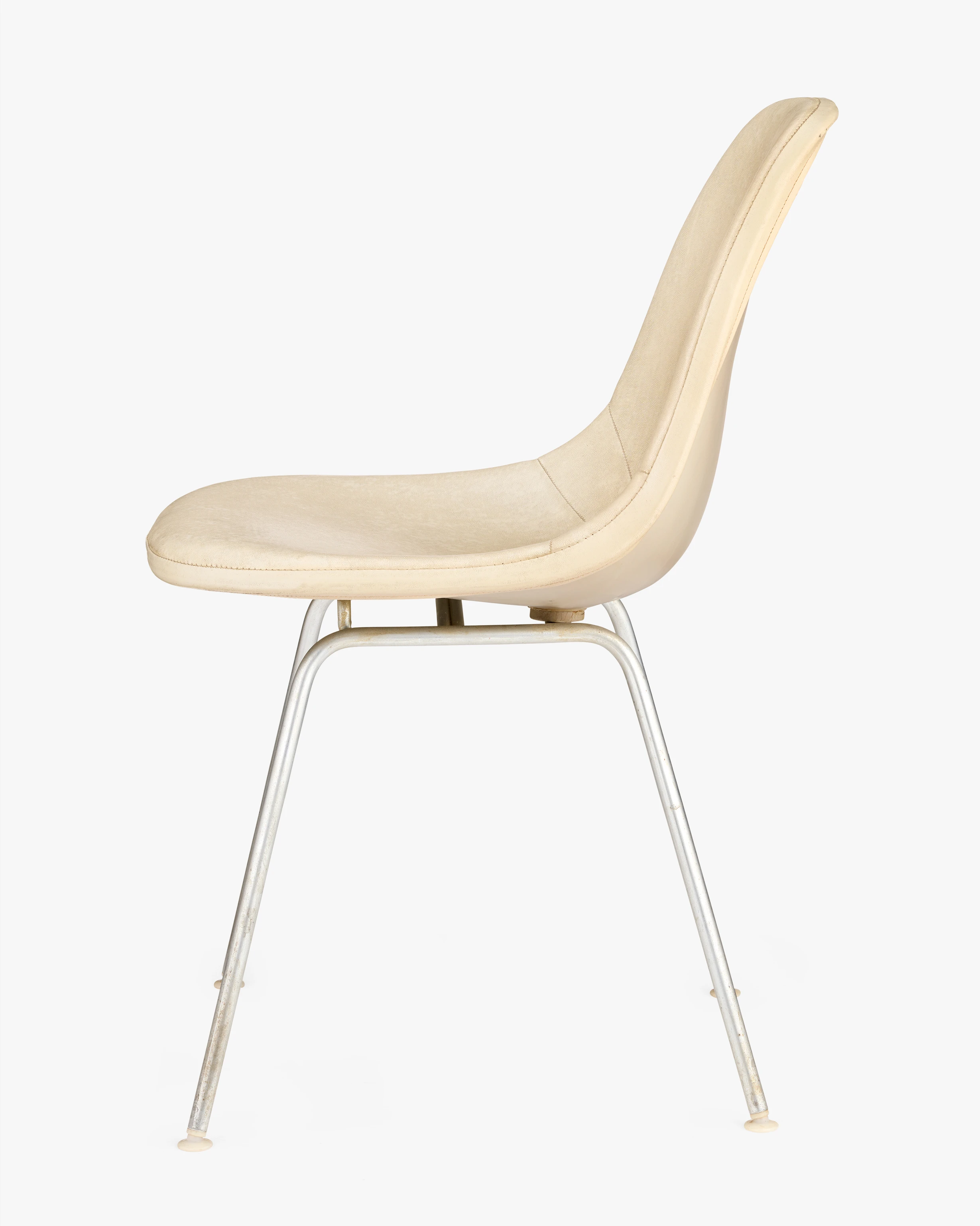 An example of the earliest upholstery in production on the Side Chair, this color is possibly Raw Umber Light and has a painted back—unique to the upholstered chairs. A wraparound system was developed to upholster the Side Chairs. Then the pads were held in place by wires concealed under the wrap around at the edges. DSX-1 stands for Dining (height) Side (chair) X (base) 1 (upholstered).
