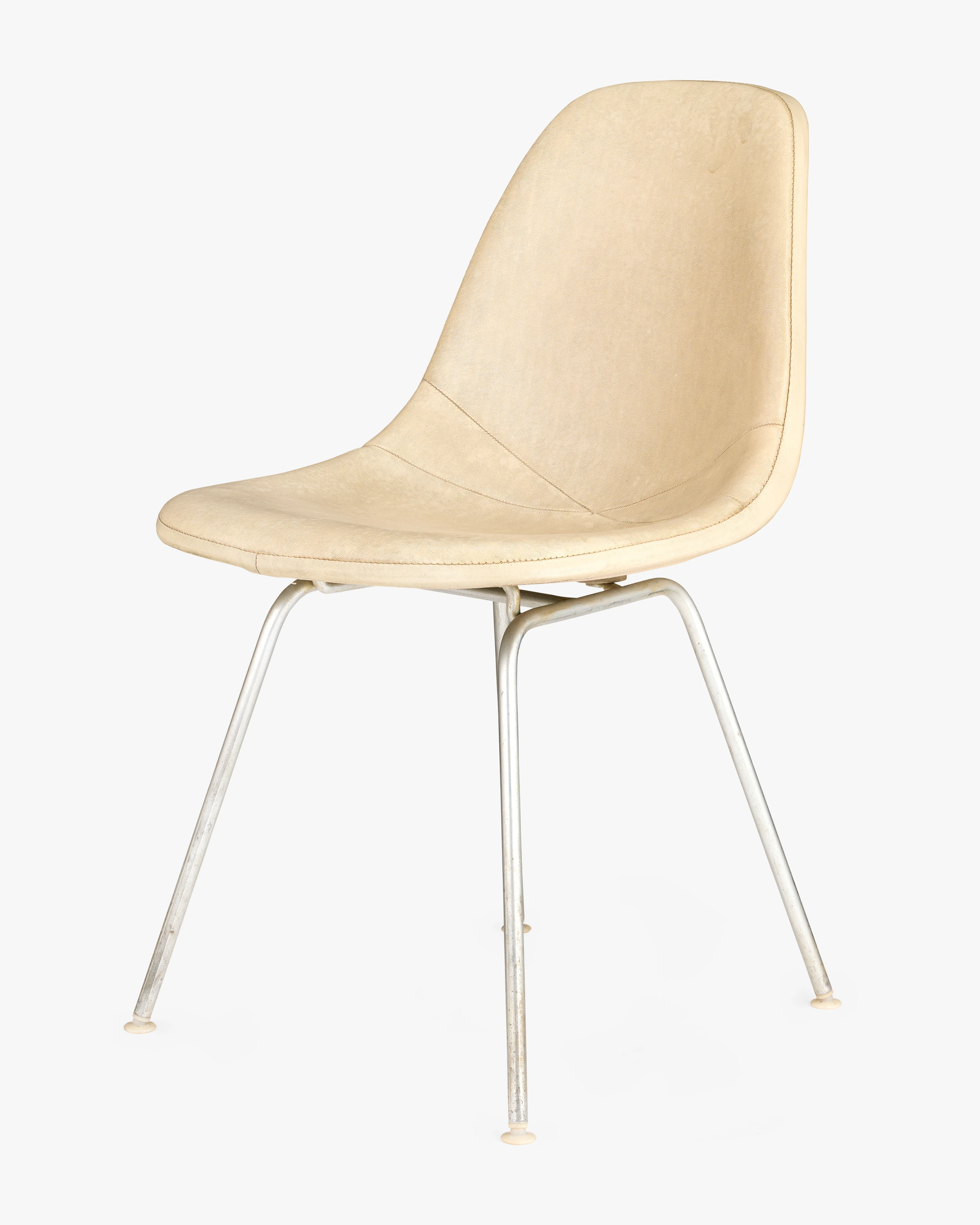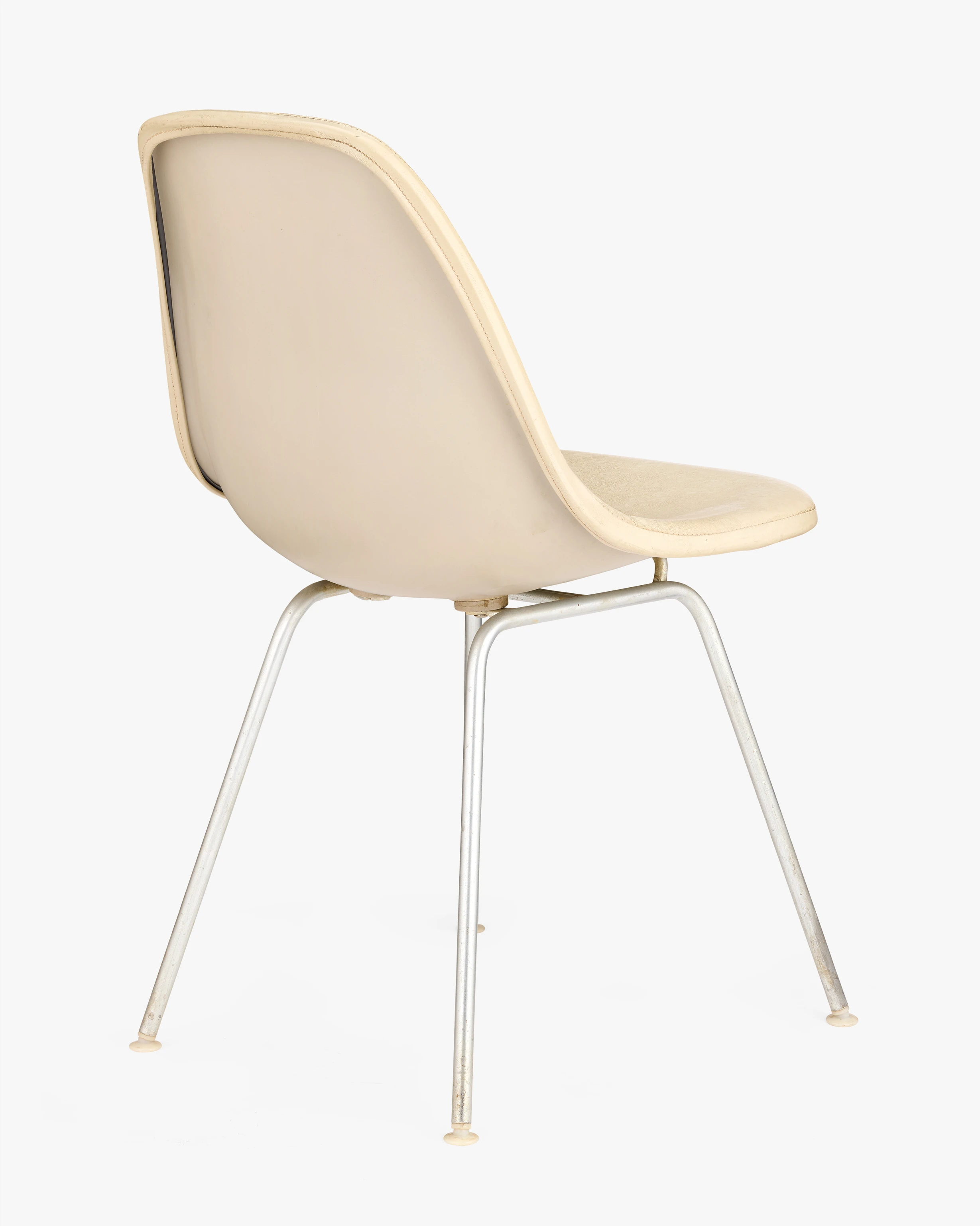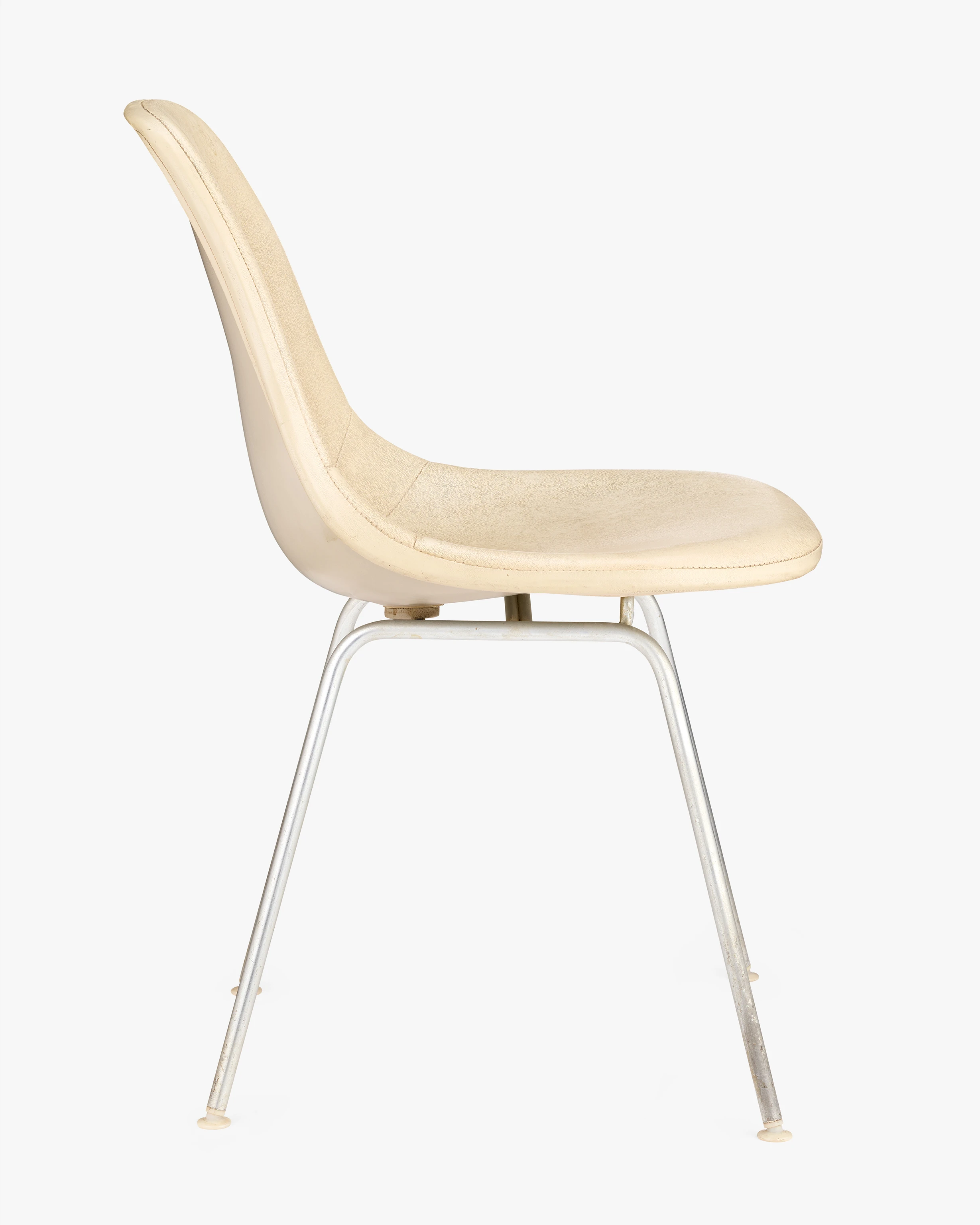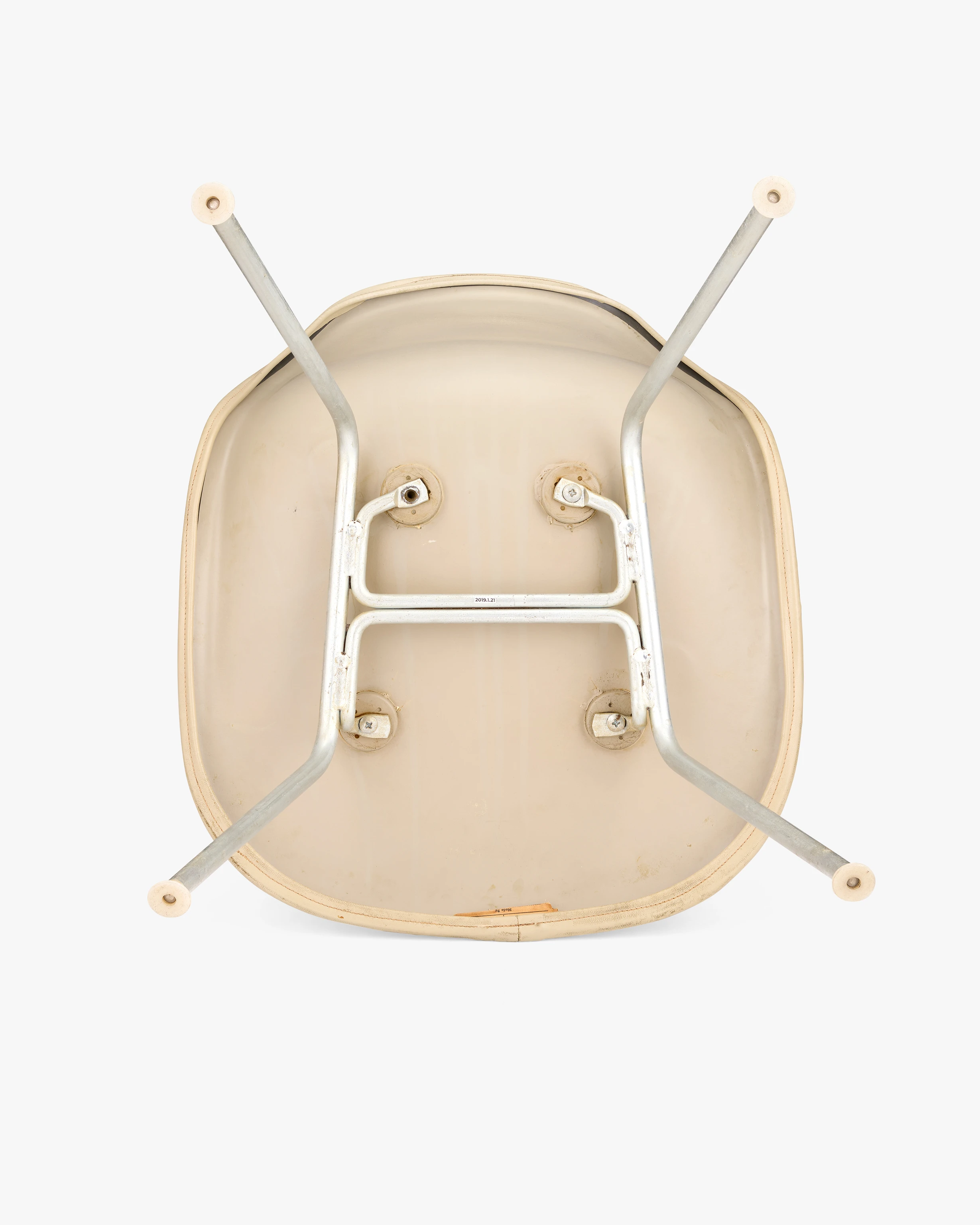 An example of the earliest upholstery in production on the Side Chair, this color is possibly Raw Umber Light and has a painted back—unique to the upholstered chairs. A wraparound system was developed to upholster the Side Chairs. Then the pads were held in place by wires concealed under the wrap around at the edges. DSX-1 stands for Dining (height) Side (chair) X (base) 1 (upholstered).
