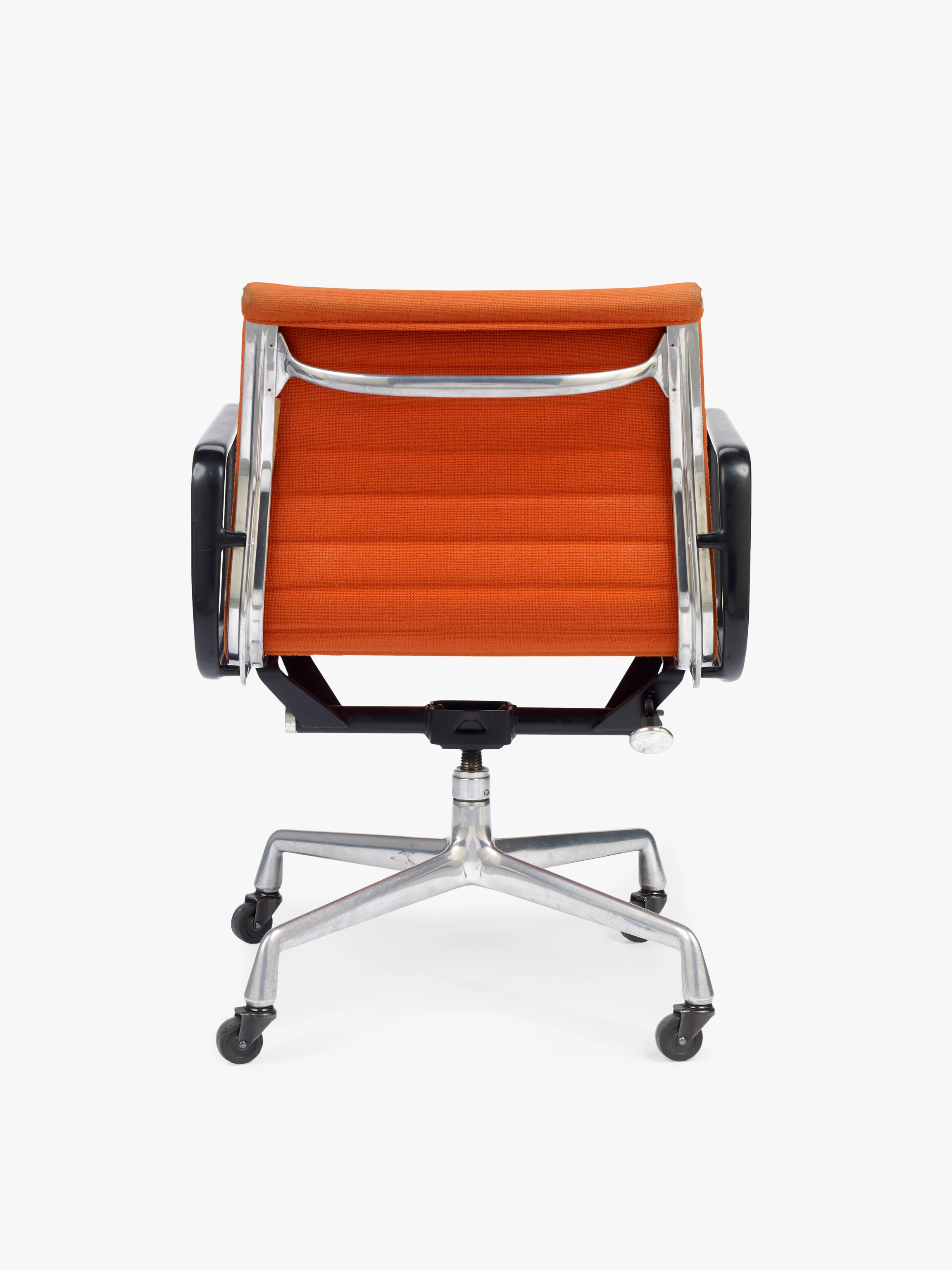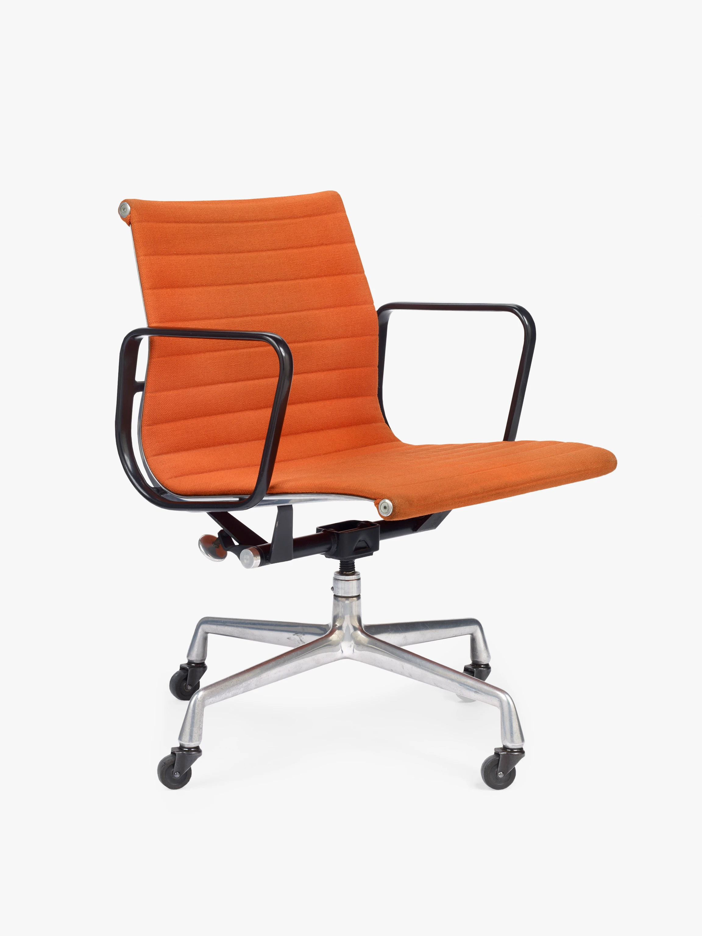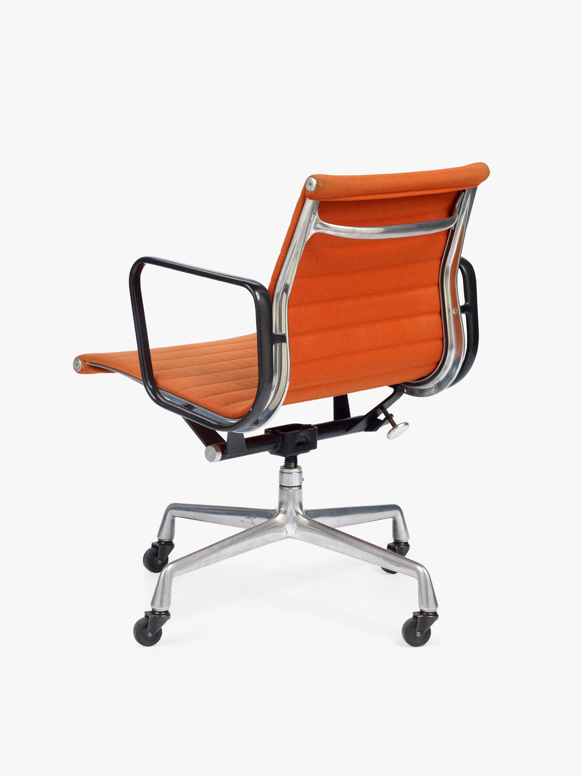 This desk chair reflects modifications made to the design of the Eames Aluminum Group by manufacturer Herman Miller in cooperation with the Eames Office in 1973. The chairs’ seats were made slightly wider and deeper, which required elongating the all-important aluminum spreaders. The change resulted in a more comfortable chair, which would have been especially important as the Eames Aluminum Group grew in popularity as office furniture. Unlike their use in homes or restaurant dining rooms, at work a user would often be seated for many hours at a time. In the 1960s, corporations and designers alike began to realize the benefits of comfort upon well-being and productivity, and so began to pay increasing attention to the idea of so-called “ergonomic” office furniture. Furniture manufacturer Herman Miller led the way with the release of the “Action Office” in 1964, generally regarded as the first open-plan office system and emphasized—both in name and design—the benefits of agility, flexibility, and mobility in the workplace. The early 1970s adjustments to the Eames Aluminum Group reflects a similar interest in improving office environments, and also anticipated the concerns addressed by industrial designer Henry Dreyfuss in 1974, when his office began to publish the Humanscale reference guides for body dimensions, which were meant to aid designers in maximizing comfort and function for people of all sizes, genders, and abilities.