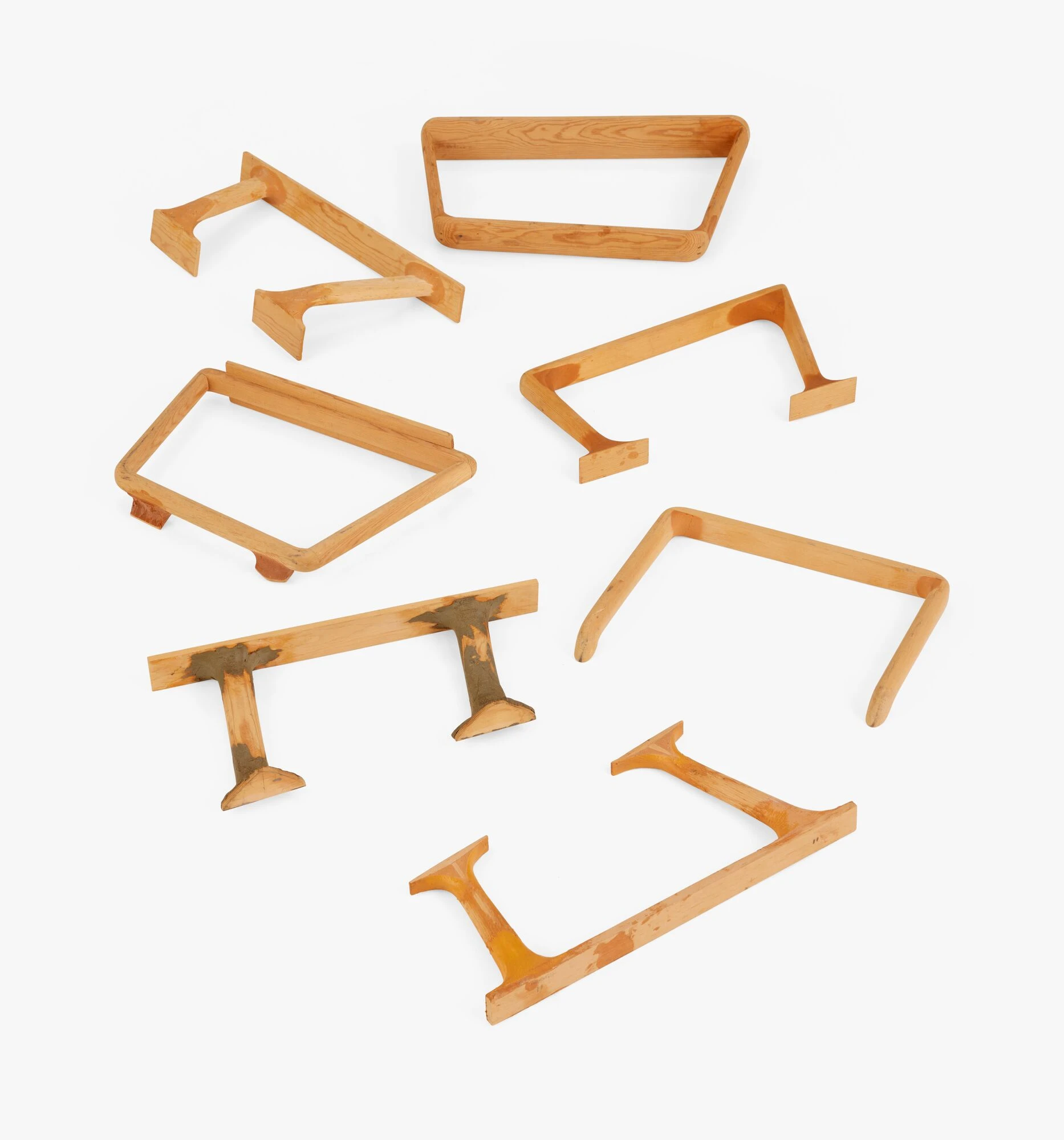 These angular wood forms are prototypes for the arms of the ES108 Eames Sofa, the last furniture design by the Eameses to be commercialized. The sofa’s origins lie with a strategic decision made by Herman Miller executives in the 1970s to have the Eames Office pursue development work with Vitra, the company’s European counterpart. In 1969, Vitra launched the now iconic Panton chair, establishing that they were not only capable of manufacturing and distribution, but also design development—a thrust they would continue to pursue in the 1970s with more complex products like the Vitramat office chair. (Herman Miller, tellingly, imported both designs to North America.) While Herman Miller was increasingly concerned with high volume systems furnishings, Willi Fehlbaum and his son Rolf, who would soon succeed him, remained deeply committed to the Eameses and their exacting approach to design. The Eames Sofa began development in the mid-1970s as a Soft Pad–like revision to both earlier Eames Sofas—the SX-73 Sofa Compact and 3473. When Charles passed away in August 1978, the prototypes of the new sofa did not have arms, but in the years after his death, Herman Miller pushed for their inclusion. These wooden forms (likely produced by staff member Dick Donges) offer clues to the many directions he and Ray considered for the cast forms that would support a supple leather cushion at either end of the sofa.