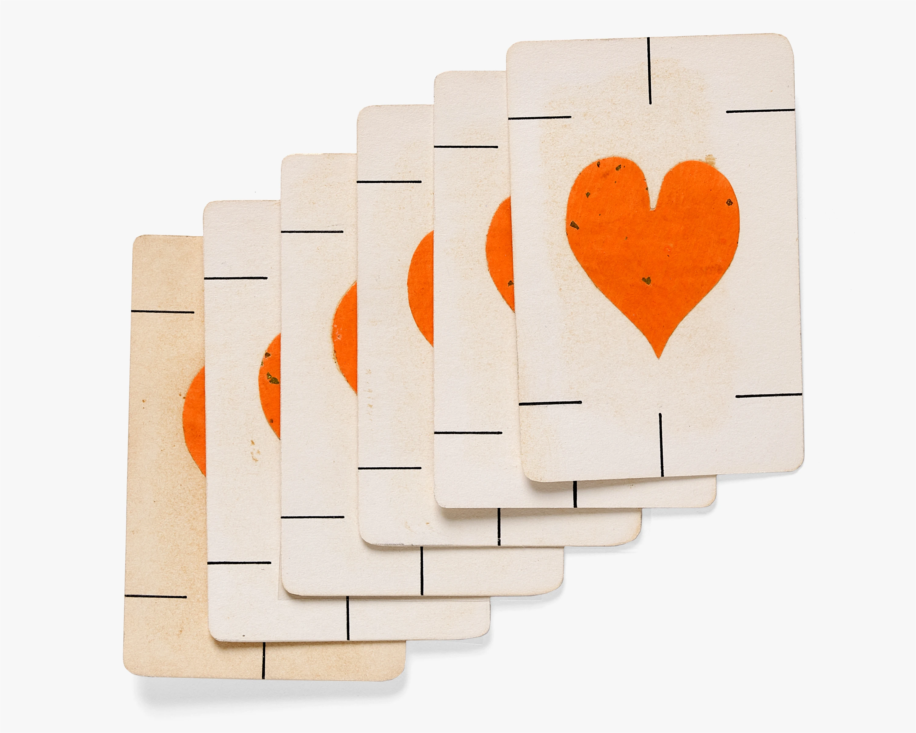 Although these mock-ups feature a design that ultimately did not appear in the House of Cards deck, they reference a key source of inspiration for the toy. The Eameses took standard playing cards—and the precarious structures that can be built with them—as a starting point when designing their House of Cards; these mock-ups call to mind the Ace of Hearts from a traditional deck. In this case, the red hearts—which Ray carefully cut from red paper and pasted to each card—are surrounded by six black lines that indicate where notches would be cut into the cards, allowing users to assemble sturdier structures than is possible with conventional playing cards. Hearts were a common motif in the Eames universe, appearing, for instance, as cutouts in the back of the Eameses' molded plywood children’s chairs. They also made frequent appearances in Ray’s correspondence, notes, and sketches.