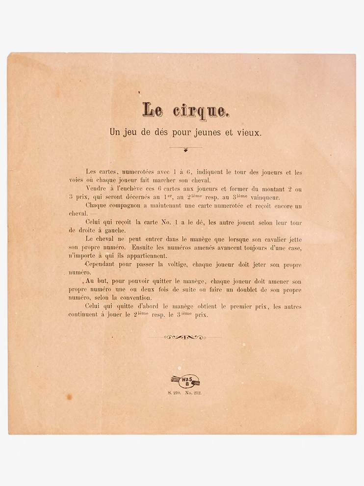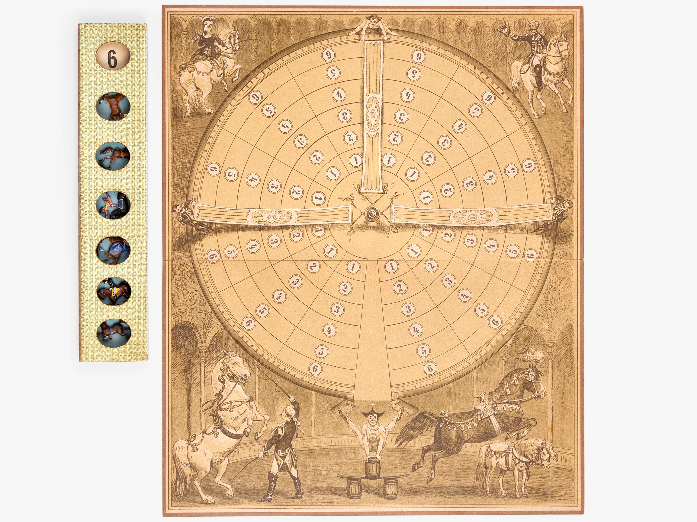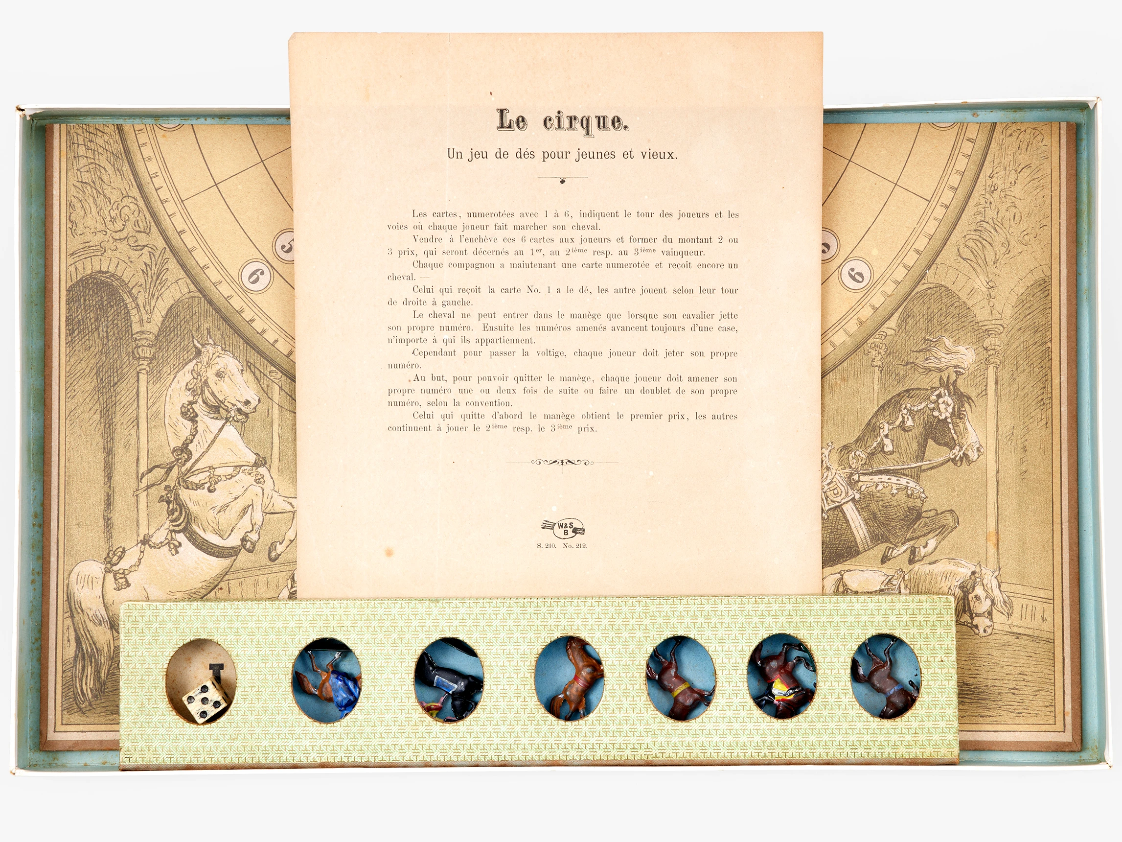 This board game takes the circus as a setting for a game in which players draw cards to move horse-shaped game pieces around a series of numbered concentric circles, racing to be the first to pass the acrobat and exit the manège, French for merry-go-round. Although it was produced by the New York–based publishing company McLoughlin Bros., the many languages that appear on its box indicate that the game was intended for international audiences. The game’s full title, The Circus: A Game for Young and Old, appears on the box in German, French, Dutch, and English. This multicultural packaging likely appealed to the Eameses, who believed in the universality of play—universal in the sense of something shared by all cultures, but also all ages, believing play was equally suited to children and adults. They were also no doubt attracted to the game because of their love for the circus.