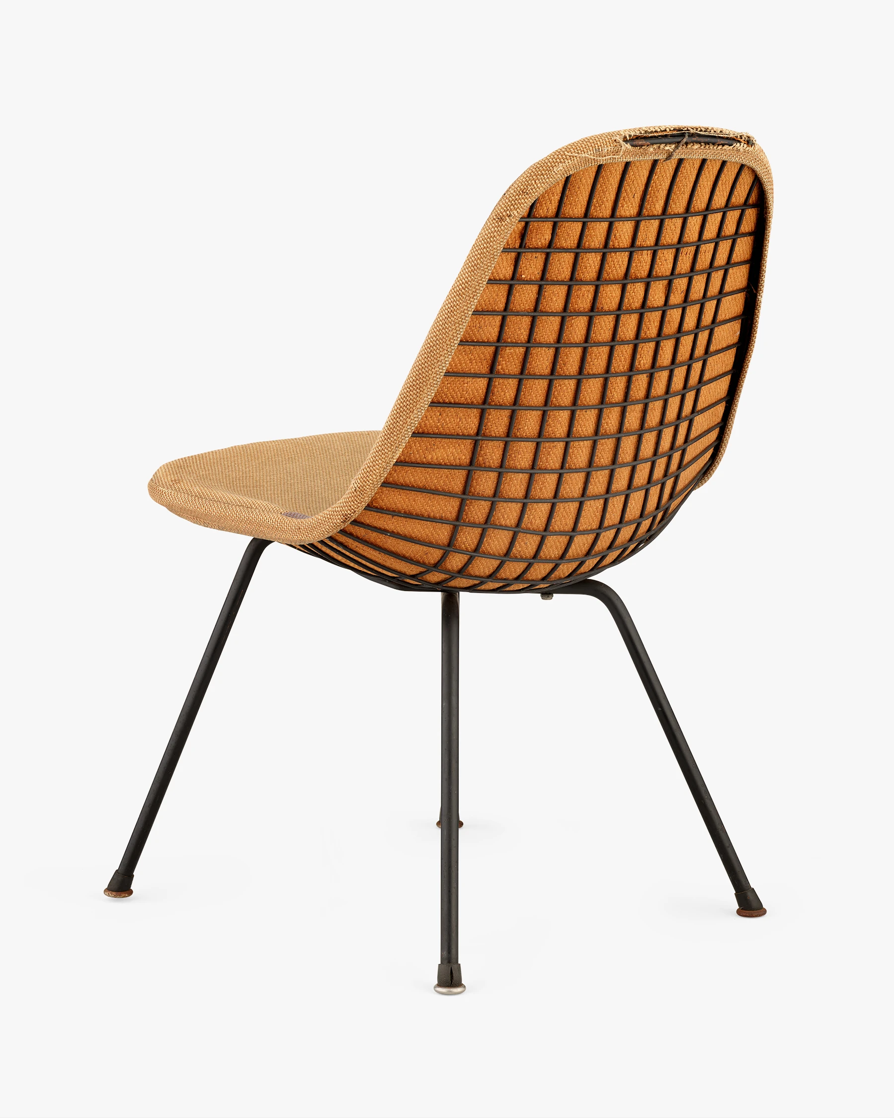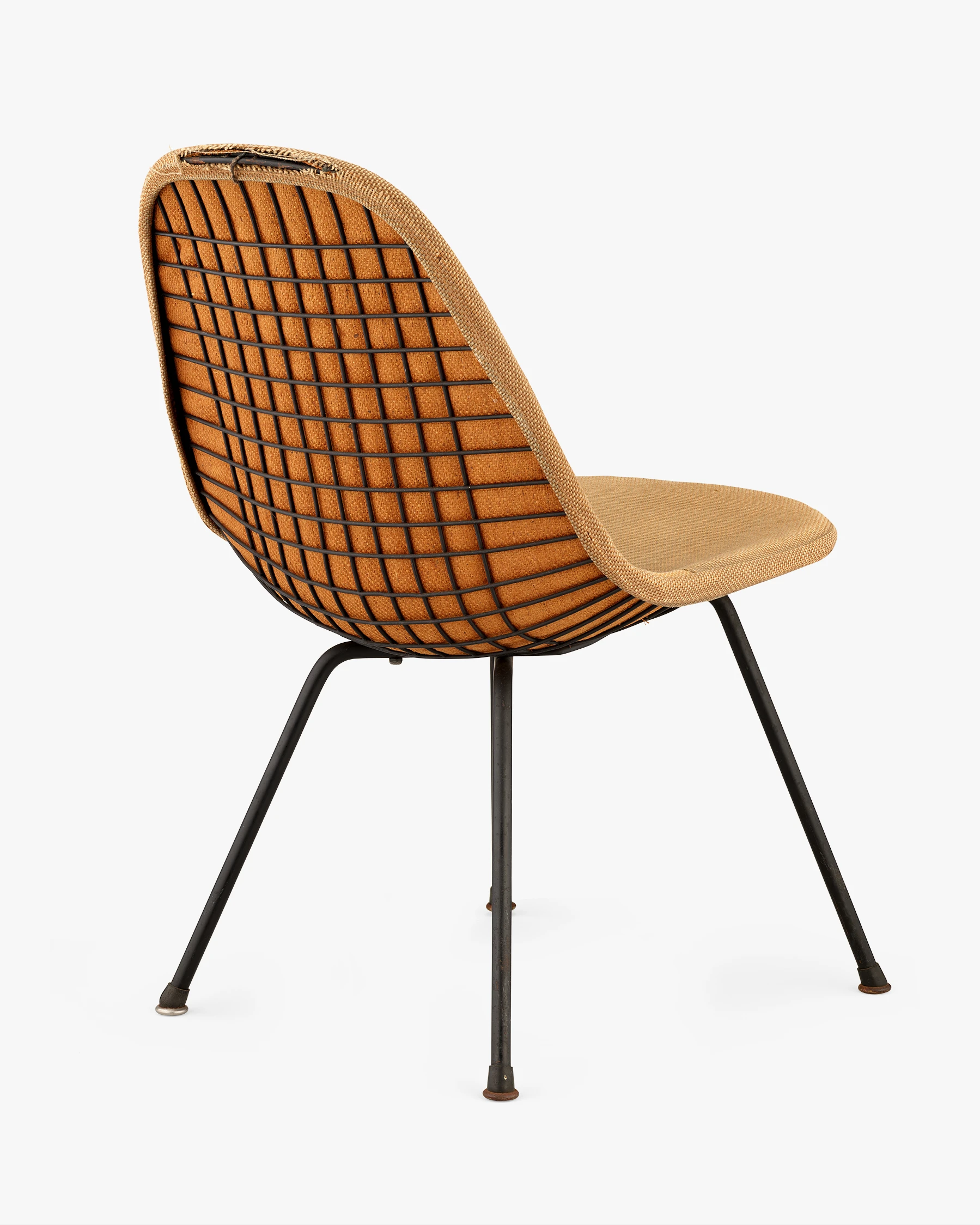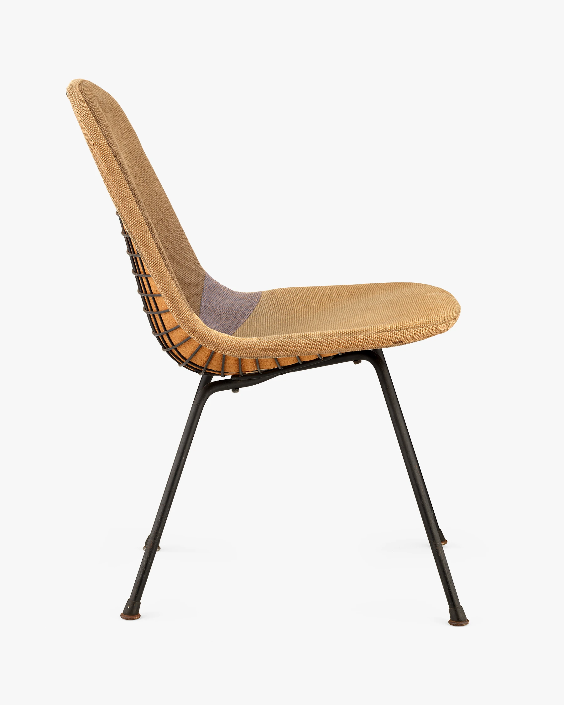 This Wire Chair on a four-legged, medium height base has a beautifully worn Harlequin pad designed by Ray Eames and Alexander Girard, Herman Miller’s director of textiles. The Harlequin upholstery came in four different color combinations, this one is made of sections of black, grey, beige, and blue. MKX-1 stands for Medium (height) K-(wire shell) X (four-legged base) 1 (1-piece upholstered pad) “D” (one of four types of Harlequin patterns).