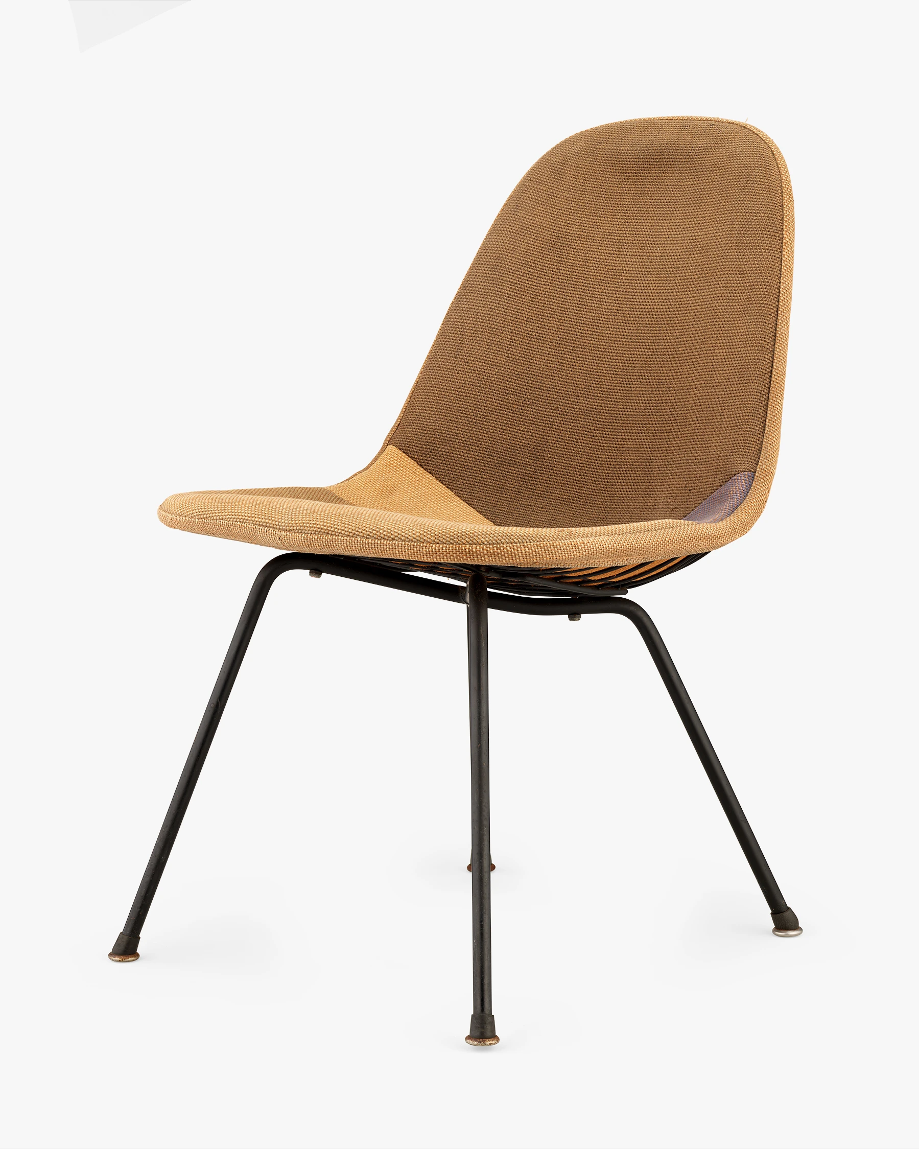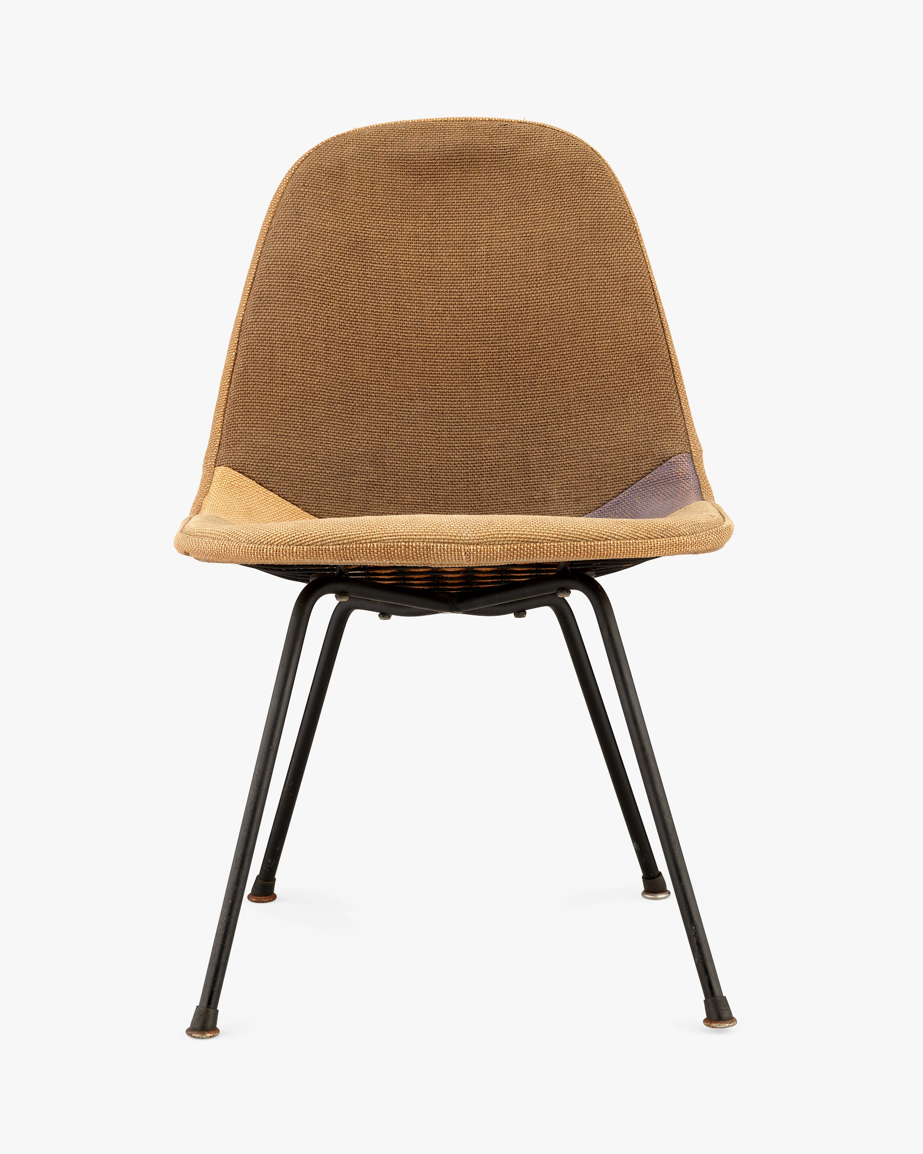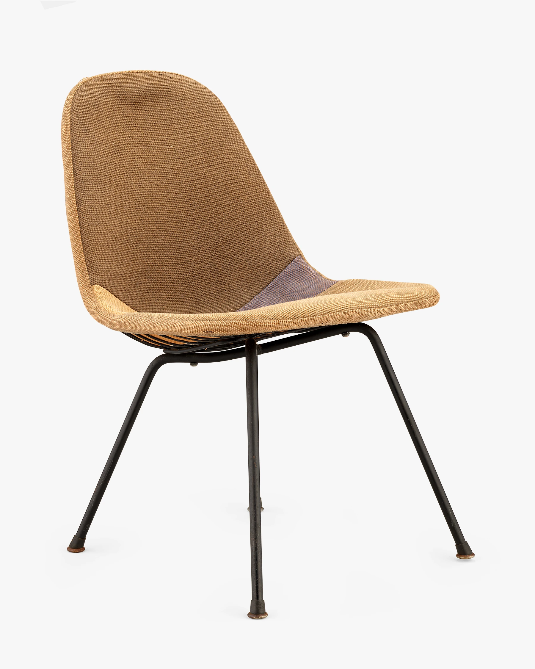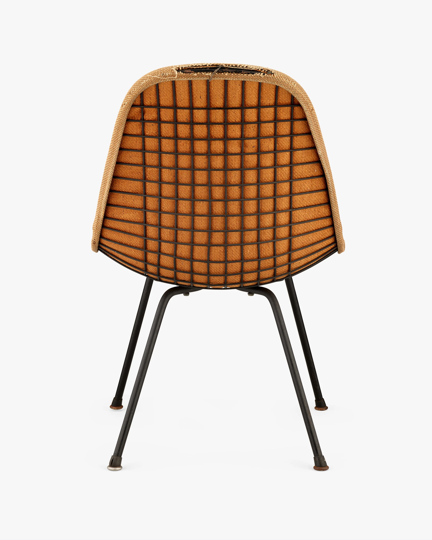 This Wire Chair on a four-legged, medium height base has a beautifully worn Harlequin pad designed by Ray Eames and Alexander Girard, Herman Miller’s director of textiles. The Harlequin upholstery came in four different color combinations, this one is made of sections of black, grey, beige, and blue. MKX-1 stands for Medium (height) K-(wire shell) X (four-legged base) 1 (1-piece upholstered pad) “D” (one of four types of Harlequin patterns).