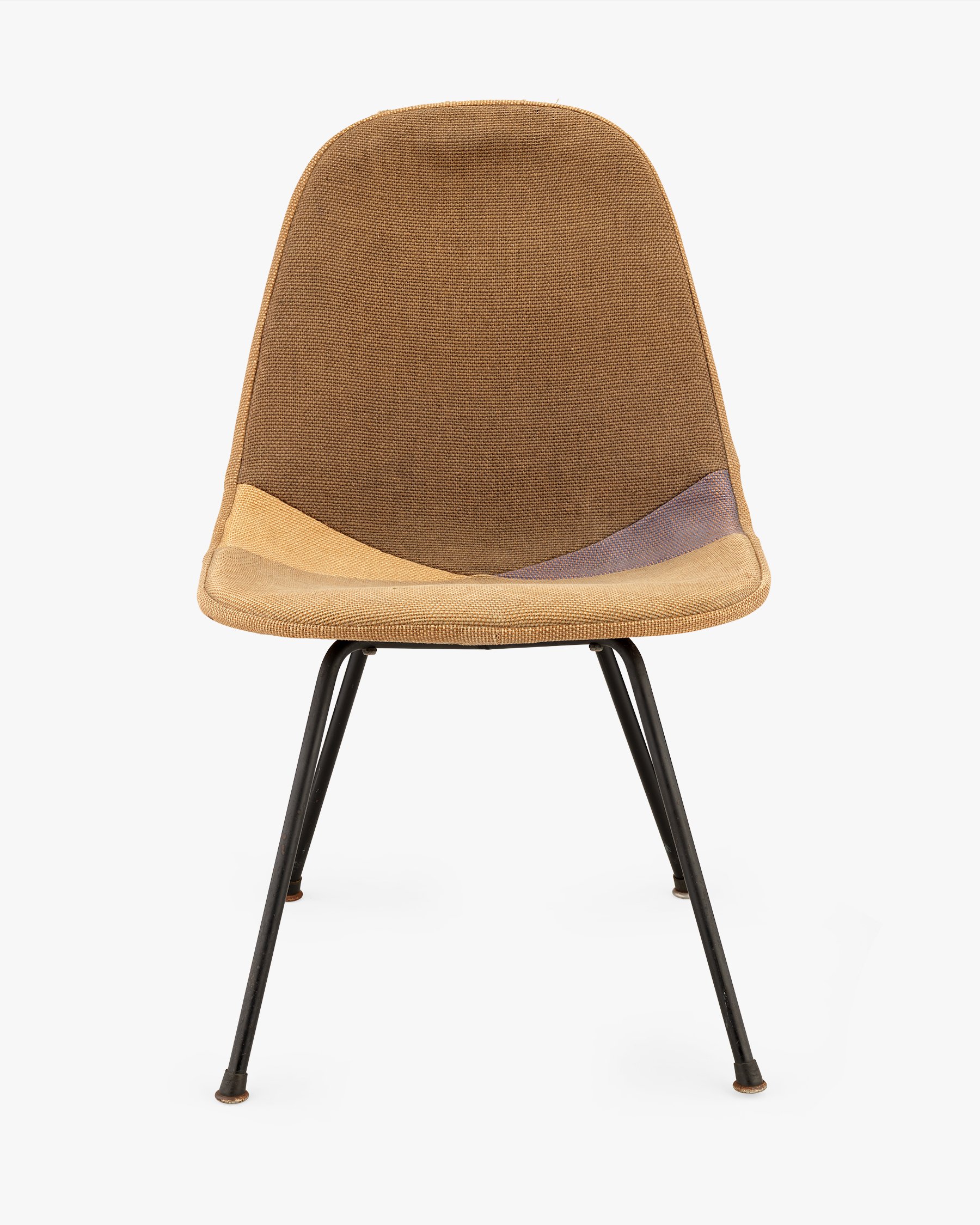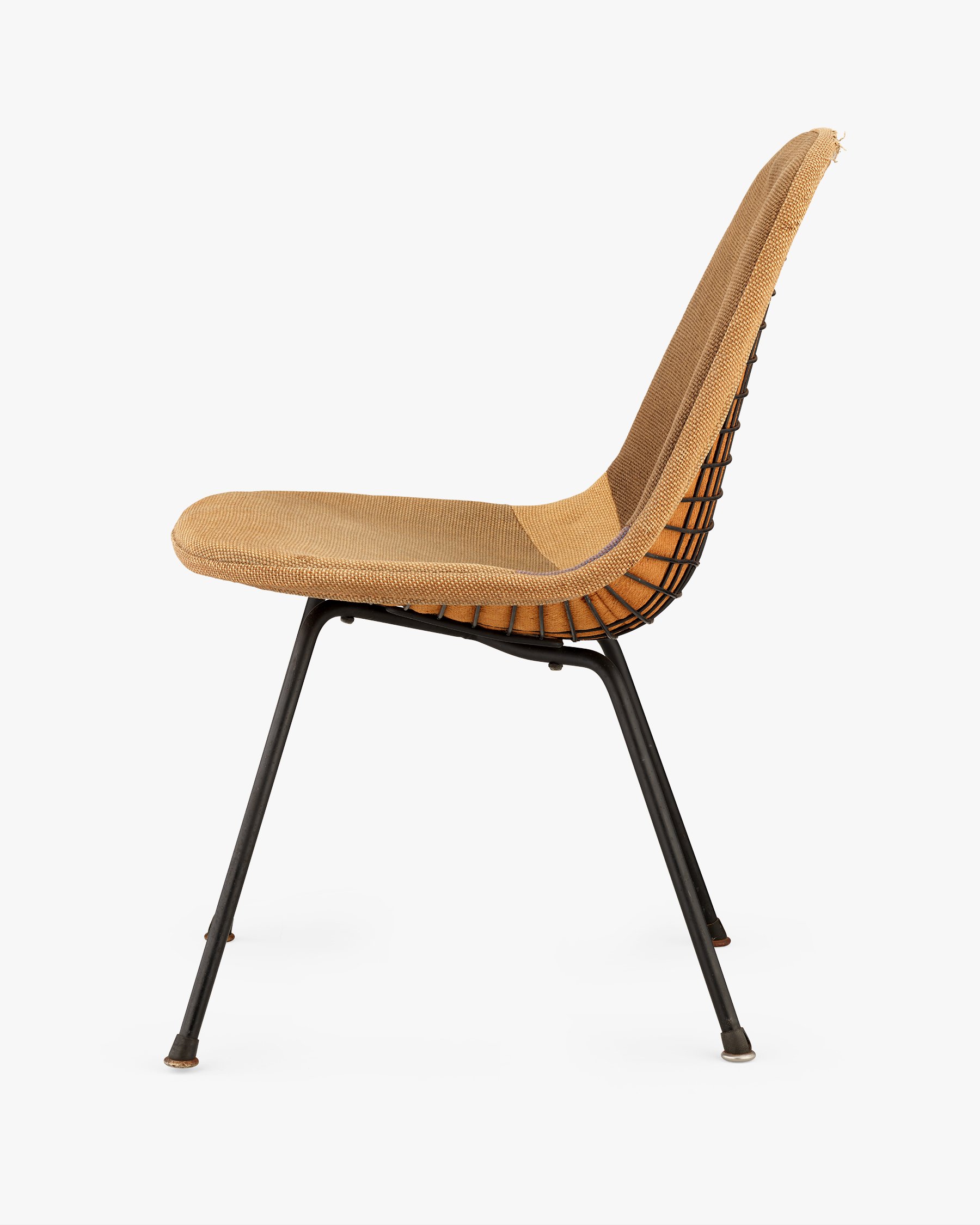 This Wire Chair on a four-legged, medium height base has a beautifully worn Harlequin pad designed by Ray Eames and Alexander Girard, Herman Miller’s director of textiles. The Harlequin upholstery came in four different color combinations, this one is made of sections of black, grey, beige, and blue. MKX-1 stands for Medium (height) K-(wire shell) X (four-legged base) 1 (1-piece upholstered pad) “D” (one of four types of Harlequin patterns).