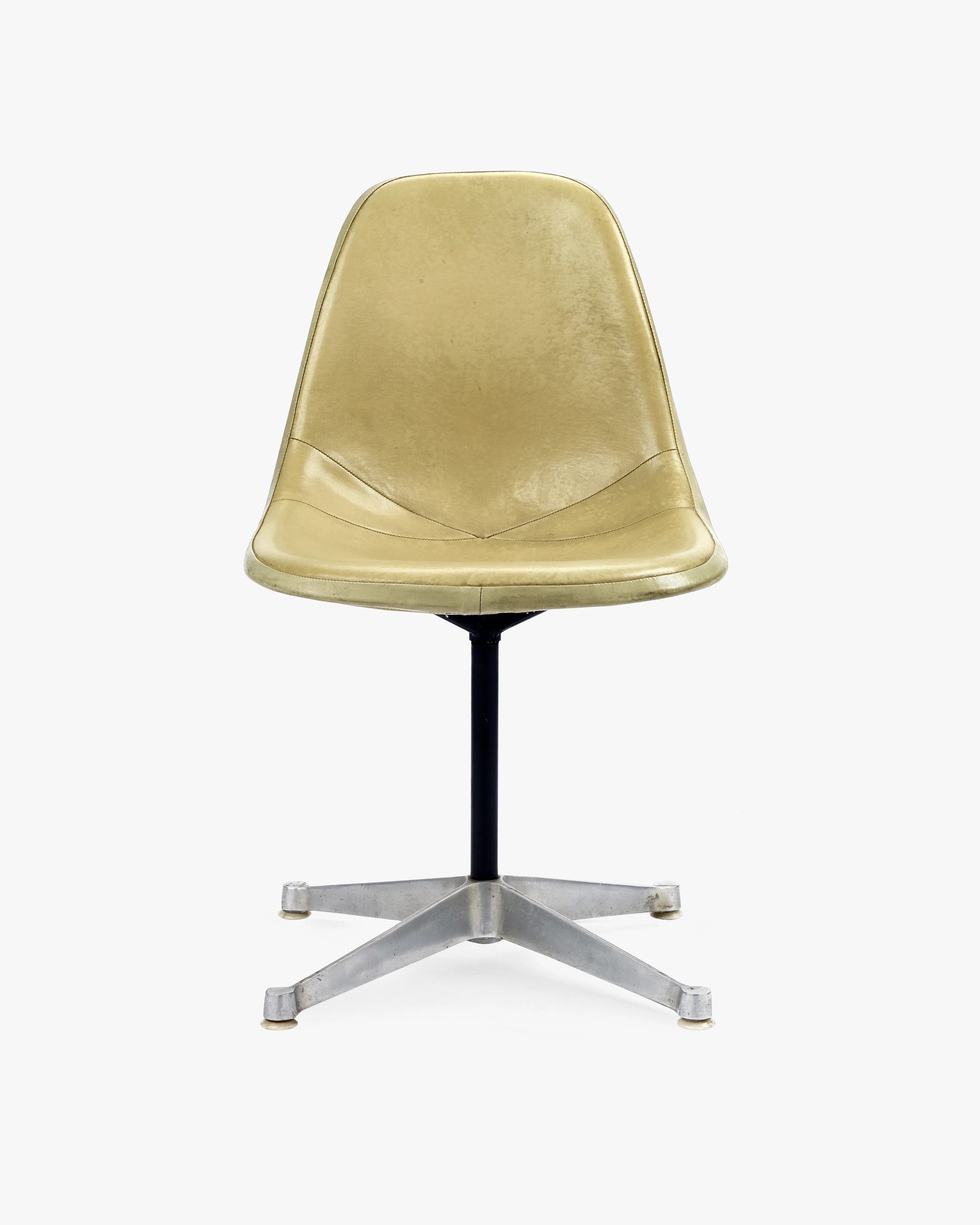 This example has the earliest type of Eames fiberglass chair upholstery—a method of wrapping the upholstery around the edges with a concealed wire that holds the upholstery in place. PSC-1 stands for Pivoting Side (chair) Cast aluminum (base) 1 (upholstered).
