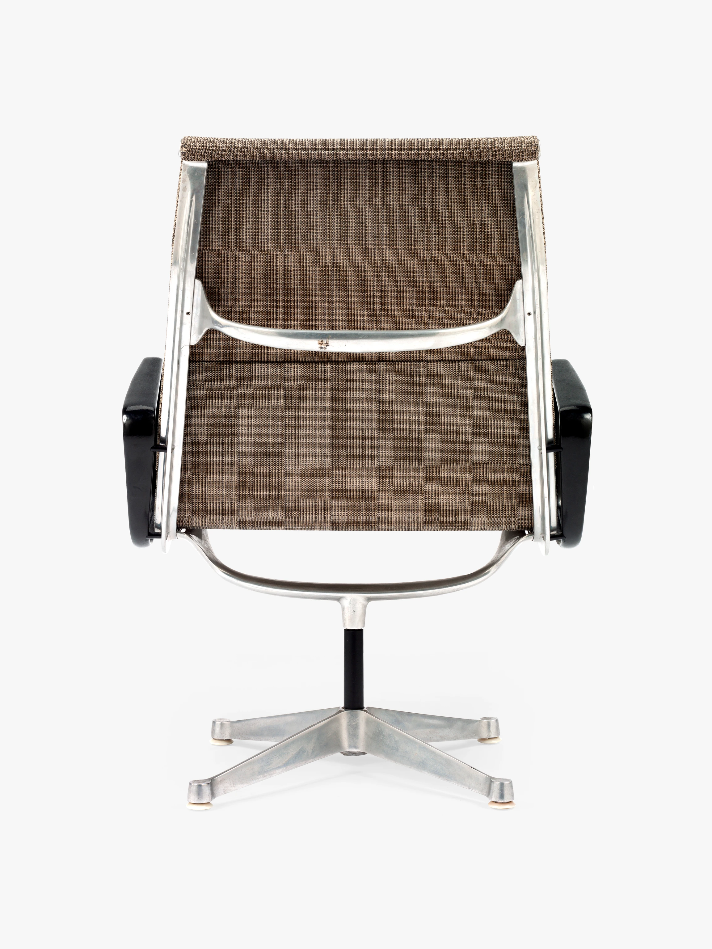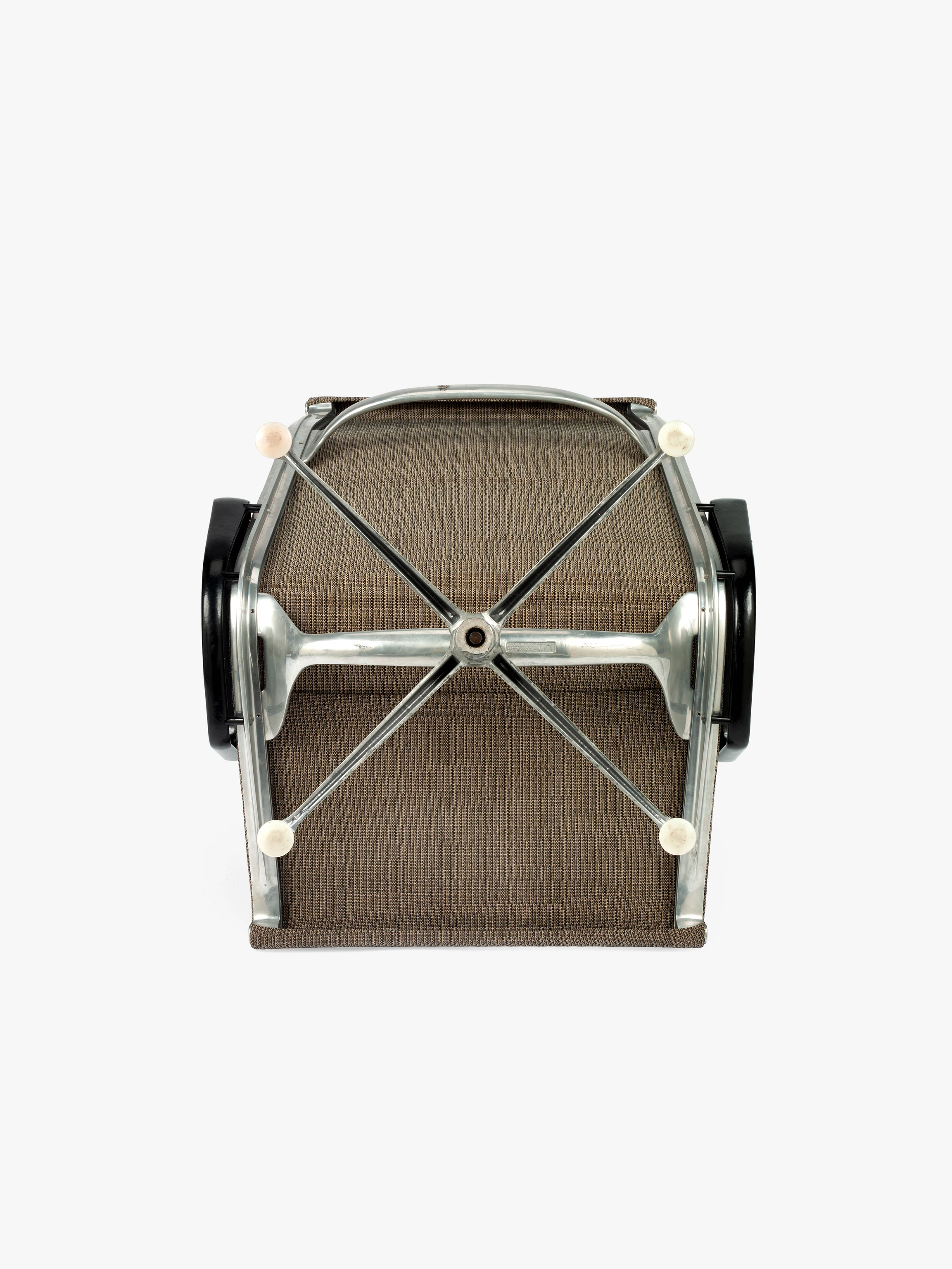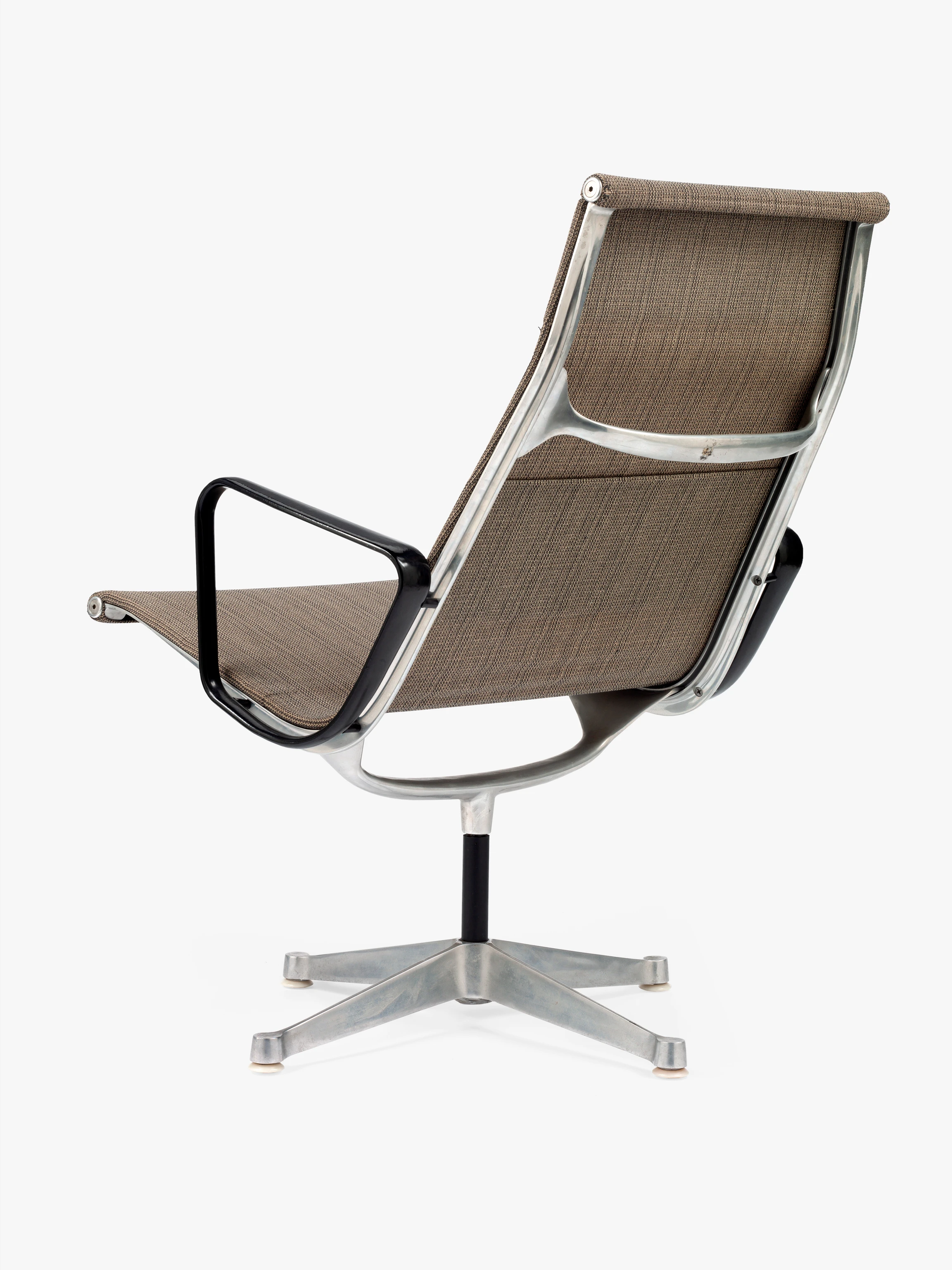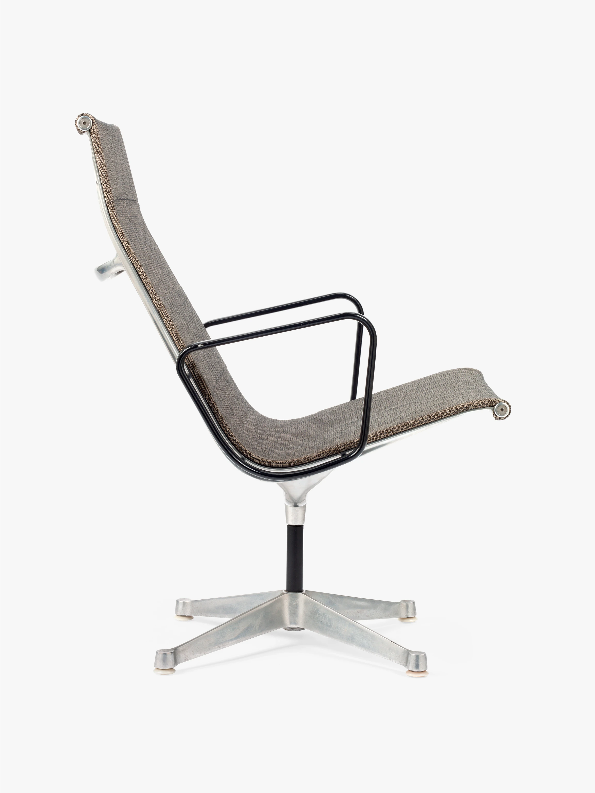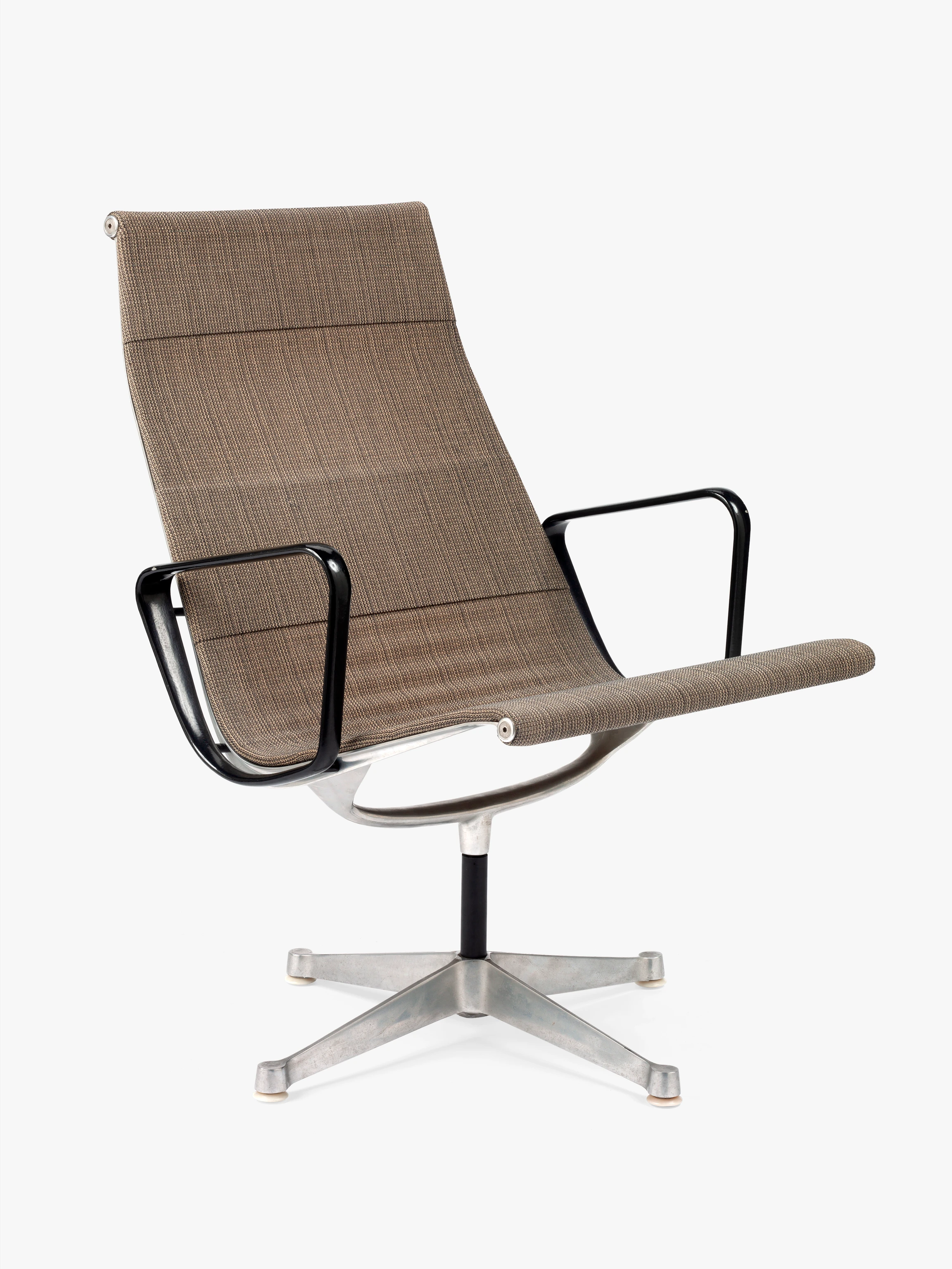 The semi-sheer Saran textile used in this example of the Eames Aluminum Group lounge chair was a short-lived upholstery option for the model. The Saran options for the chairs initially included beige, blue, and gray colorways. Ray and Charles chose Saran because it had proven itself to be durable, stain-resistant, and easy to clean when used as automobile upholstery. It seems that despite initial assumptions, in the end Saran was not able to sustain the kind of tension applied by the design of the Eames Aluminum Group. Notably, the Eameses had worked with Saran just a few years prior to developing the Eames Aluminum Group, when they used it as a covering for the Quadraflex loudspeakers they designed for audio equipment company Stephens Trusonic Inc. in 1956.