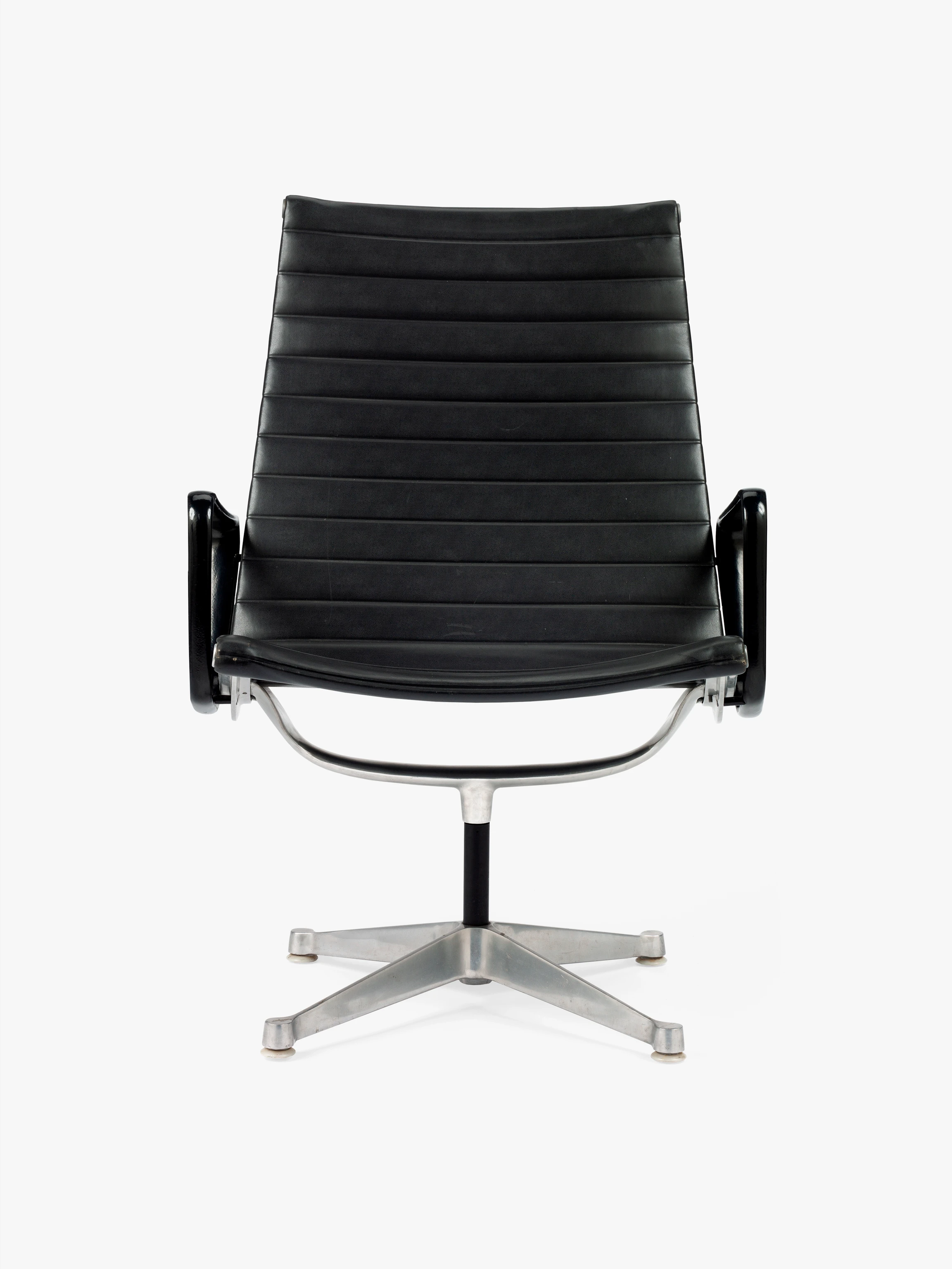 Eames Aluminum Group model 682, the lounge chair with arms, can be thought of as a snapshot that at once captures the collection’s early identity as outdoor lounge furniture and presages its later transformation into a workplace classic. The silhouette of the lounge chair situates the sitter at an angle somewhere between fully upright and reclined. While this angle could facilitate poolside reading, it also conjures an executive leaning back in a chair while taking meetings with clients. Additionally, one can imagine the chair’s armrests helping a sitter to prop up a magazine, or supporting a typist’s elbows. In either case, the lightweight nature of the design would have been a desirable attribute, as would its durable and easy-to-clean fabric. And though the Eameses may not have had both of these settings—home and office— in mind from the project’s beginnings, both had clearly been identified by the time manufacturer Herman Miller was marketing the designs. This is indicated by the claim in the collection’s 1959 brochure that, “These lightweight chairs are versatile and rugged enough to serve handsomely indoors or outdoors, in the home, in the office, lobby, or reception area.”