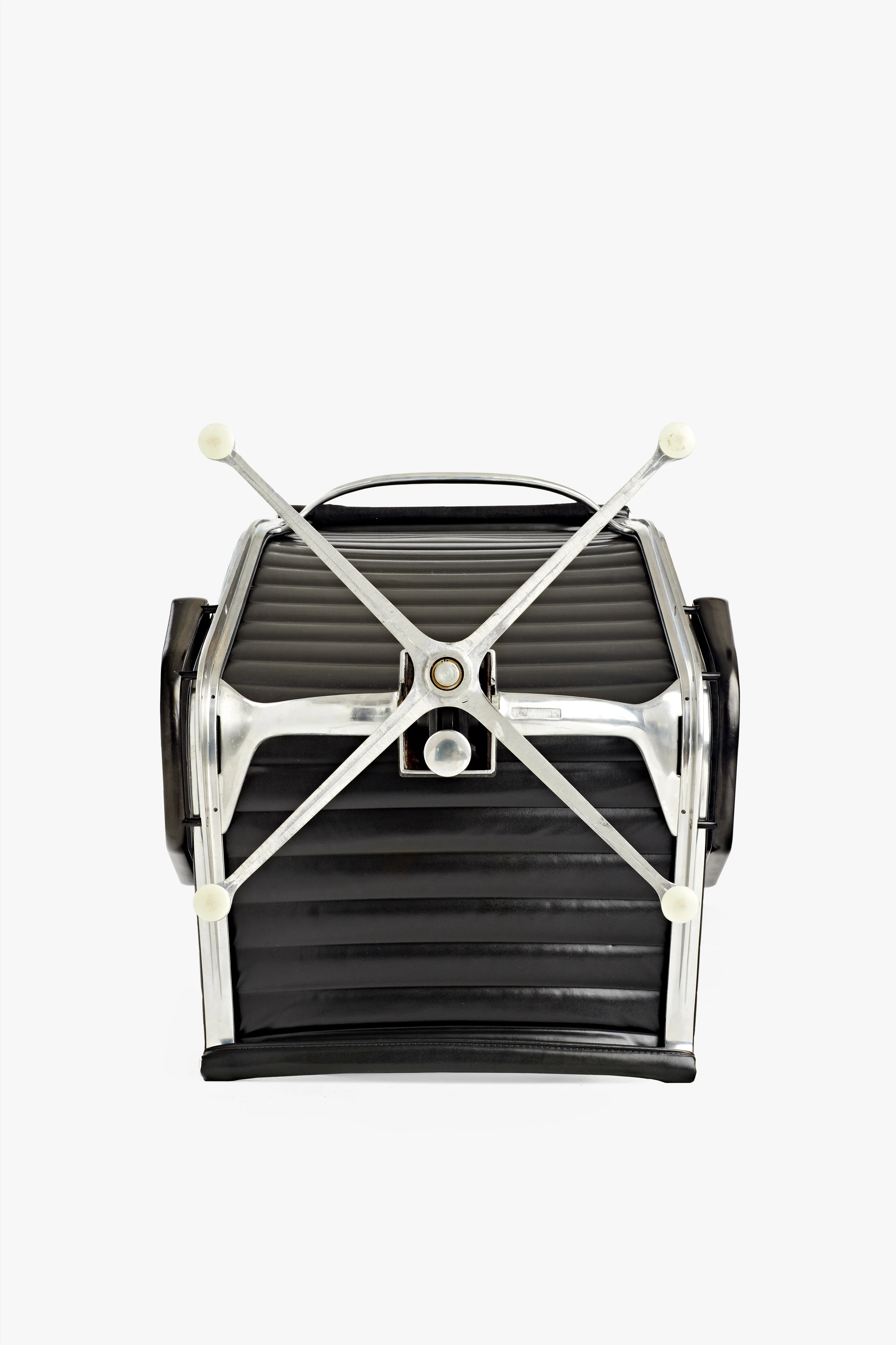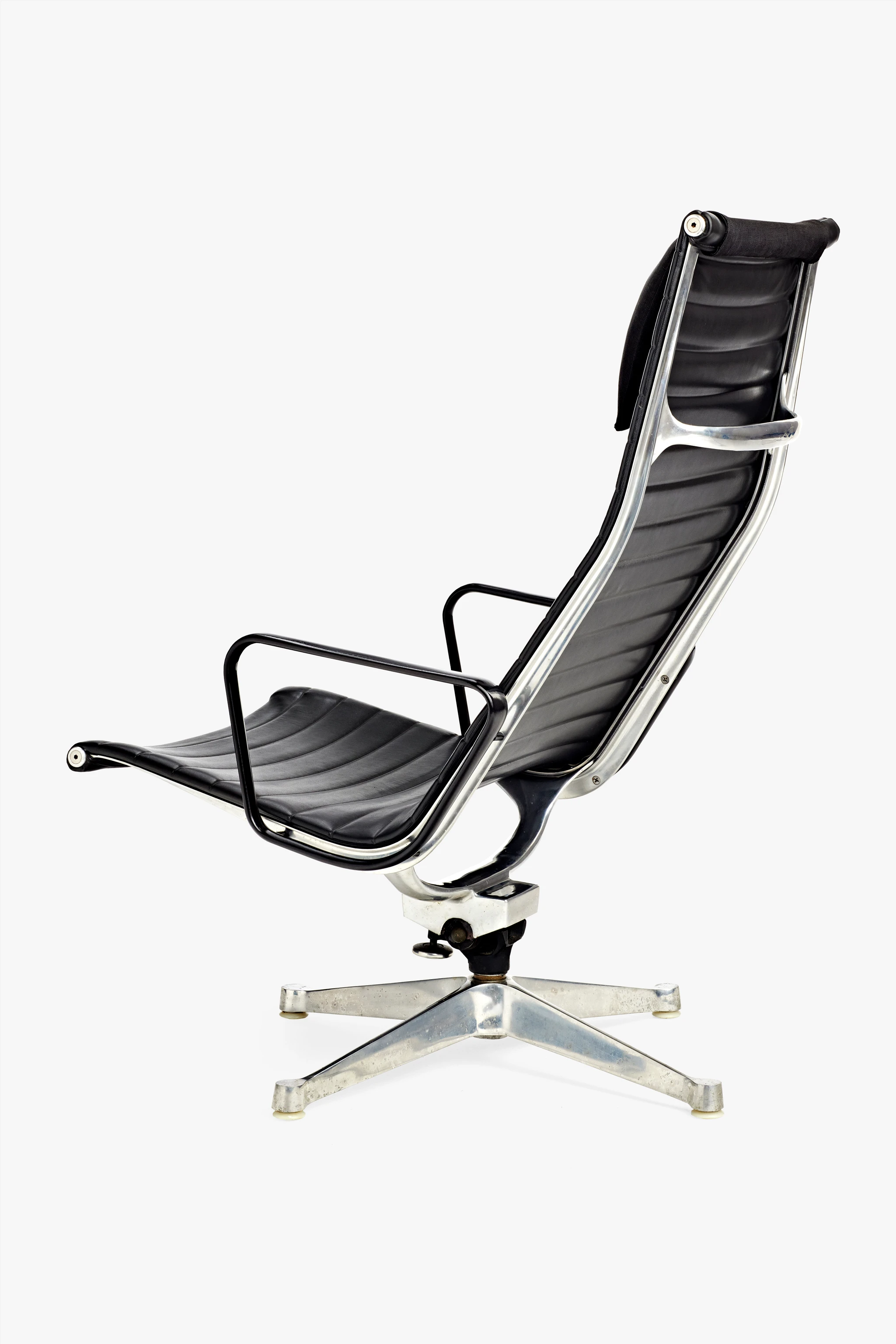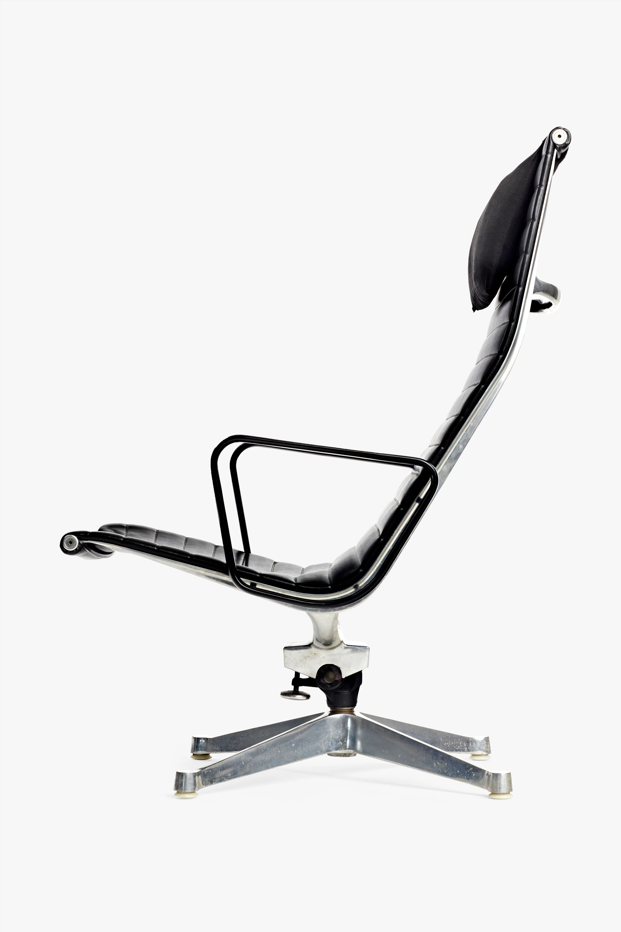 This is one of many examples of the Eames Aluminum Group lounge chairs made in black Naugahyde, the textile most readily associated with the collection today. “Naugahyde” is the brand name for a synthetic textile developed in 1920 by chemist Byron A. Hunter of the United States Rubber Company from a combination of leather fibers and rubber. Its name, trademarked nearly two decades later in 1936, refers to the town of Naugatuck, Connecticut, in which it was first manufactured. The name also alludes to the hide of animals used to produce natural leather, which Naugahyde imitates in appearance and texture. Naugahyde exemplifies the increasing value placed on ease of cleaning—and ease of homemaking more generally that characterizes the work of Ray and Charles Eames. The Eameses had been specifying Naugahyde on furniture since 1952. In their 1954 movie about the Eames Compact Sofa, they presented a vivid demonstration of its value, with a scene in which a child drops her ice cream cone on the sofa, and because it is Naugahyde, no damage is done.