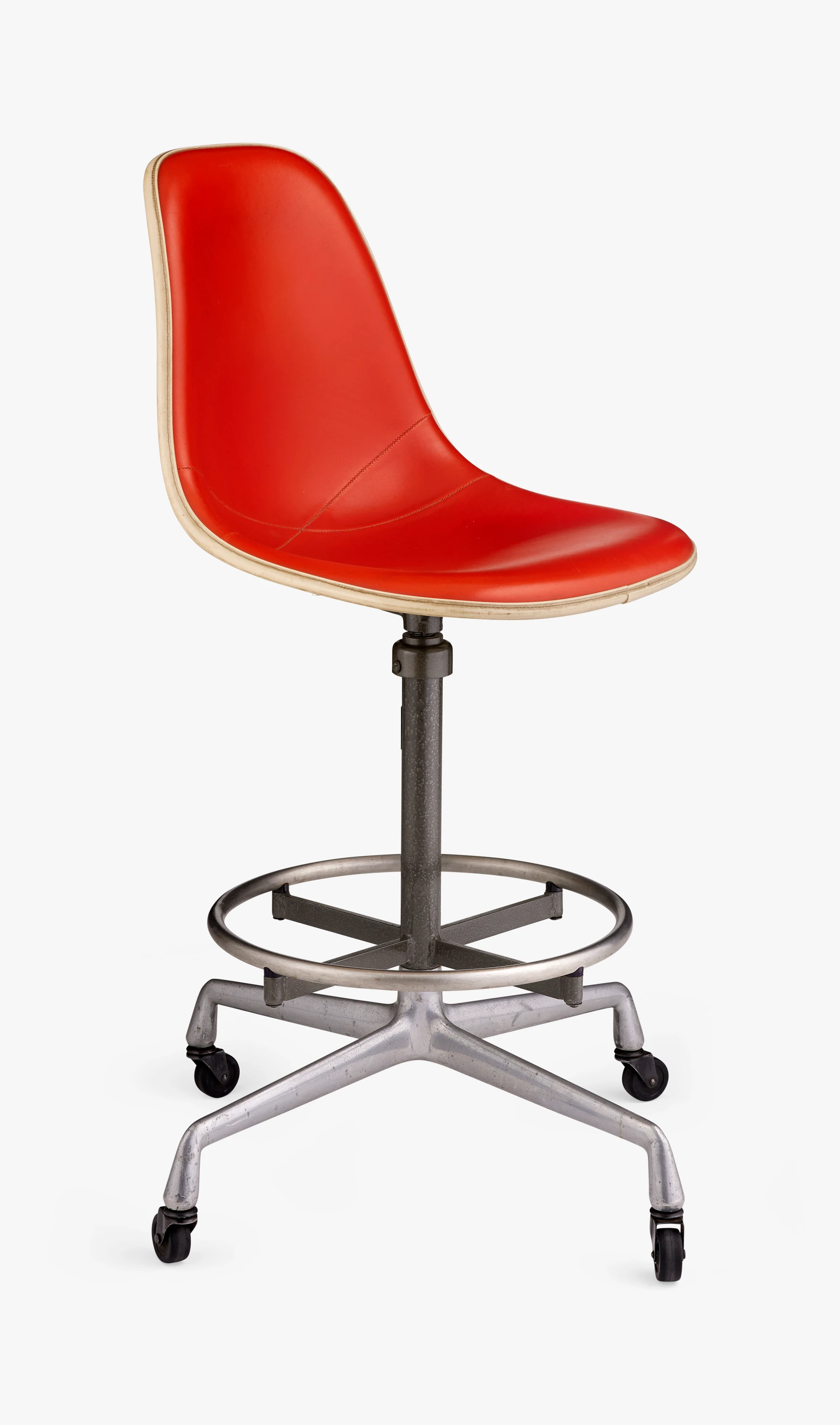 Just as molded plywood had been adapted from other applications for use in furniture, the Eameses saw metal stamping (think car parts) as “the technique synonymous with mass production in this country” and believed it to be an operable solution for inexpensive furniture production. When securing the use of hydraulic presses at UCLA proved troublesome, the Eames Office set about producing the steel and aluminum prototypes in their Venice, California, shop using a drop hammer. However, the technique was anything but elegant (it consisted of dropping a 250-pound weight onto an aluminum or steel sheet sandwiched between two plaster molds) or effective (the molds usually broke after about three uses and it took around four drops to successfully mold each shape). The completed stamped metal parts were welded together to form a seat and then coated with either vinyl or neoprene to offer a more agreeable finish quality. Adapting another of the technologies developed for their plywood chairs, shock mounts (rubberized discs with an embedded screw thread) were affixed to the shells to enable a flexible and secure connection to the desired base.