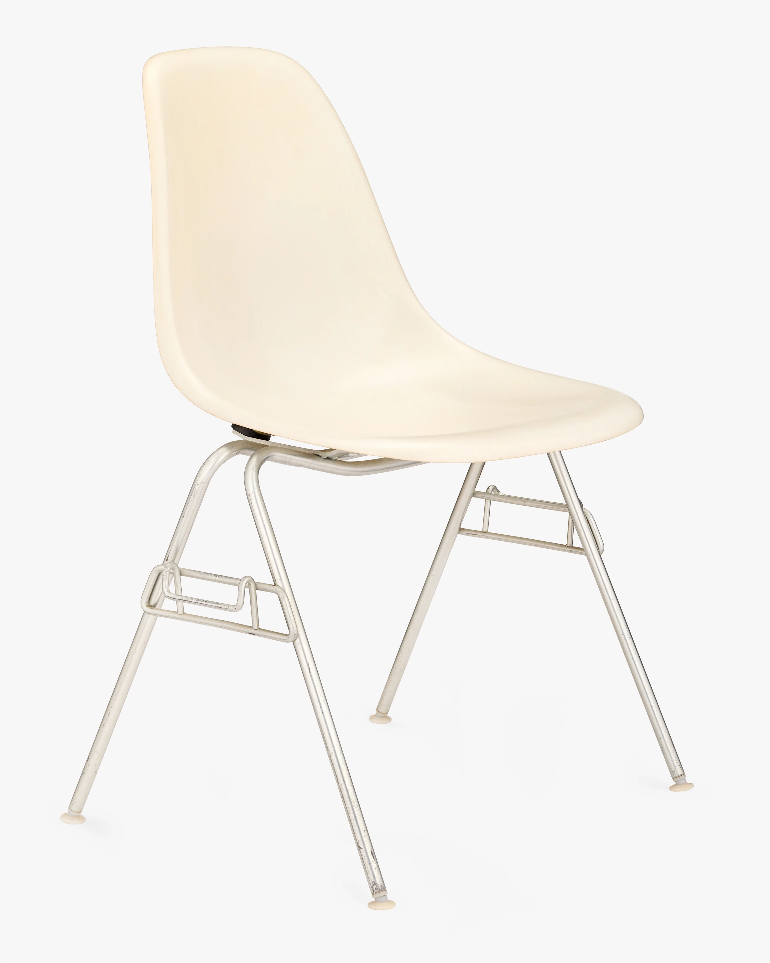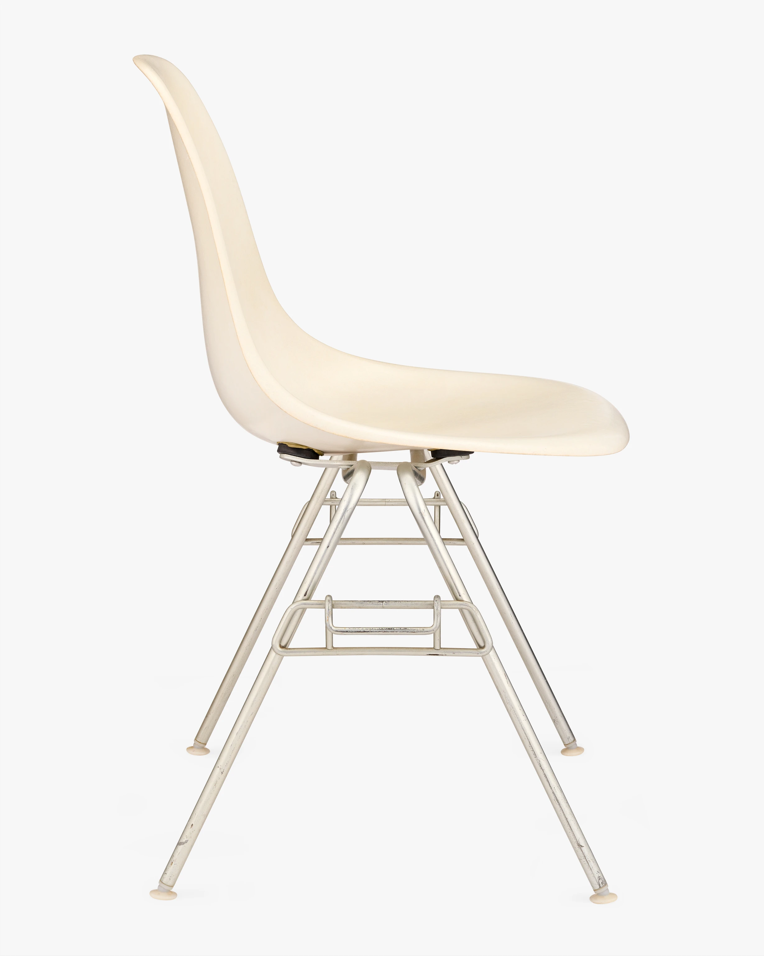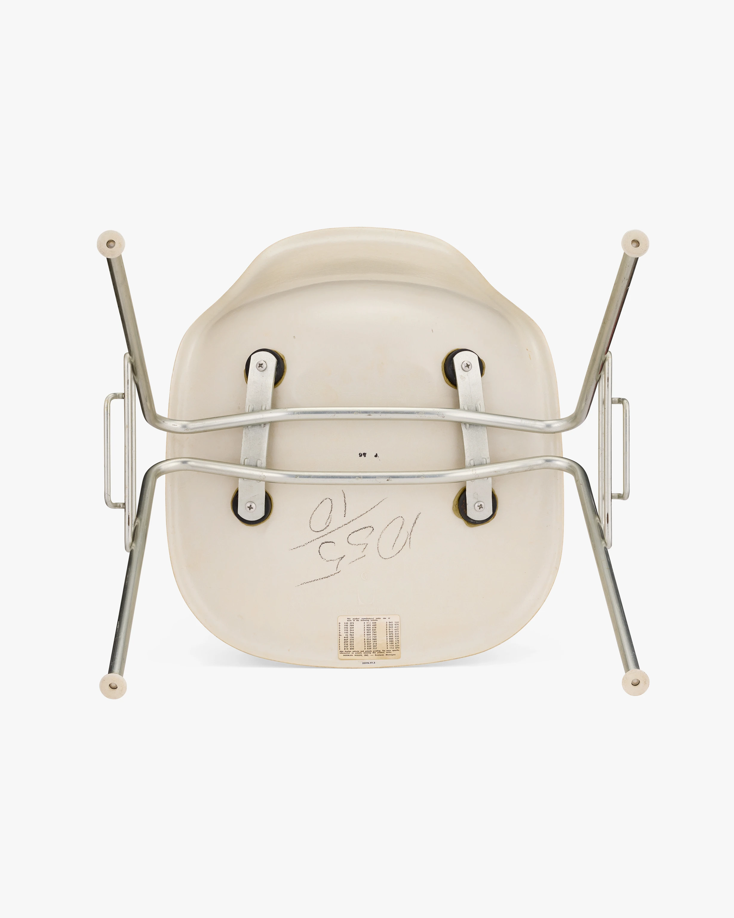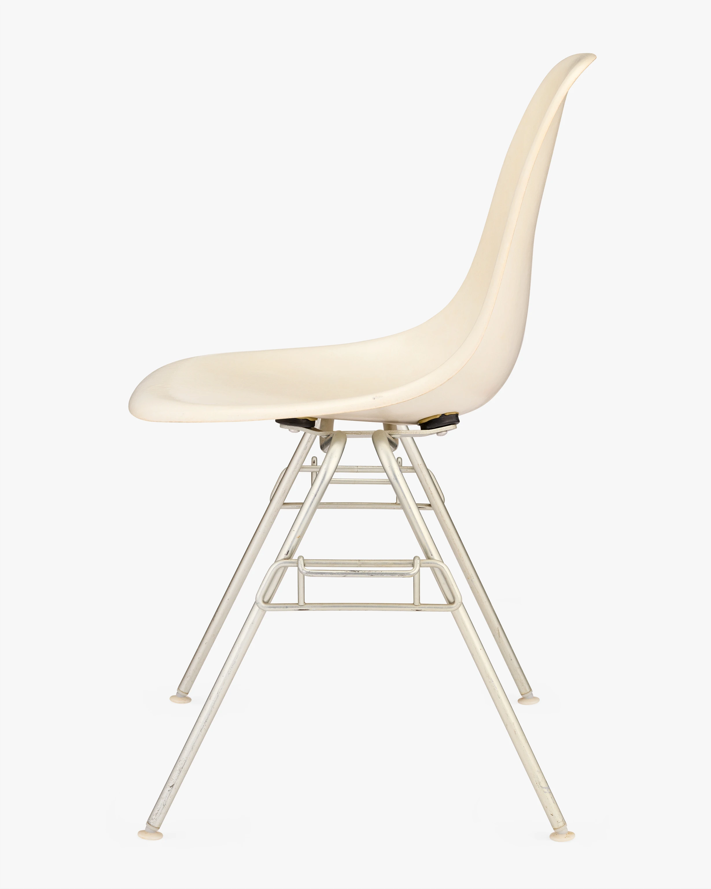 The DSS model was a game changer for Ray and Charles. Herman Miller sold these chairs to schools and auditoriums in the tens of thousands. The innovative base allowed fourteen chairs to stack in the floor space of one, and the ganging feature helped create long, tidy rows of chairs. This base was developed just as the Eameses perfected the thickness and strength of the Side Shell. DSS stands for Dining (height) Side (chair) Stacking (base).