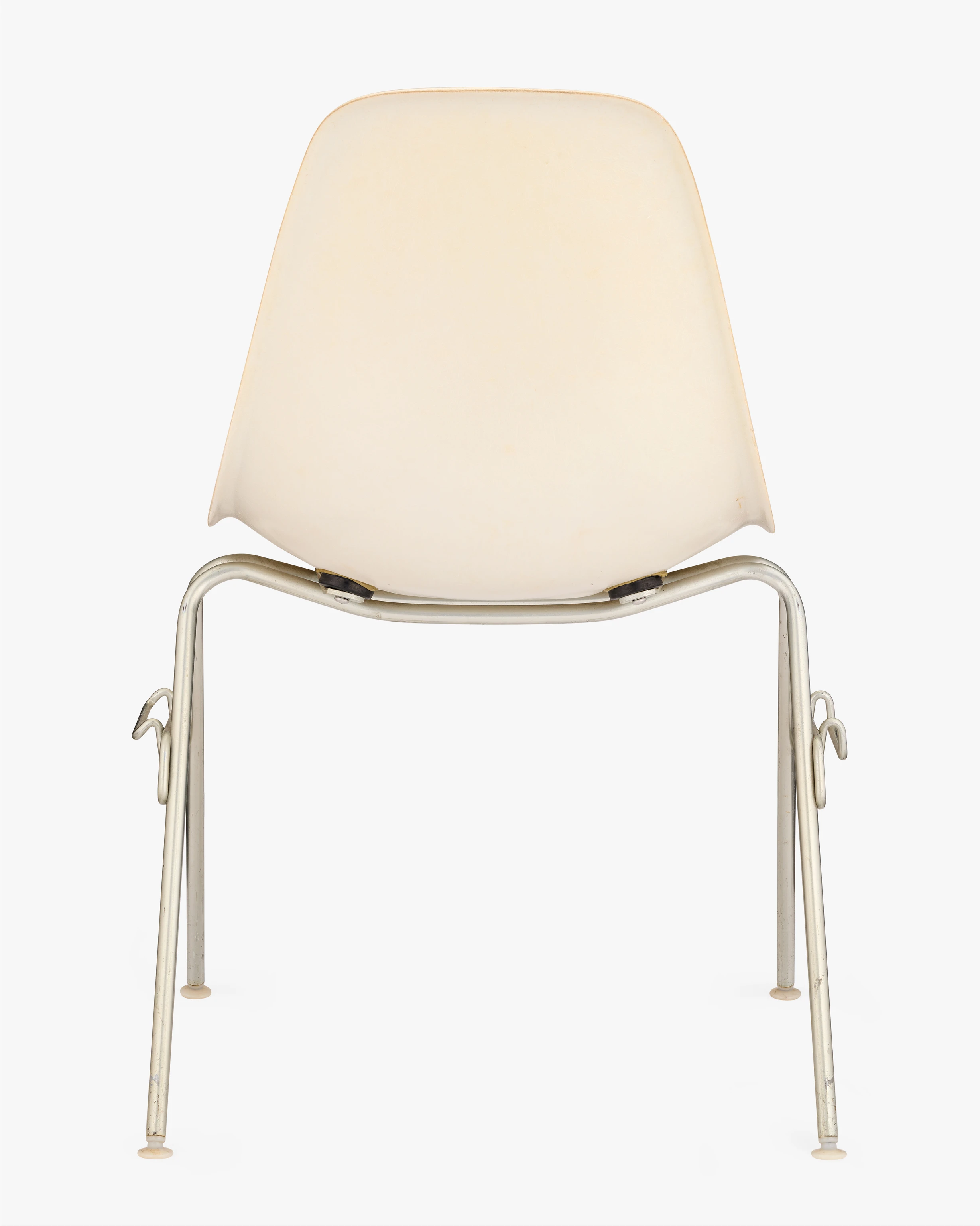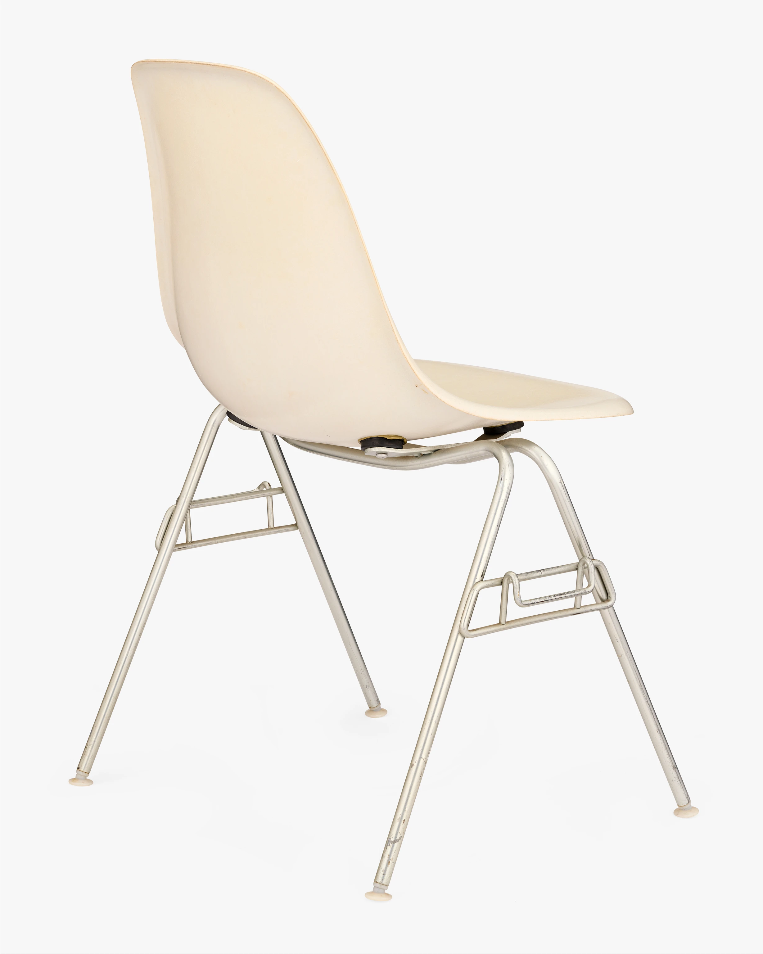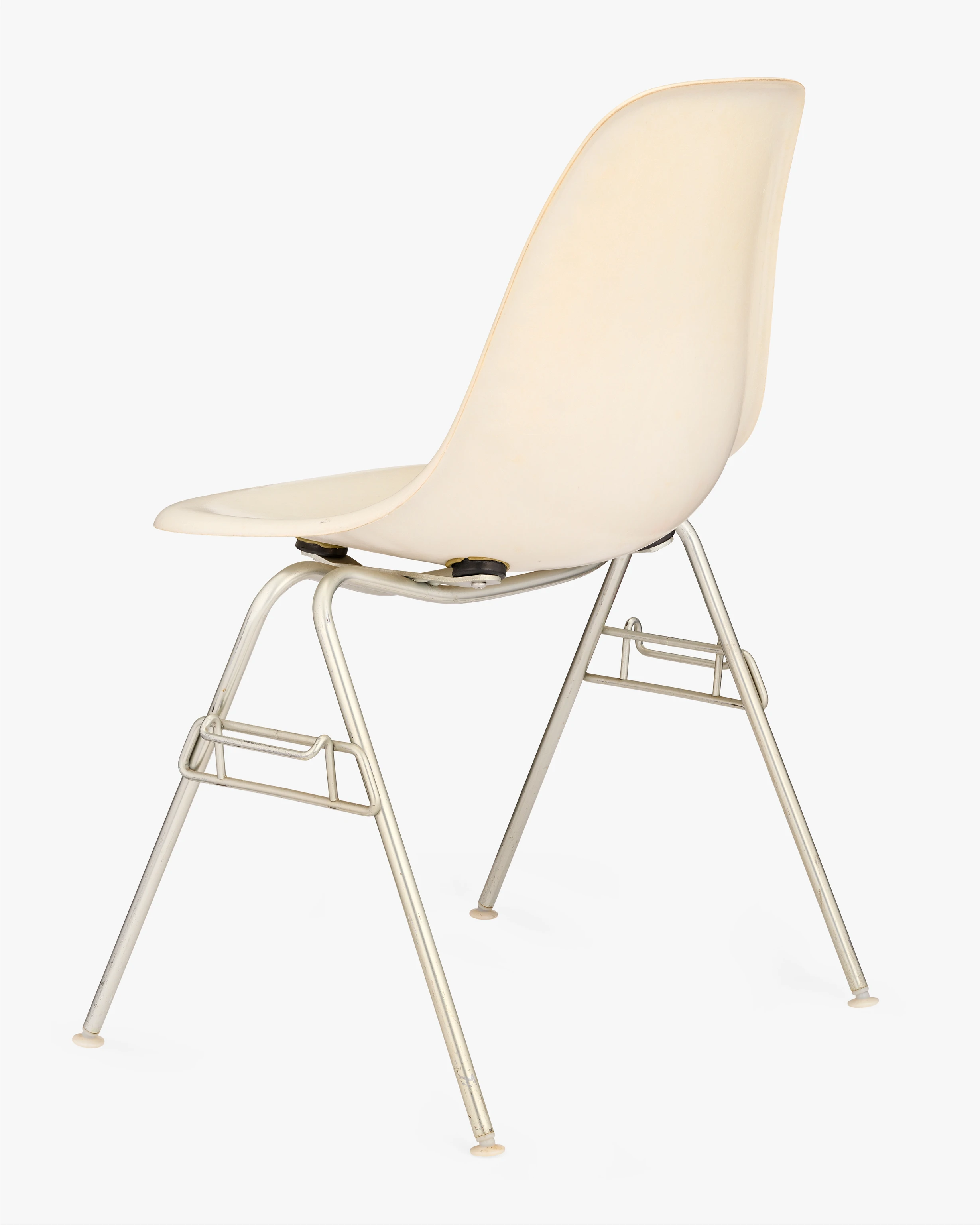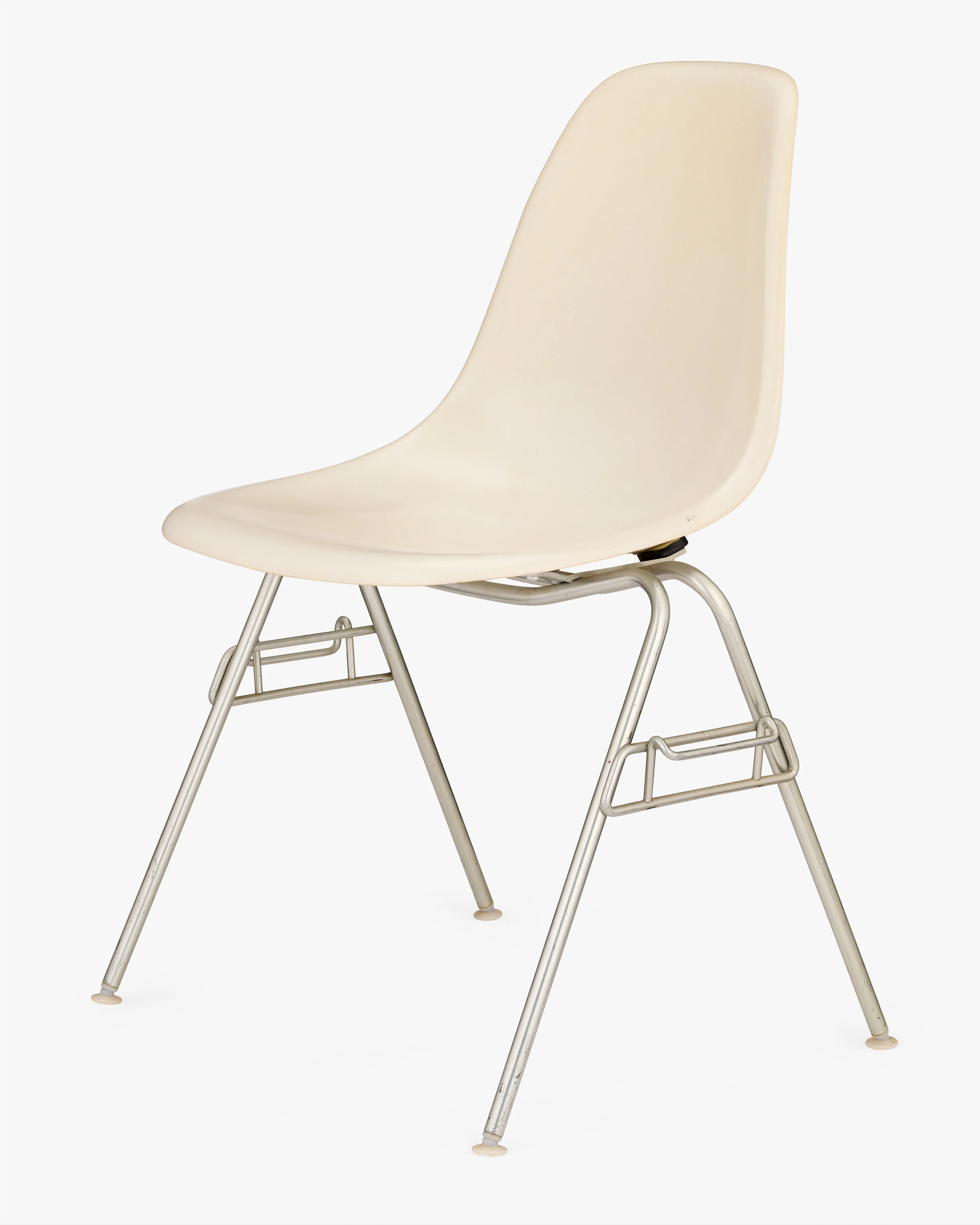 The DSS model was a game changer for Ray and Charles. Herman Miller sold these chairs to schools and auditoriums in the tens of thousands. The innovative base allowed fourteen chairs to stack in the floor space of one, and the ganging feature helped create long, tidy rows of chairs. This base was developed just as the Eameses perfected the thickness and strength of the Side Shell. DSS stands for Dining (height) Side (chair) Stacking (base).
