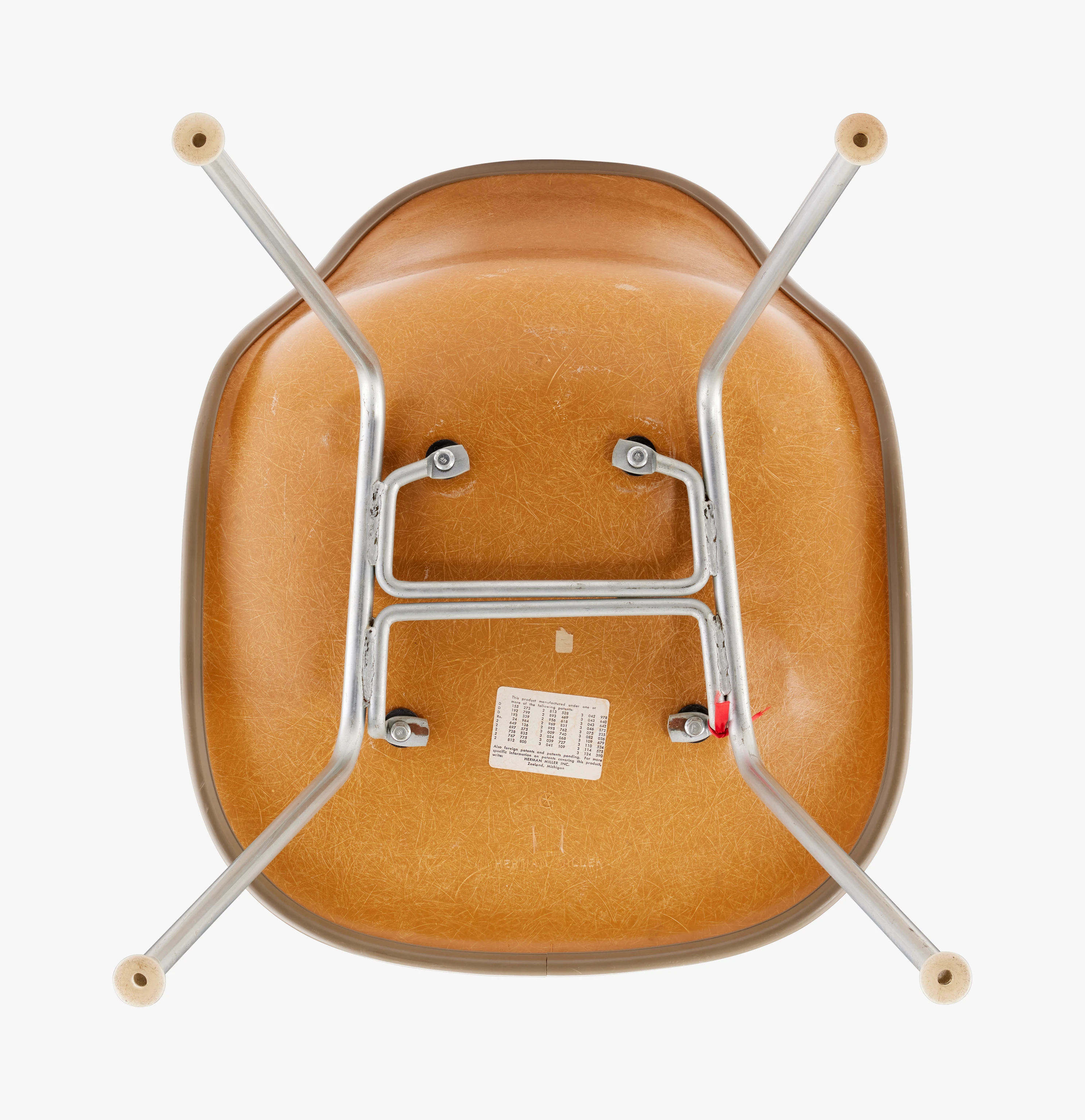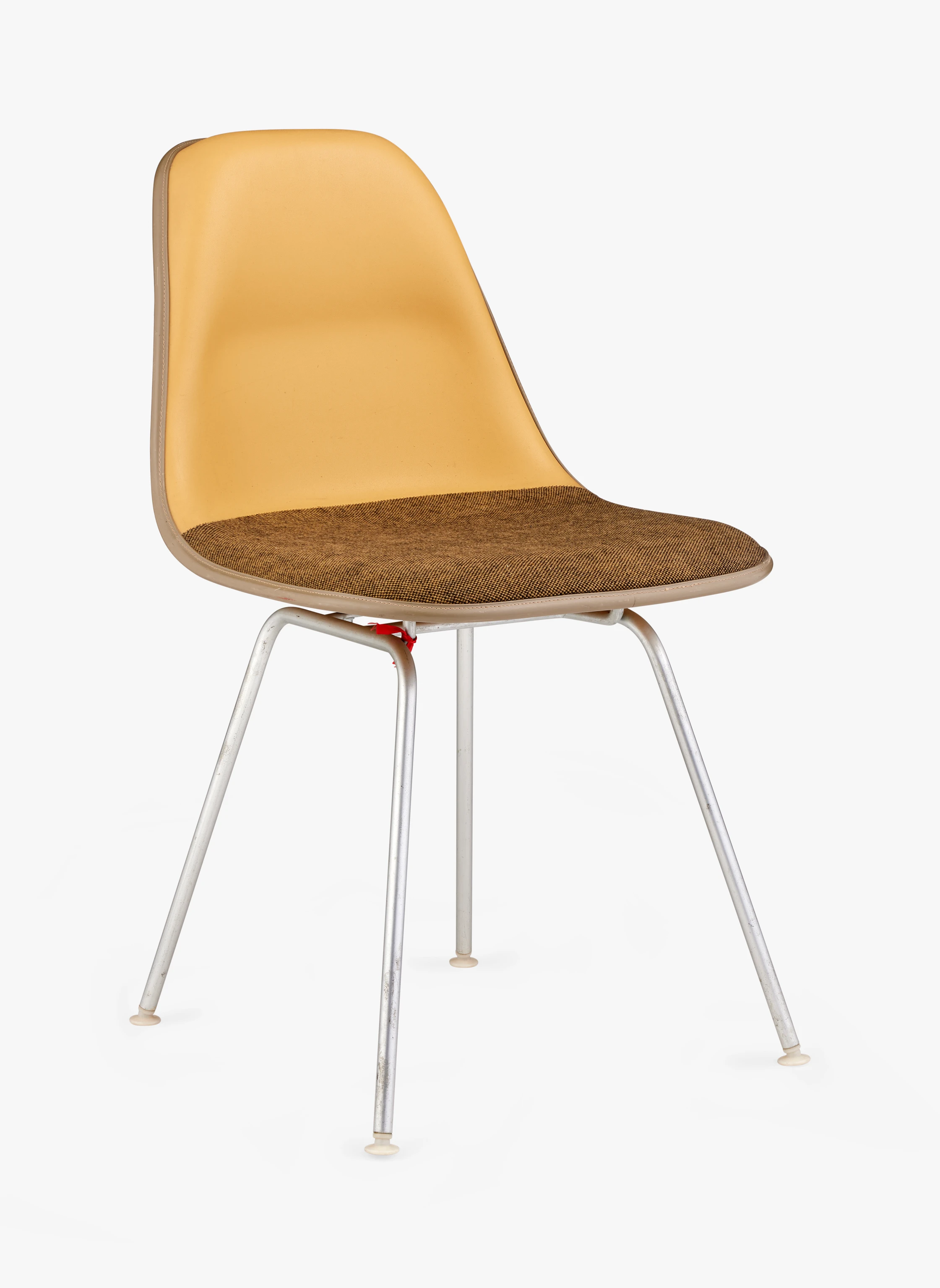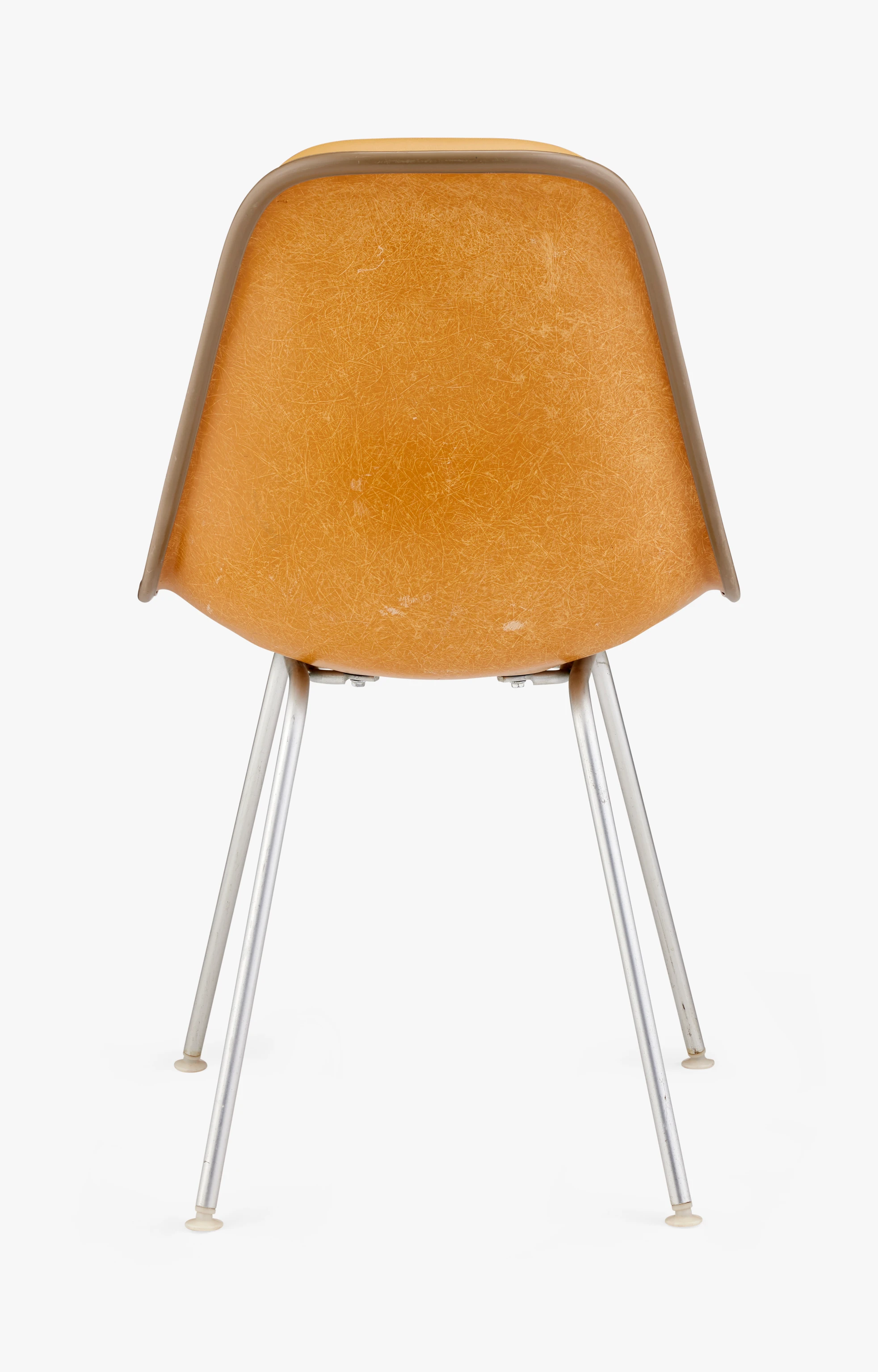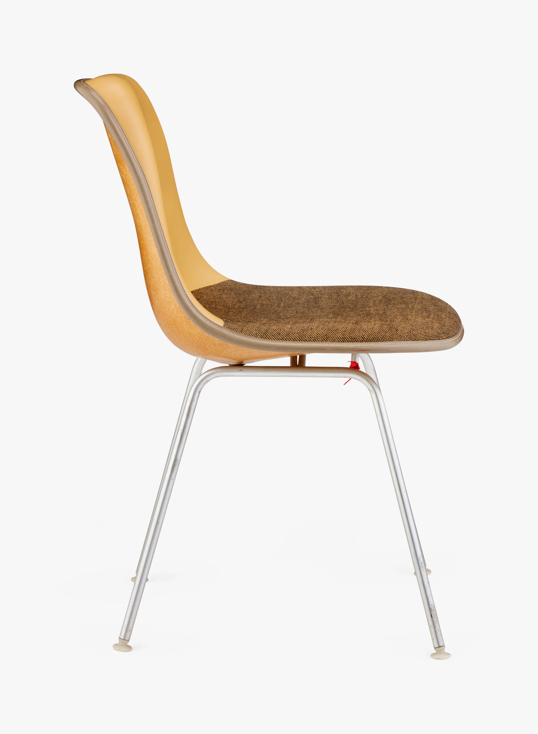 The “Dash Ninety-Nine” was a 1966 update to the upholstered fiberglass armchair which combined a textile seat with a Naugahyde back. This variation of the secretarial chair, building on the same material vocabulary of the Dash Ninety-Nine, was offered in the 1970s and added to the customization options for Herman Miller’s corporate clients. Here, a rich buttery Naugahyde is paired with a textured black-and-yellow woven Hopsak—both of which are complemented by the ochre tone of the chair’s exterior molded fiberglass shell. Both textiles were designed by Alexander Girard, the close friend of the Eameses who led Herman Miller’s textile division since its inception in 1952. While the secretarial shell was generally offered on either a Contract or Universal base (models PSCA-1 and EC431-01 respectively), this particular chair was custom ordered with a standard H-base. The fiberglass shell was made by Cincinnati Milling Machine Corporation, a company that began providing shells to Herman Miller in the mid-1950s.
