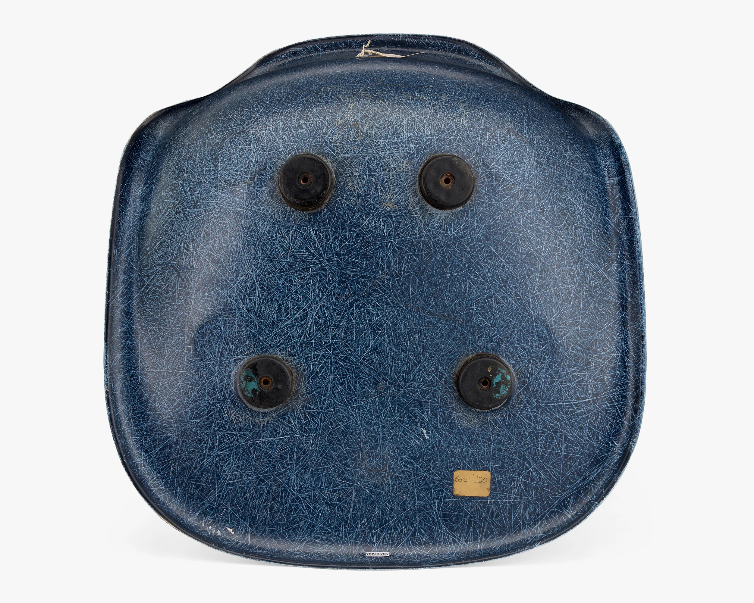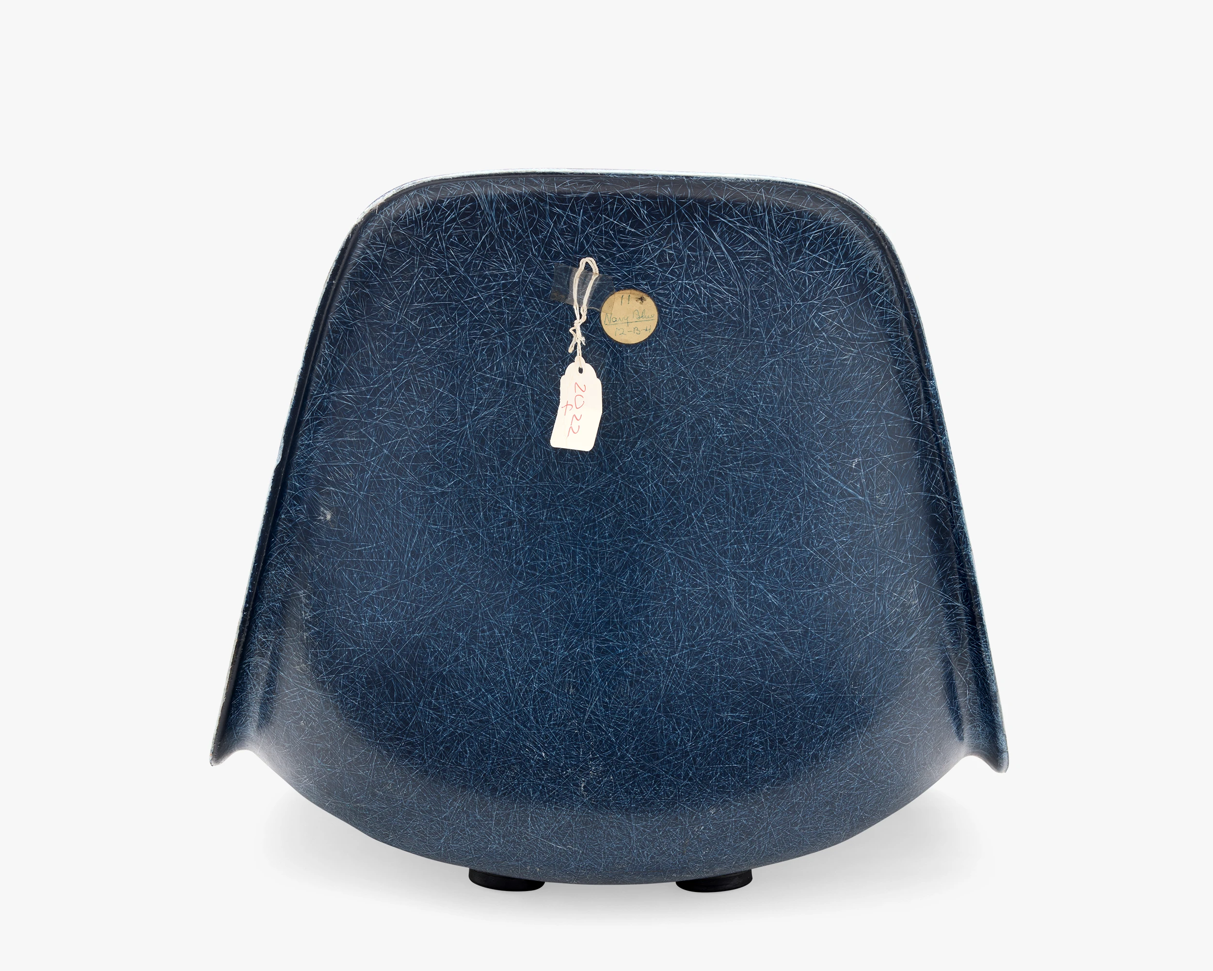 A backward “B”; an embossed Herman Miller logo; and “OCT 1959”, handwritten on a rectangular sticker, are on the underside of the shell. “11, Navy Blue, 12-13-4” is handwritten on a circular sticker on the reverse.