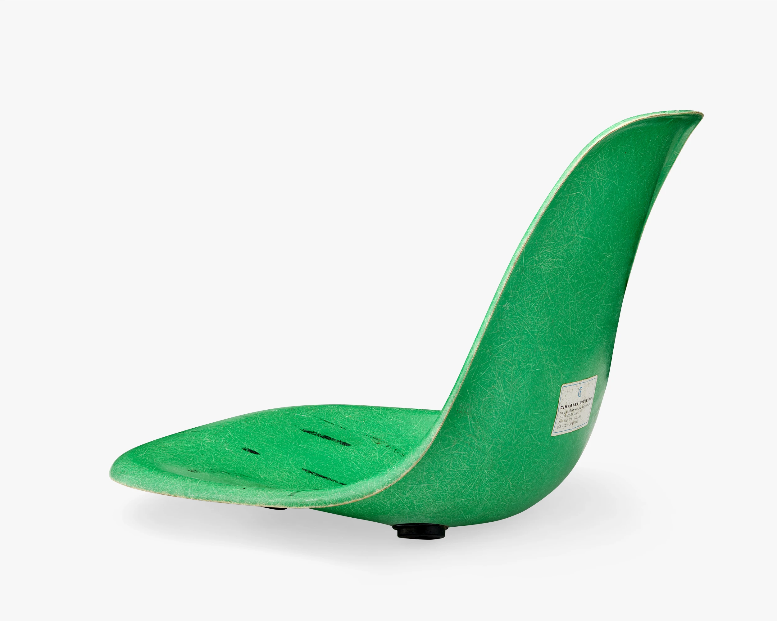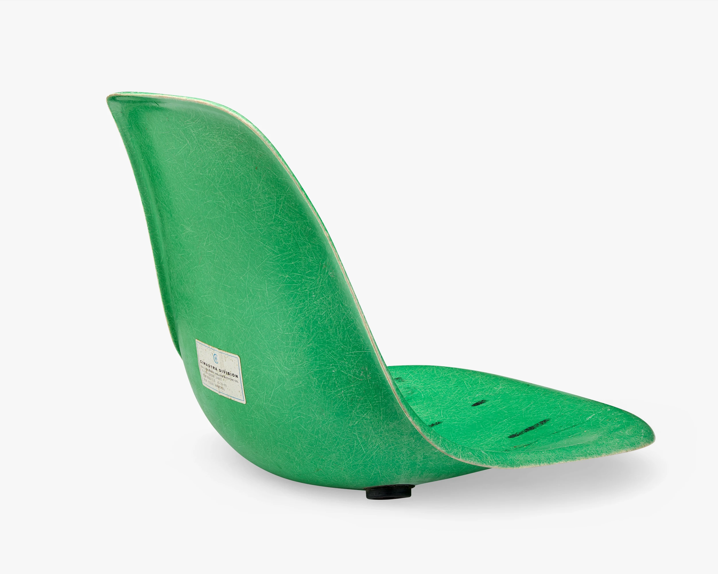 An embossed Cincinnati Milling Machine Company logo (“C” with a six-pointed star) and an embossed Herman Miller logo and word mark are on the underside of the shell. A white, rectangular Cimastra sticker with a blue border and “F-104 GREEN 24R97, TRB 818-114 4-10-68, FOR COLOR APPROVAL” is on the seat reverse.