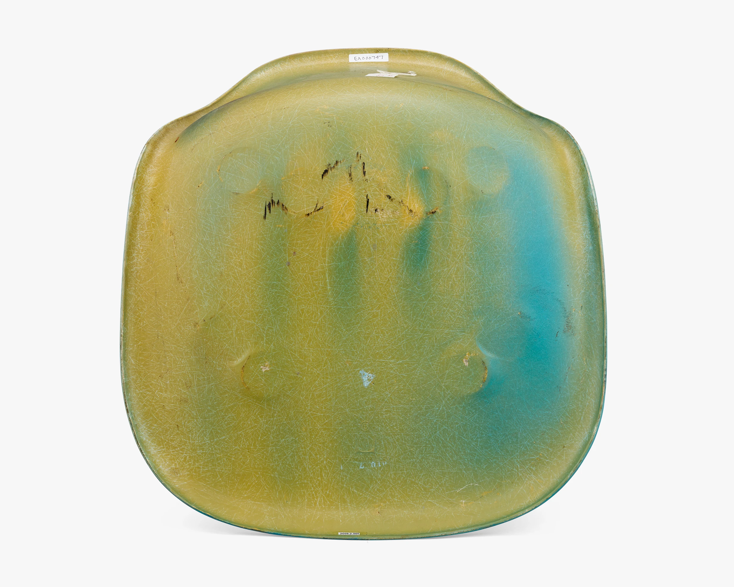 A backward “Z”, the Summit logo (backward “B”, “A”, “S” in a circle), and an embossed Herman Miller logo and word mark are on the underside of the shell. “[0]10 7” is stamped in white ink.