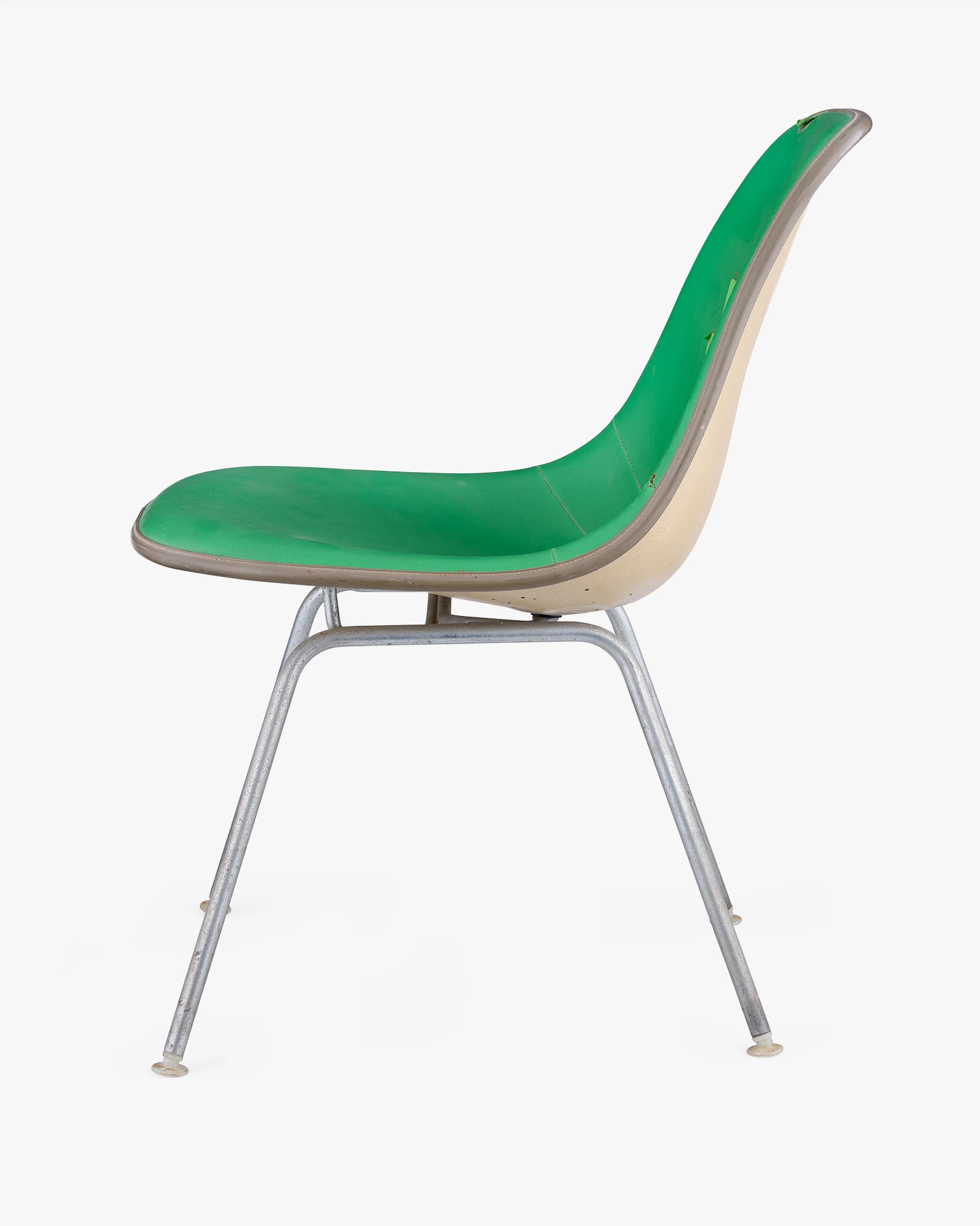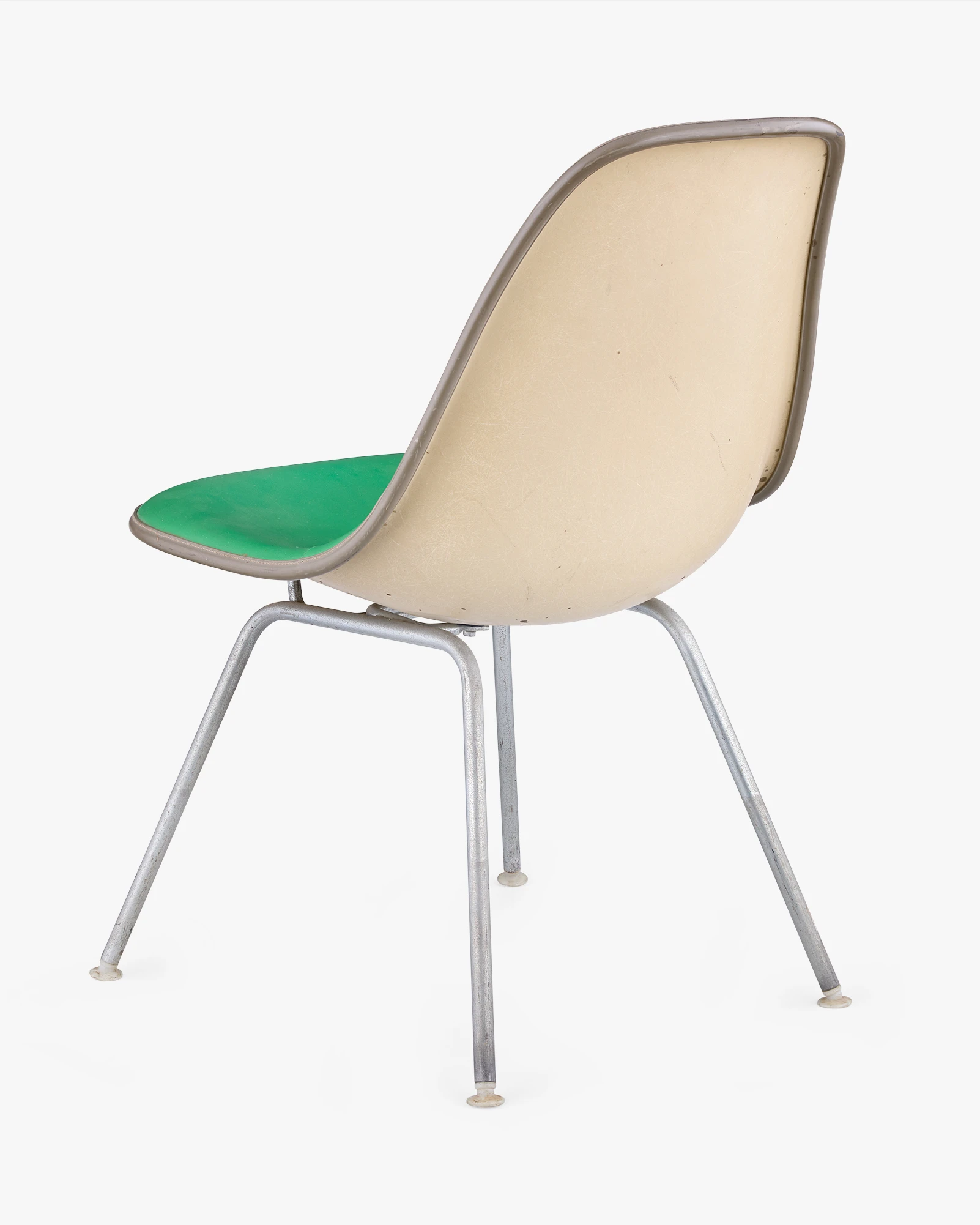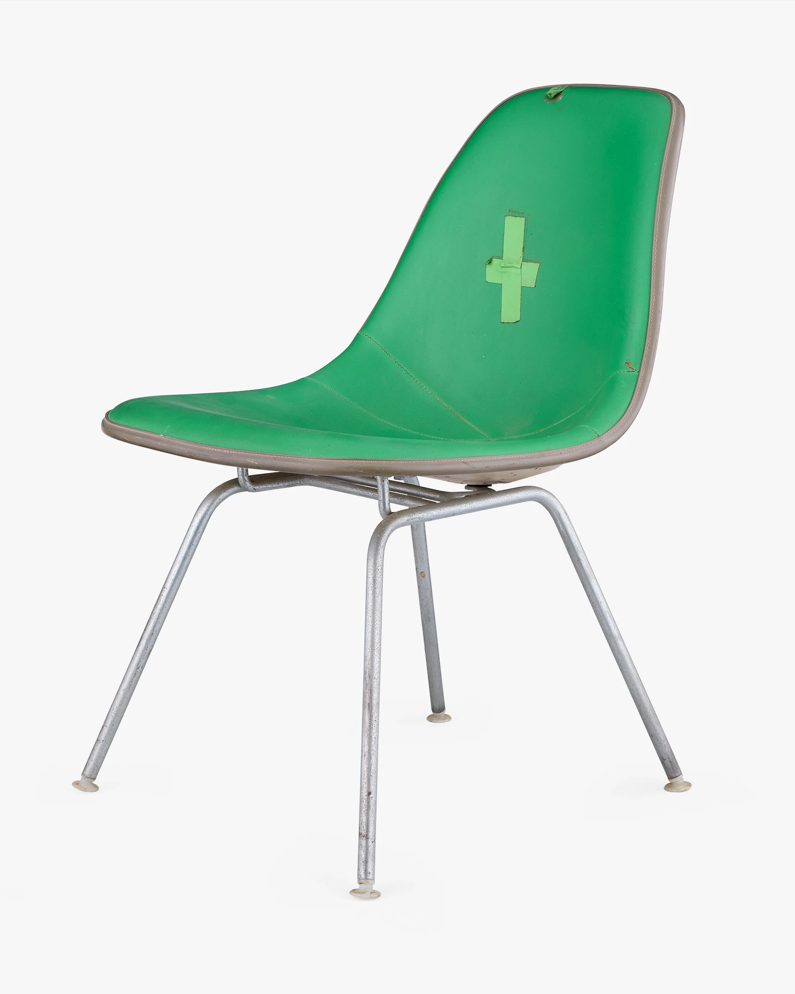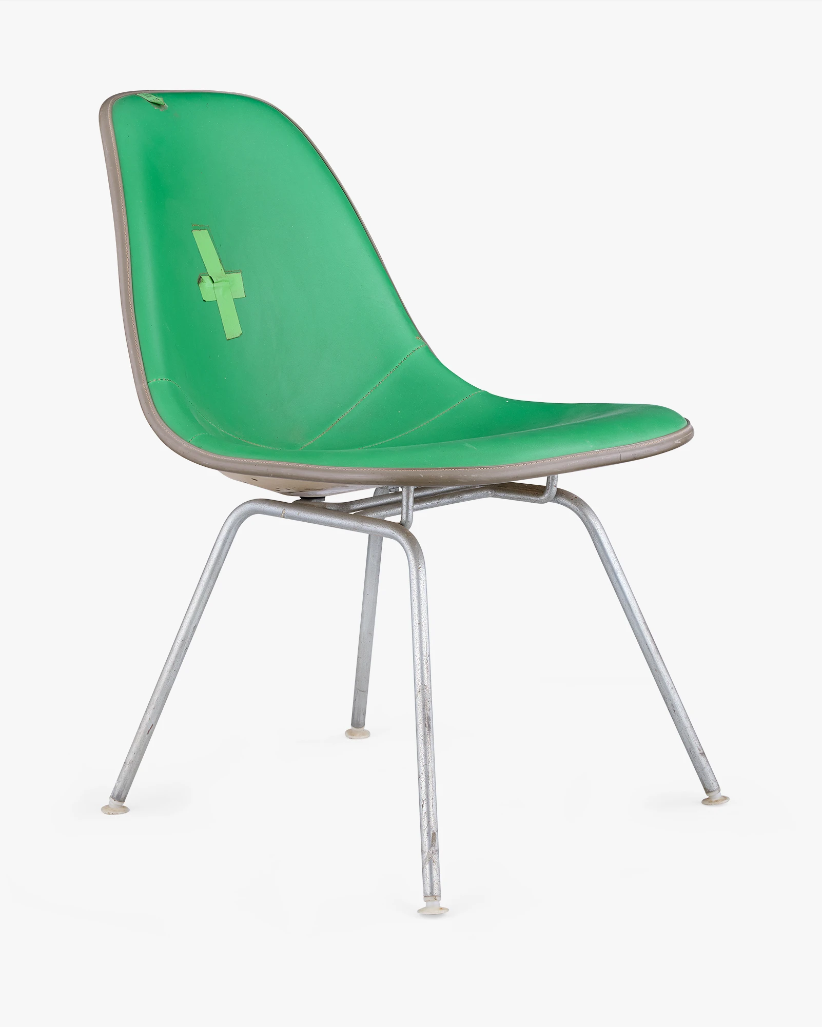 Charles often said what he wished for most was a pair of well-darned socks. In fact, the Eameses lived by an ethos of “don’t replace, repair.” There’s a symmetry to this piece, which has an electrical tape patch on its vinyl upholstery applied by Eames Office staff. Ray and Charles were known for keeping their old clothing by patching holes and darning tears. This sensible green patch feels very fitting. MSX-1 stands for Medium (height) Side (chair) X (base) 1 (upholstered).