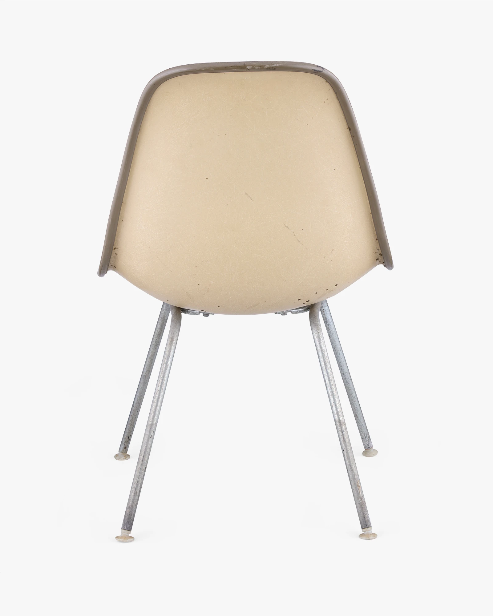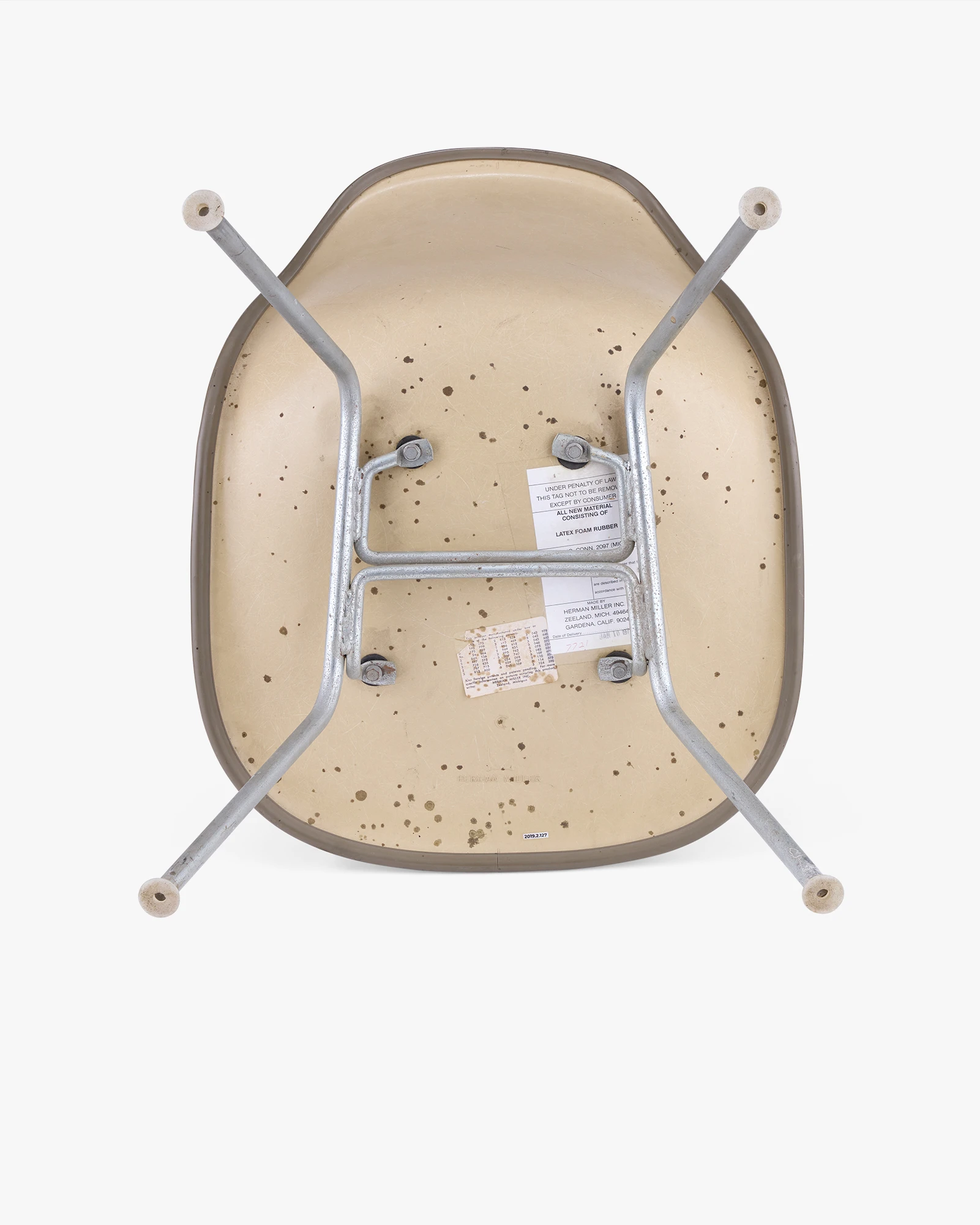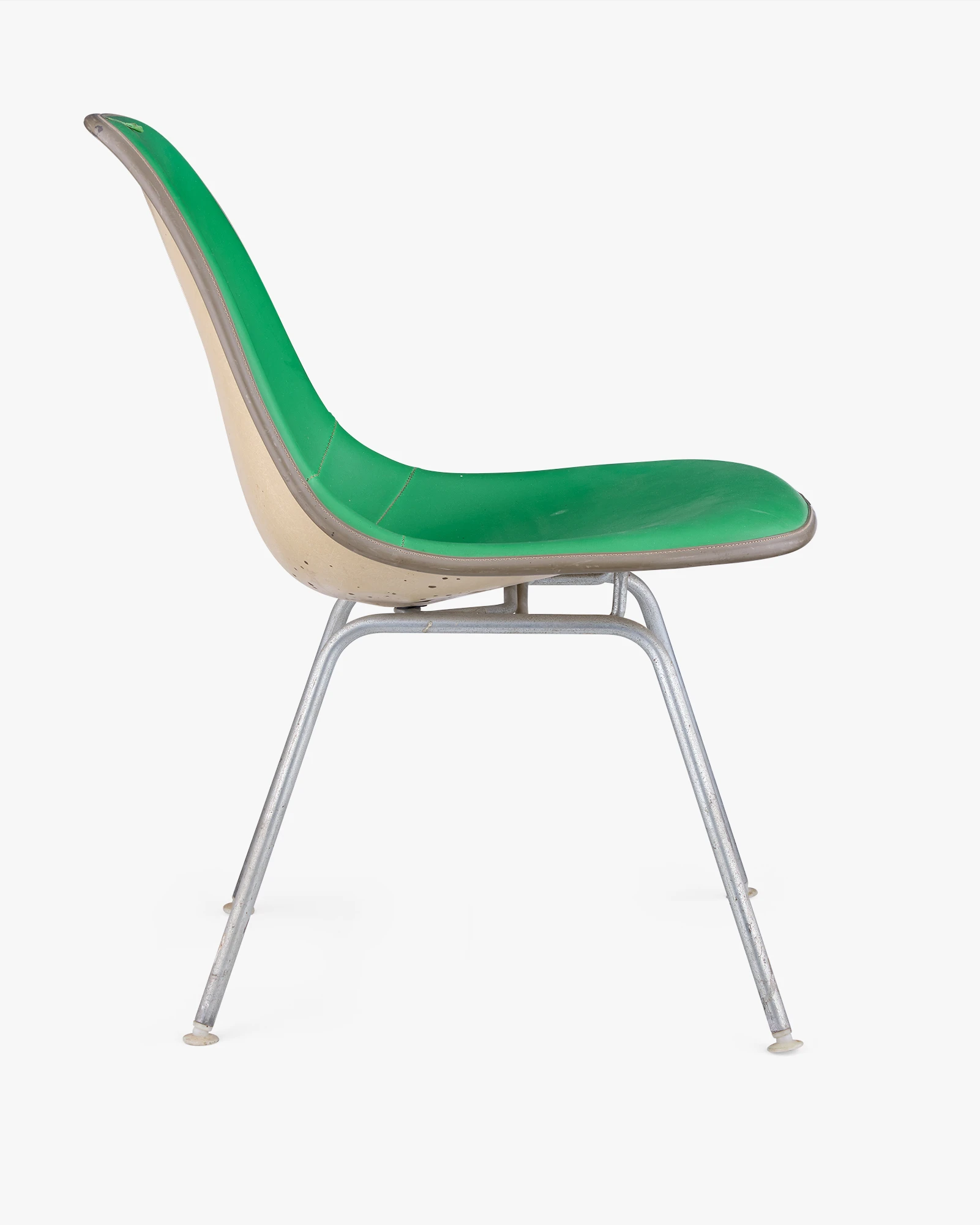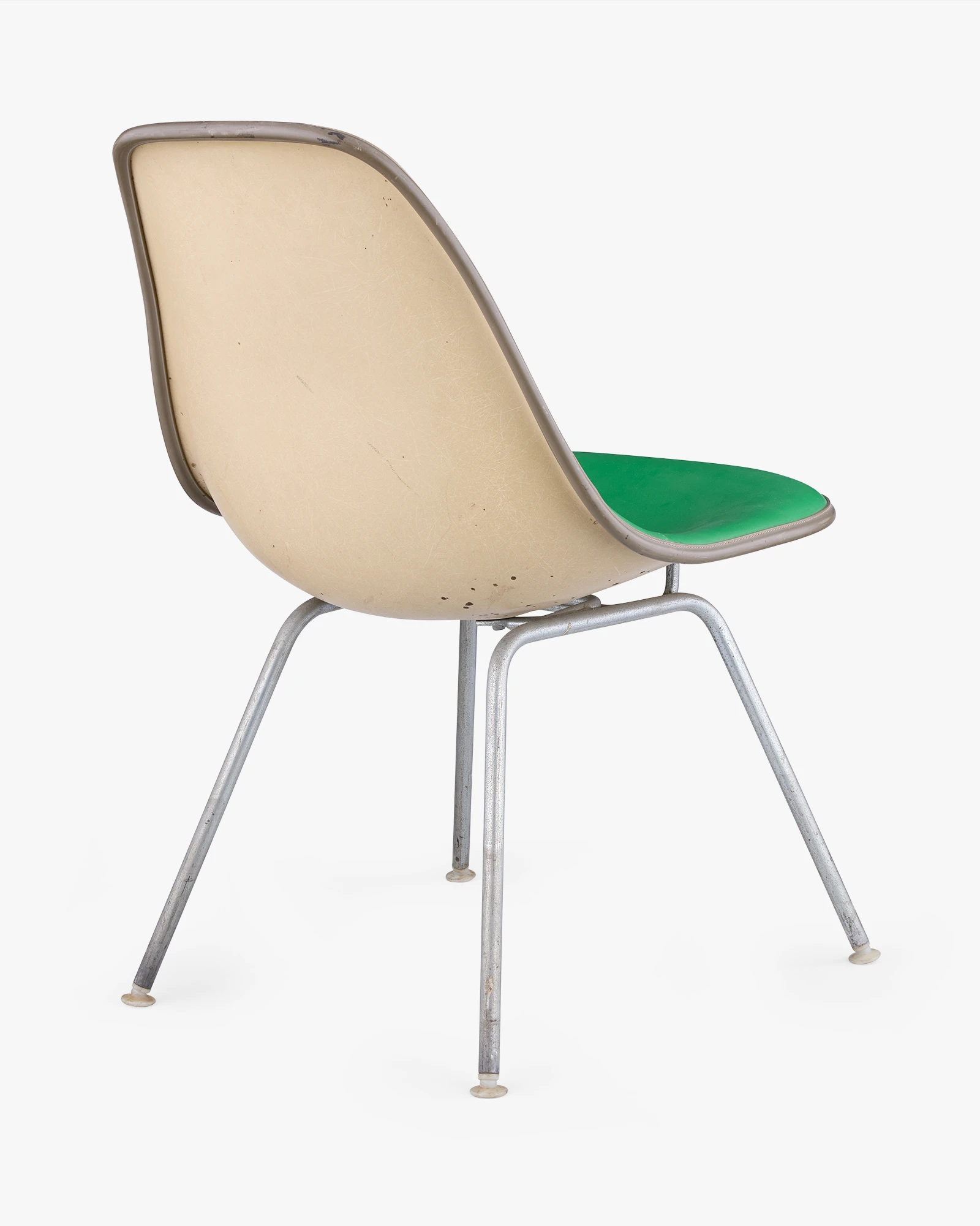 Charles often said what he wished for most was a pair of well-darned socks. In fact, the Eameses lived by an ethos of “don’t replace, repair.” There’s a symmetry to this piece, which has an electrical tape patch on its vinyl upholstery applied by Eames Office staff. Ray and Charles were known for keeping their old clothing by patching holes and darning tears. This sensible green patch feels very fitting. MSX-1 stands for Medium (height) Side (chair) X (base) 1 (upholstered).
