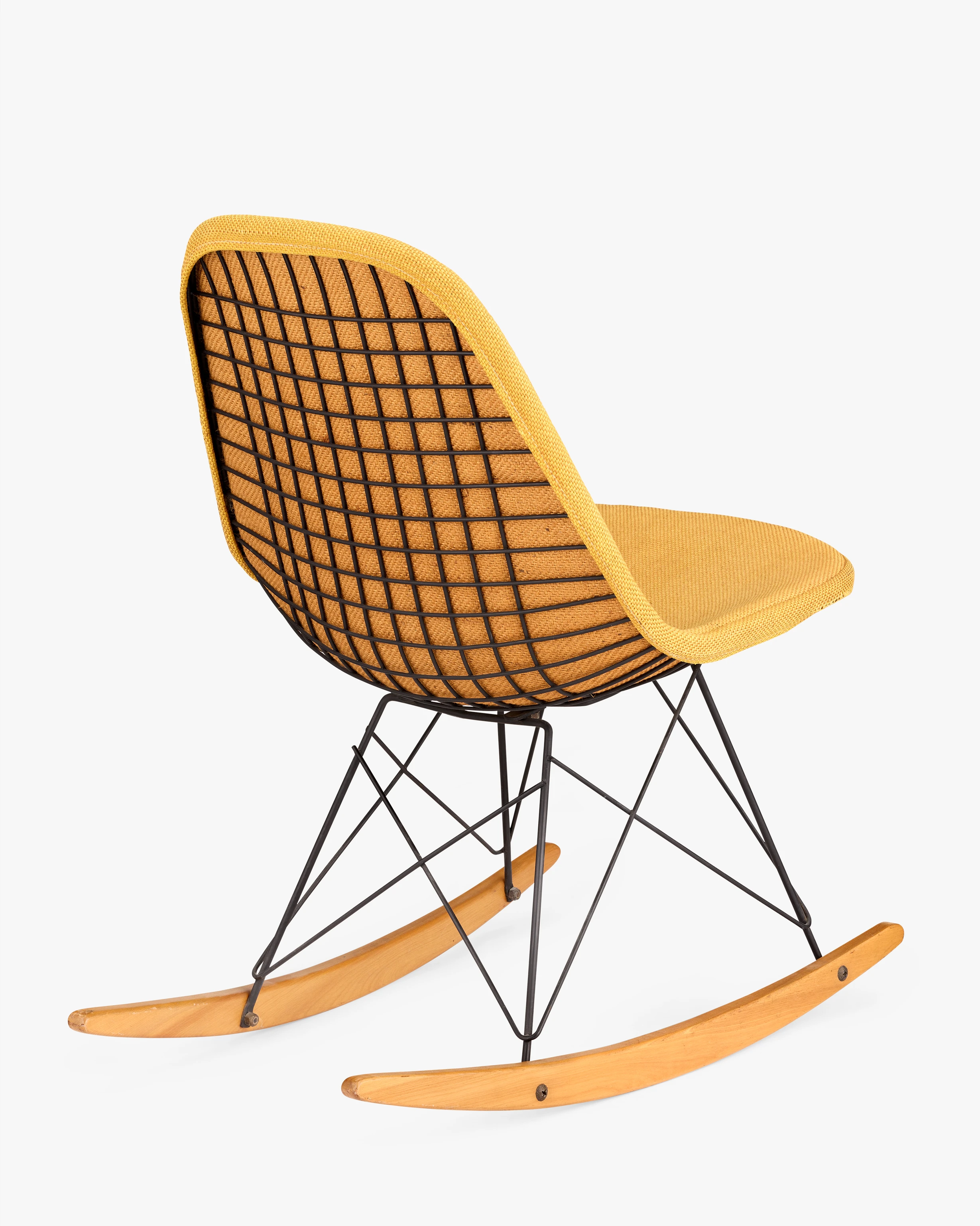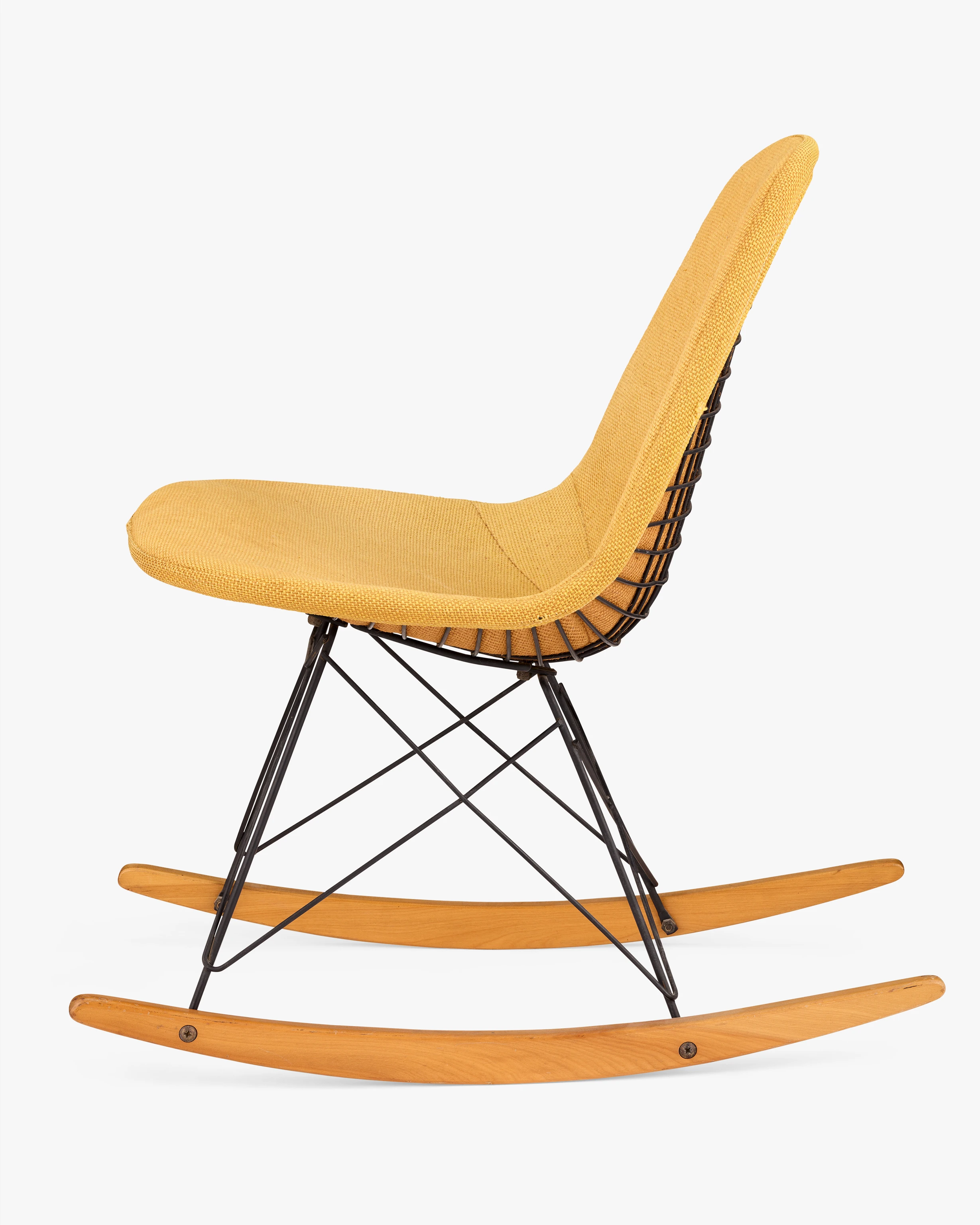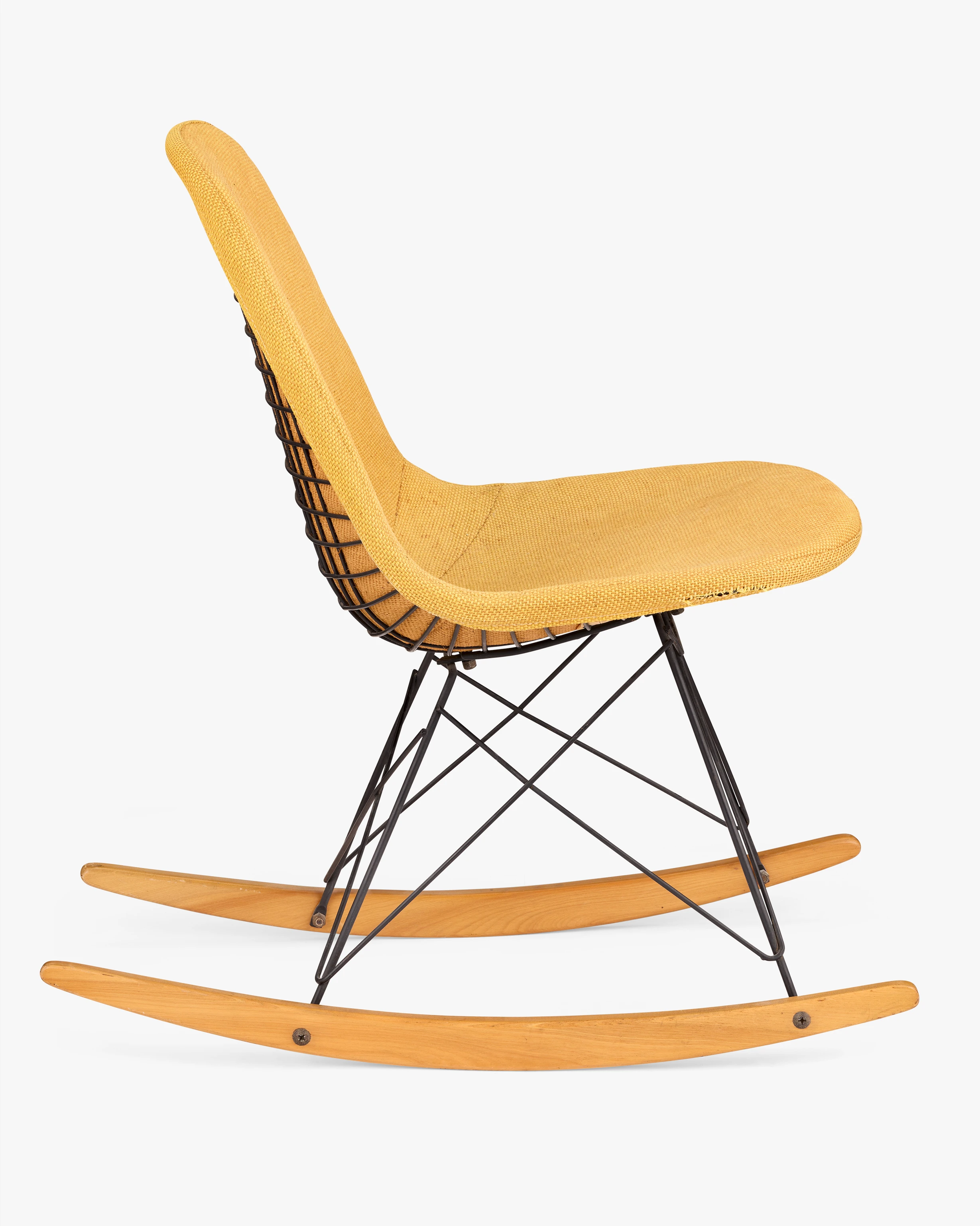 This early rocking chair with Wire Shell is upholstered with one of the first textiles developed by Herman Miller’s then-new director of textiles, Alexander Girard. Ray and Charles were friends with Susan and Alexander Girard and they enthusiastically recommended him to Herman Miller. Girard would go on to influence the look of Eames furniture through textiles for years to come. RKR-1 stands for Rocking K-wire (chair) Rod (base) 1 (1-piece upholstered pad).
