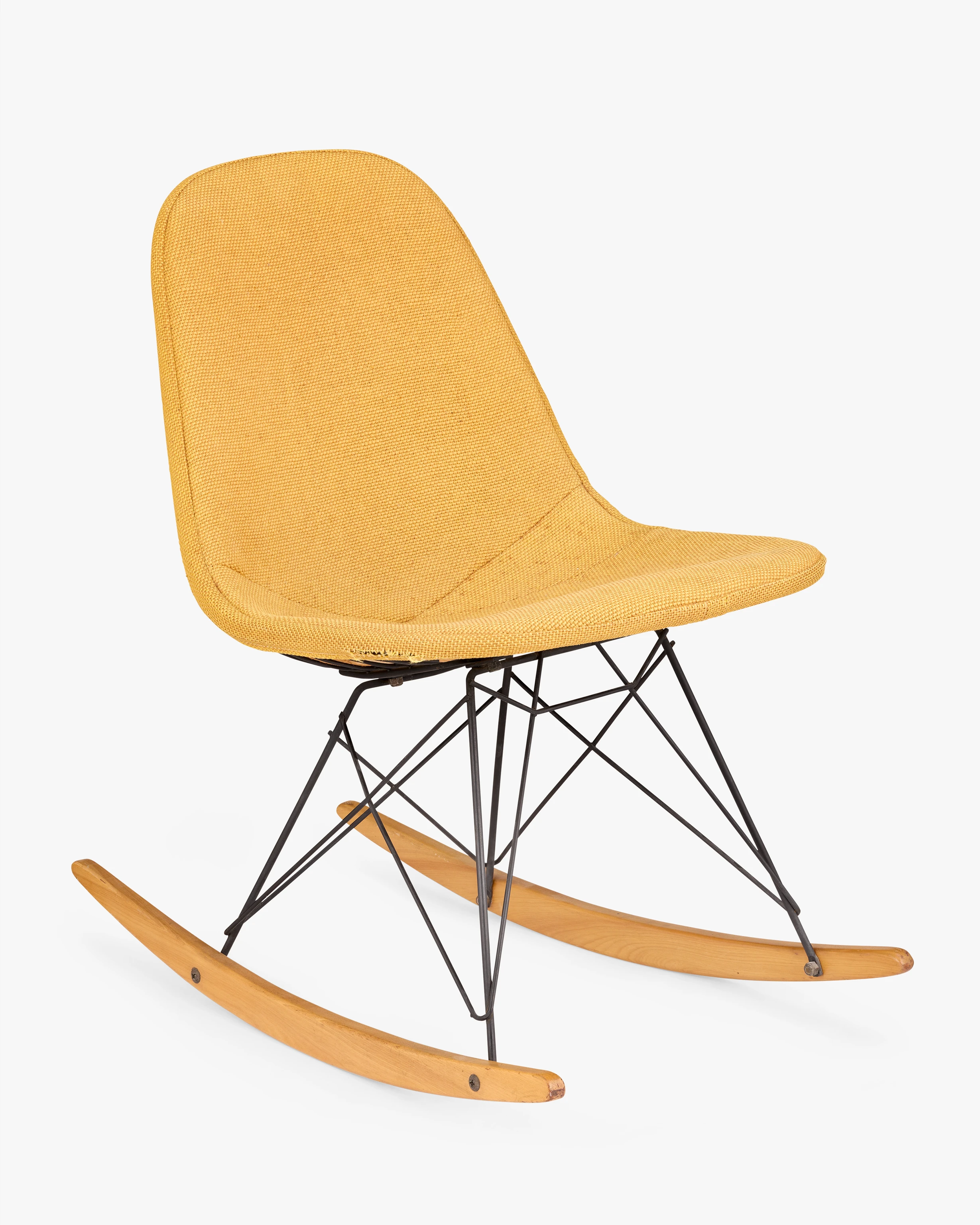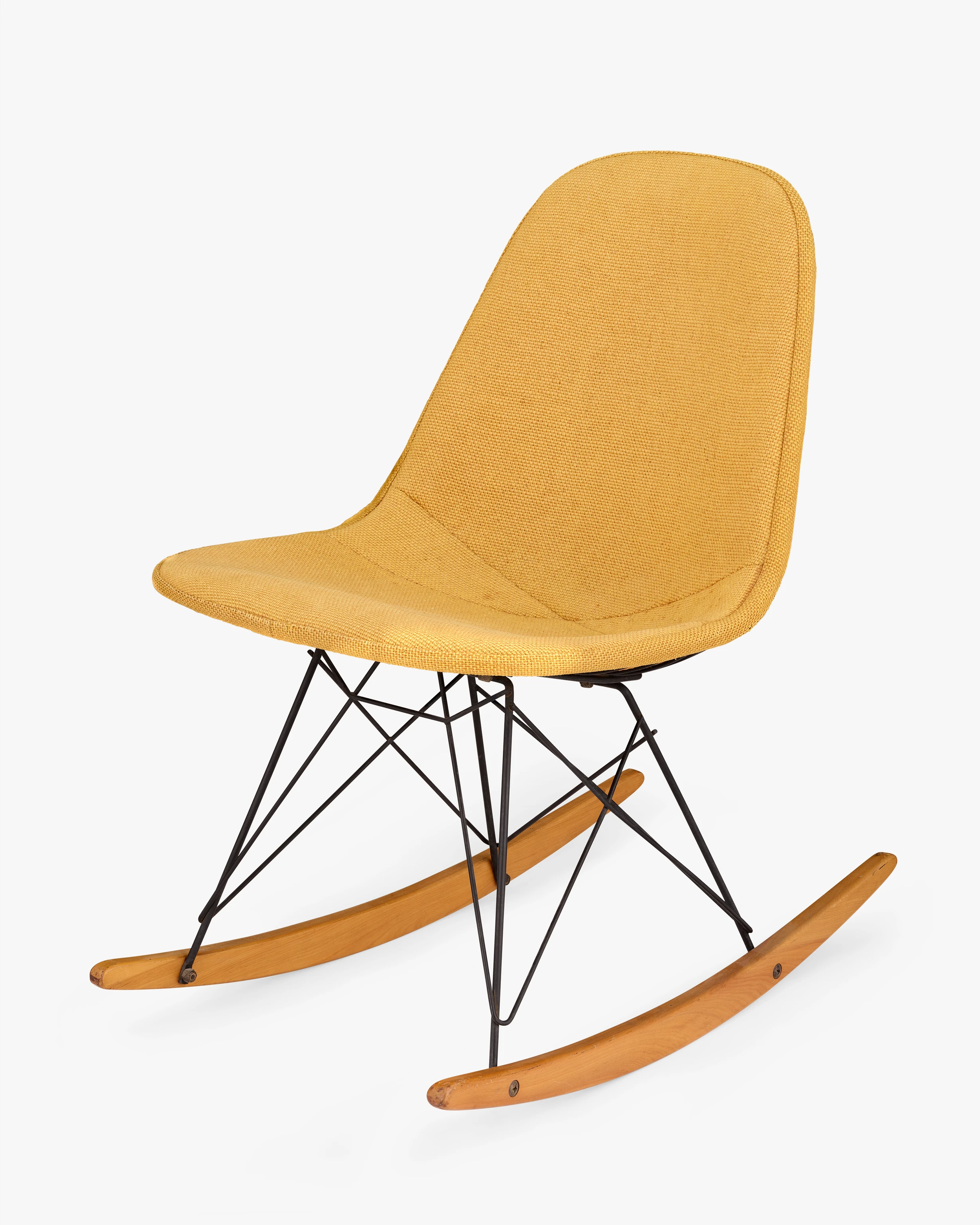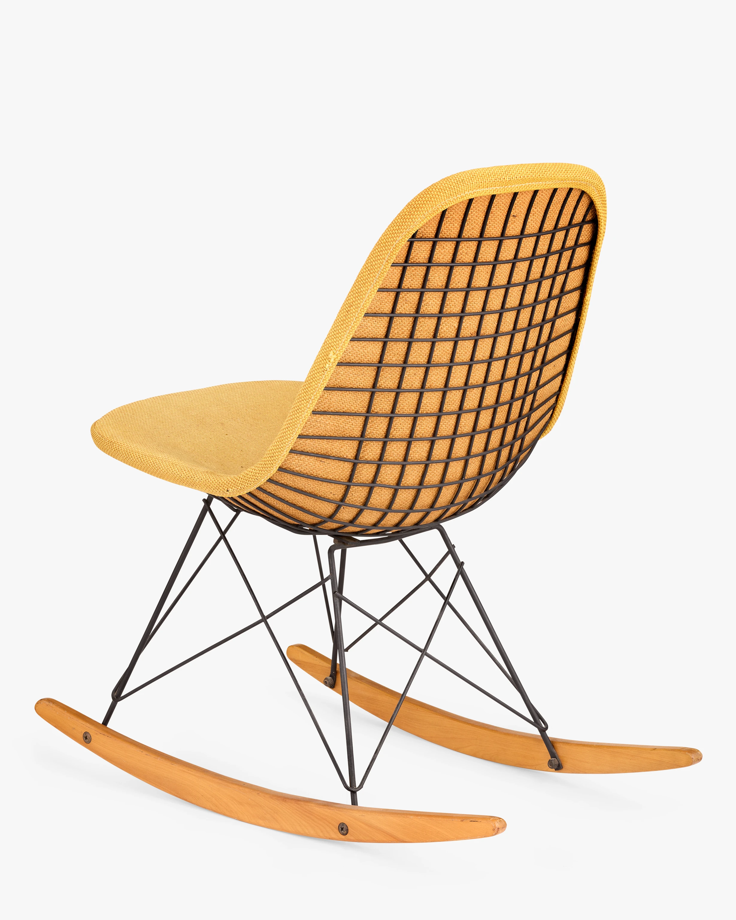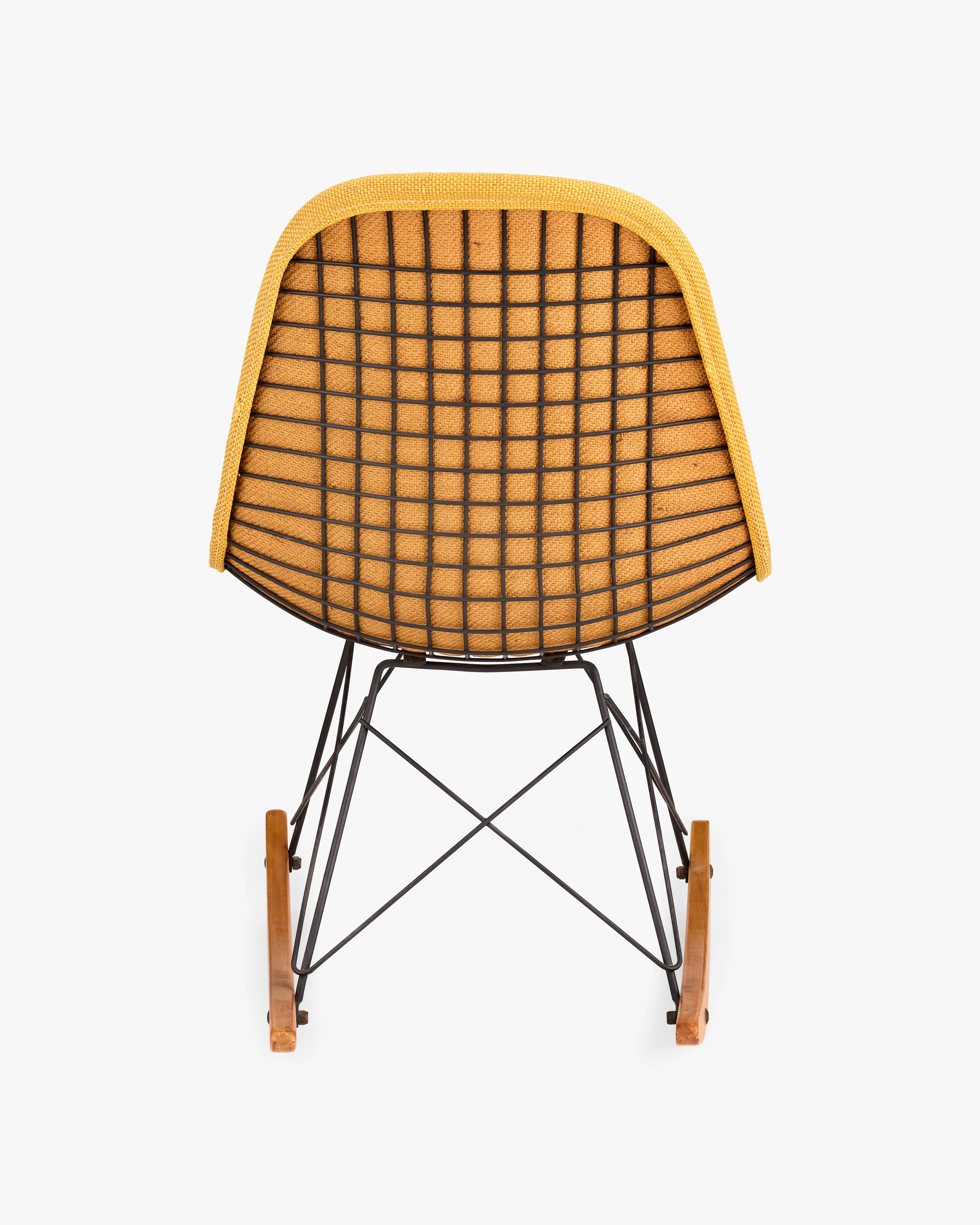 This early rocking chair with Wire Shell is upholstered with one of the first textiles developed by Herman Miller’s then-new director of textiles, Alexander Girard. Ray and Charles were friends with Susan and Alexander Girard and they enthusiastically recommended him to Herman Miller. Girard would go on to influence the look of Eames furniture through textiles for years to come. RKR-1 stands for Rocking K-wire (chair) Rod (base) 1 (1-piece upholstered pad).