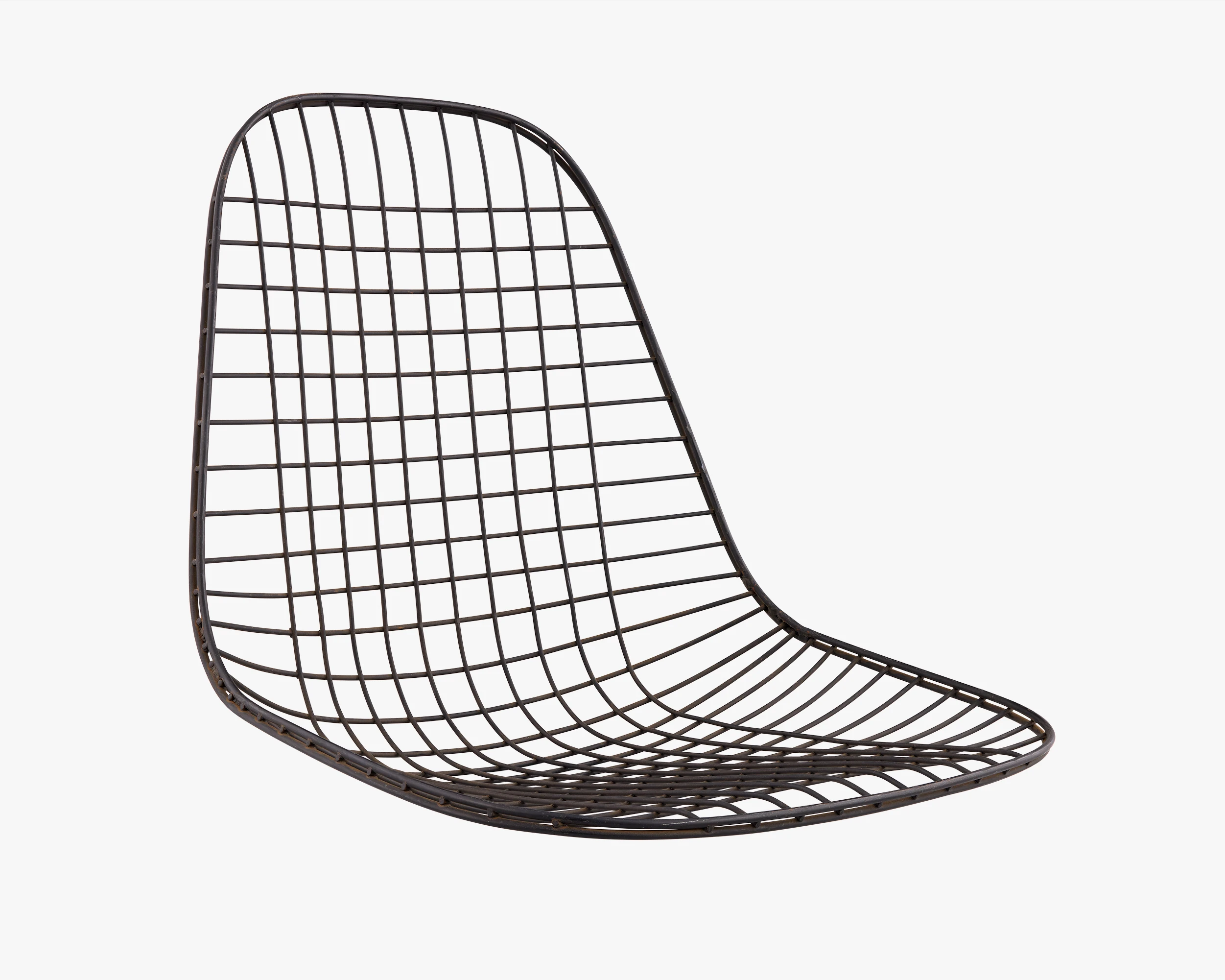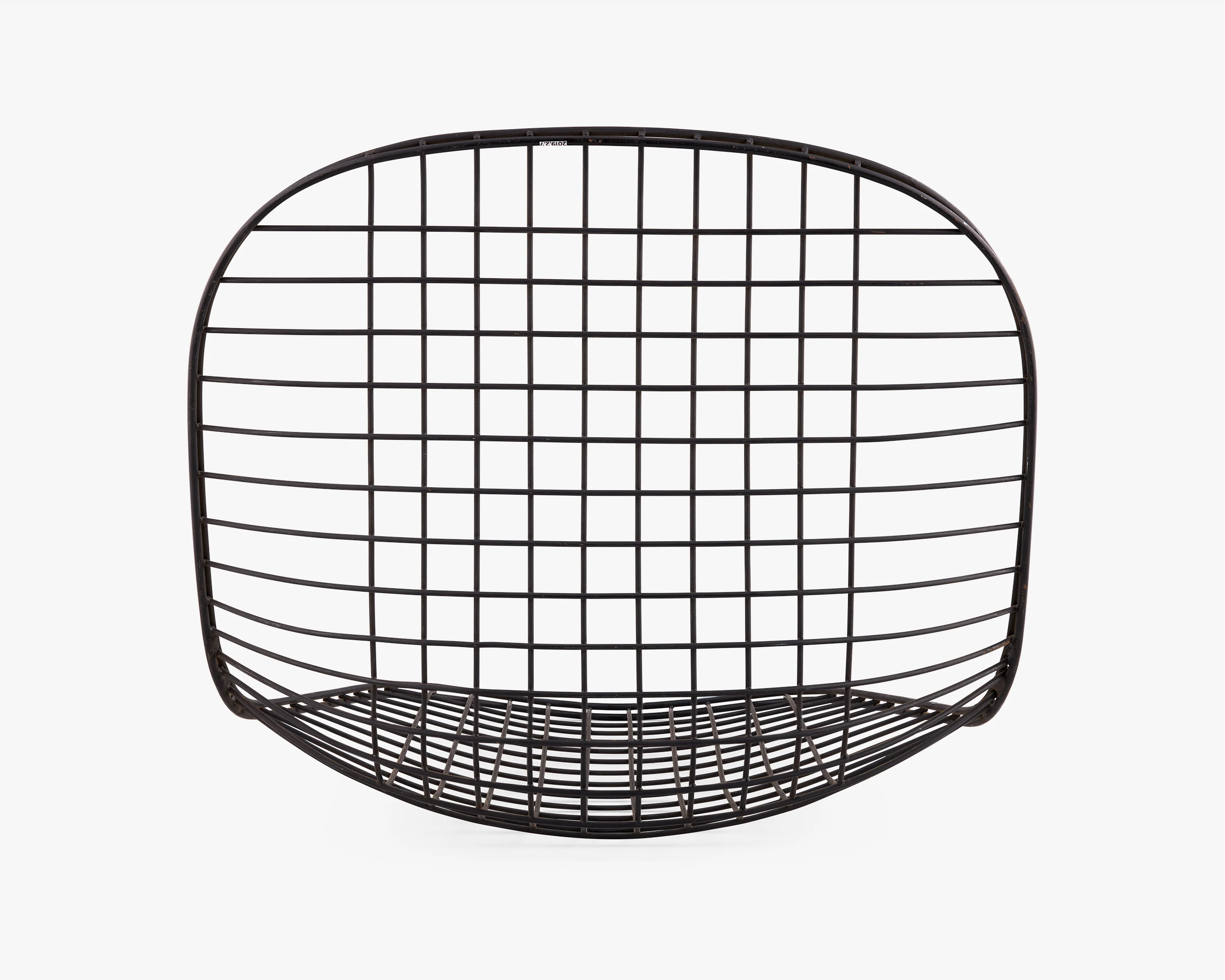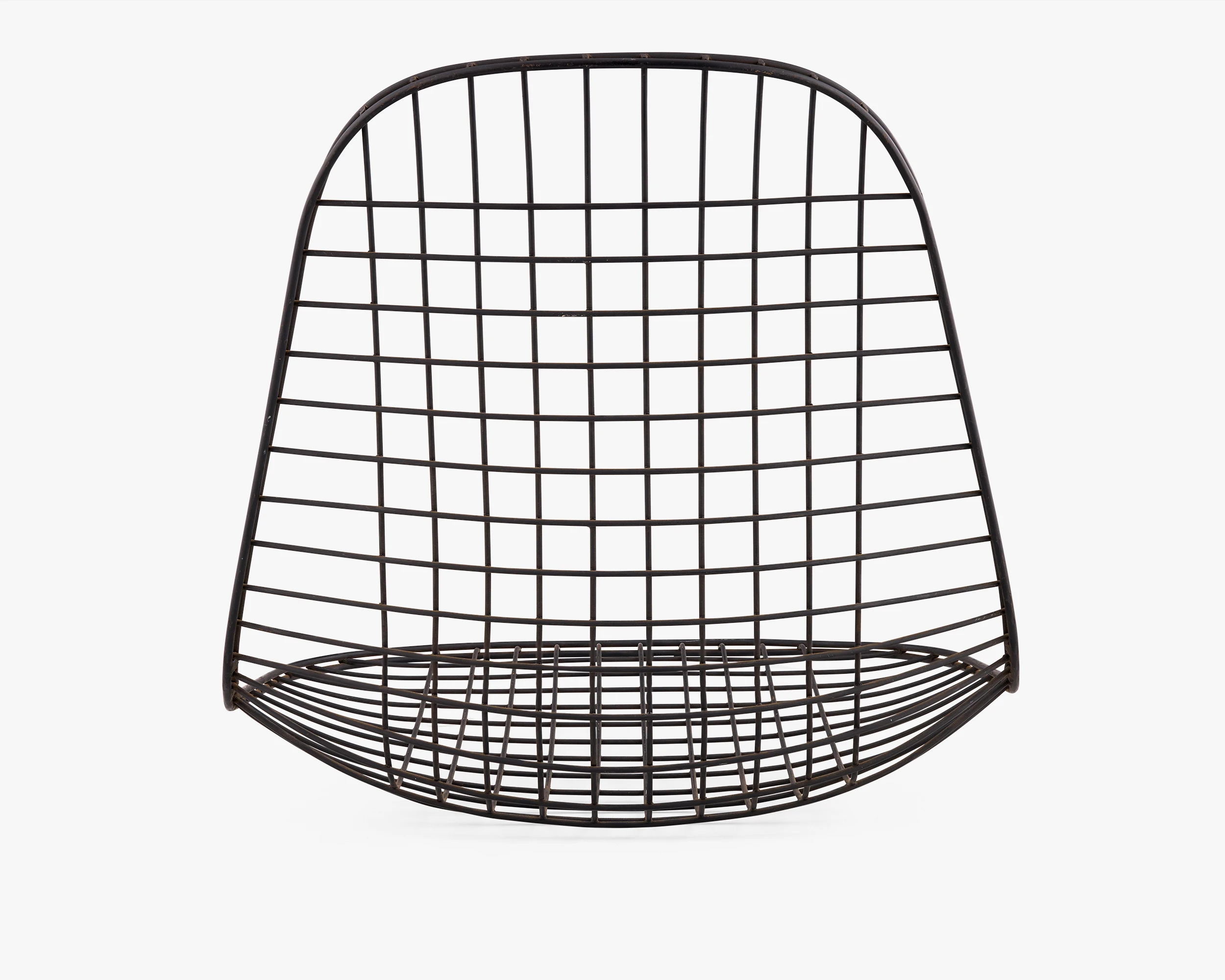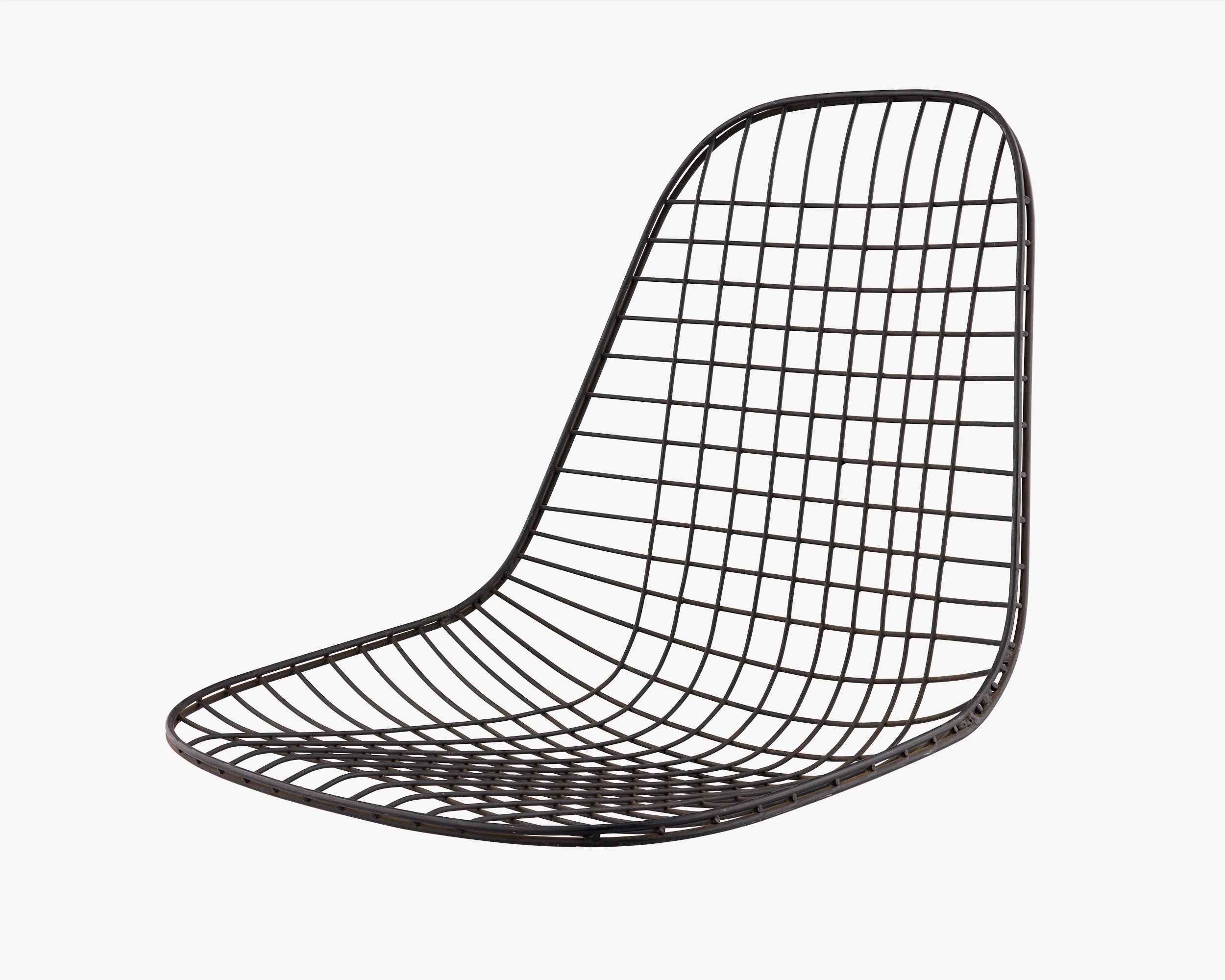 Ray and Charles were inspired to use steel wire to create a chair by observing the way wire was welded and bent to manufacture items like sturdy and lightweight baskets and shopping carts. The shell supports a removable upholstered pad, which came in two forms, one piece and two piece, the so-called “Bikini Pad.” The Wire Shell was developed after the fiberglass Armchair but before the fiberglass Side Chair.