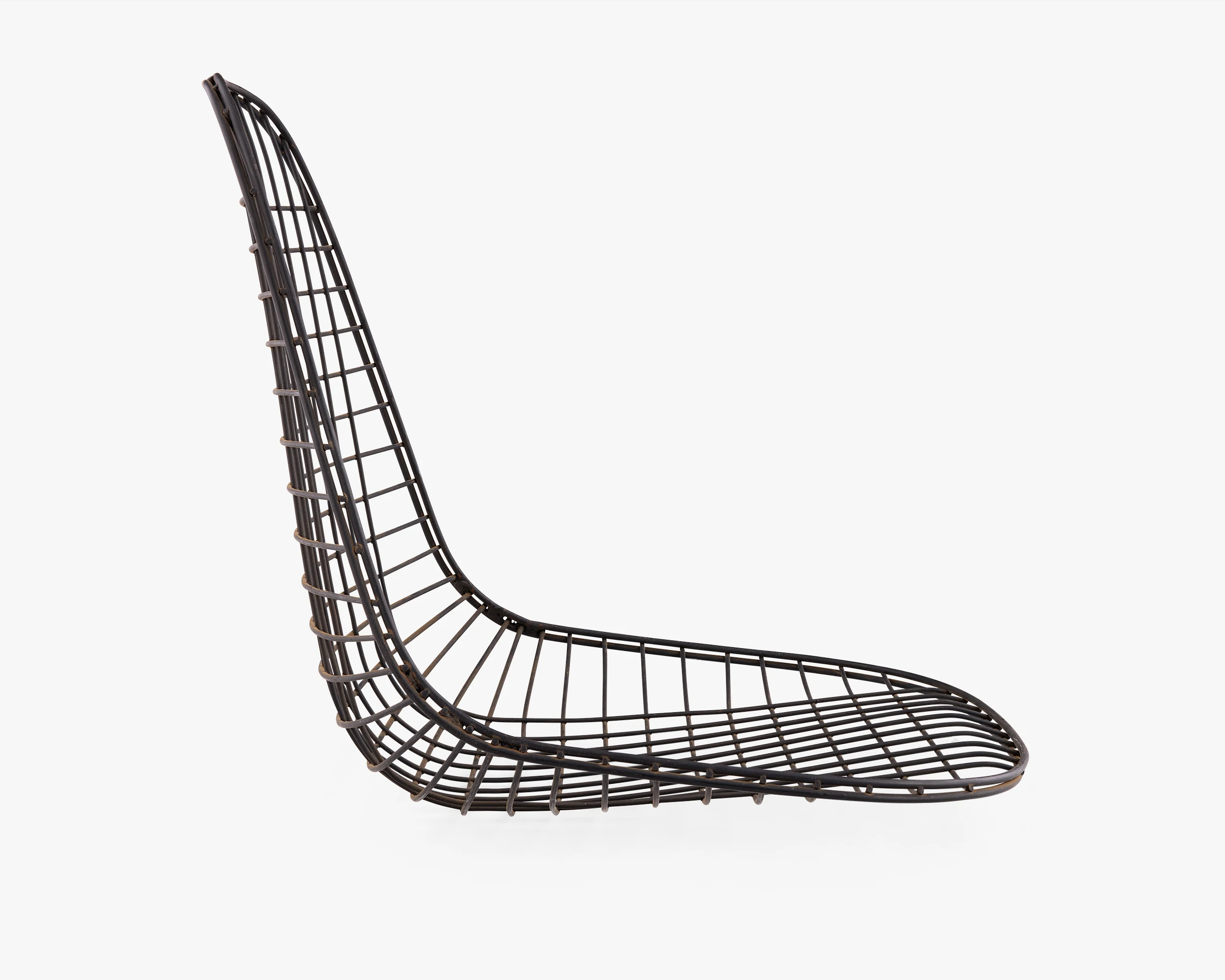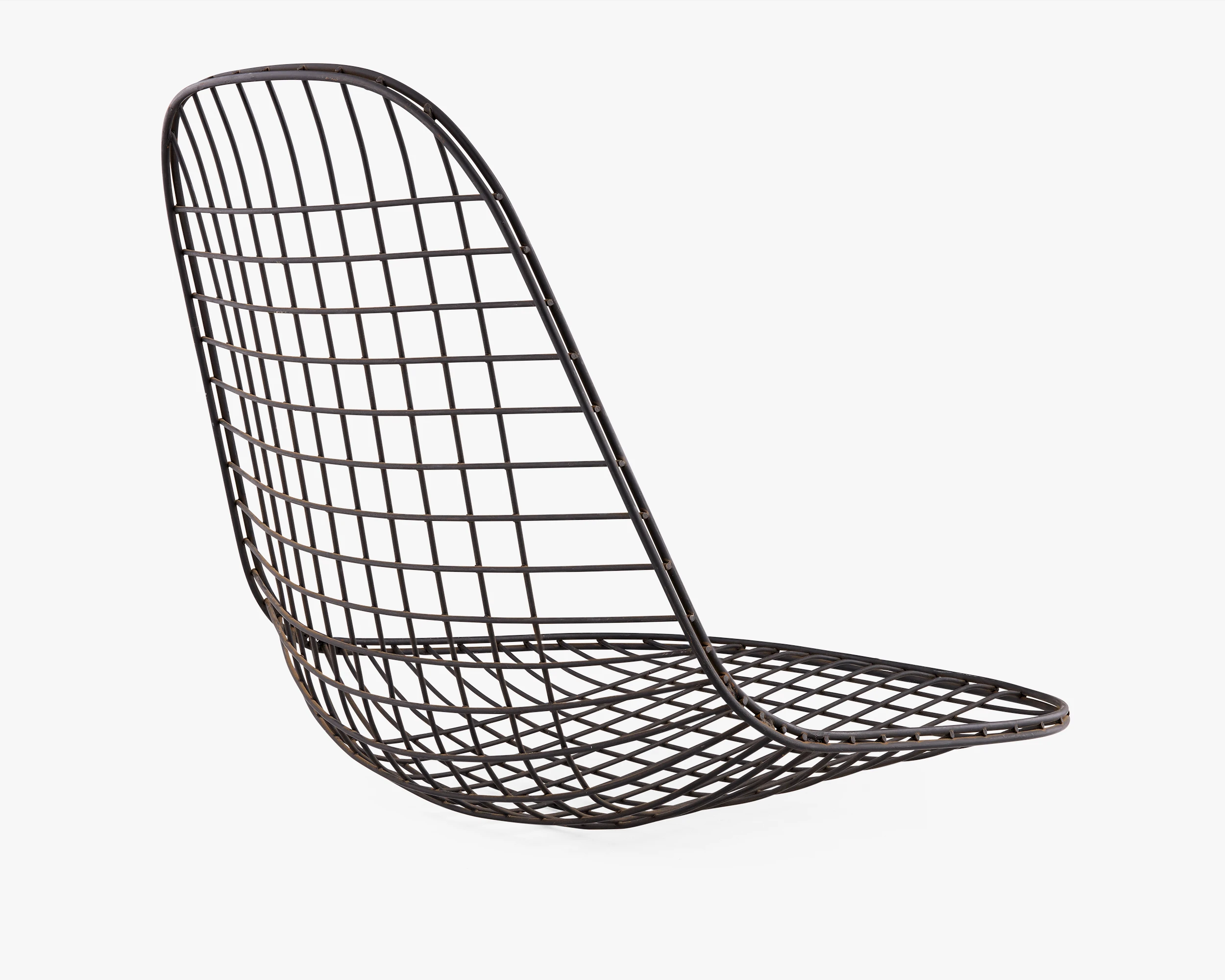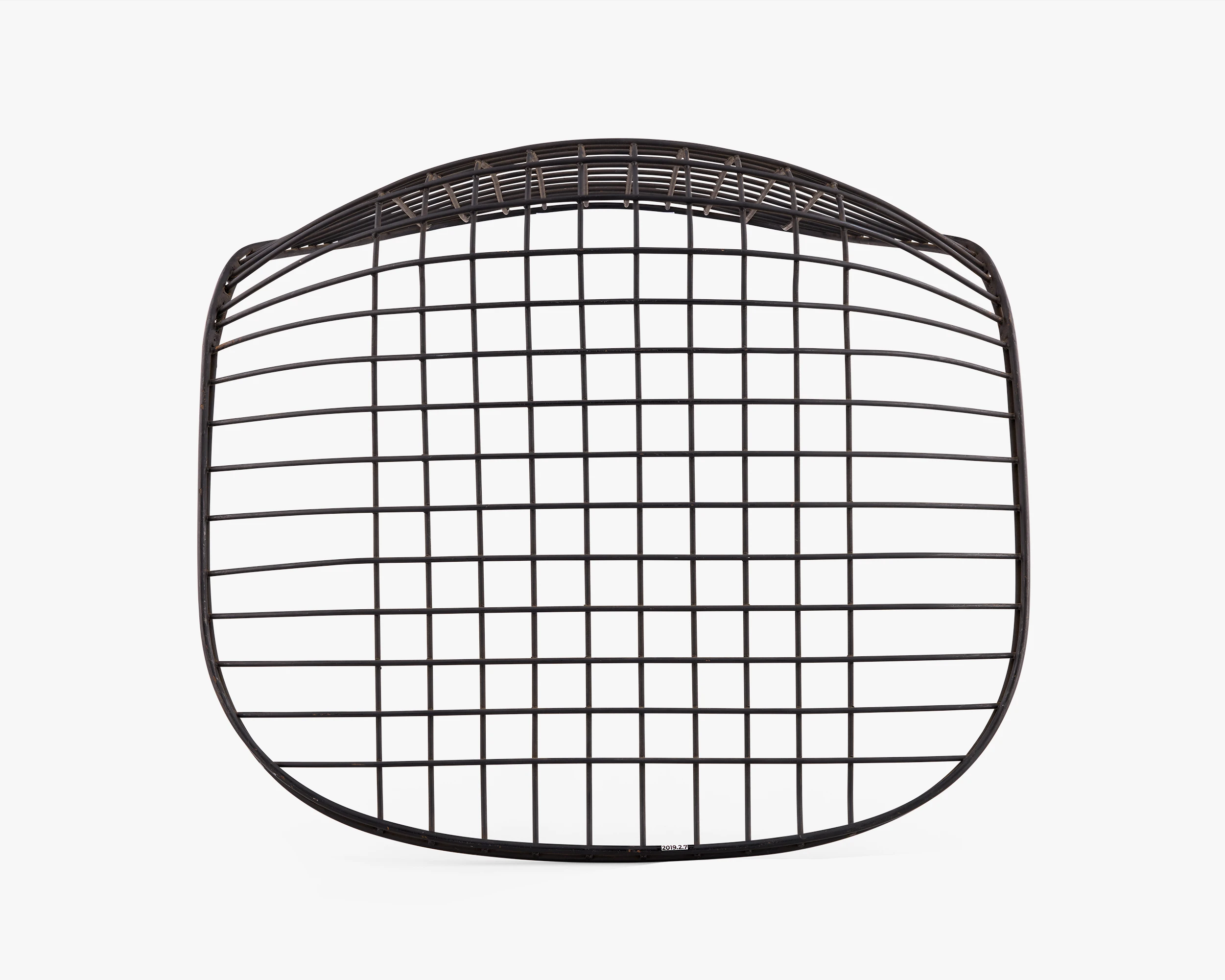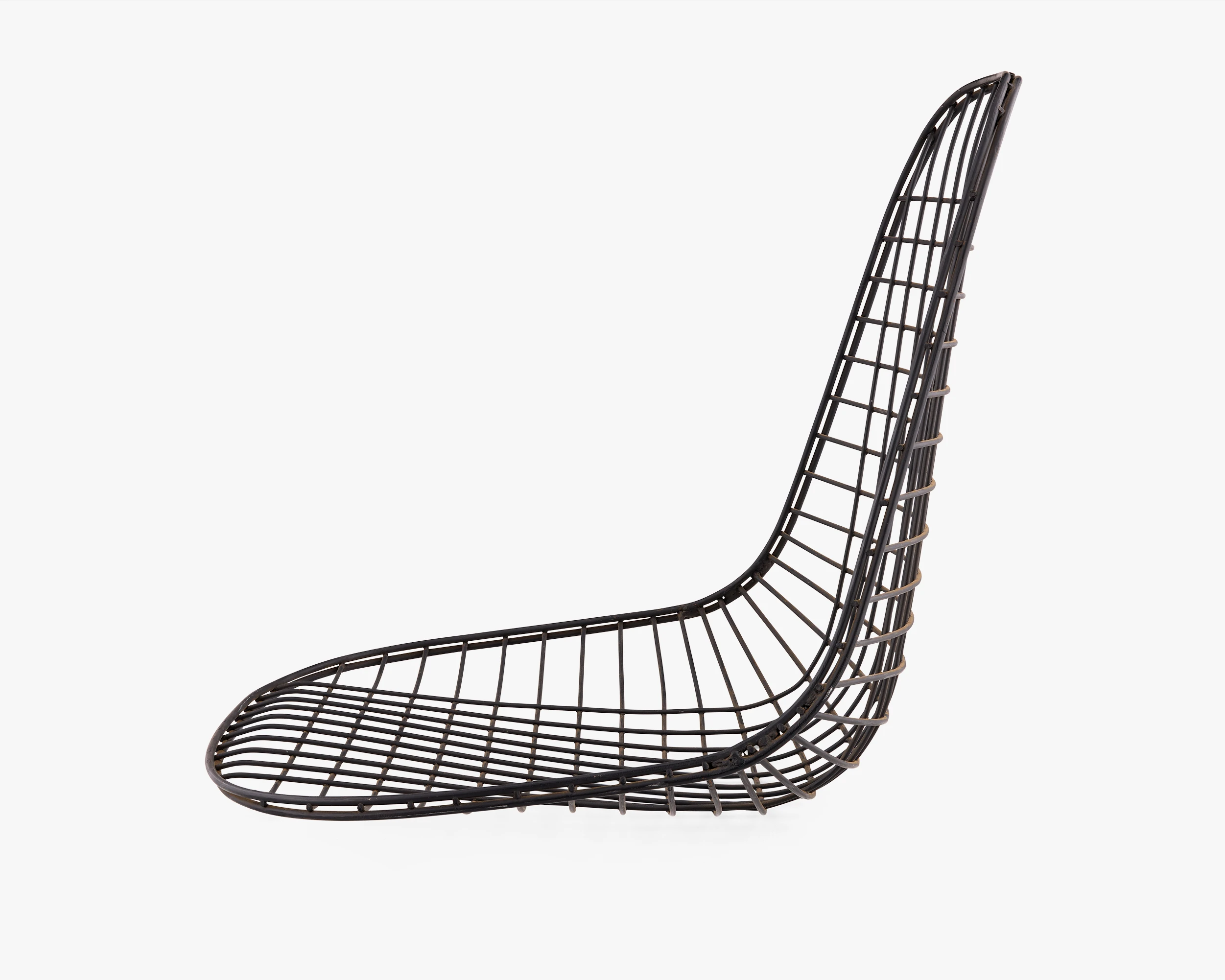 Ray and Charles were inspired to use steel wire to create a chair by observing the way wire was welded and bent to manufacture items like sturdy and lightweight baskets and shopping carts. The shell supports a removable upholstered pad, which came in two forms, one piece and two piece, the so-called “Bikini Pad.” The Wire Shell was developed after the fiberglass Armchair but before the fiberglass Side Chair.