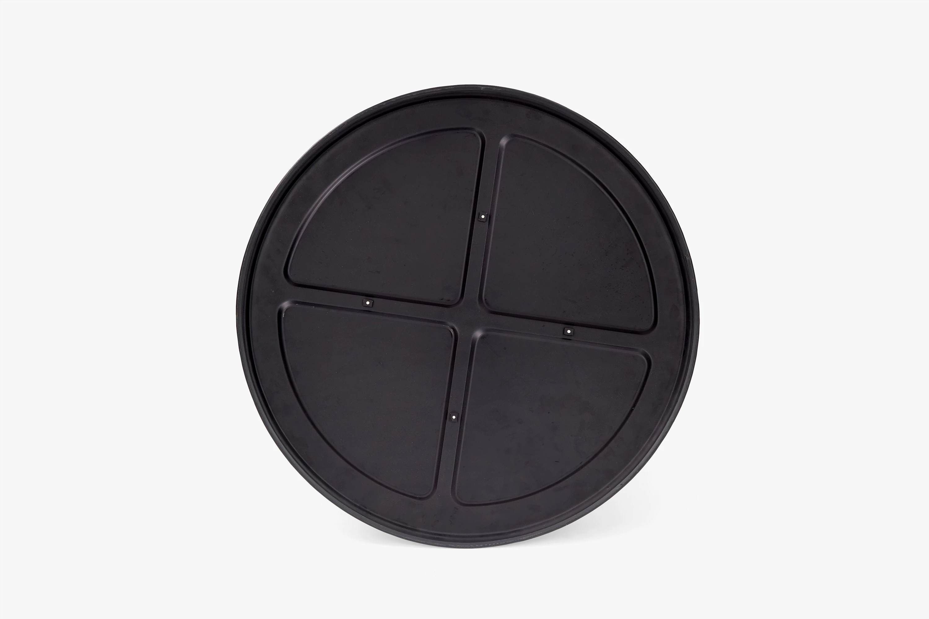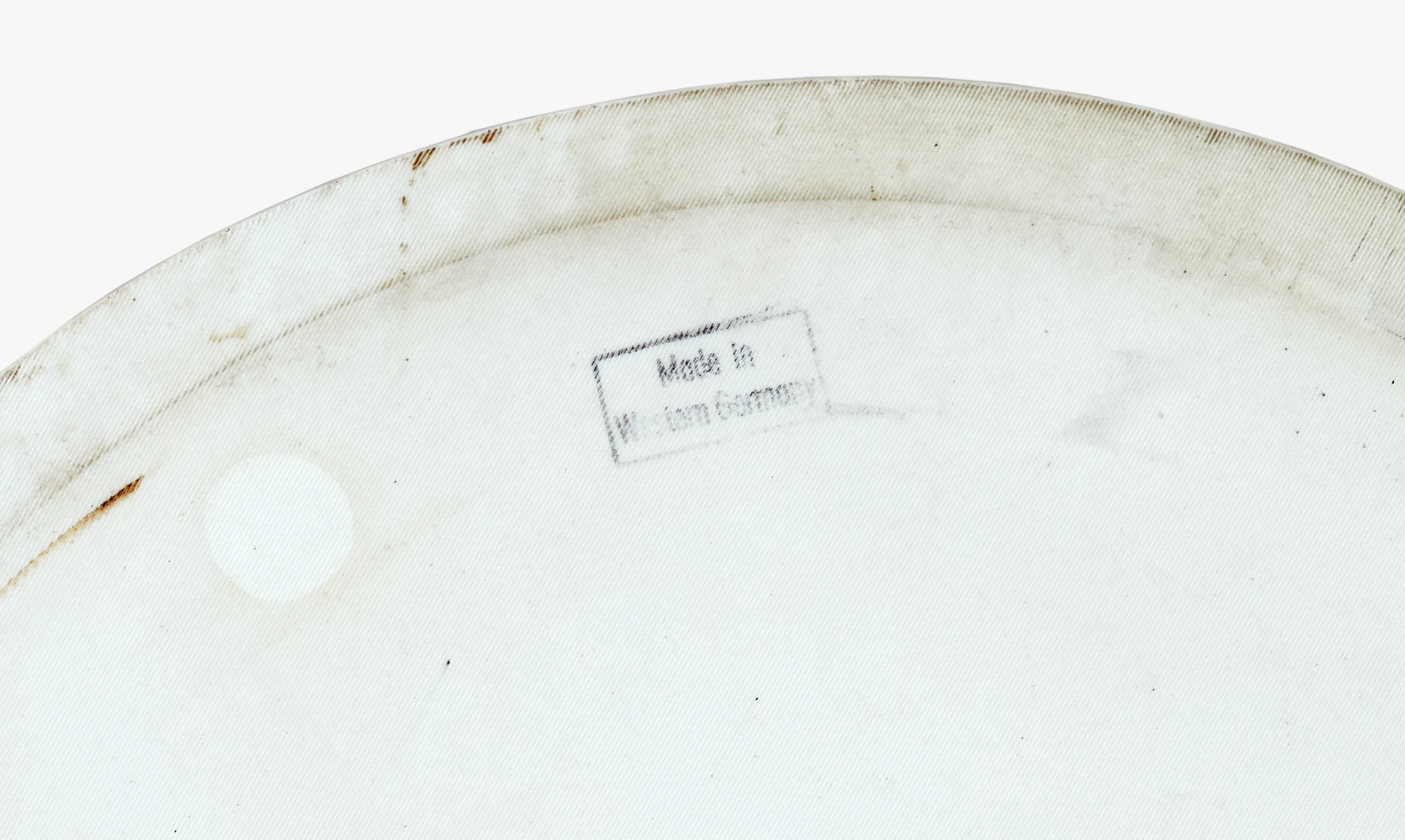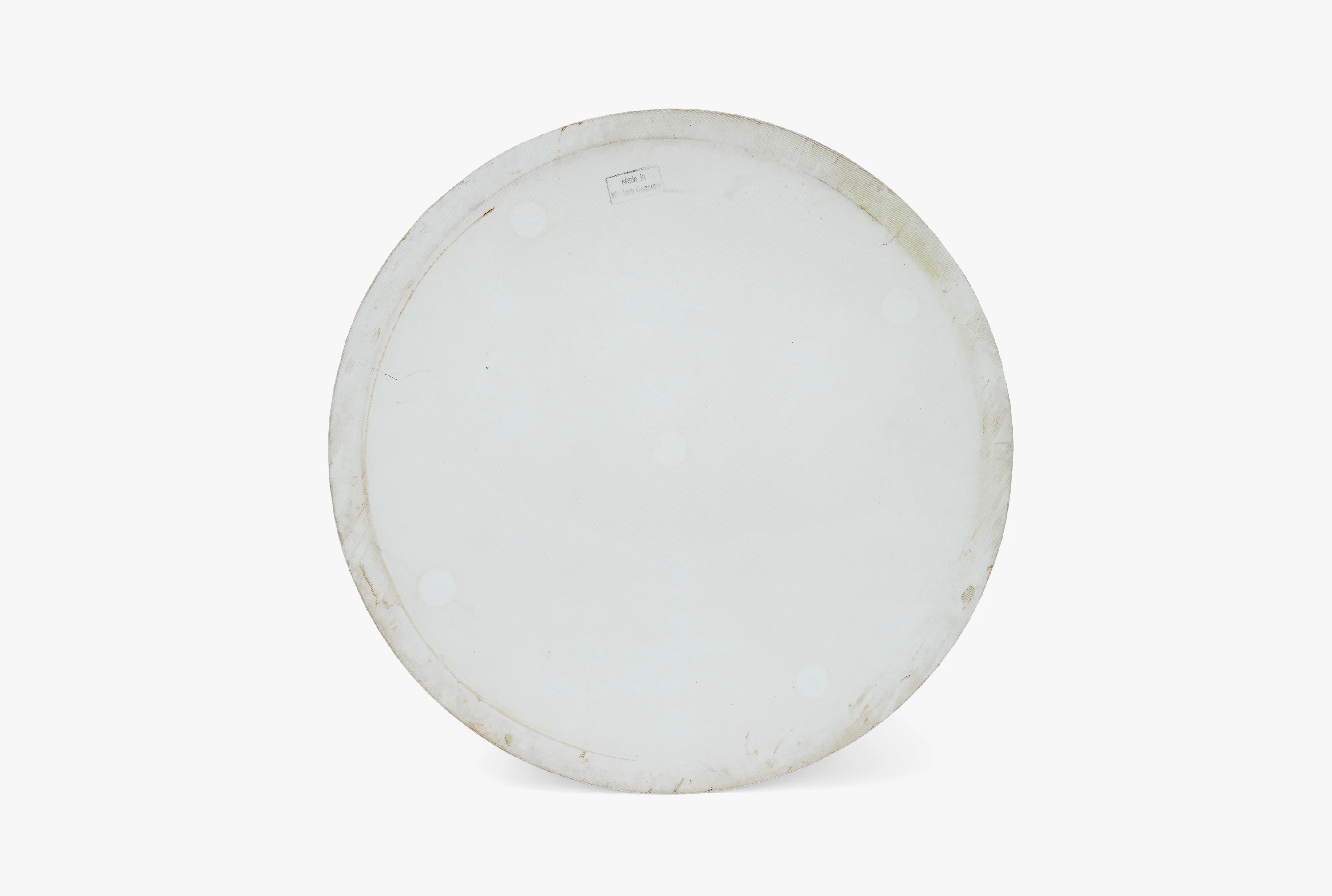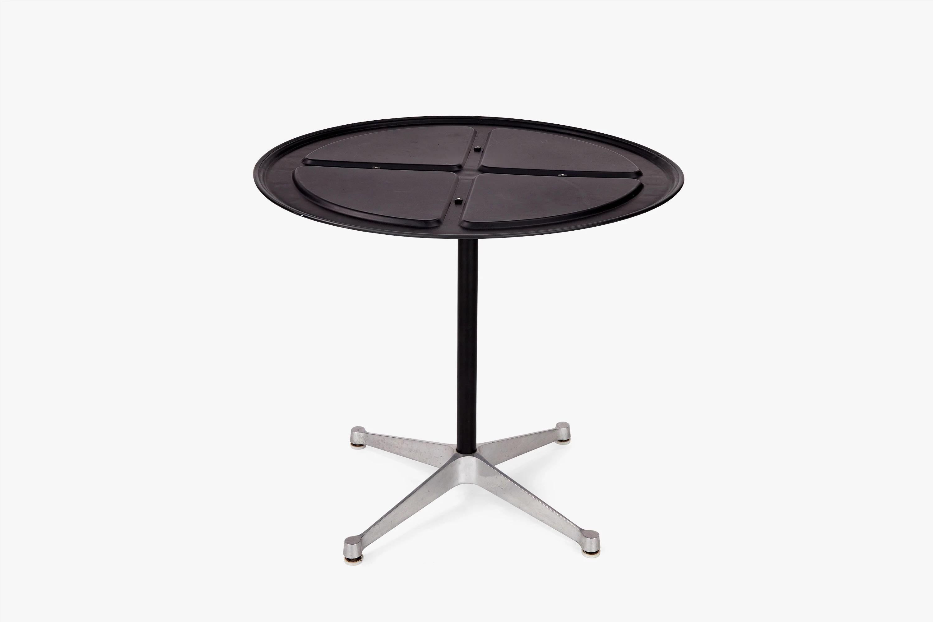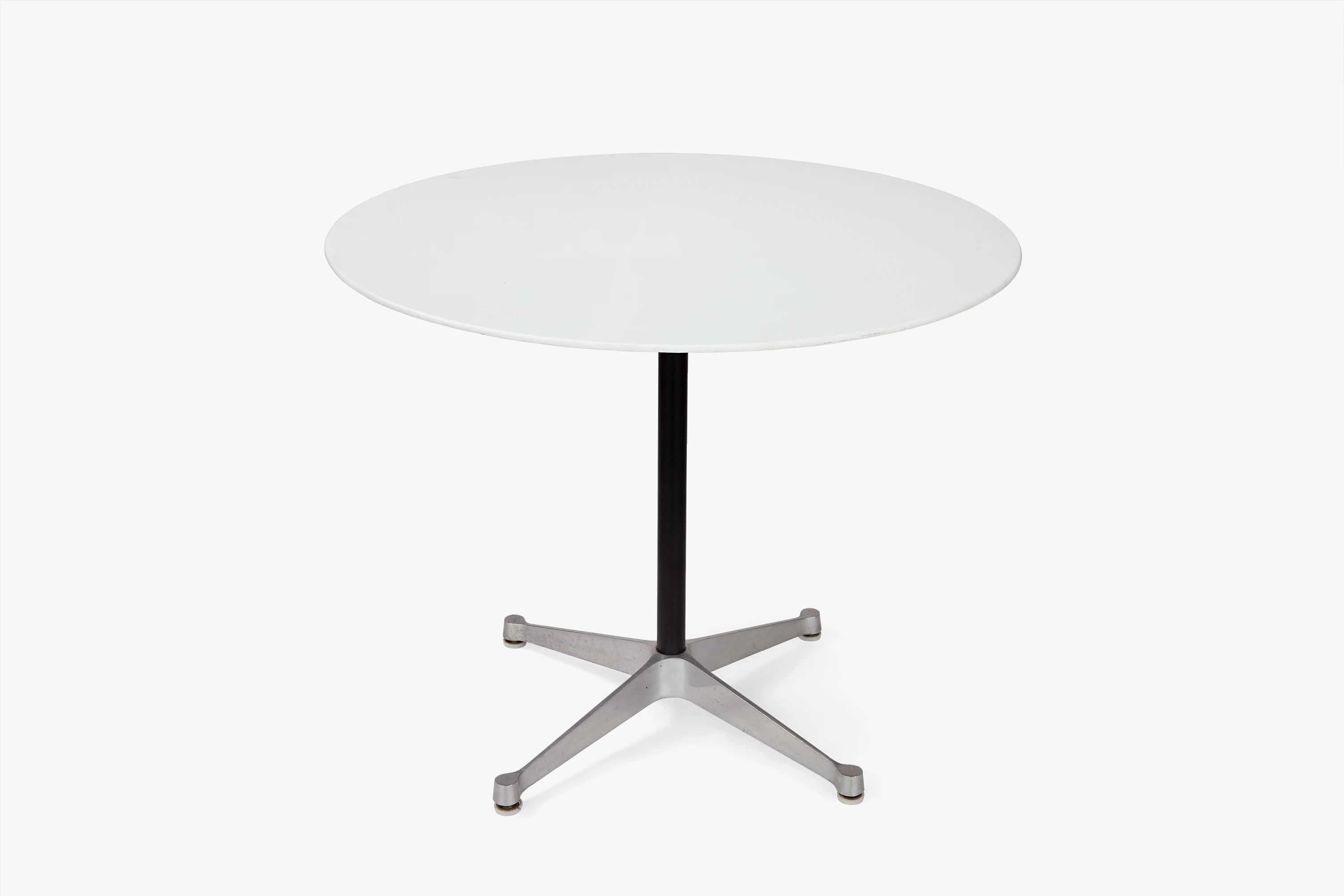 The model 692 dining table was introduced in 1958 as part of the Indoor-Outdoor Group—a system of chairs and tables originally intended, as the name suggests, for use both indoors and outside. Rechristened the following year as the Eames Aluminum Group, these designs ultimately withstood the test of time thanks to their successful adaptation from domestic applications to offices and workplaces. The defining characteristic of the tables in the collection come from the element they share with the chairs: a sturdy four-pronged, cast-aluminum pedestal base terminating in cylindrical feet housing nylon glides. This extremely rare early example features an opaque white scientific-grade German glass tabletop.
