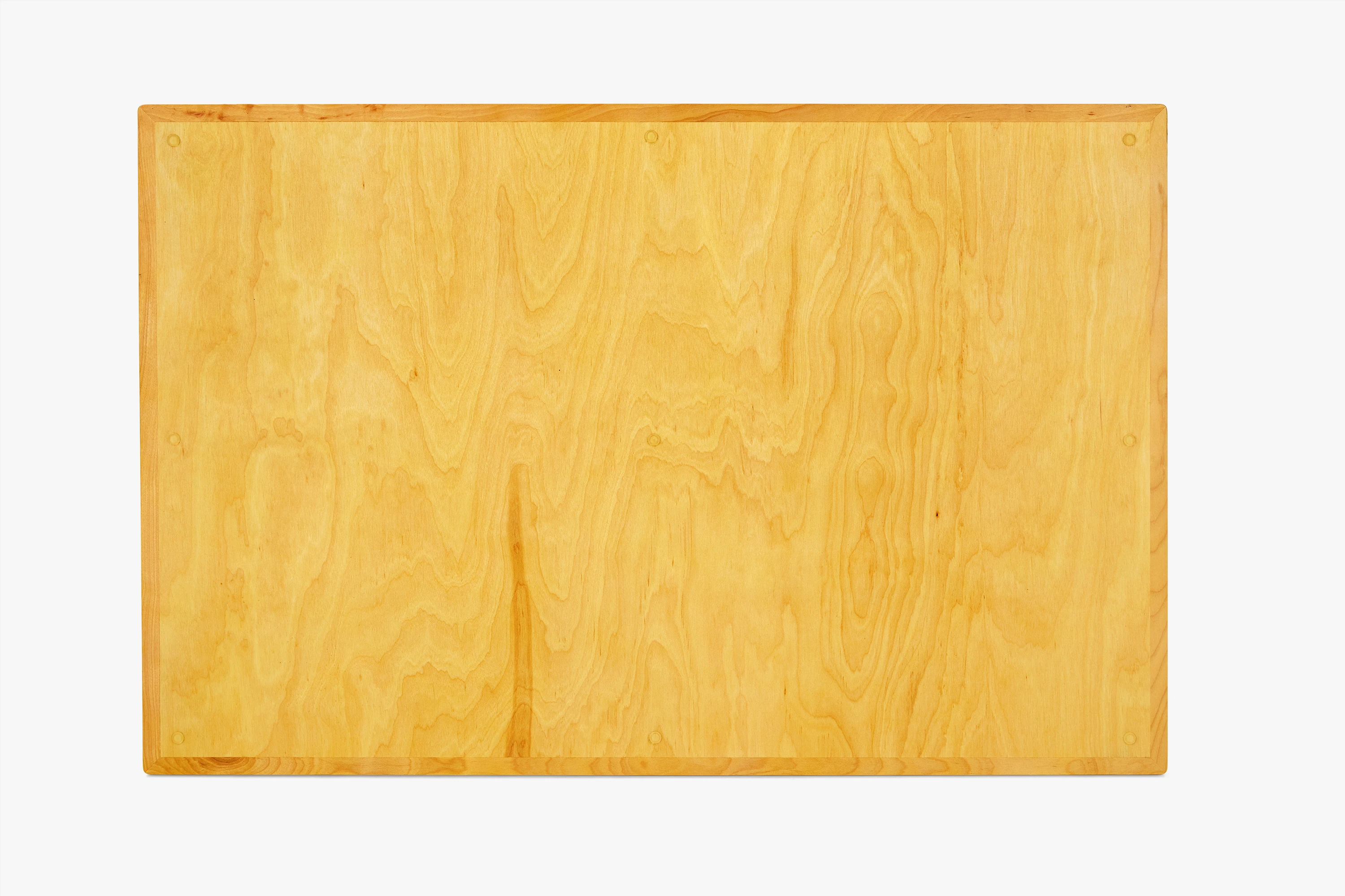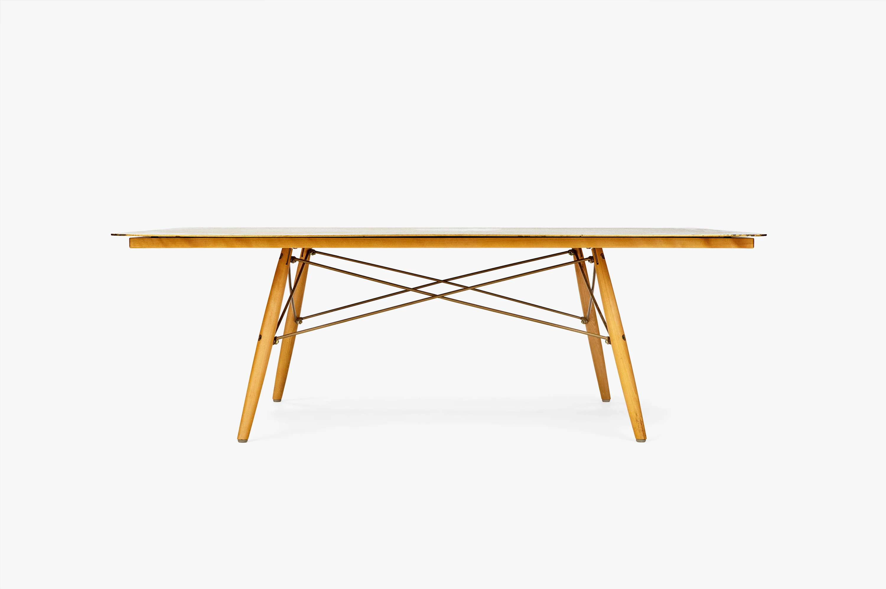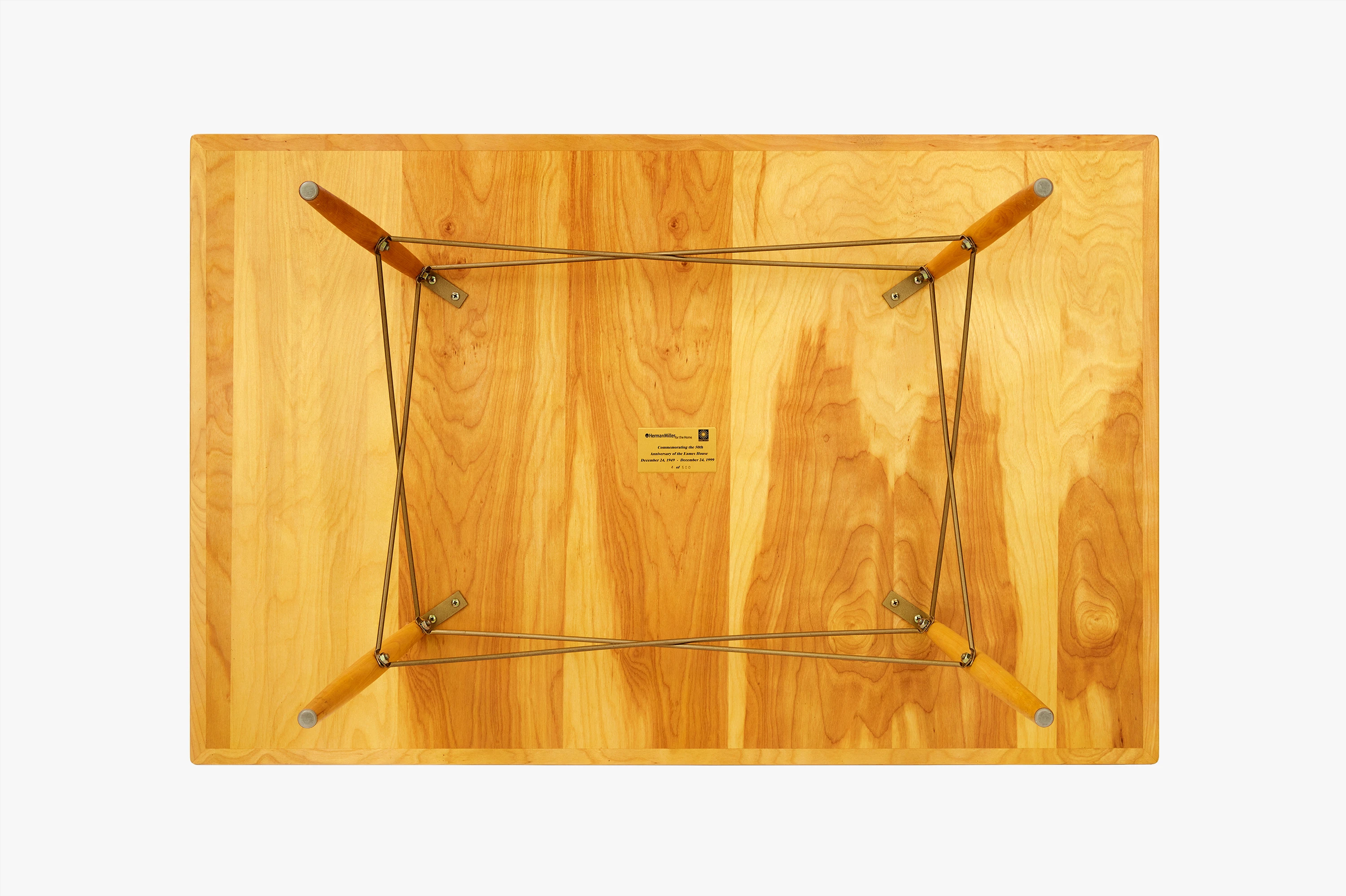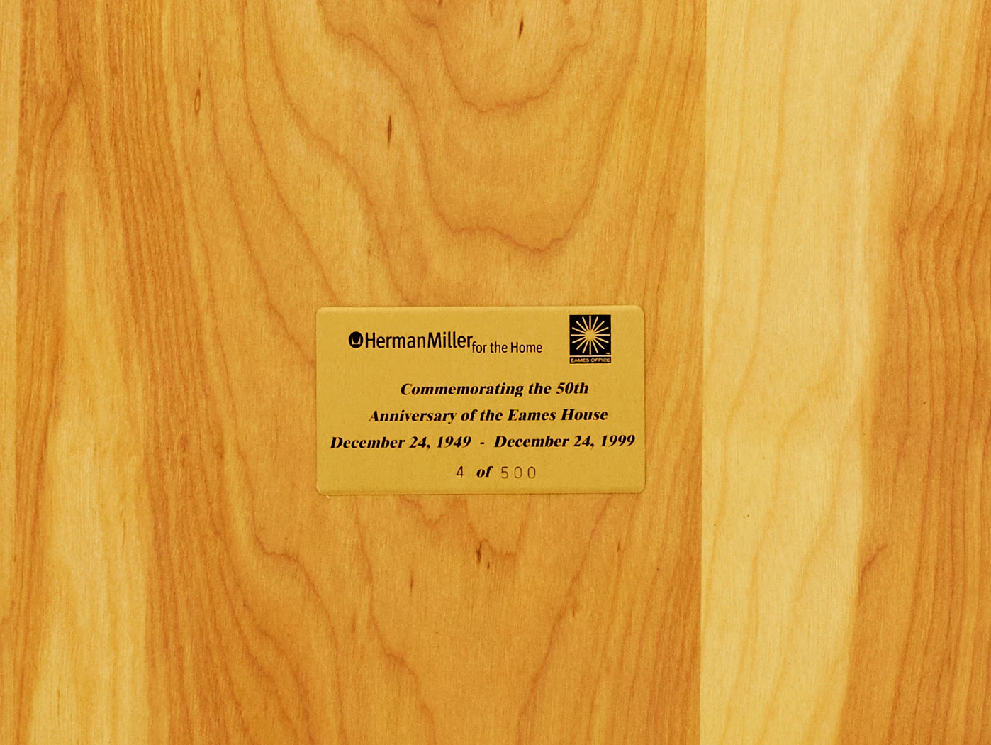 This table, based on the one that the Eameses designed for their own home, was introduced by Herman Miller in 1999 in honor of the 50th anniversary of the Eames House. Completed in 1949, the Eames House in Los Angeles’s Pacific Palisades neighborhood was designed by Ray and Charles as part of Arts & Architecture magazine’s Case Study House Program, which engaged leading architects to devise houses that used new building materials and construction technologies. Although the combination home-and-studio was constructed of commercially available, prefabricated steel parts, its interior was highly personalized. This table was based on one that the designers made for the upholstered, low-ceilinged alcove that created a cozy nook within an otherwise open living space. This table, like its predecessor, uses a wood-dowel-and-steel-rod base that supports a double-layered tabletop in which a wood layer is covered by a brass top finished with hand-applied gold leaf. The design, developed by the Eames Office in conjunction with Herman Miller, was released in a limited edition of 500, with the proceeds supporting the Eames Foundation.