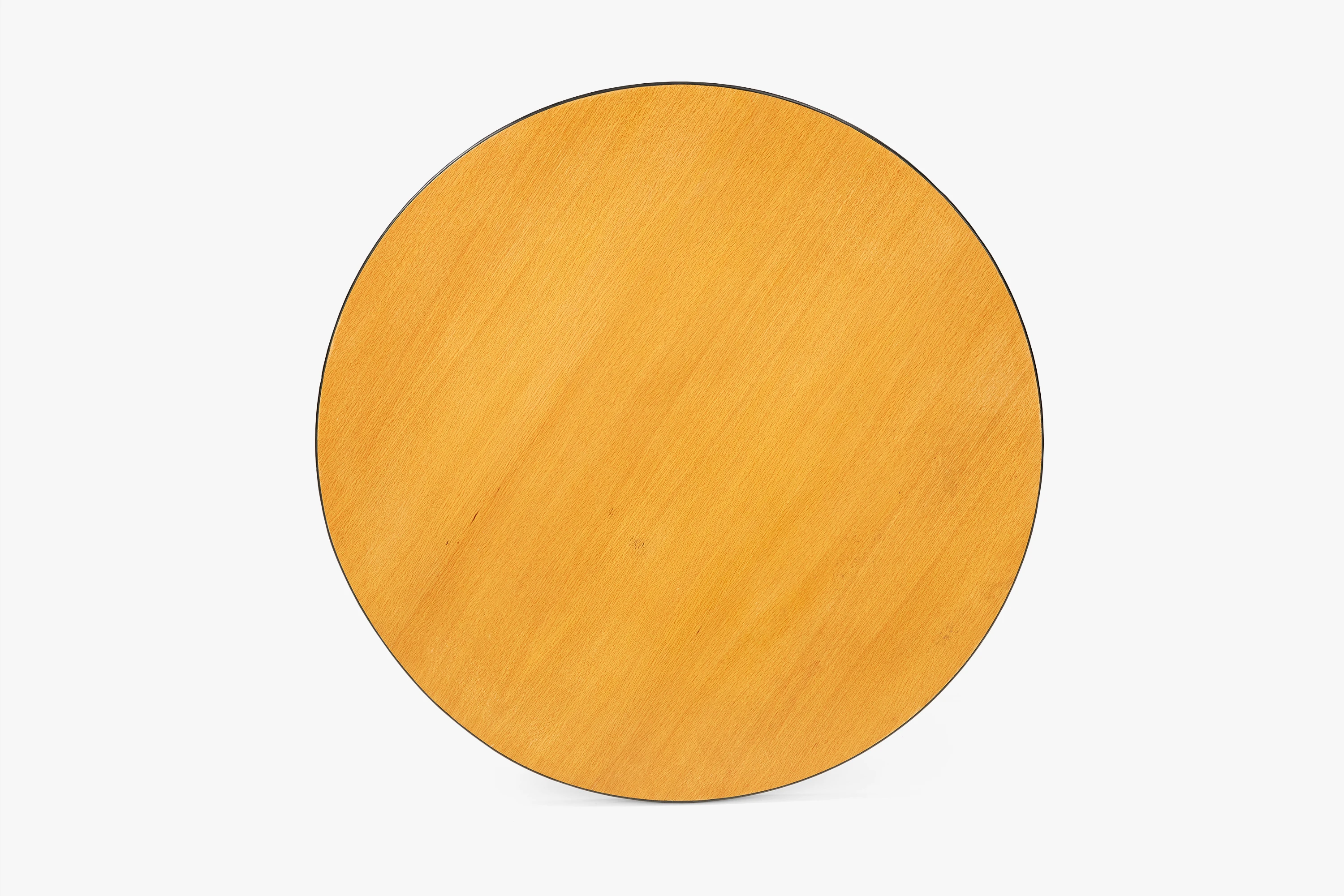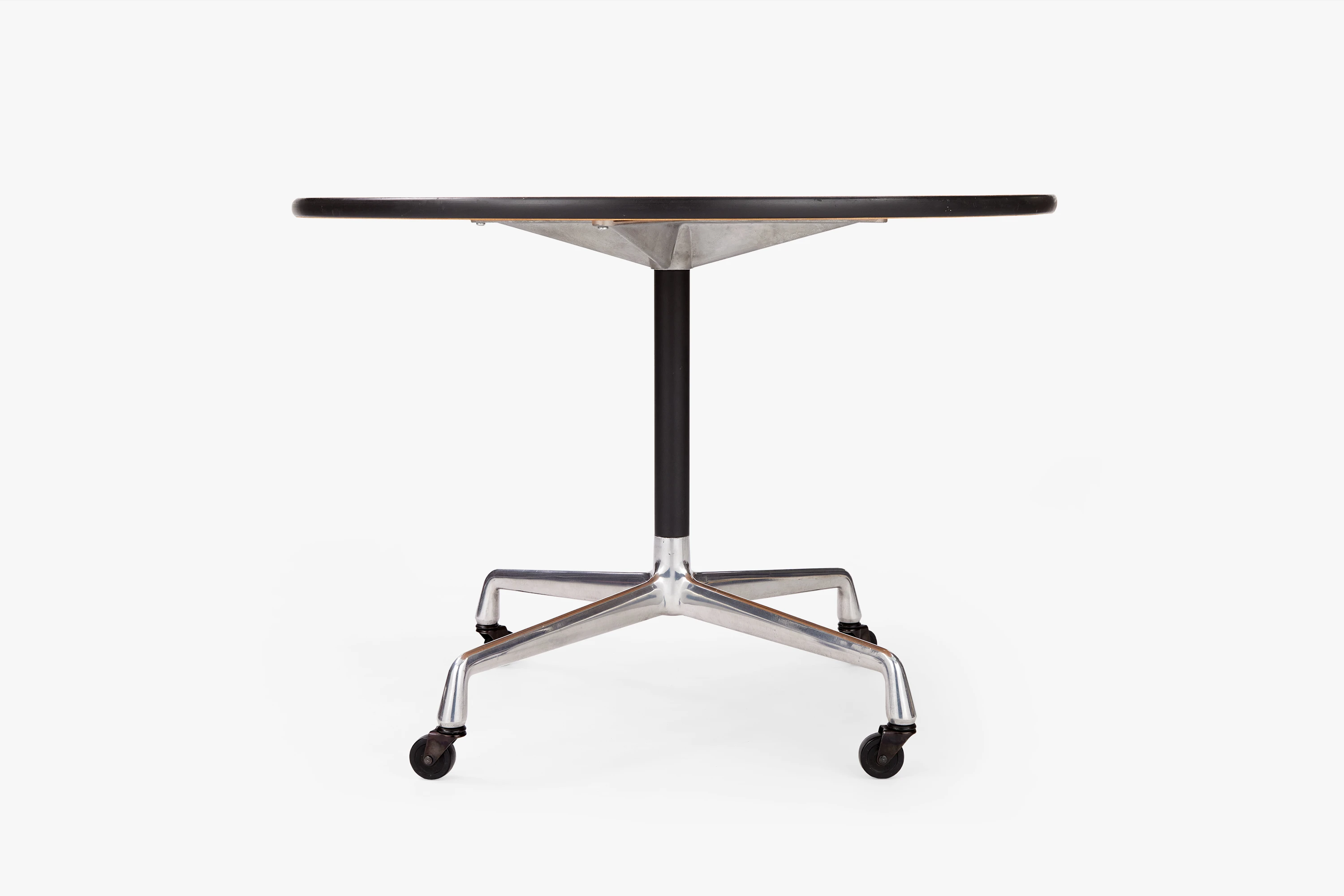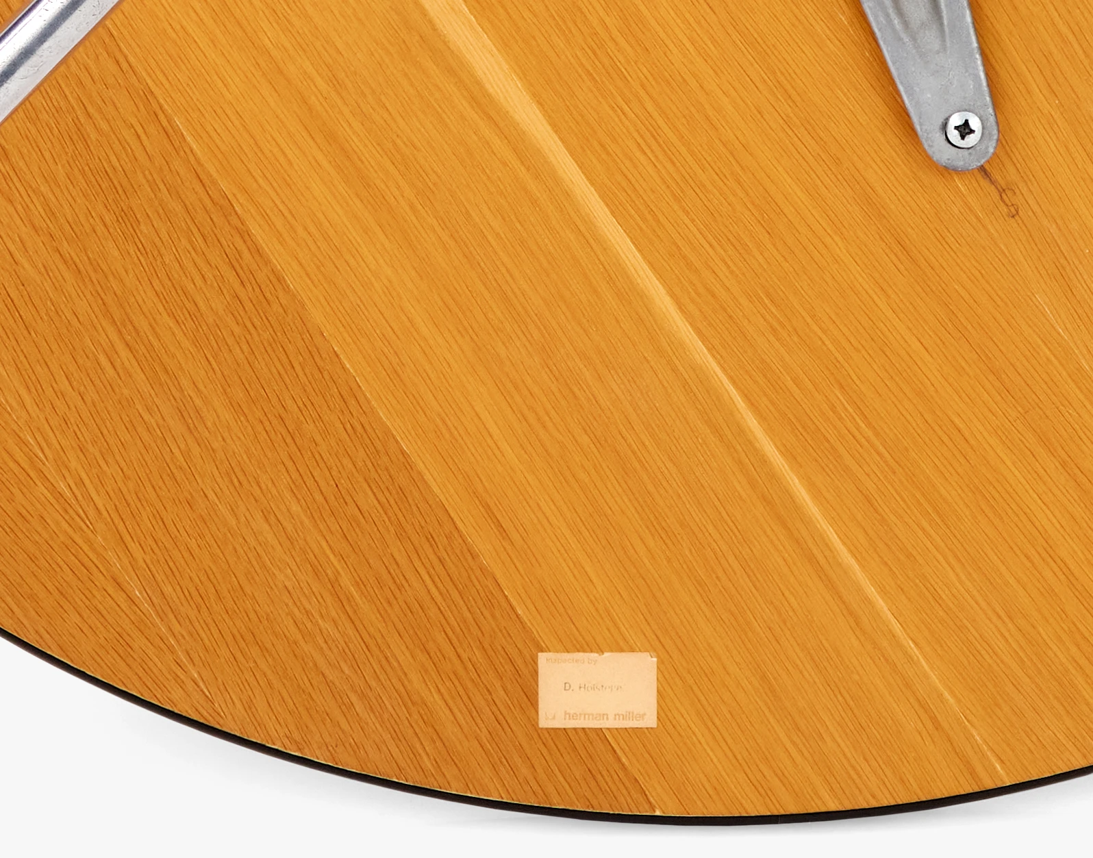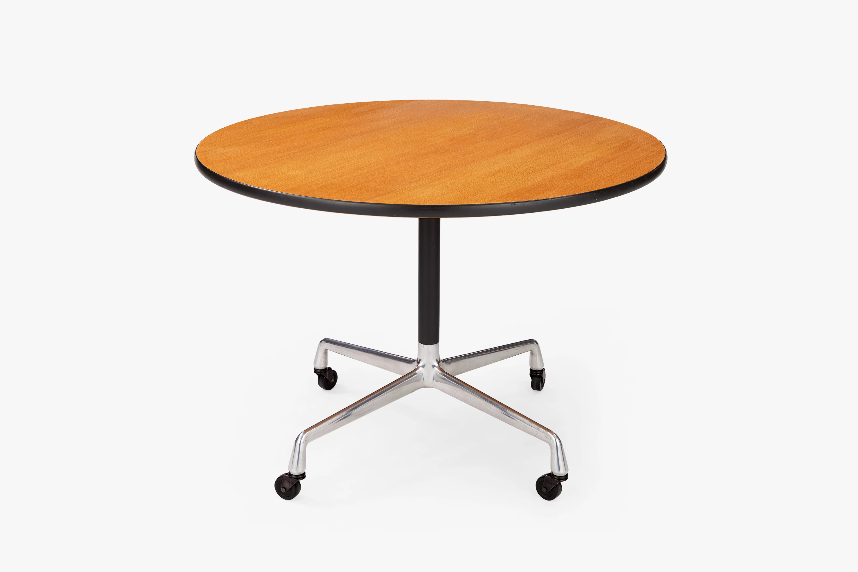 Manufactured in 1974, this rolling table finished in red oak veneer, was originally purchased for use in a corporate executive’s home office in Connecticut, where it was accompanied by several other pieces of Herman Miller furniture, including a customized example of Action Office 2—the modular office system designed by Robert Propst that served as a forerunner of the office cubicle. During this period, Herman Miller’s business had shifted almost exclusively to the contract market. Eames tables of the period reflected this shift, from designs that could be employed in large-scale conference rooms, to small tables like this one that could be employed for less formal meetings or house specialized equipment. The addition of wheels and casters to many of the smaller Eames tables aligned with Propst’s philosophy of a more easily reconfigurable and adaptable workplace.
