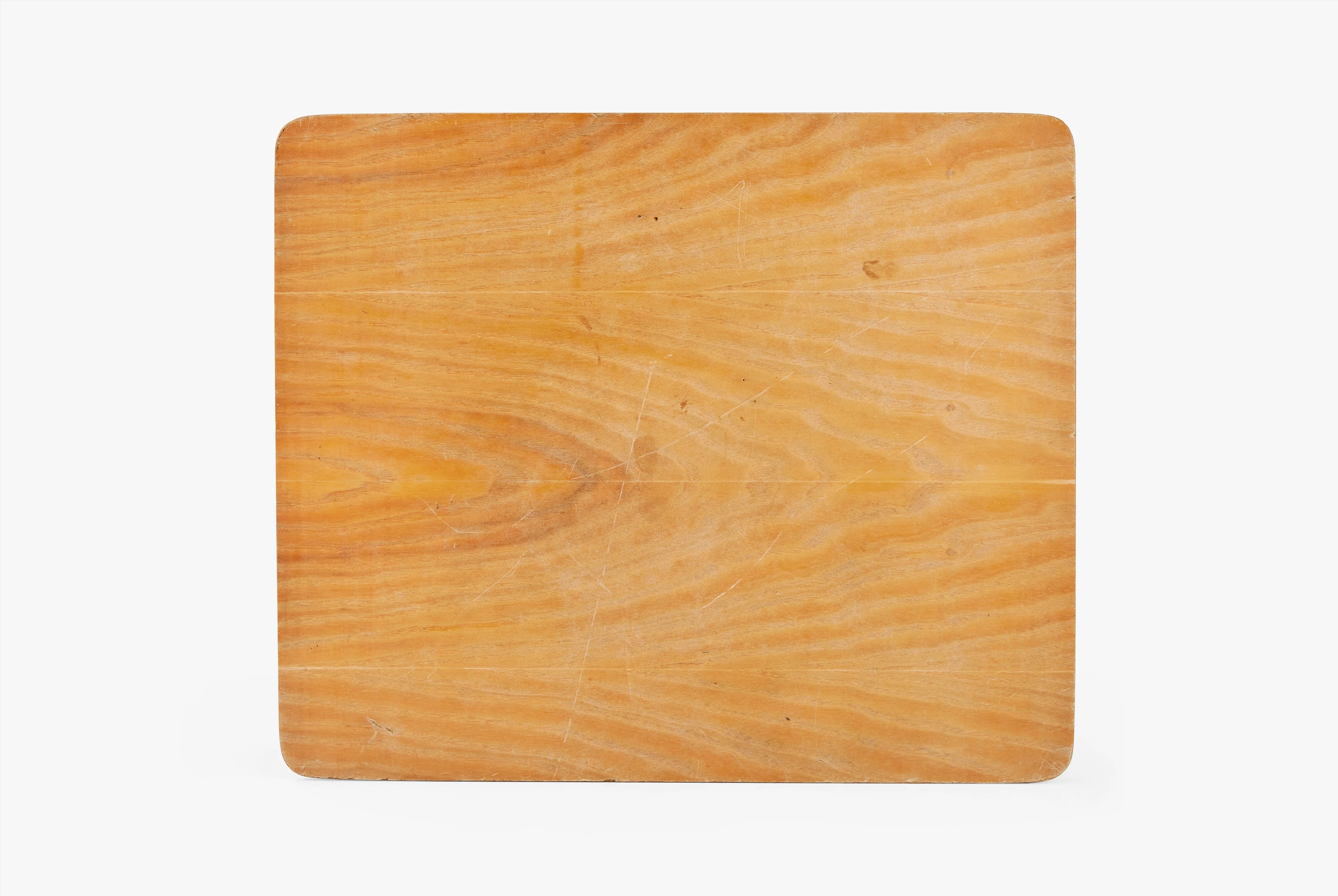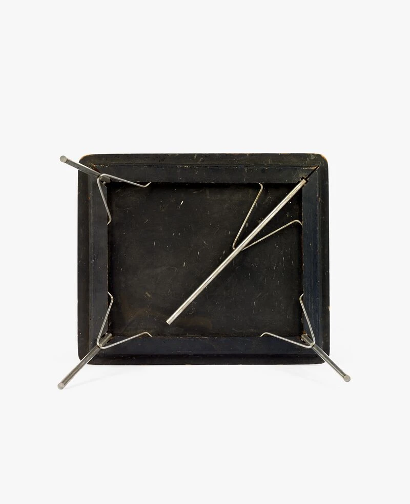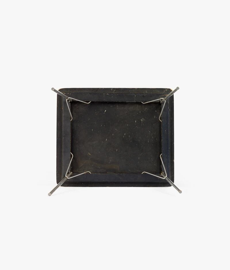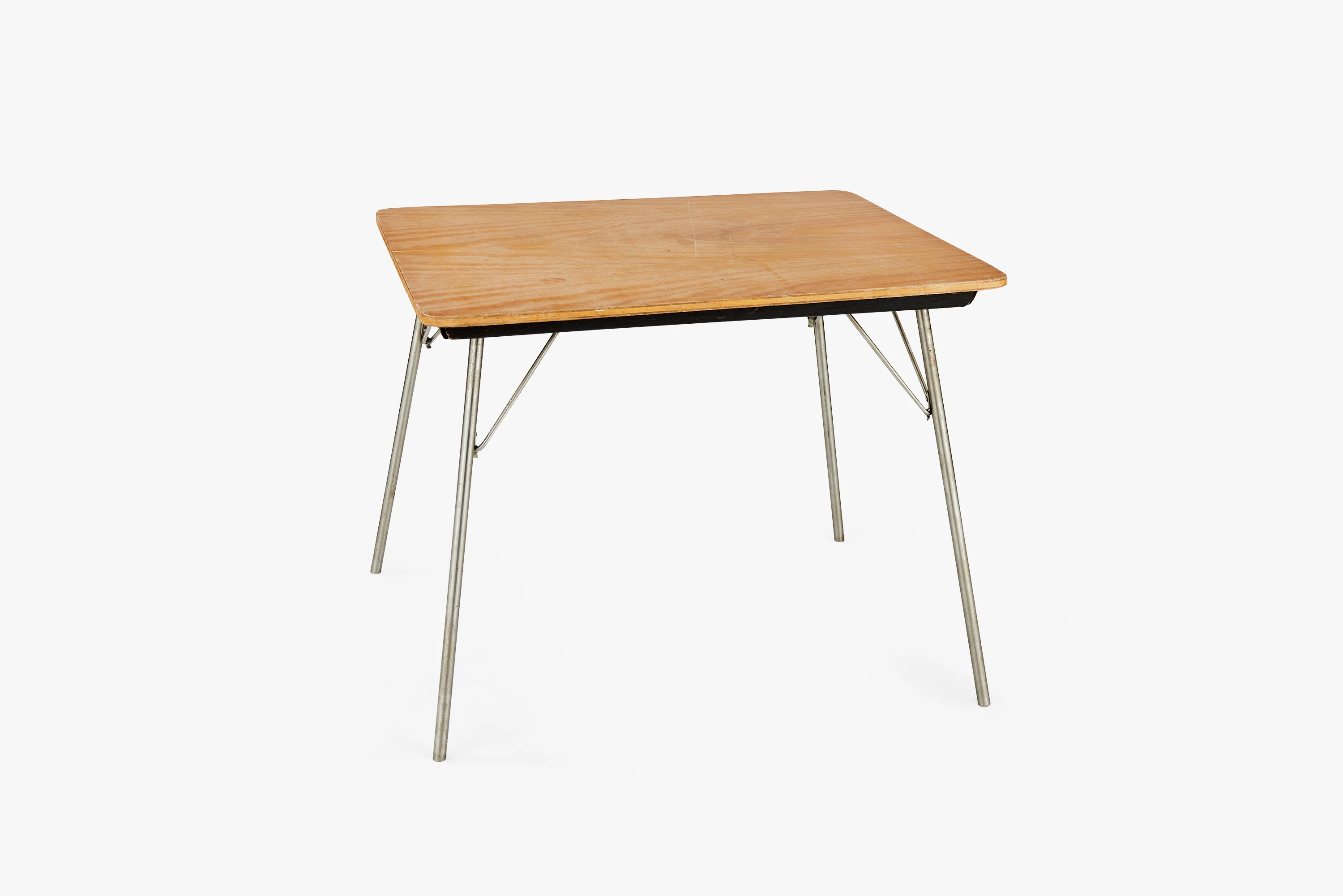 Produced from 1947 until 1957, this small table was described as a “miniature” in early Herman Miller catalogs. The official designation “IT” stood for “incidental table,” and it was marketed to serve a variety of as-needed uses: coffee table, side table, or even a play table for small children. The Eameses conceived of this kind of versatility as a means of engaging users, encouraging them to imaginatively determine how and where to put the table to use. This aspect of the design was enabled by the table’s light weight and folding leg construction, both of which made it easy to relocate and repurpose. The simple, bent metal hooks that hold the legs in place when extended were also used, at a slightly larger scale, for the DTM series of dining tables. Originally produced with wood tops, as seen in this example, the design was later issued in white or black Micarta, a composite material of plastic and fiber that made for easy cleaning.