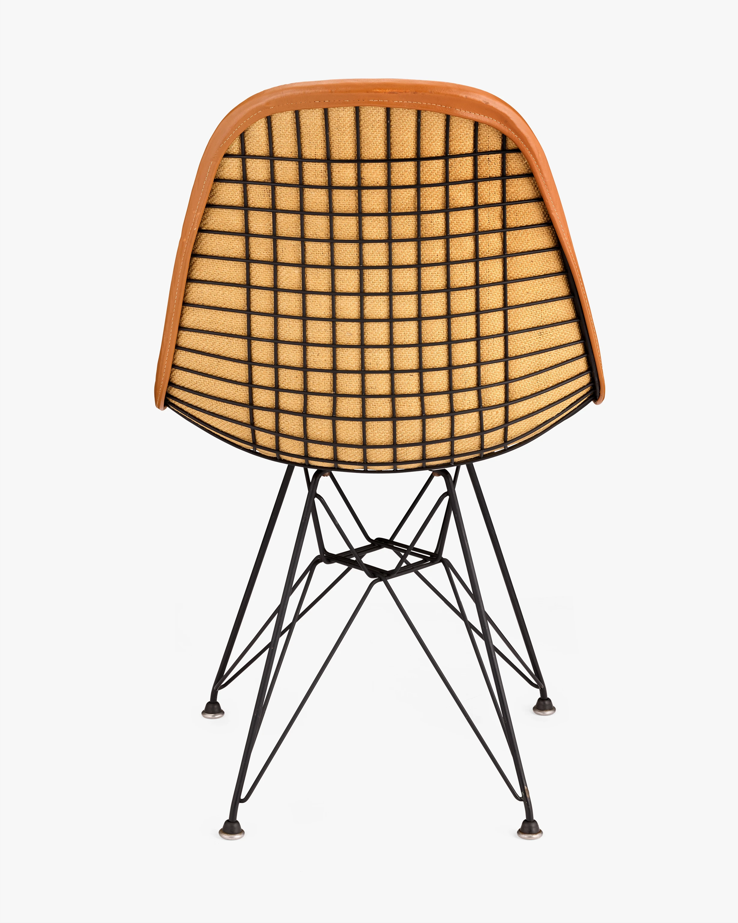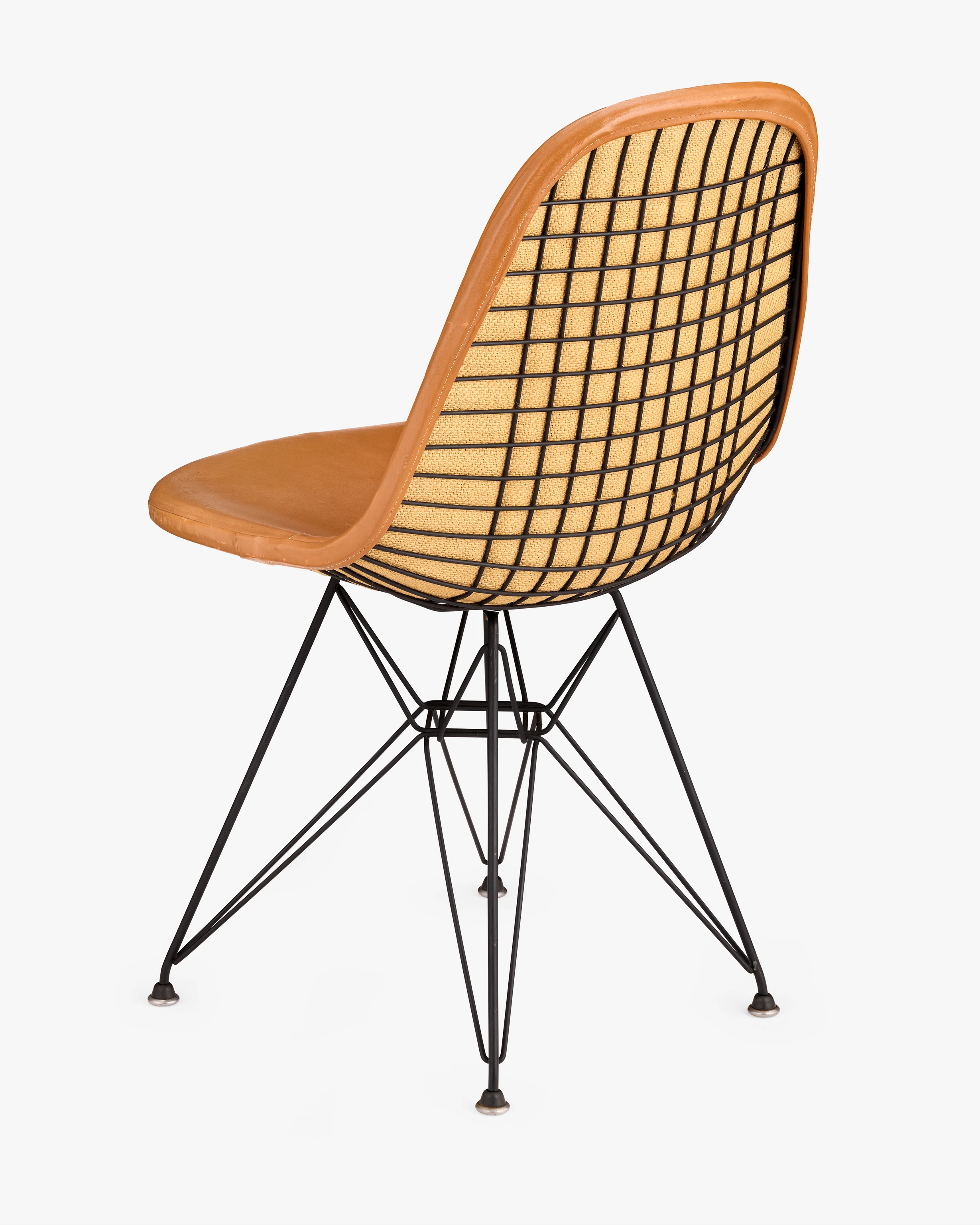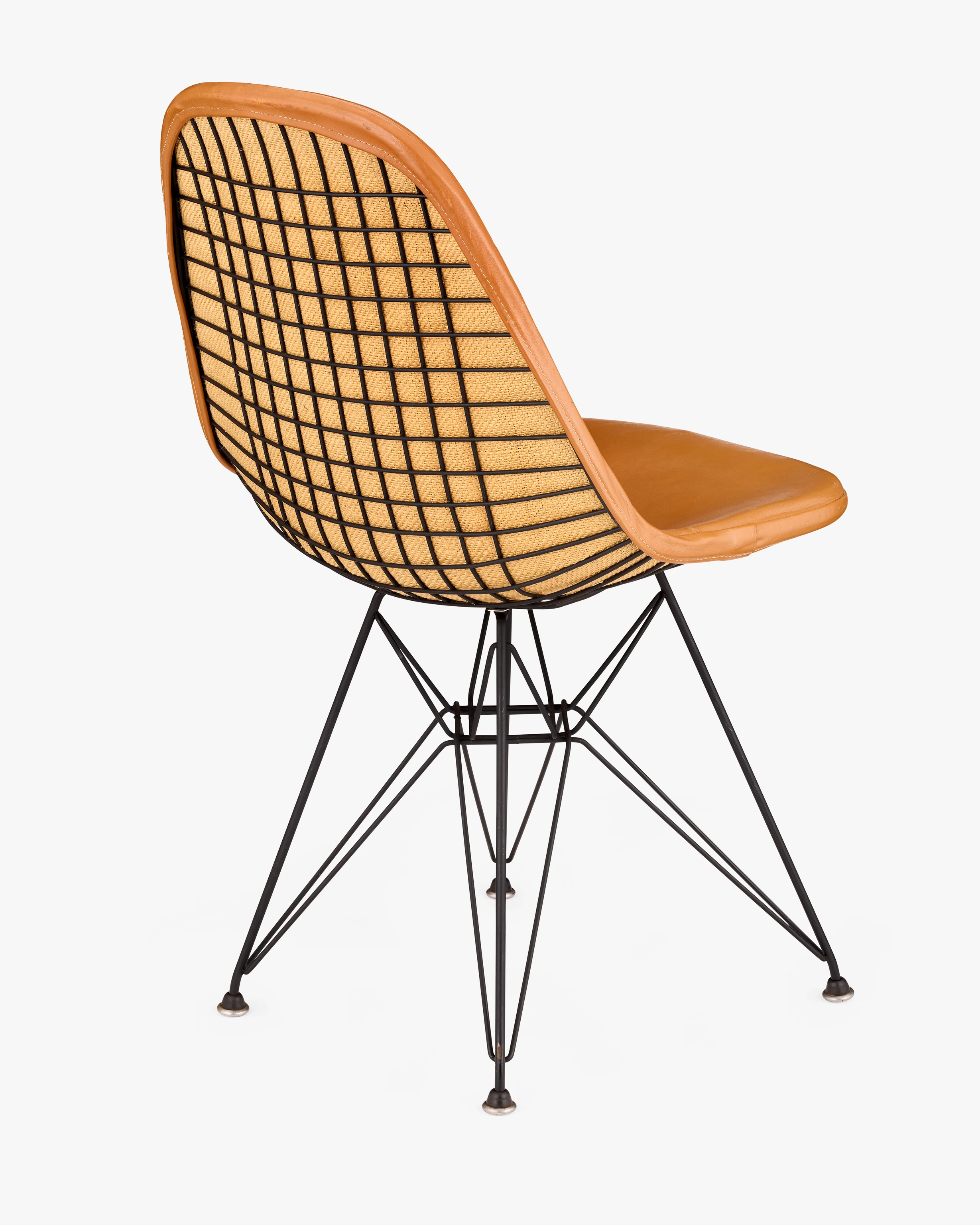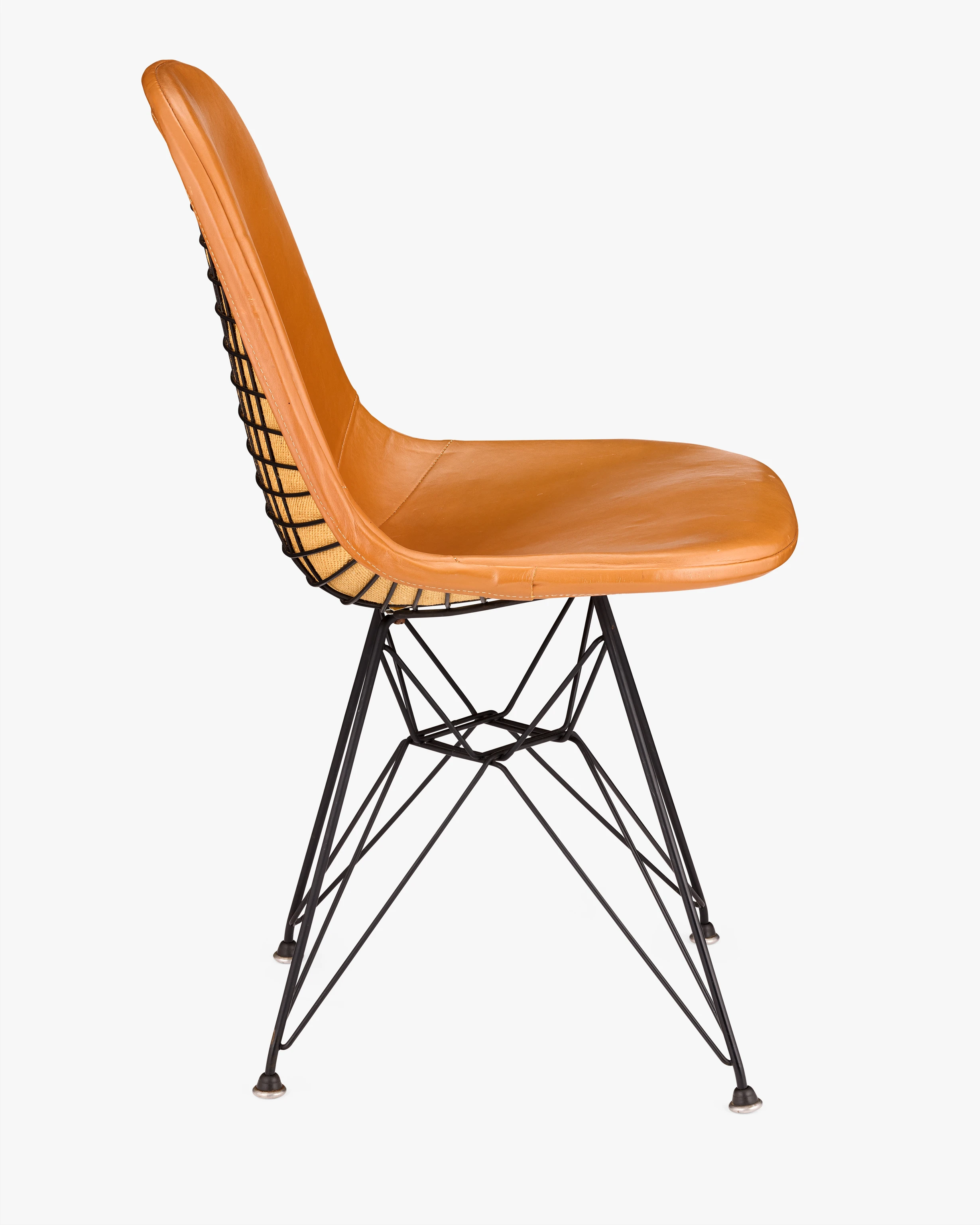 For the first few years of production, the upholstered wire chairs had two options: the “Postman’s Bag Tan Leather” or a lovely black/brown and white crosscheck upholstery, both selections curated by Ray and Charles. DKR-1 stands for Dining (height) K-wire (chair) Rod (base) 1 (1-piece upholstered pad).