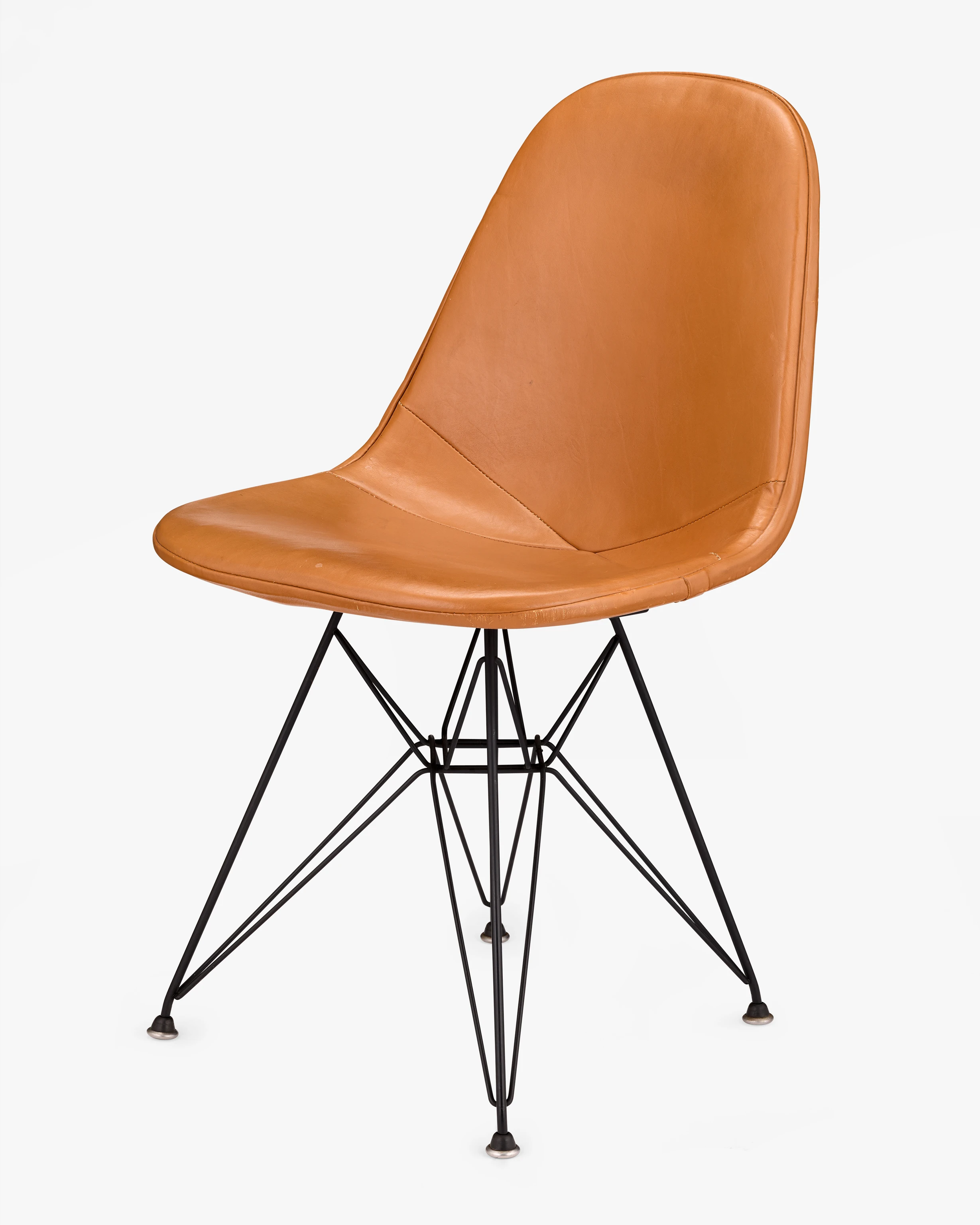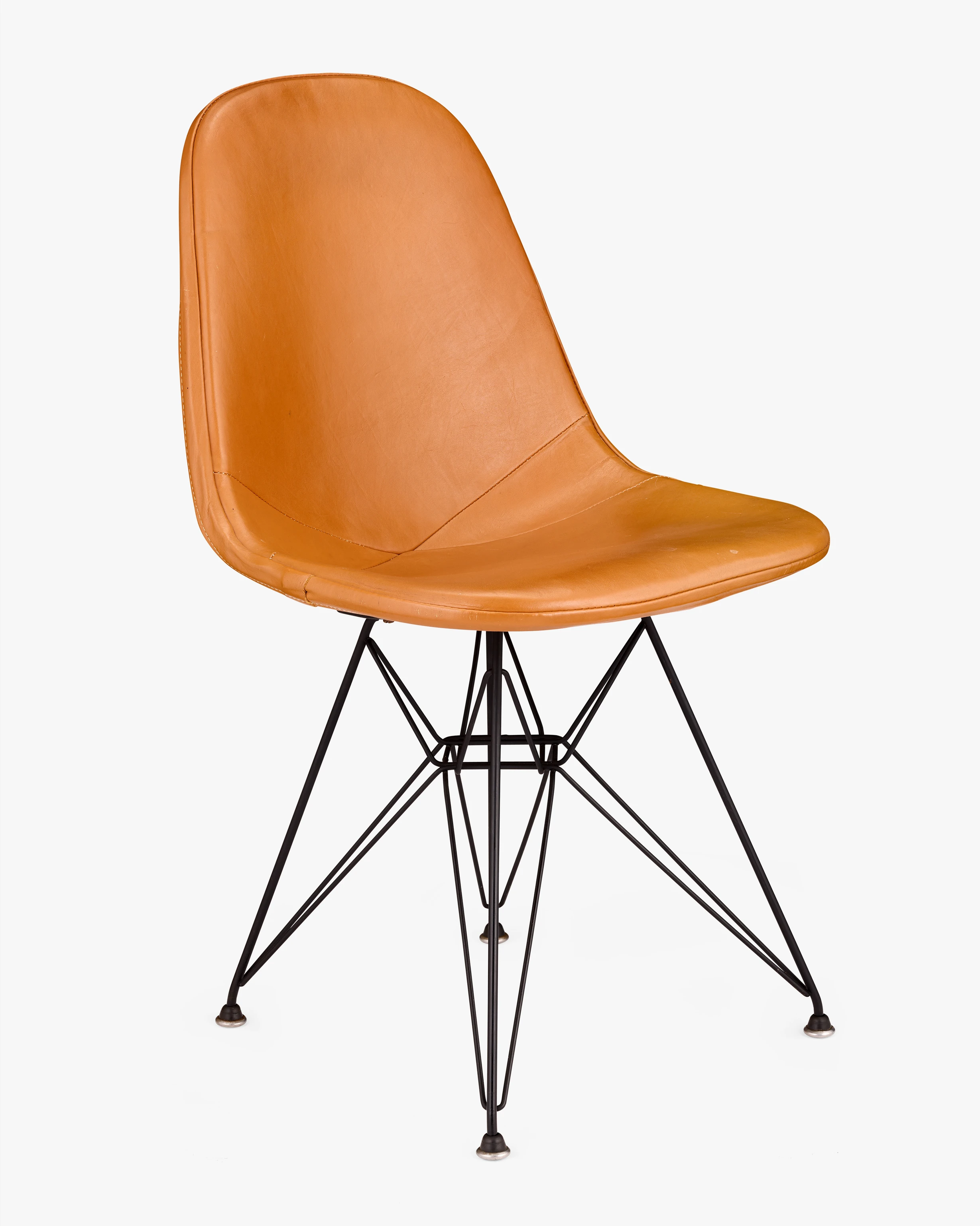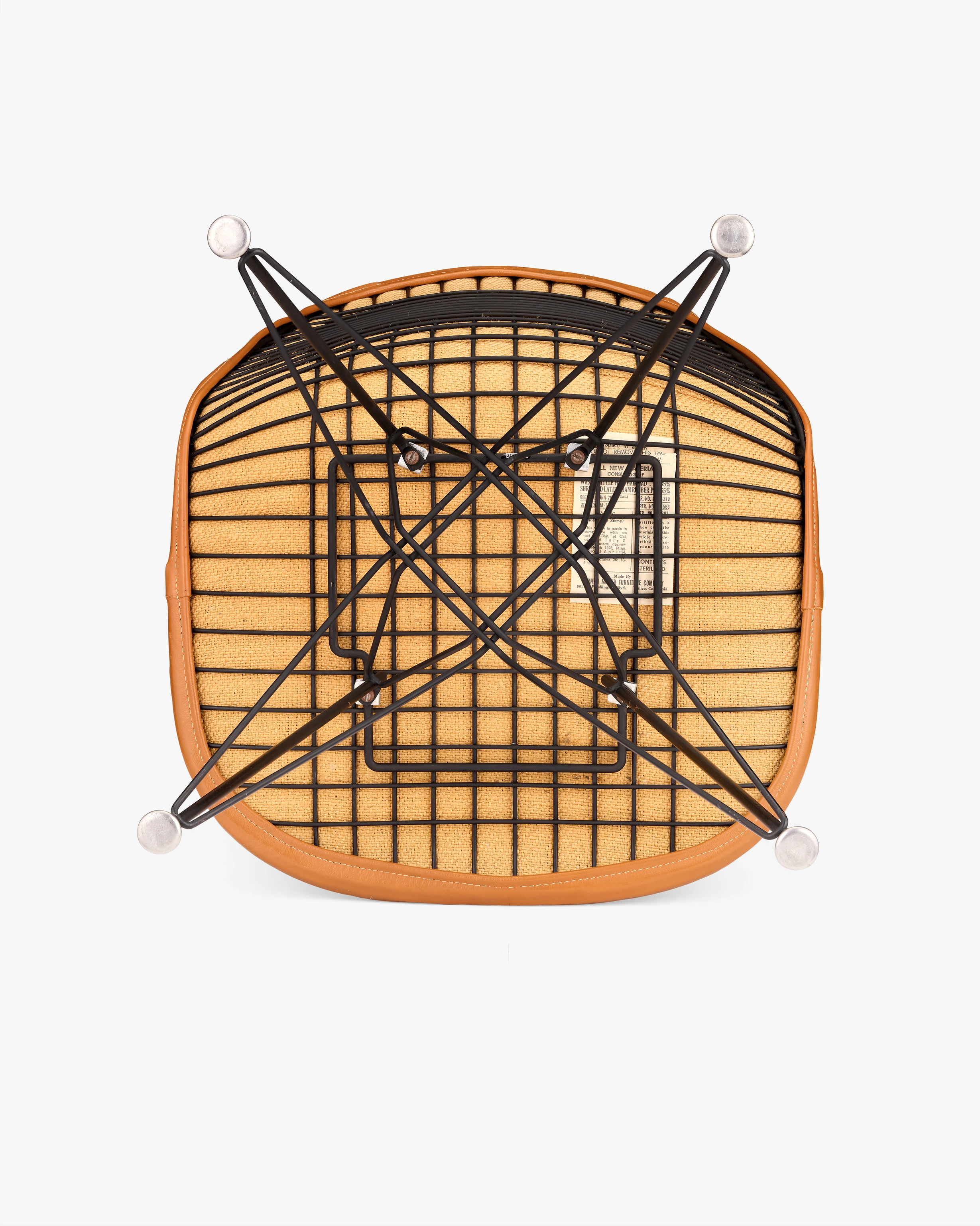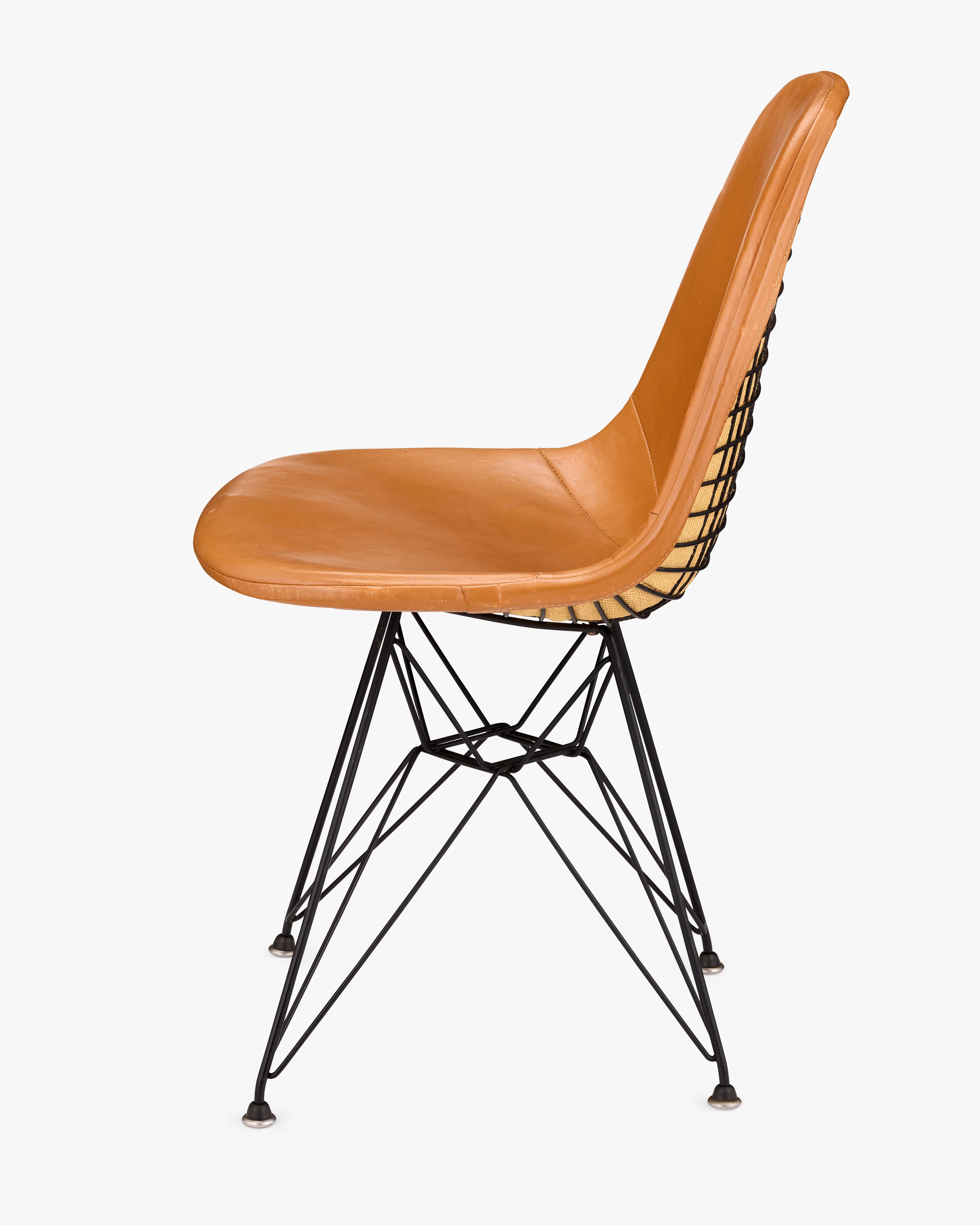 For the first few years of production, the upholstered wire chairs had two options: the “Postman’s Bag Tan Leather” or a lovely black/brown and white crosscheck upholstery, both selections curated by Ray and Charles. DKR-1 stands for Dining (height) K-wire (chair) Rod (base) 1 (1-piece upholstered pad).
