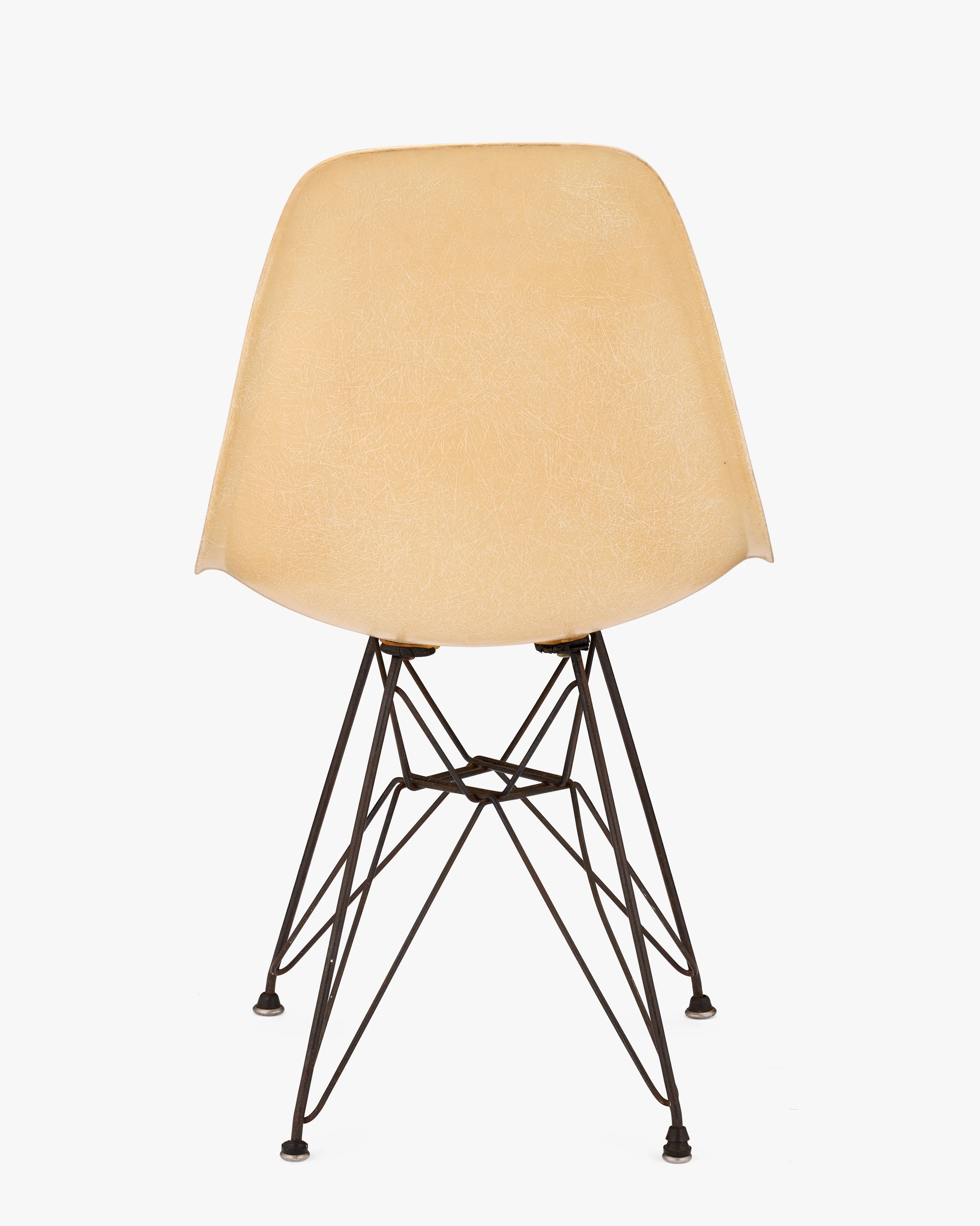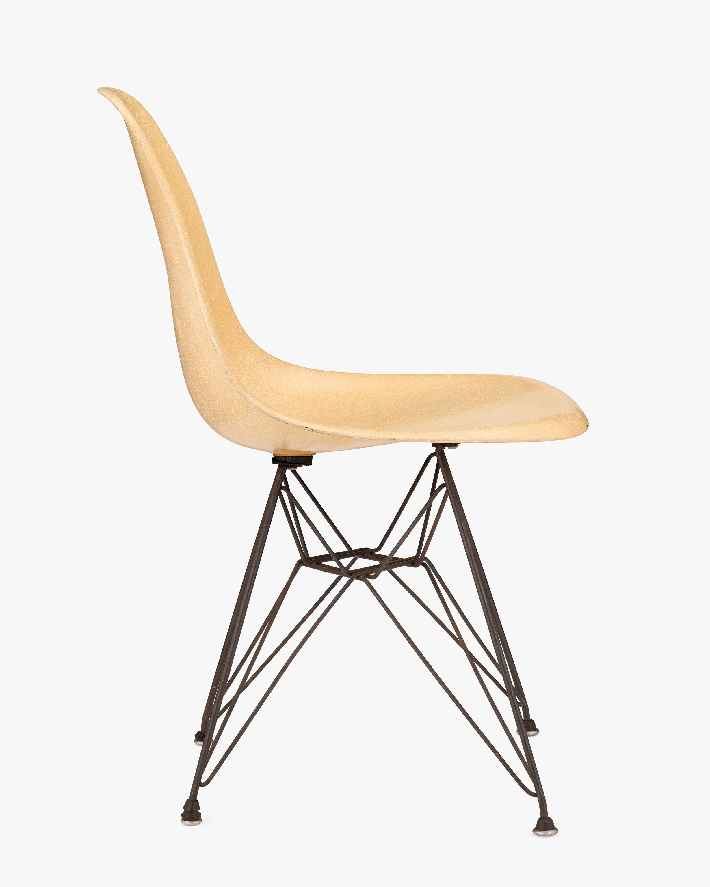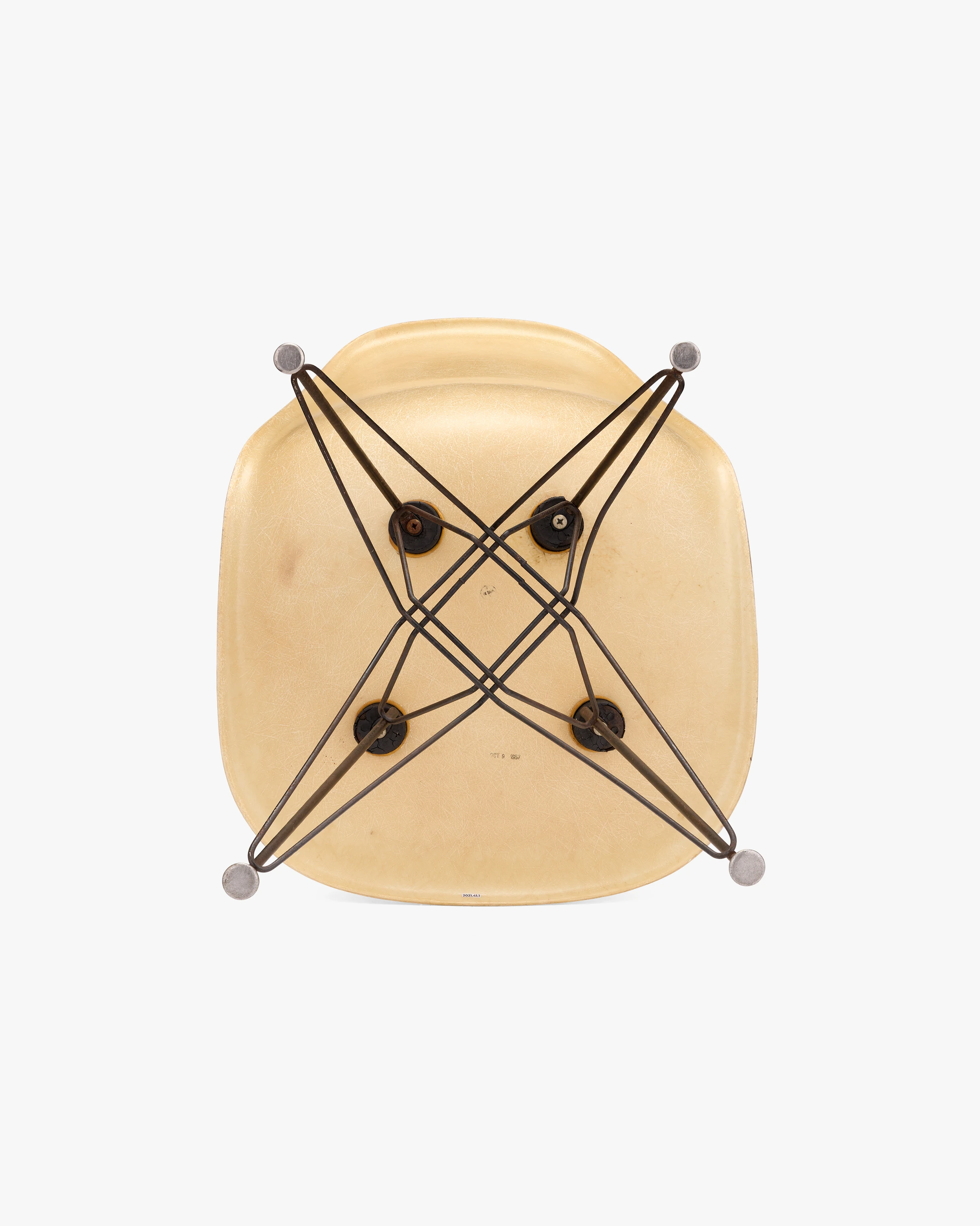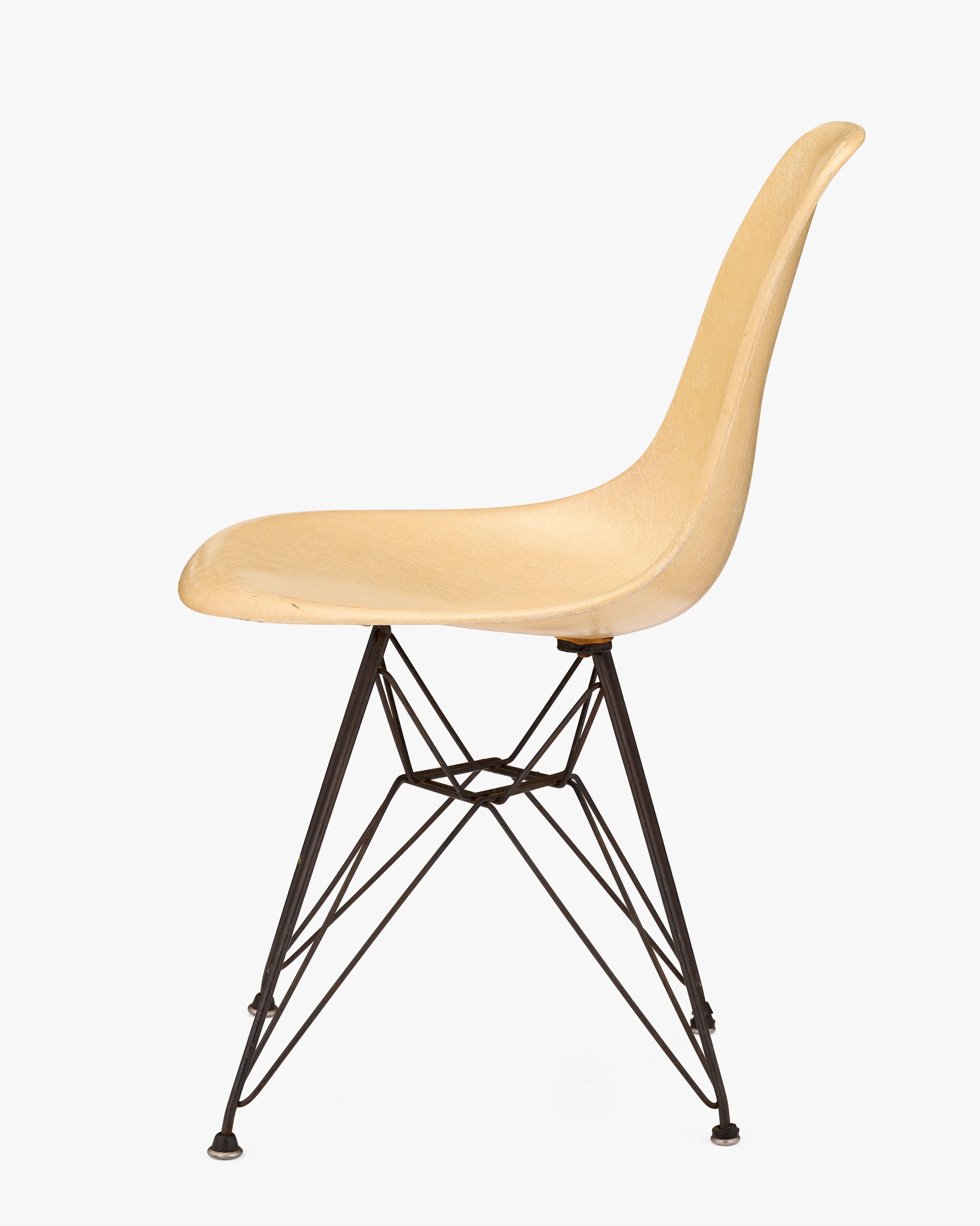 This example of an early Side Shell on its base is remarkably undamaged. The early Side Shells were thin and prone to cracking along the edges where the back extends from the seat. This example is so thin that the back can easily be flexed with just the soft touch of a hand. The DSR base was also the lightest base at the time, making this chair nine pounds—two pounds lighter than Side Shells on the other four-legged bases. The naming convention for the chairs breaks down very simply as three letters to indicate the height (dining, medium), the chair (side, wire), and the base (X for four-legged, S for stacking, and C for cast aluminum). DSR stands for Dining (height) Side (chair) Rod (base).