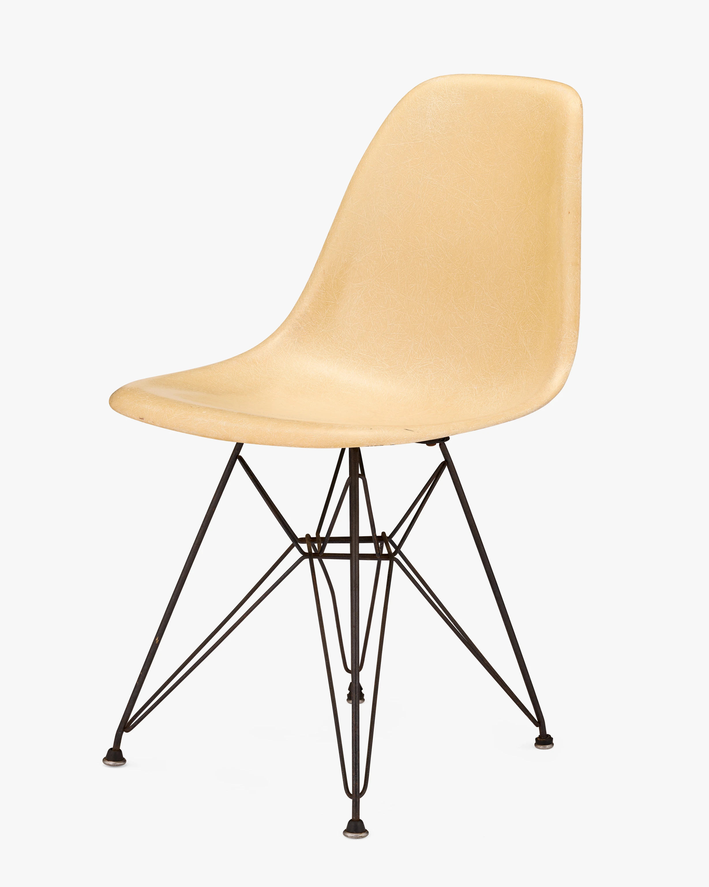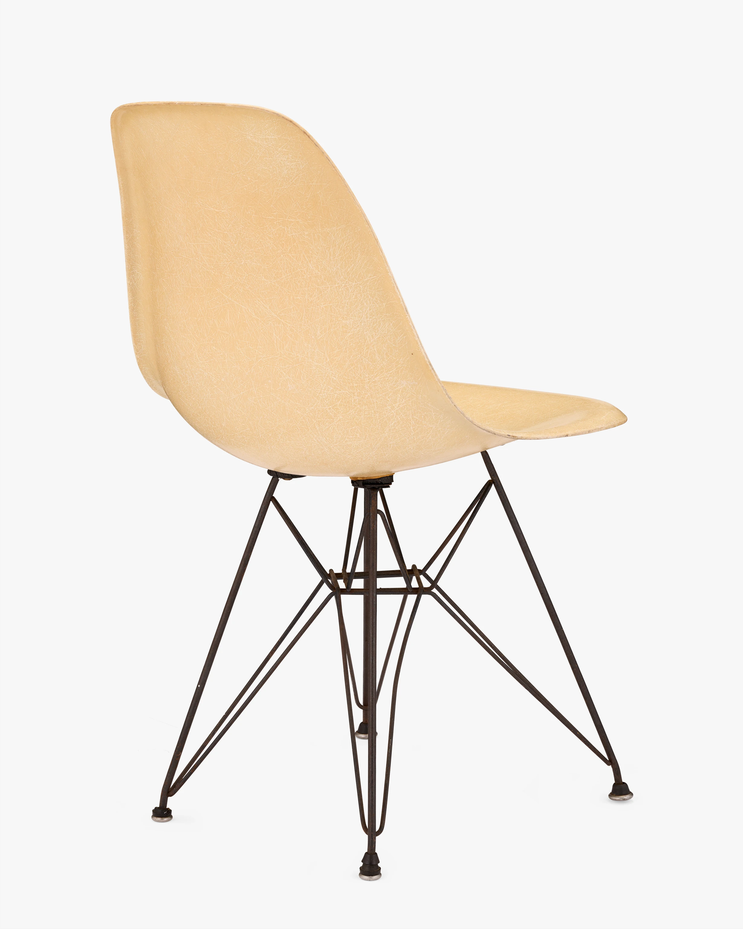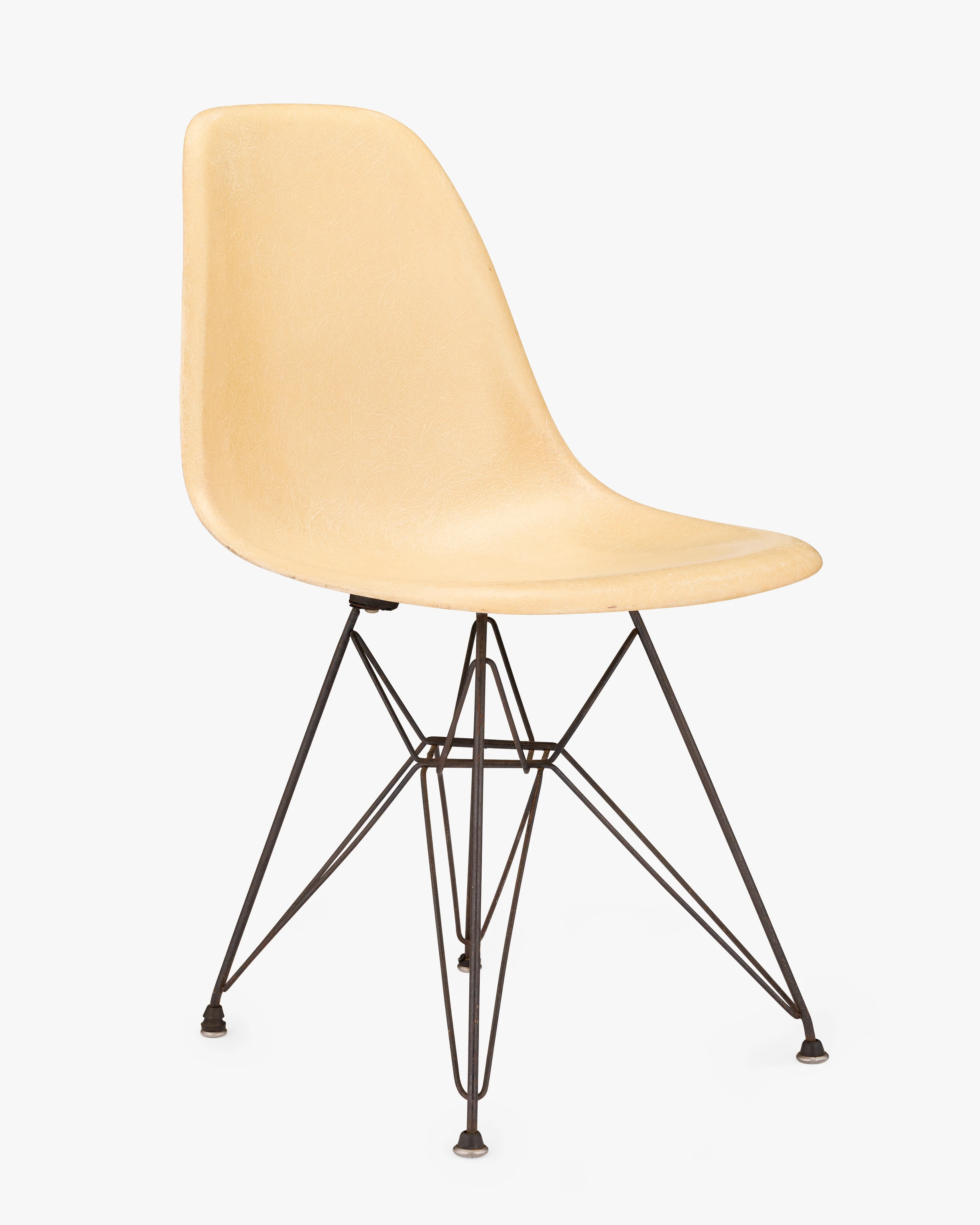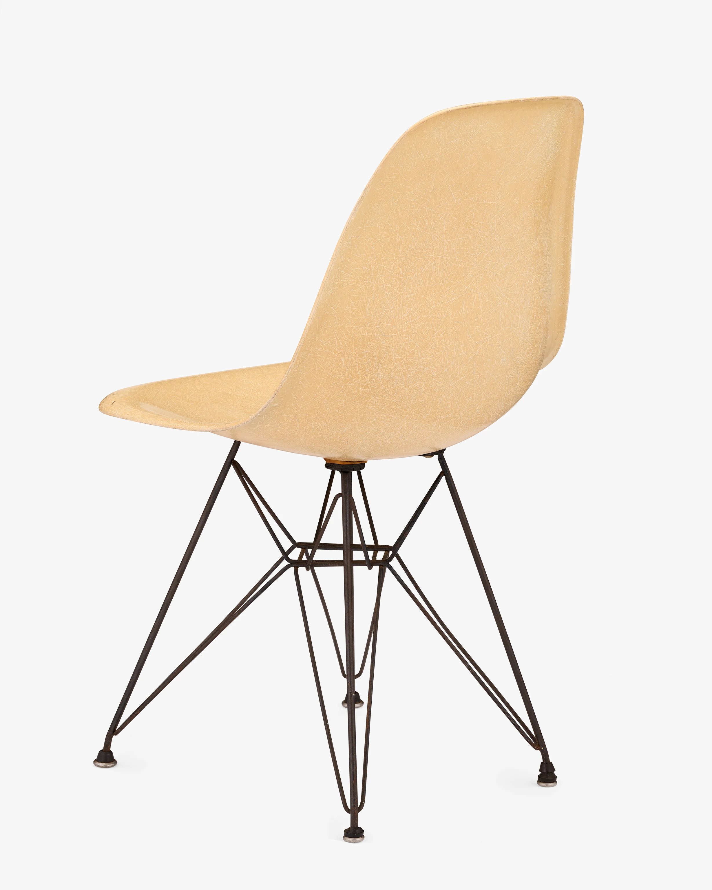 This example of an early Side Shell on its base is remarkably undamaged. The early Side Shells were thin and prone to cracking along the edges where the back extends from the seat. This example is so thin that the back can easily be flexed with just the soft touch of a hand. The DSR base was also the lightest base at the time, making this chair nine pounds—two pounds lighter than Side Shells on the other four-legged bases. The naming convention for the chairs breaks down very simply as three letters to indicate the height (dining, medium), the chair (side, wire), and the base (X for four-legged, S for stacking, and C for cast aluminum). DSR stands for Dining (height) Side (chair) Rod (base).