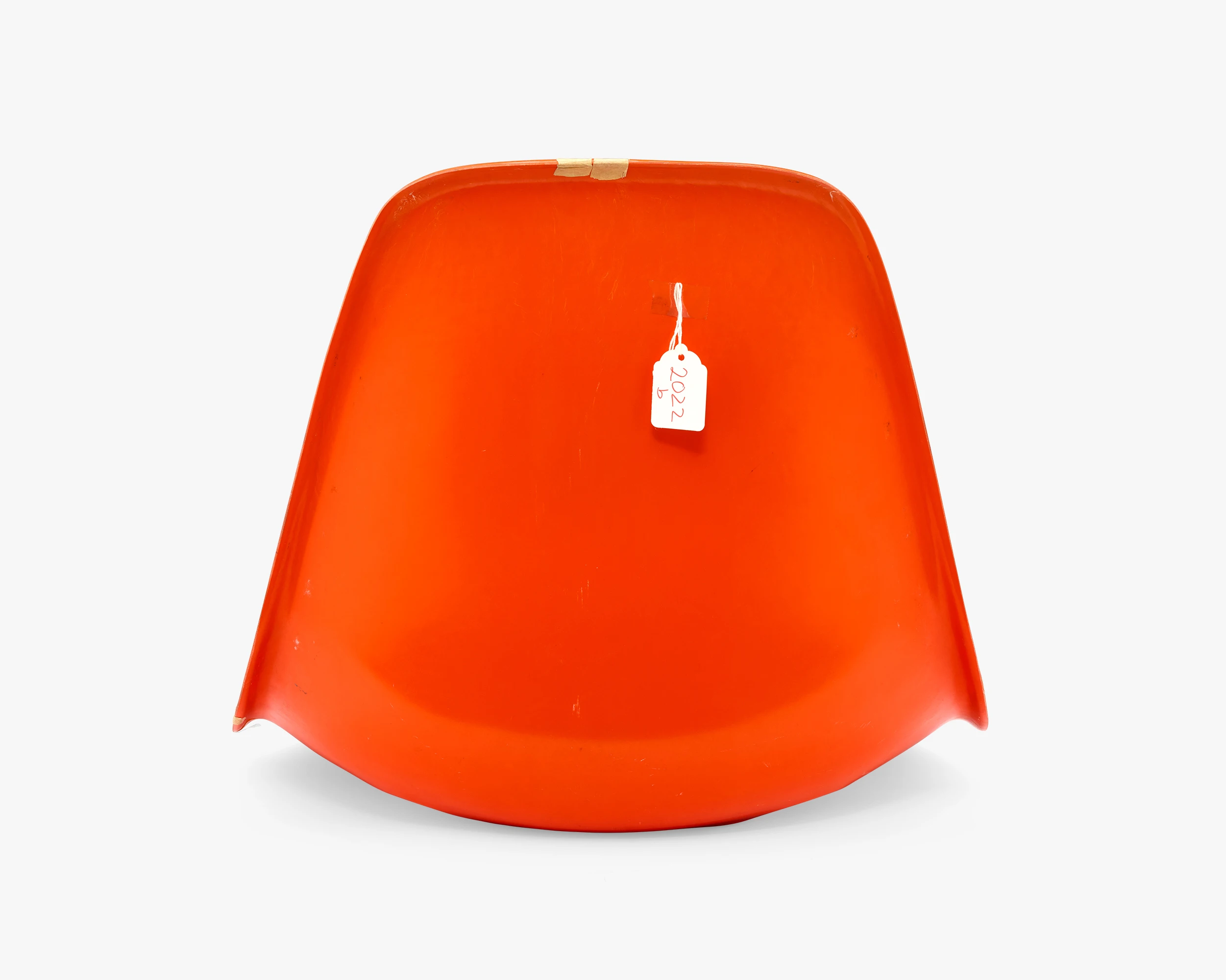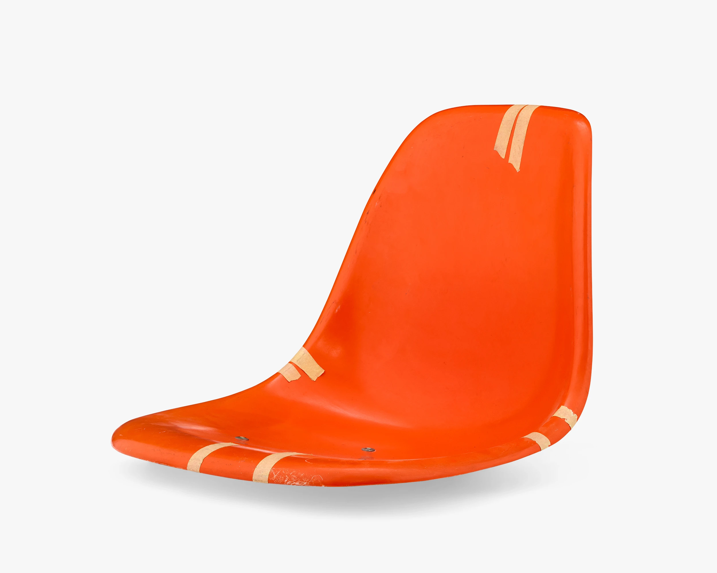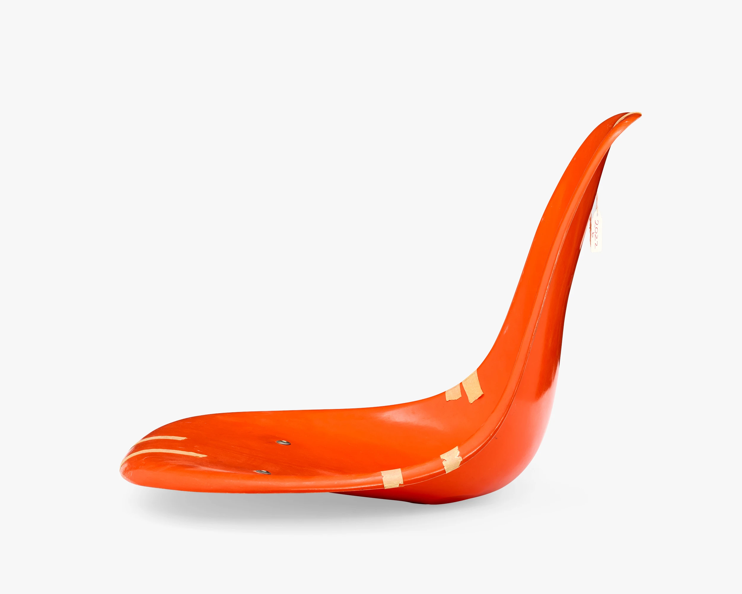The collection has several color-test samples from different fiberglass manufacturers. This test sample for the color Crimson reveals threaded screw holes and masking tape, suggesting this shell was used for prototyping a new idea.