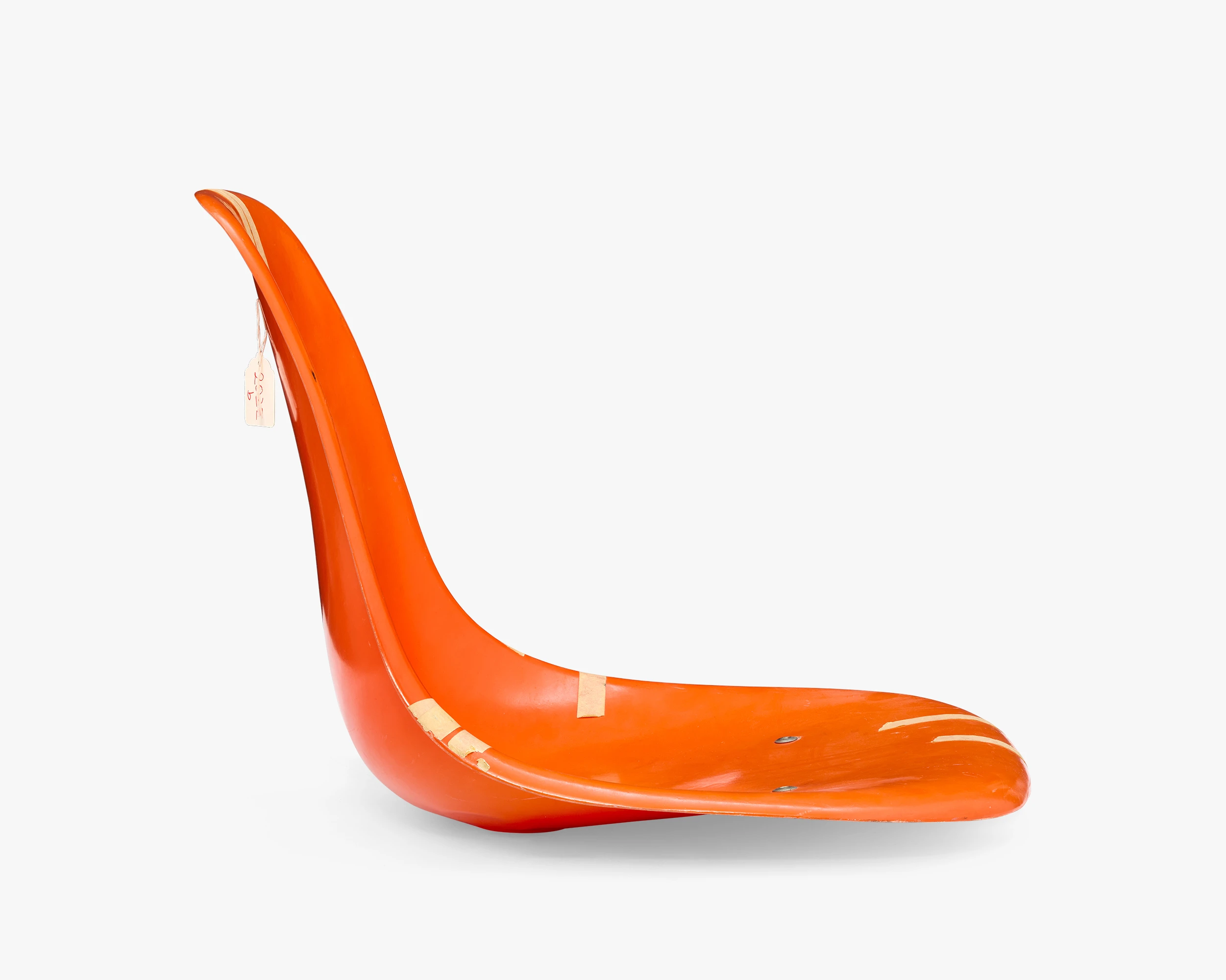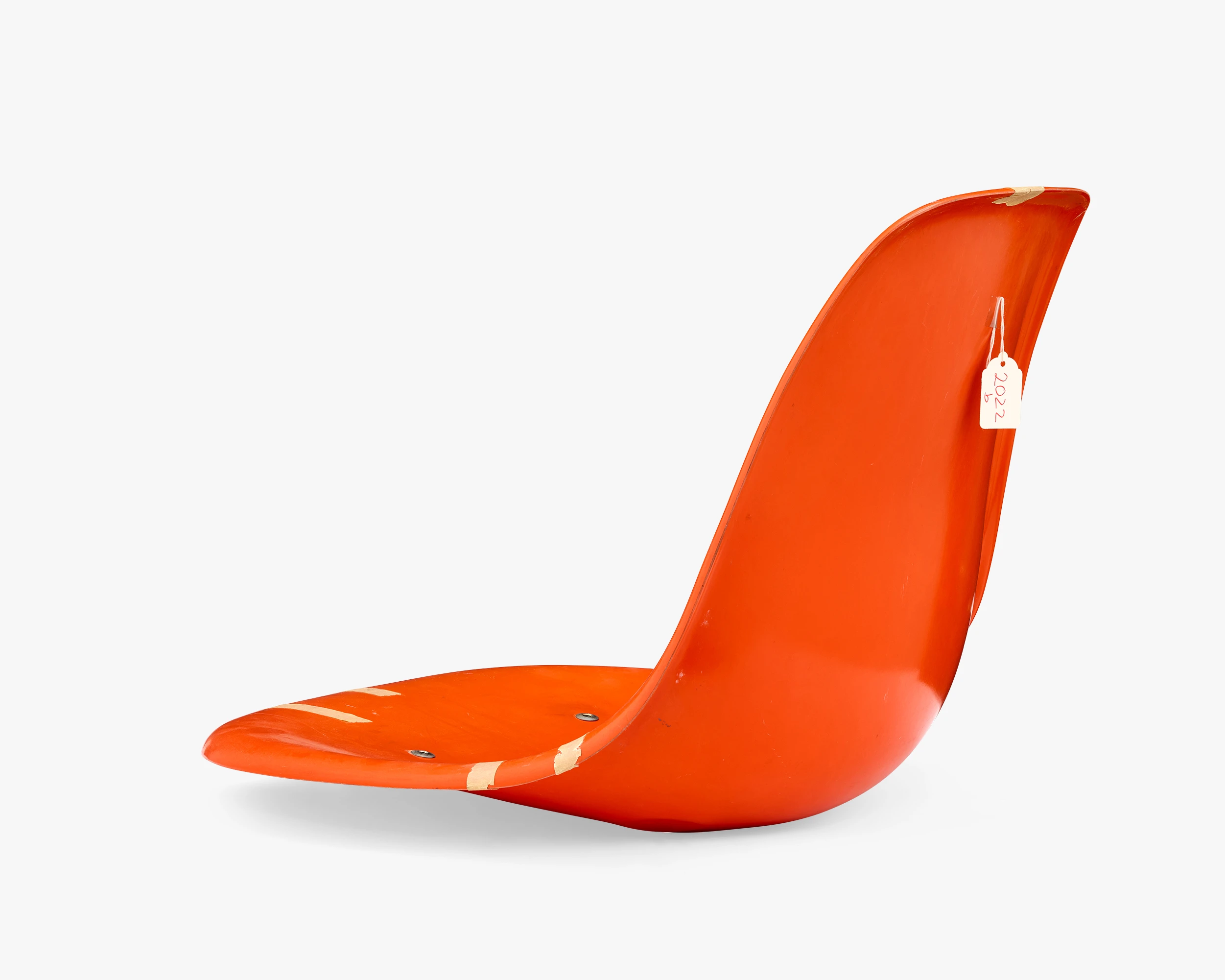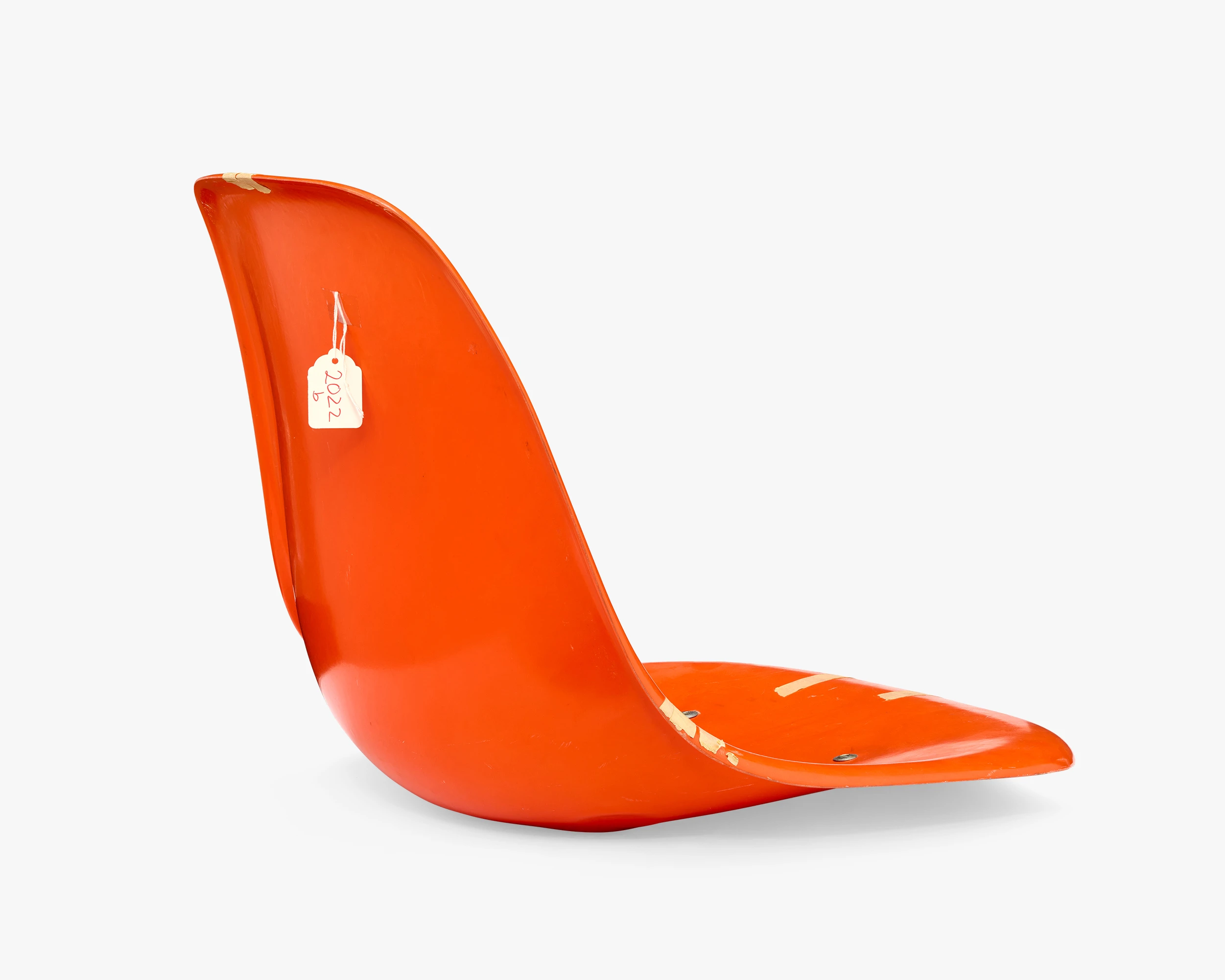 The collection has several color-test samples from different fiberglass manufacturers. This test sample for the color Crimson reveals threaded screw holes and masking tape, suggesting this shell was used for prototyping a new idea.