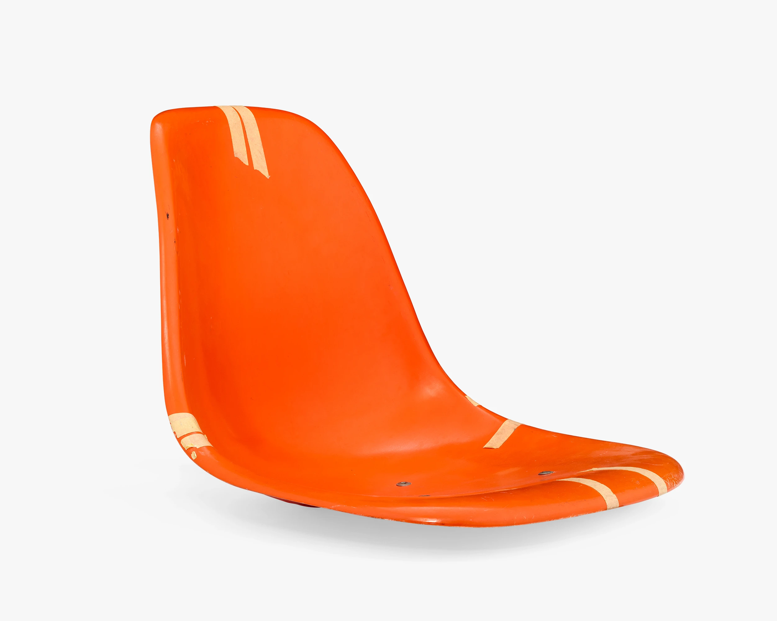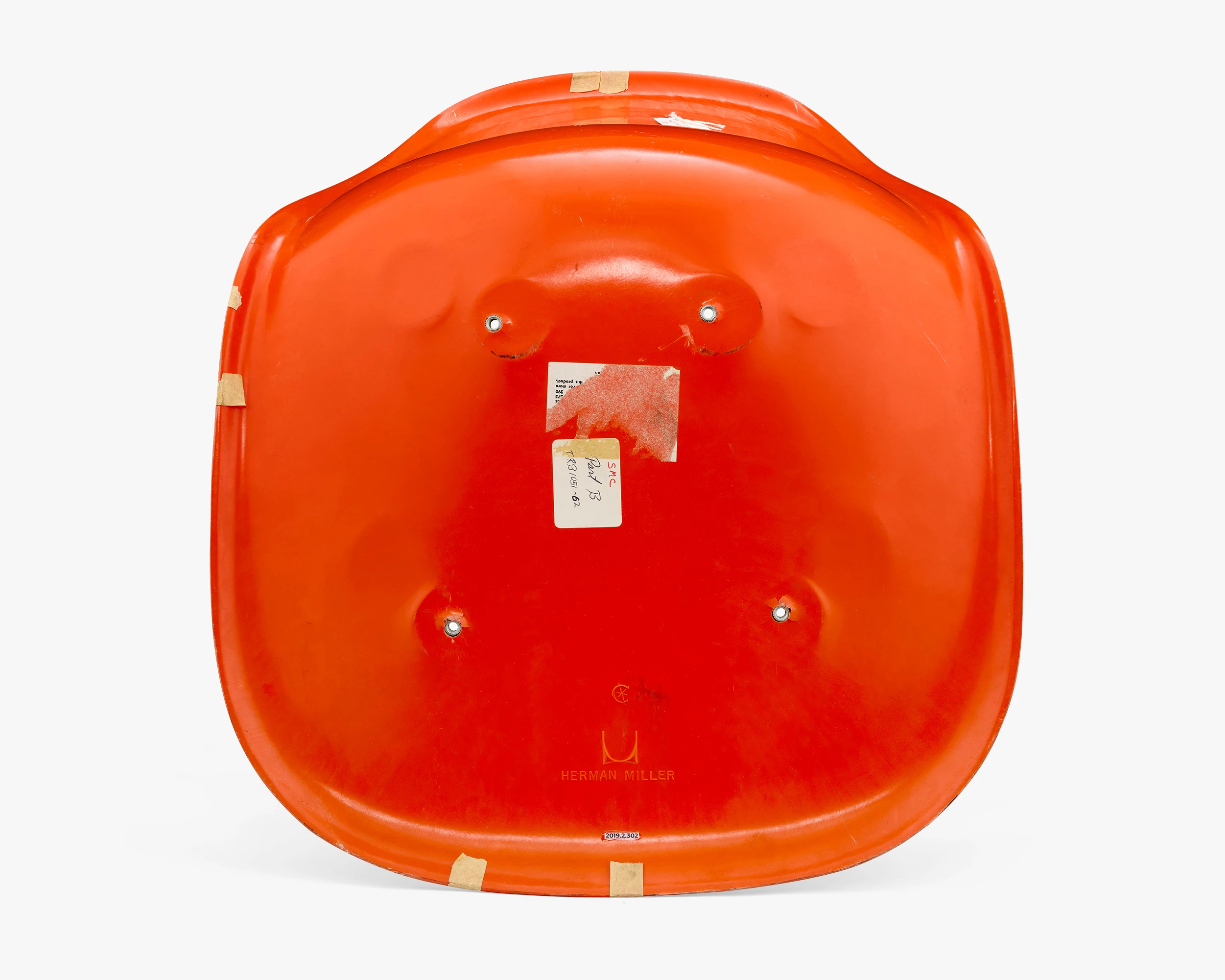 A removed rectangular sticker, “SMC, Part B, TRB 1051–62” handwritten on a white rectangular sticker, an embossed Cincinnati Milling Machine Company logo (“C” with a six-pointed star), and an embossed Herman Miller logo and word mark are on the underside of the shell.