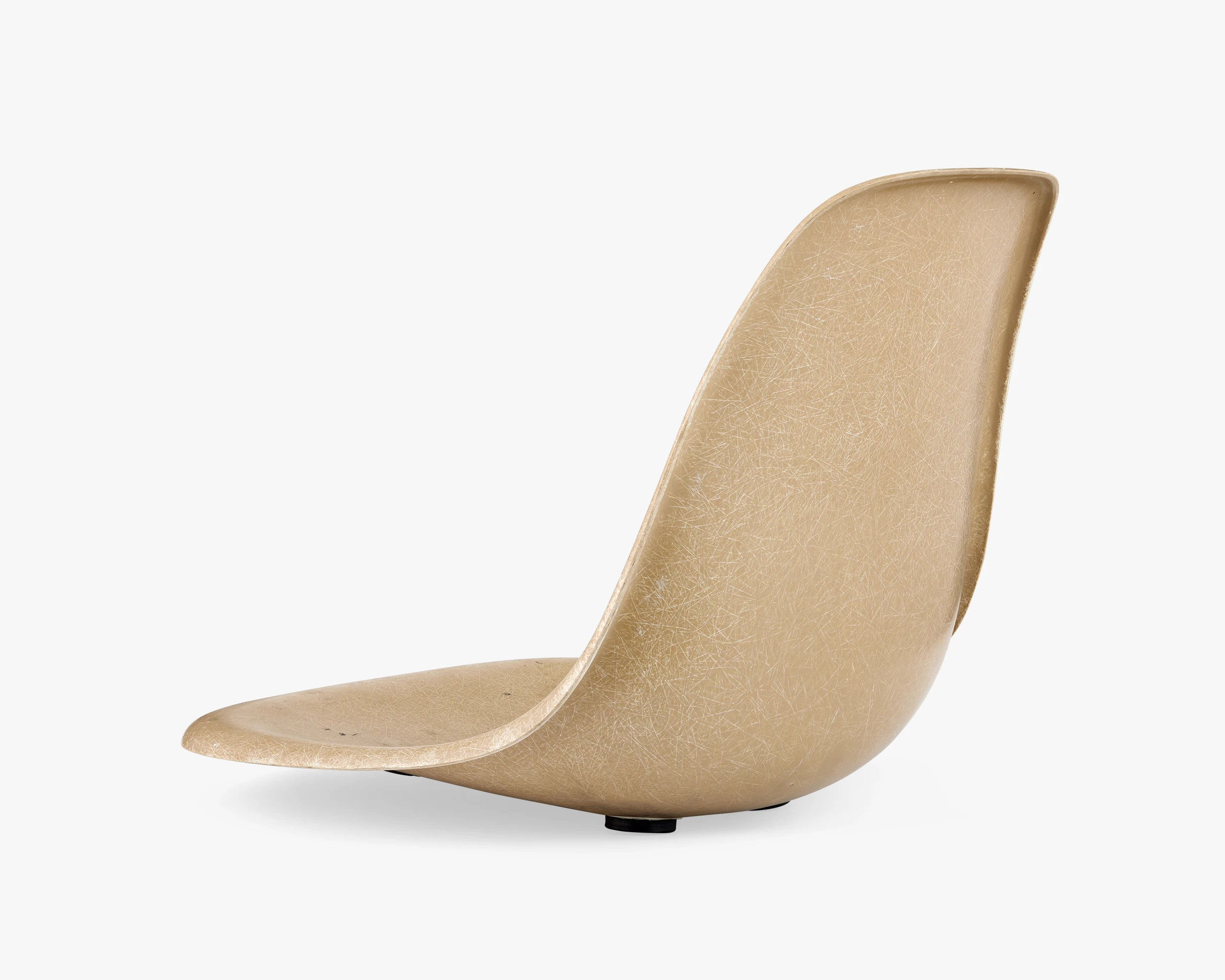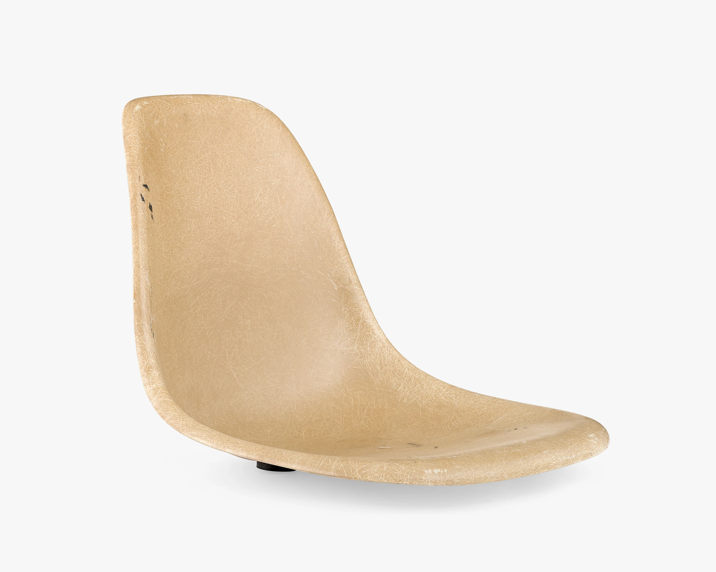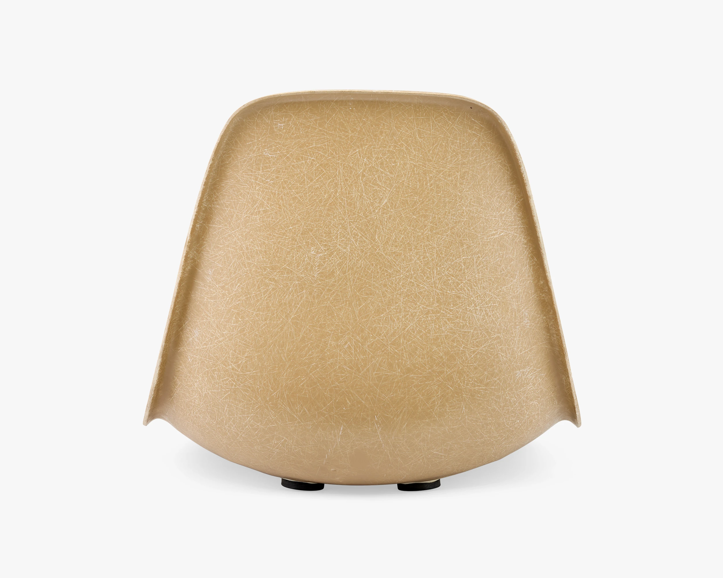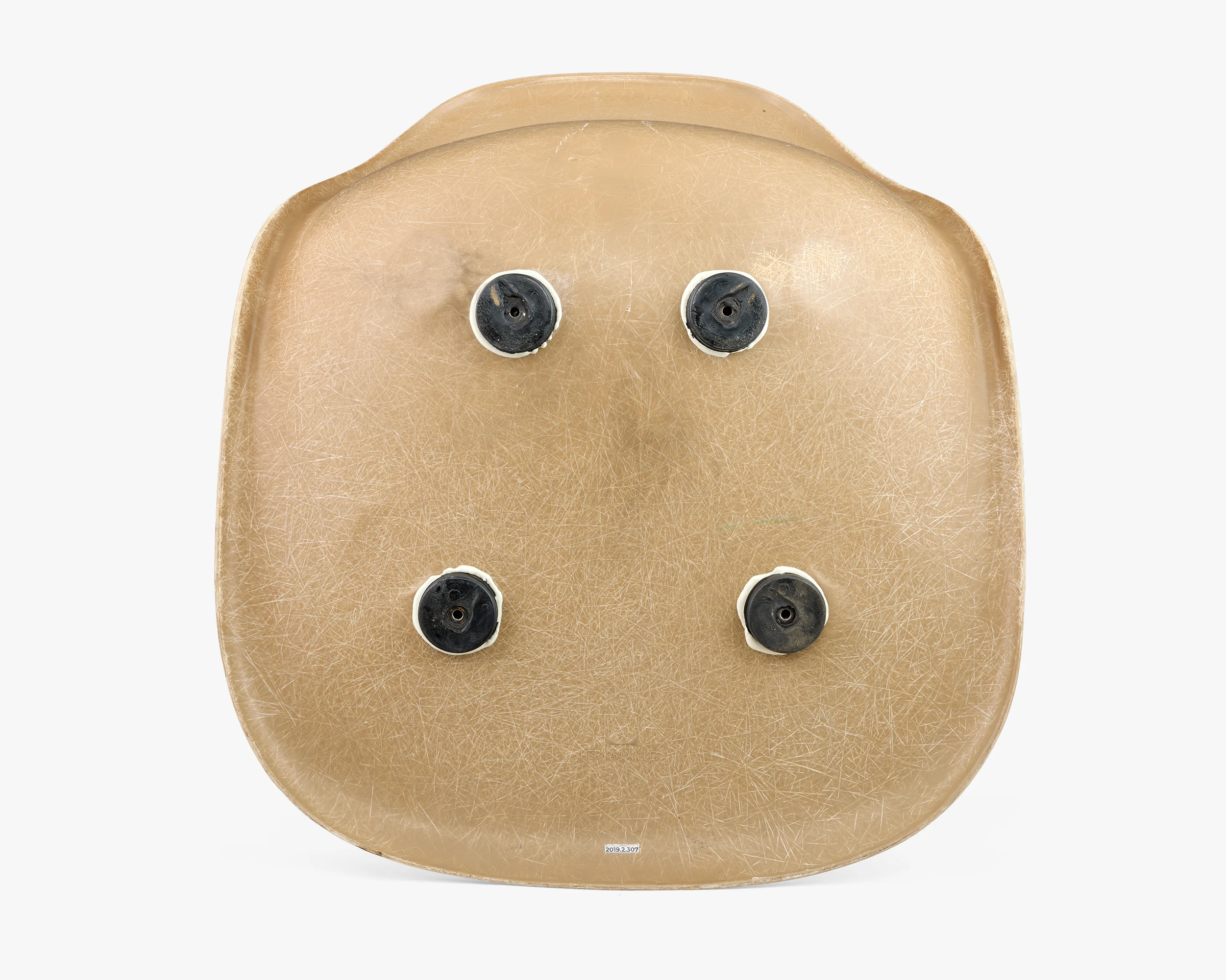 This Khaki shell has its original shockmounts and was once mounted on a DSX base. When Ray and Charles were designing the shells, they were thinking about seating systems, and it led them to create a single shell that could be mounted to a variety of different types of bases for different needs. The DSX base is an abbreviation for dining (D) side chair (S) on a four-legged base (X).