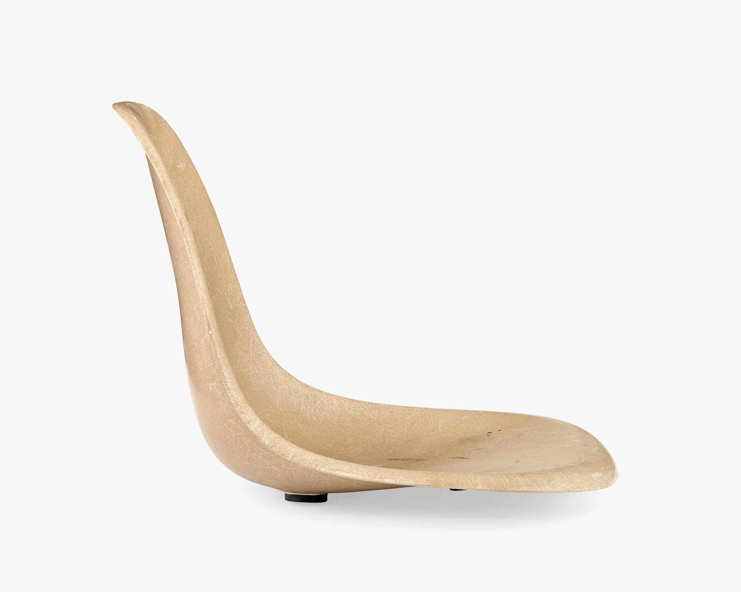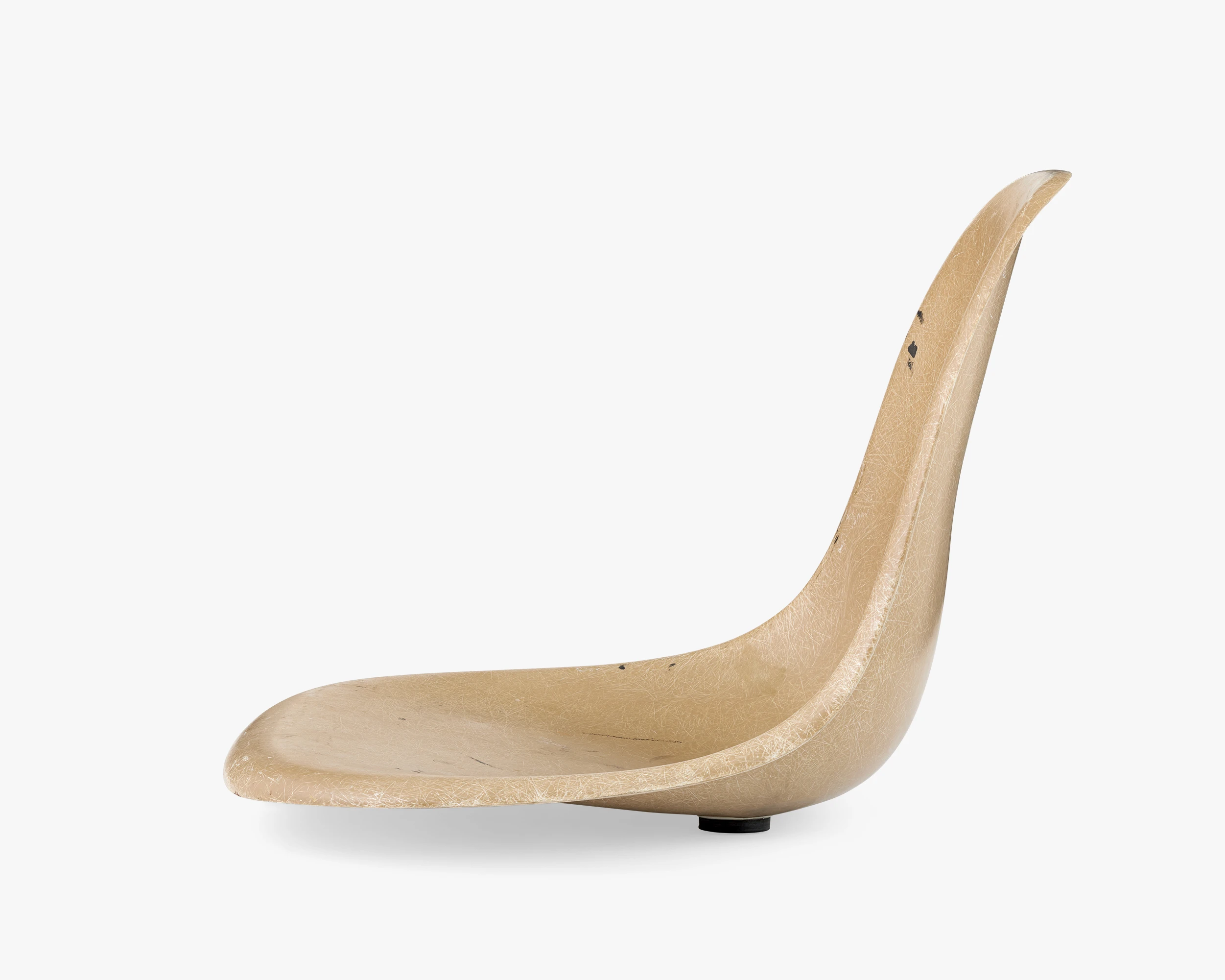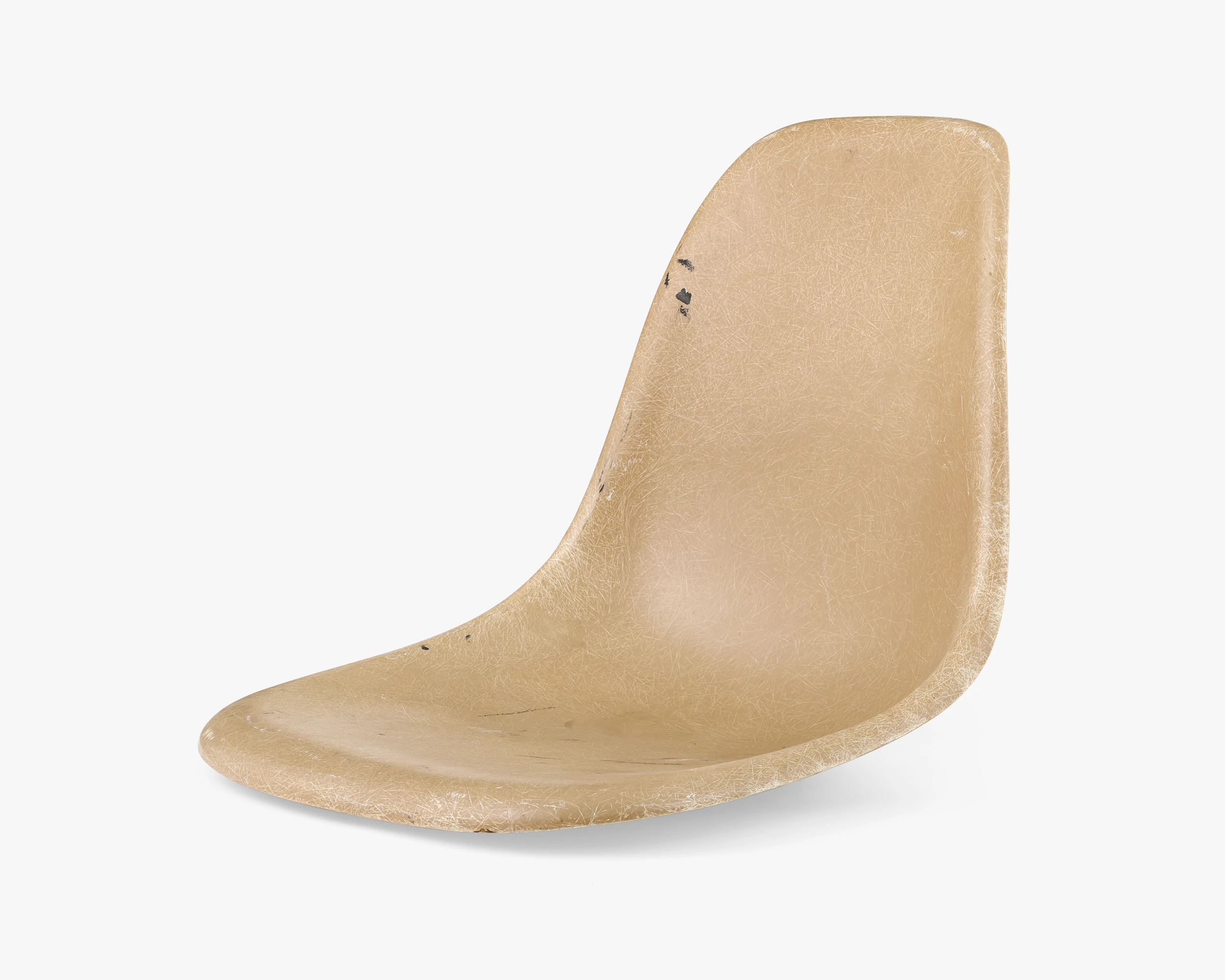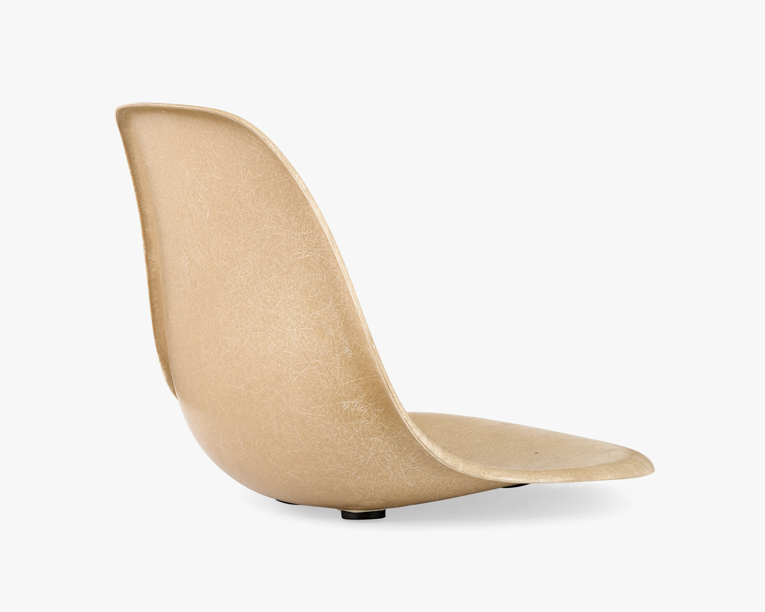 This Khaki shell has its original shockmounts and was once mounted on a DSX base. When Ray and Charles were designing the shells, they were thinking about seating systems, and it led them to create a single shell that could be mounted to a variety of different types of bases for different needs. The DSX base is an abbreviation for dining (D) side chair (S) on a four-legged base (X).