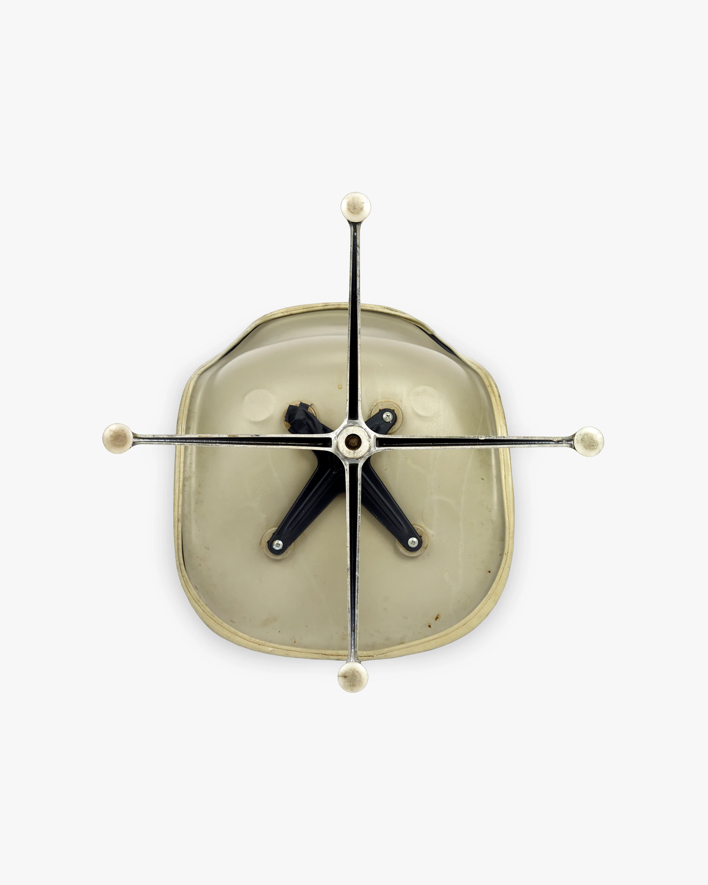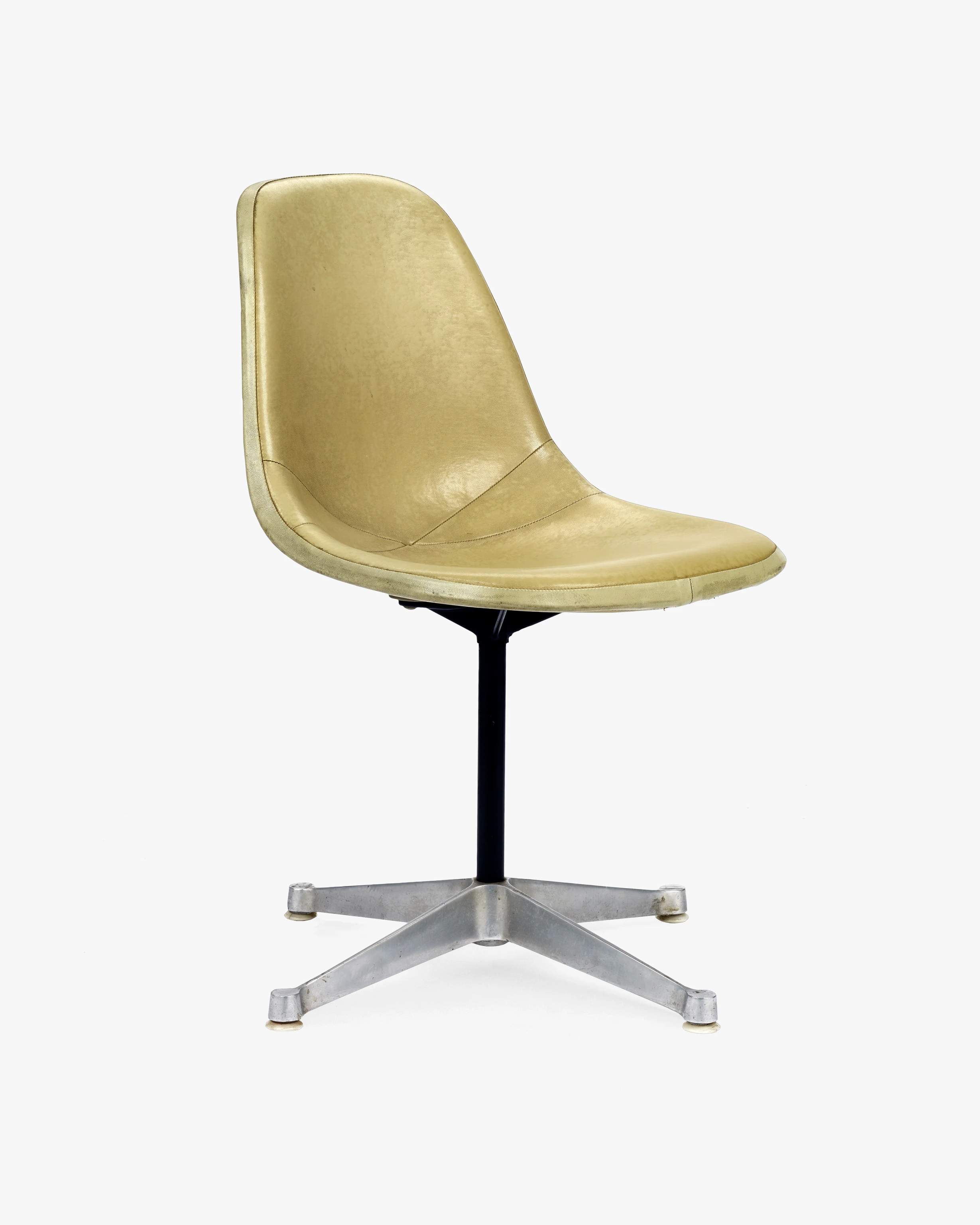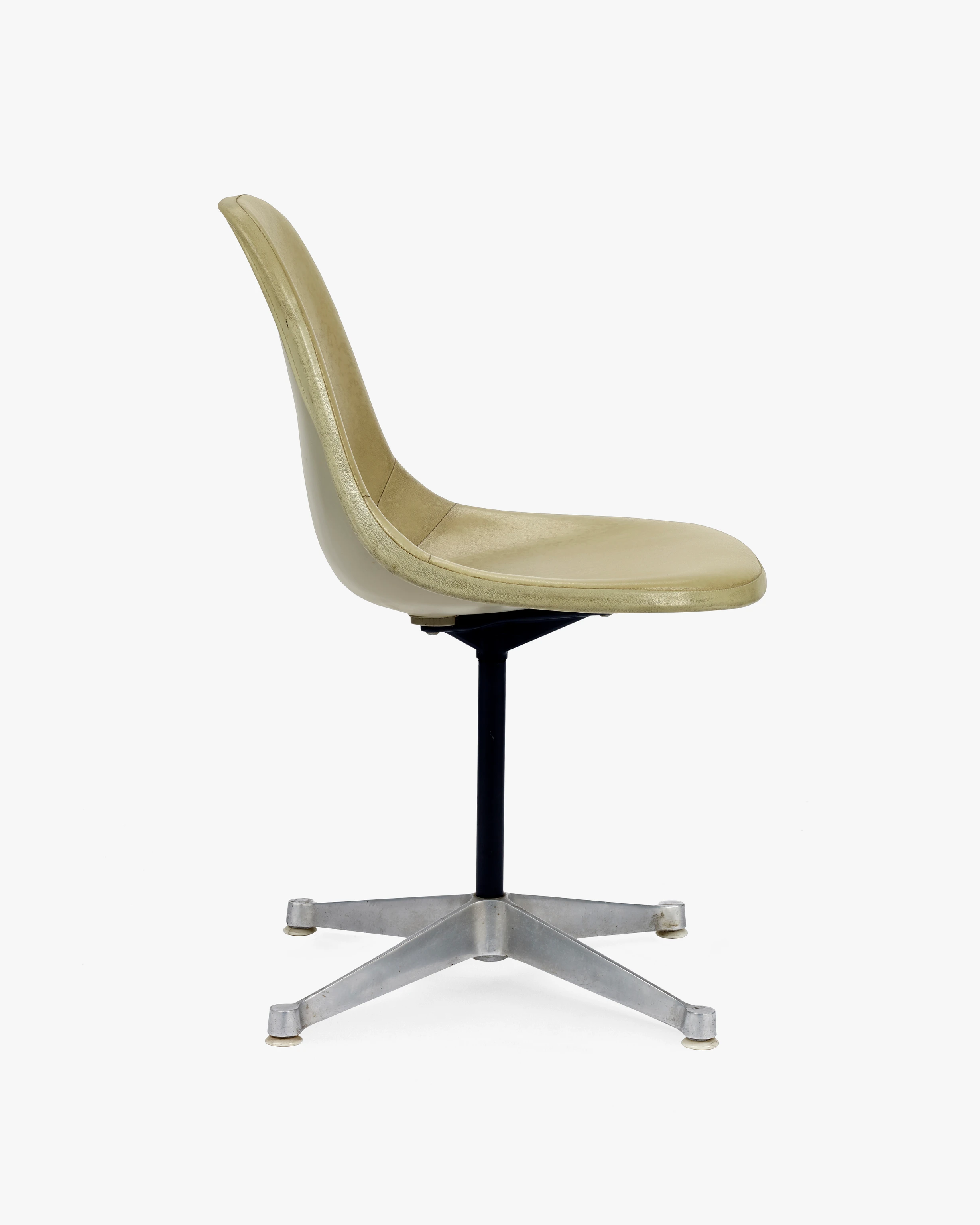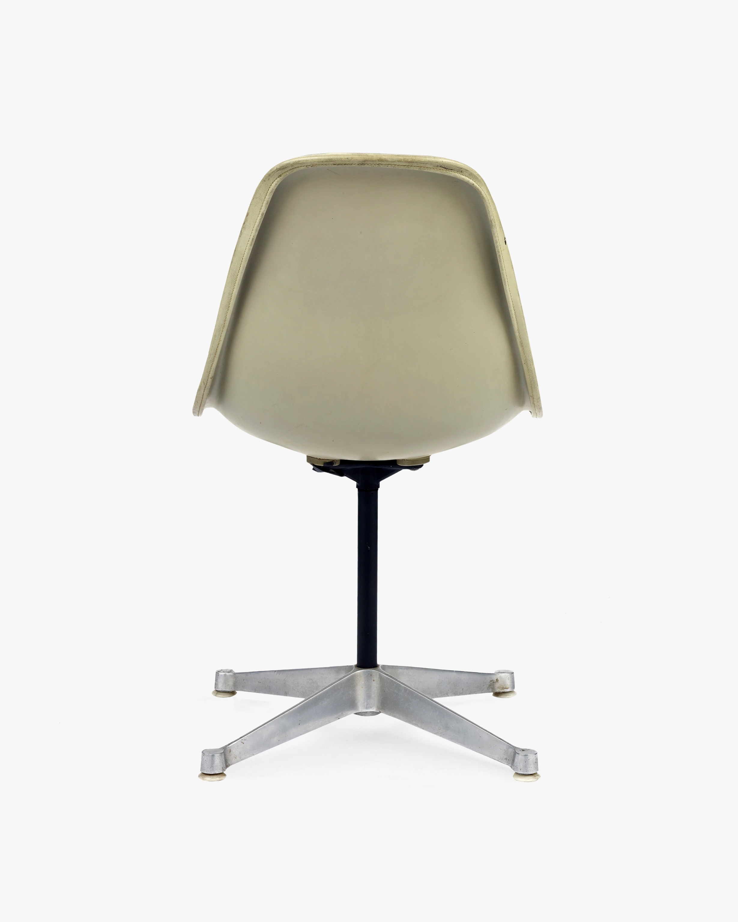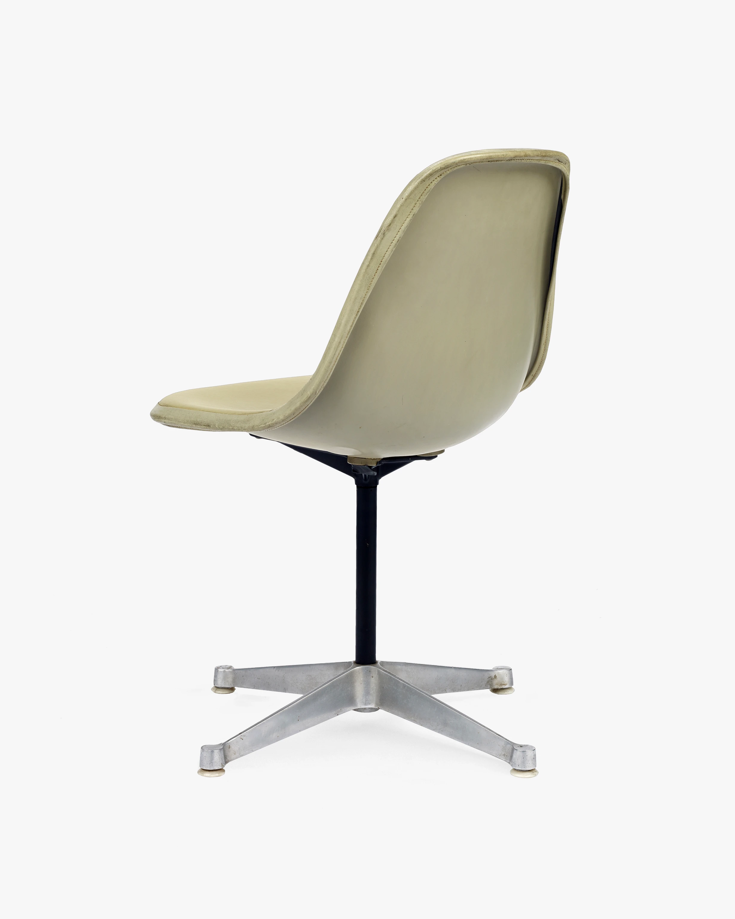 This example has the earliest type of Eames fiberglass chair upholstery—a method of wrapping the upholstery around the edges with a concealed wire that holds the upholstery in place. PSC-1 stands for Pivoting Side (chair) Cast aluminum (base) 1 (upholstered).